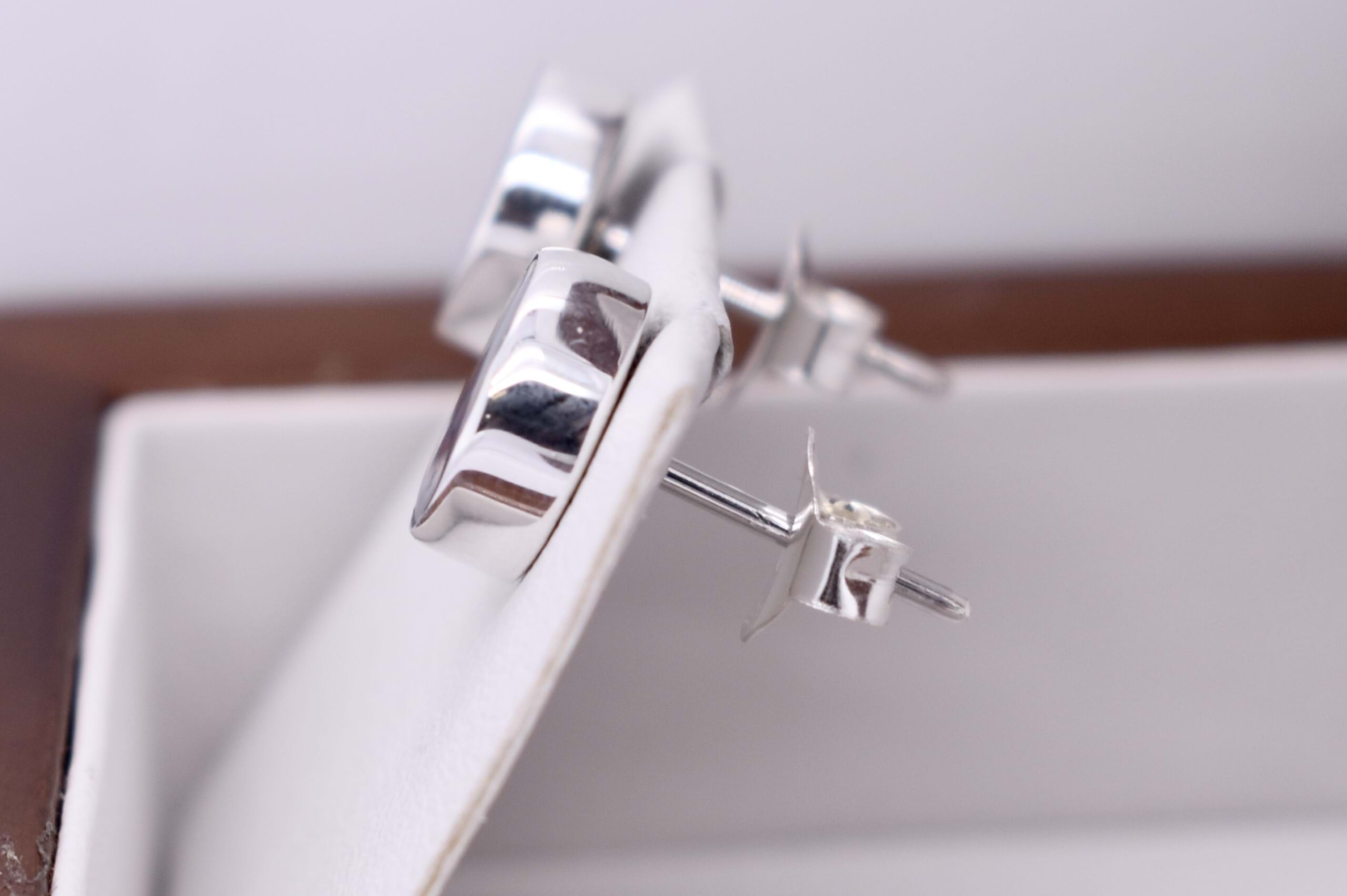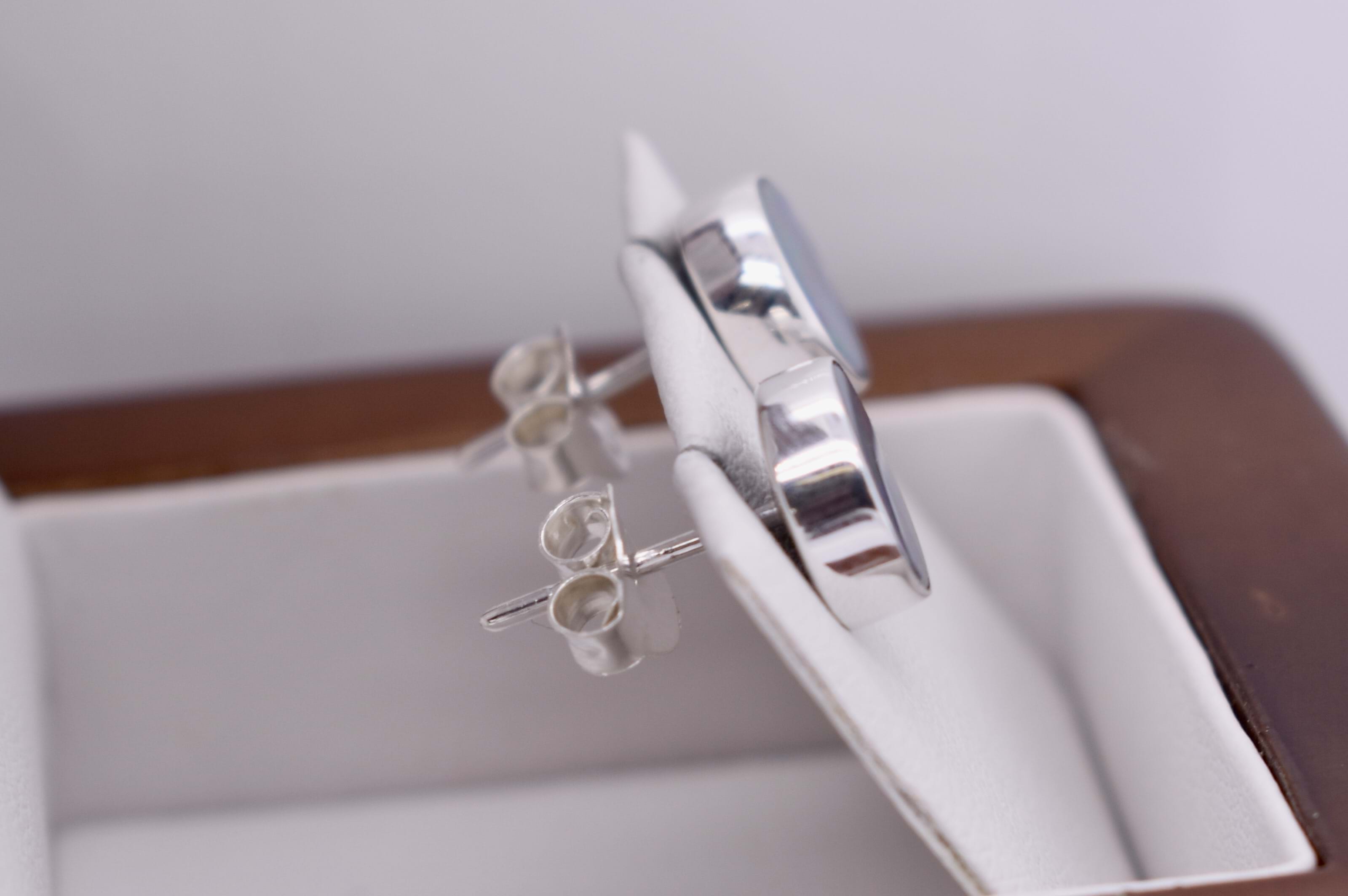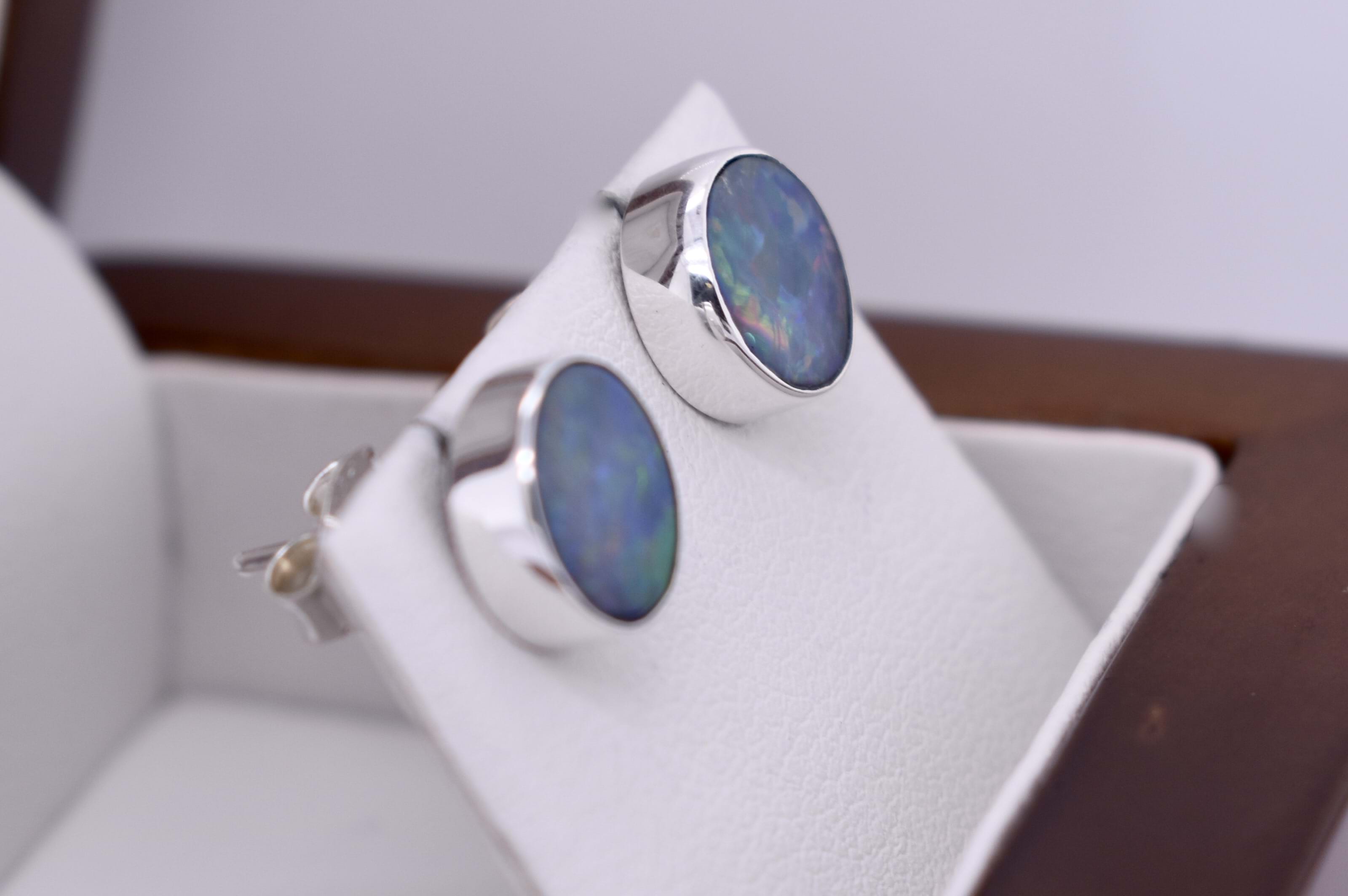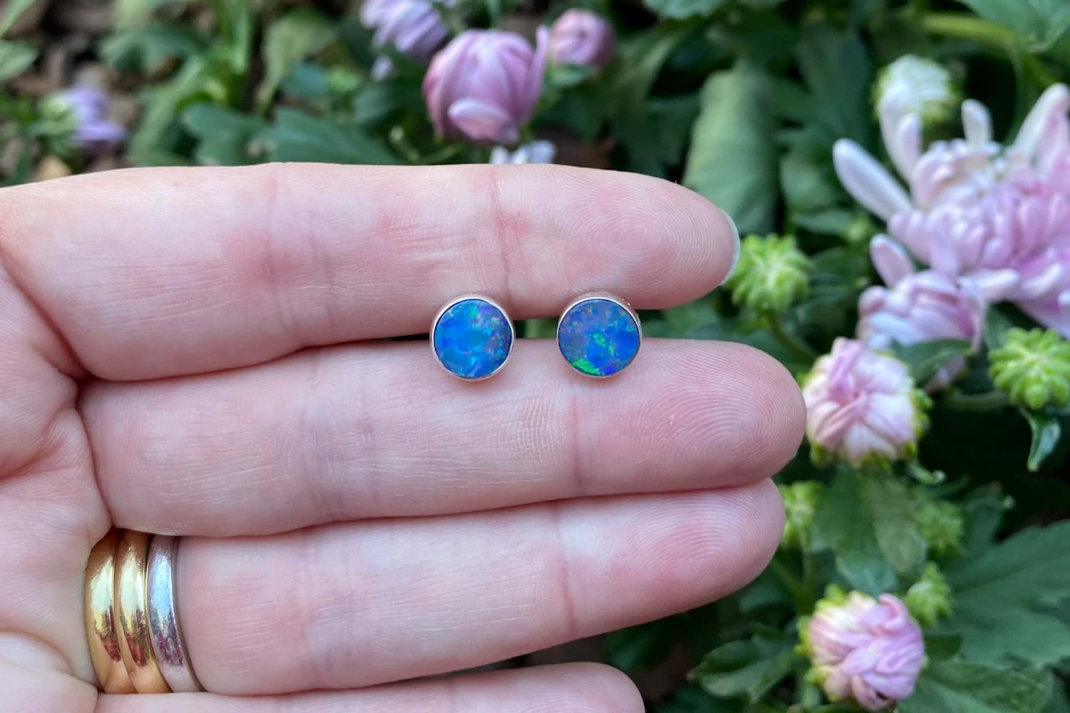 Wonderful pair of handmade studs crafted in sterling silver, with two dark Coober Pedy opal doublets with flashes of green, yellow and orange throughout. The doublet consisting of Coober Pedy crystal opal (on top) with a boulder opal backing. Studs measuring approx. 8.9mm round and are bezel set, with post and butterfly fittings.