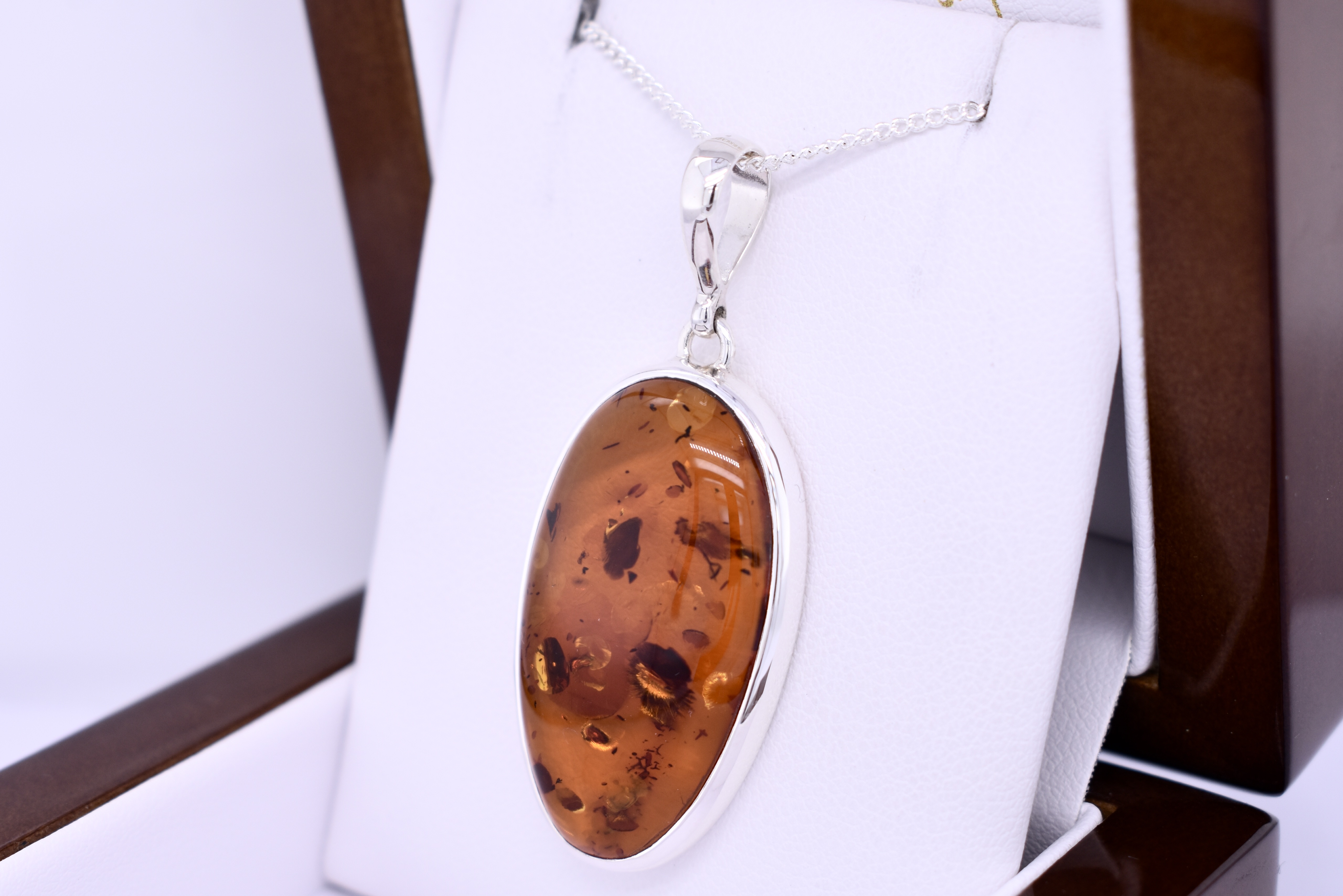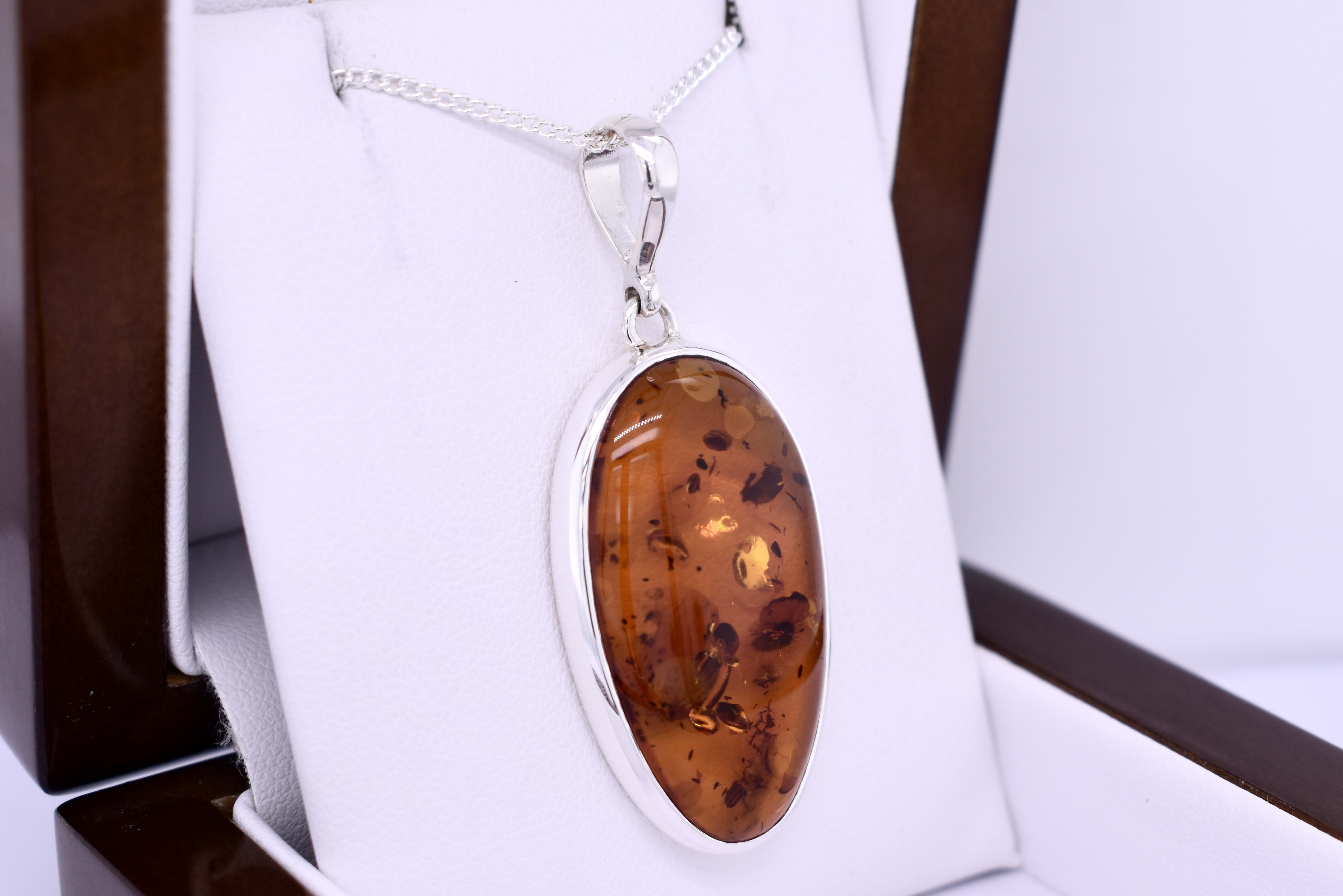 Spectacular large oval pendant, featuring a 34.0x20.4mm orange Baltic amber stone, handmade bezel set in sterling silver with a plain pendant bale. Chains available for separate purchase.