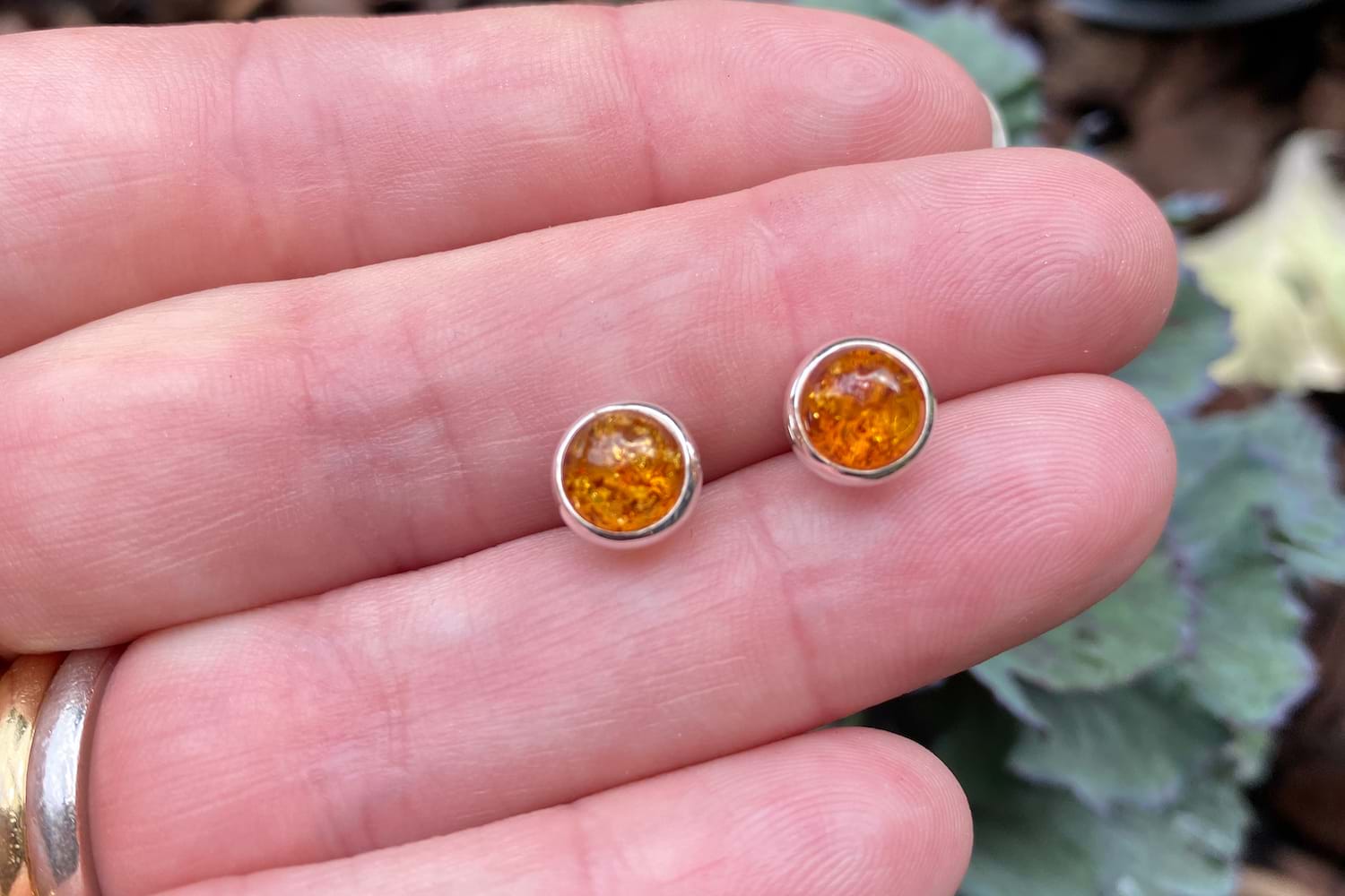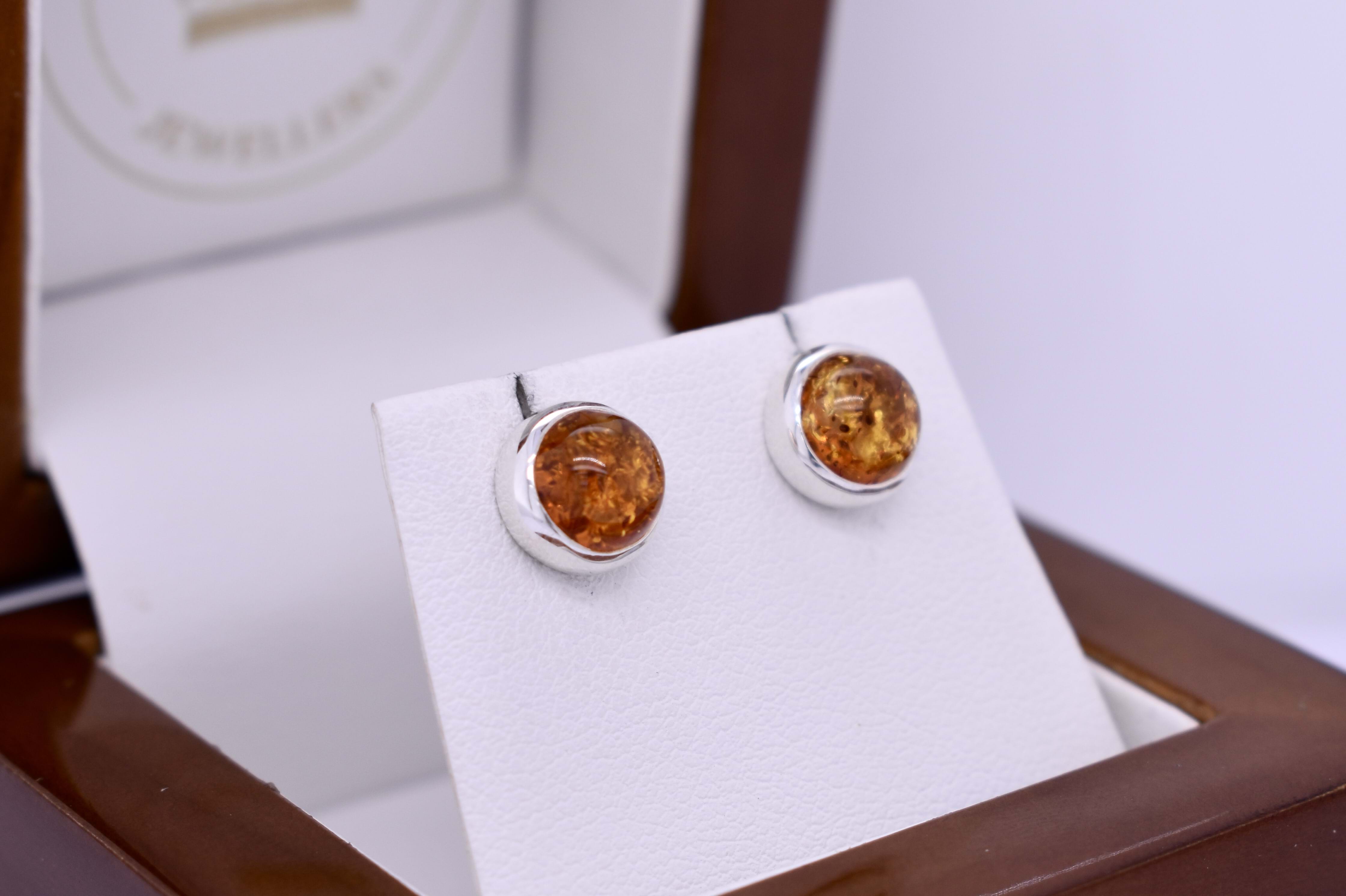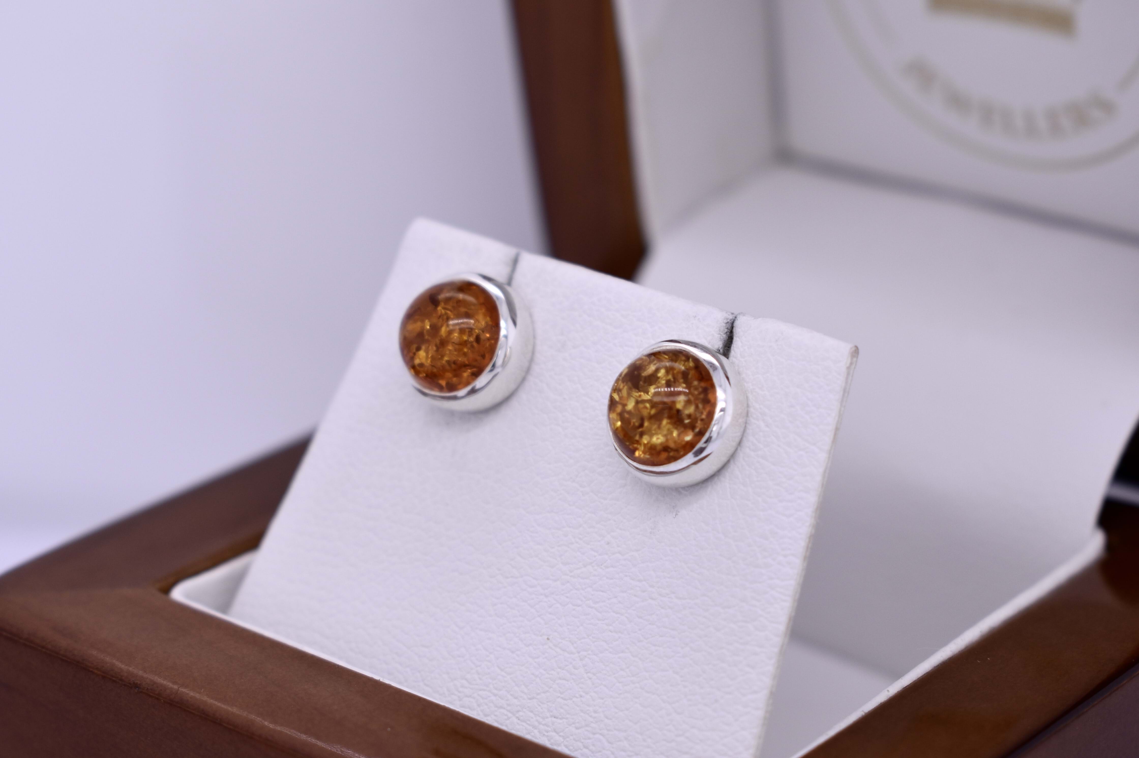 Gorgeous round cabochon amber studs, featuring two 8.3mm stones, bezel set in handmade settings with post and butterfly fittings.
