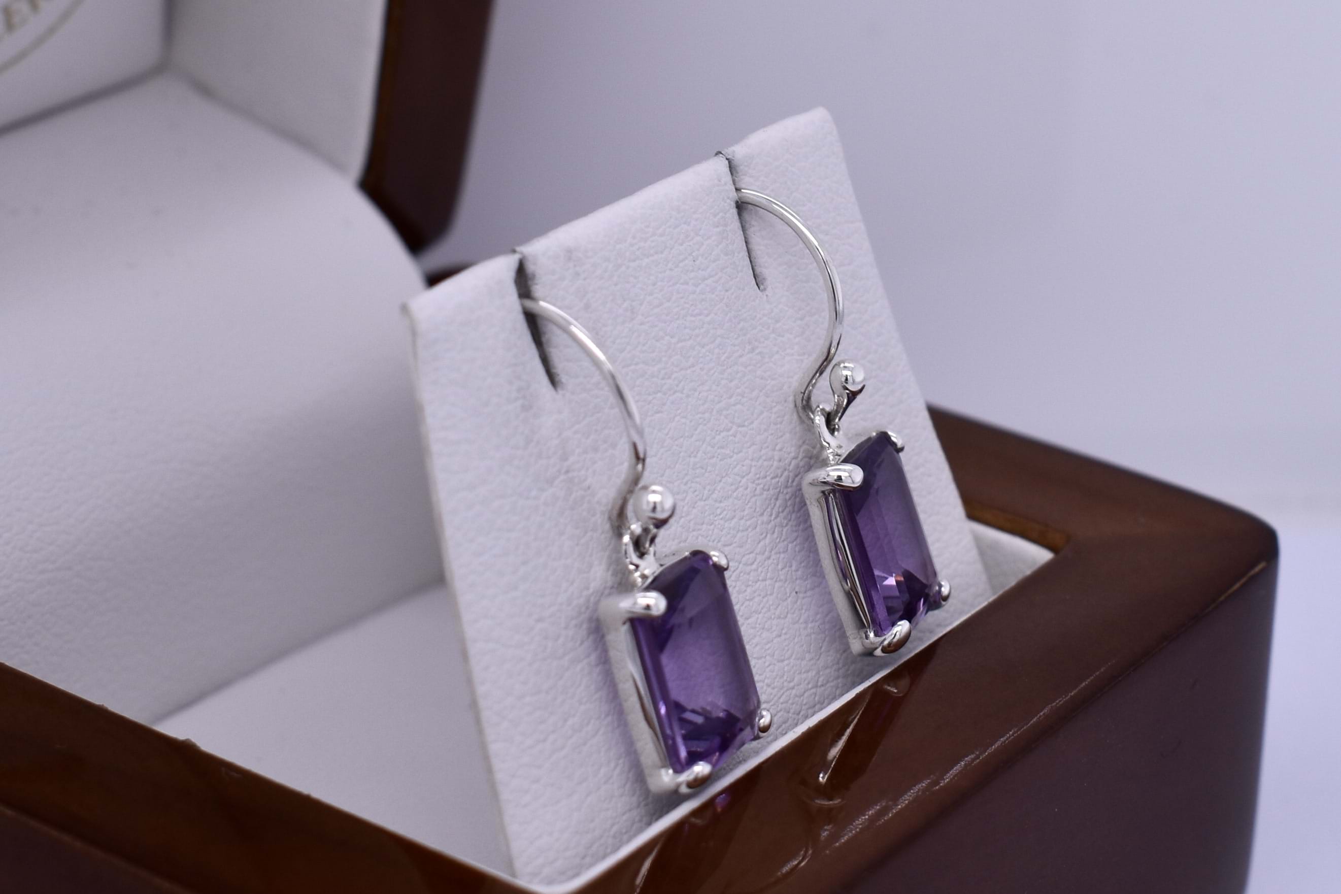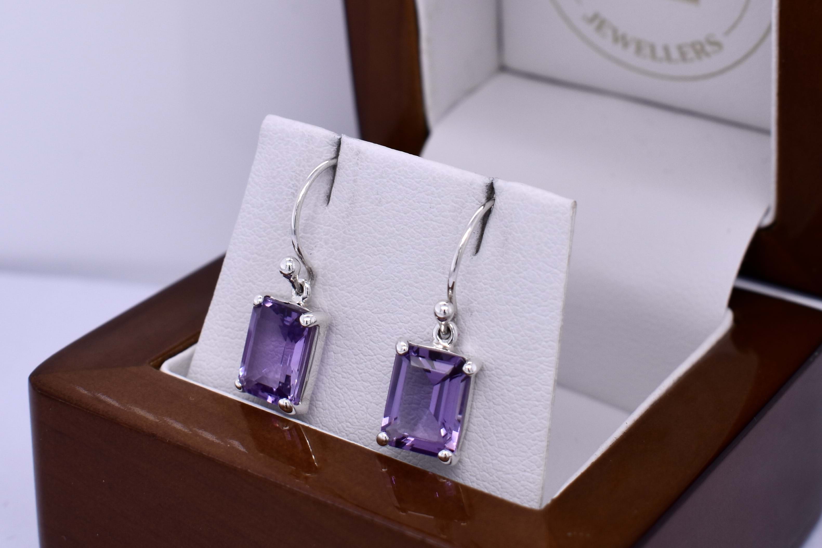 Vivid amethyst drops, featuring two 9.0x7.6mm emerald cut stones, corner cap set in handmade sterling silver with shepherd hook fittings.