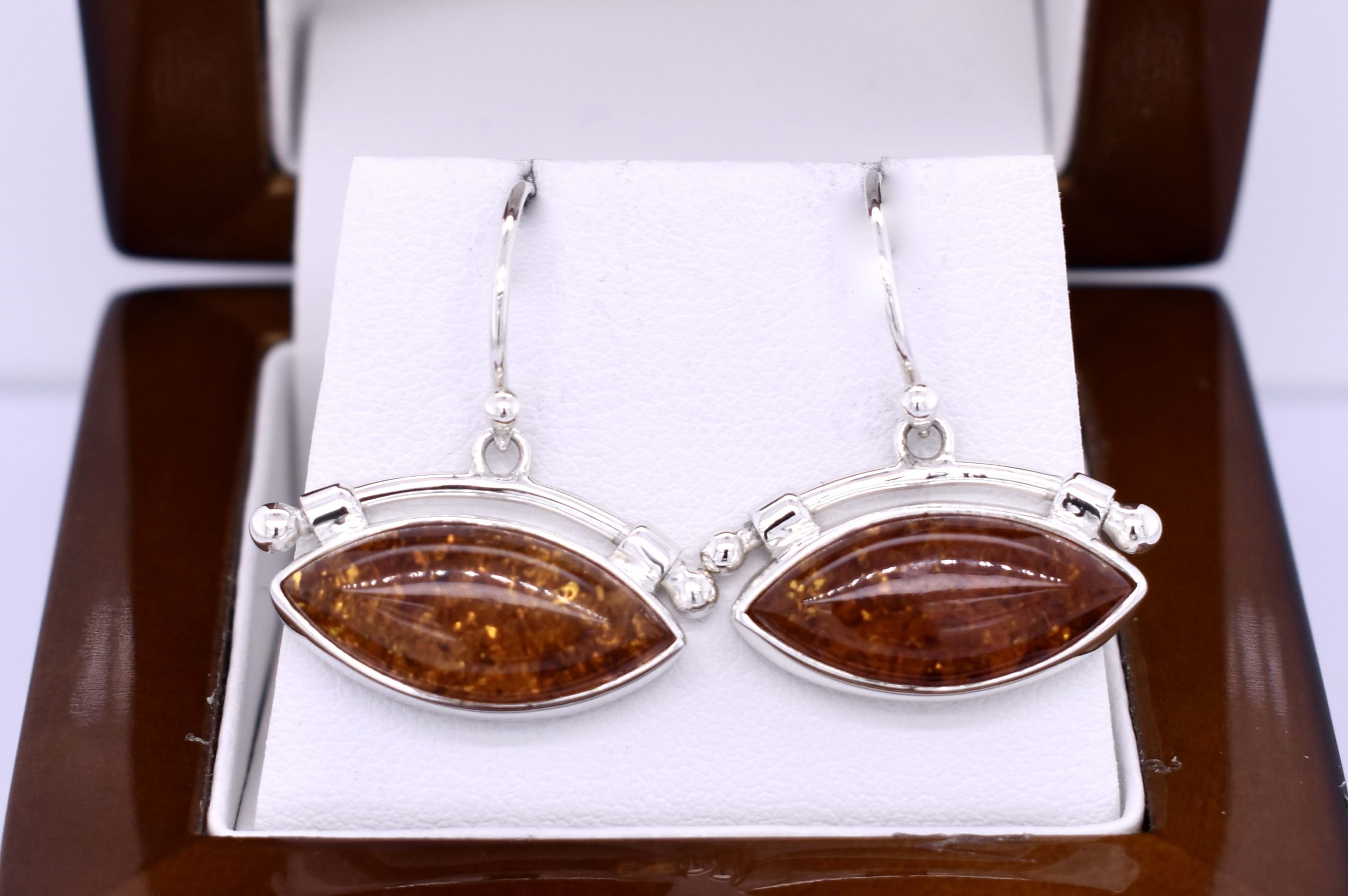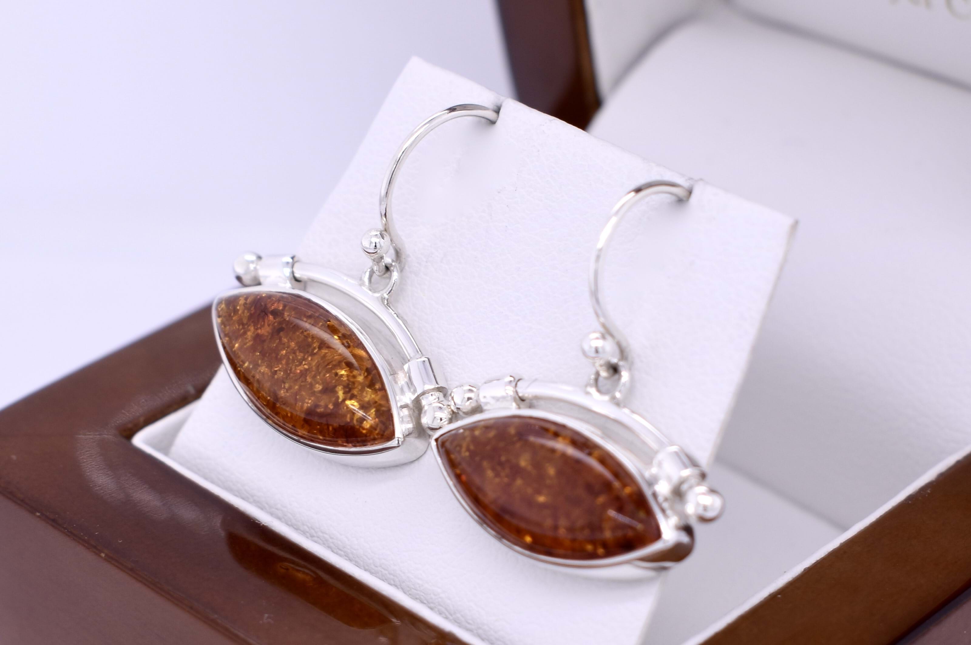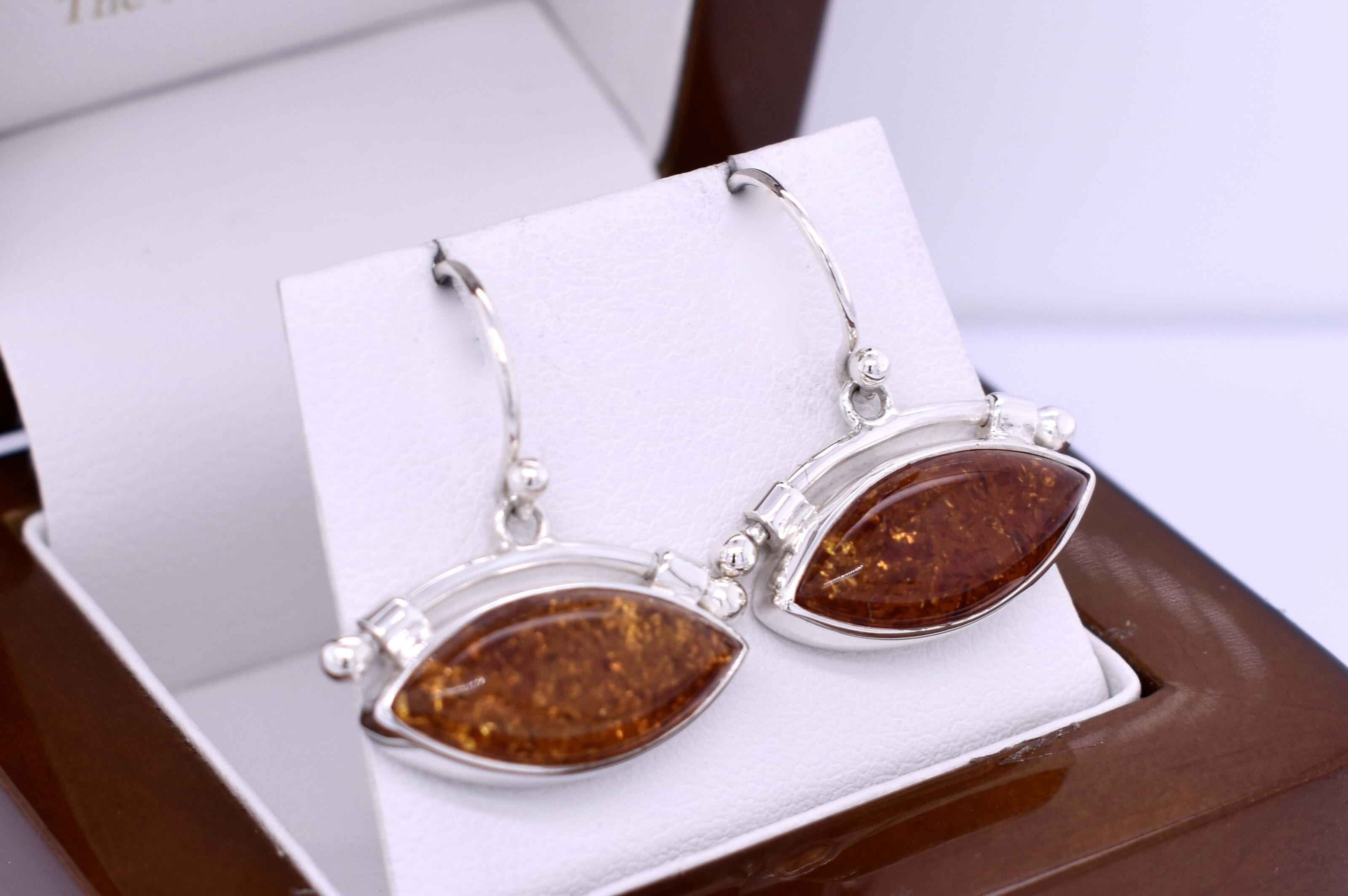 Hand crafted in sterling silver, these quirky Baltic amber drops are marquise shaped, measuring 7.7x17.6mm, and are east/west set with a bar above. Finished with shepherd hook fittings.