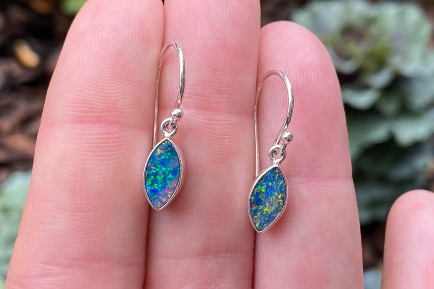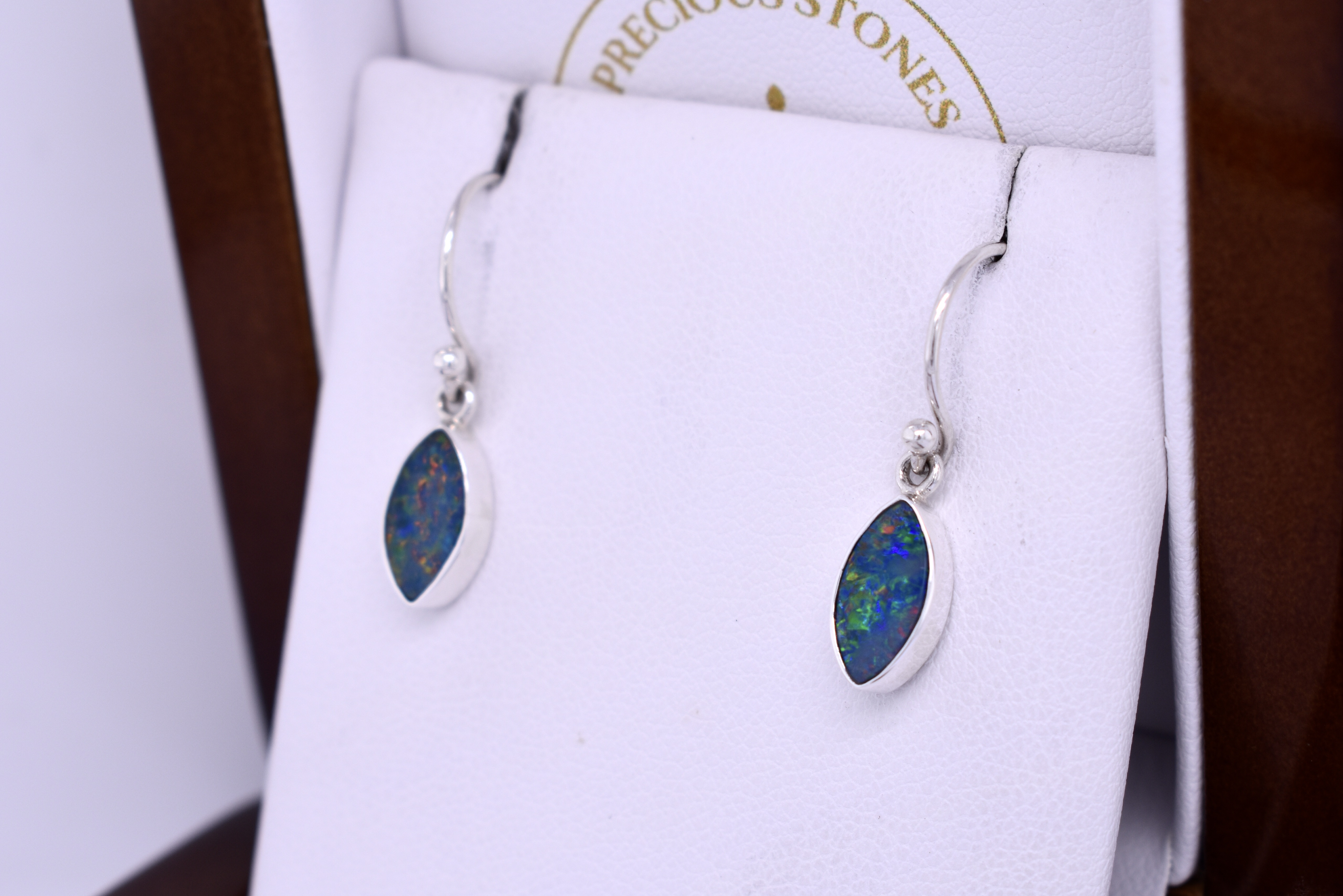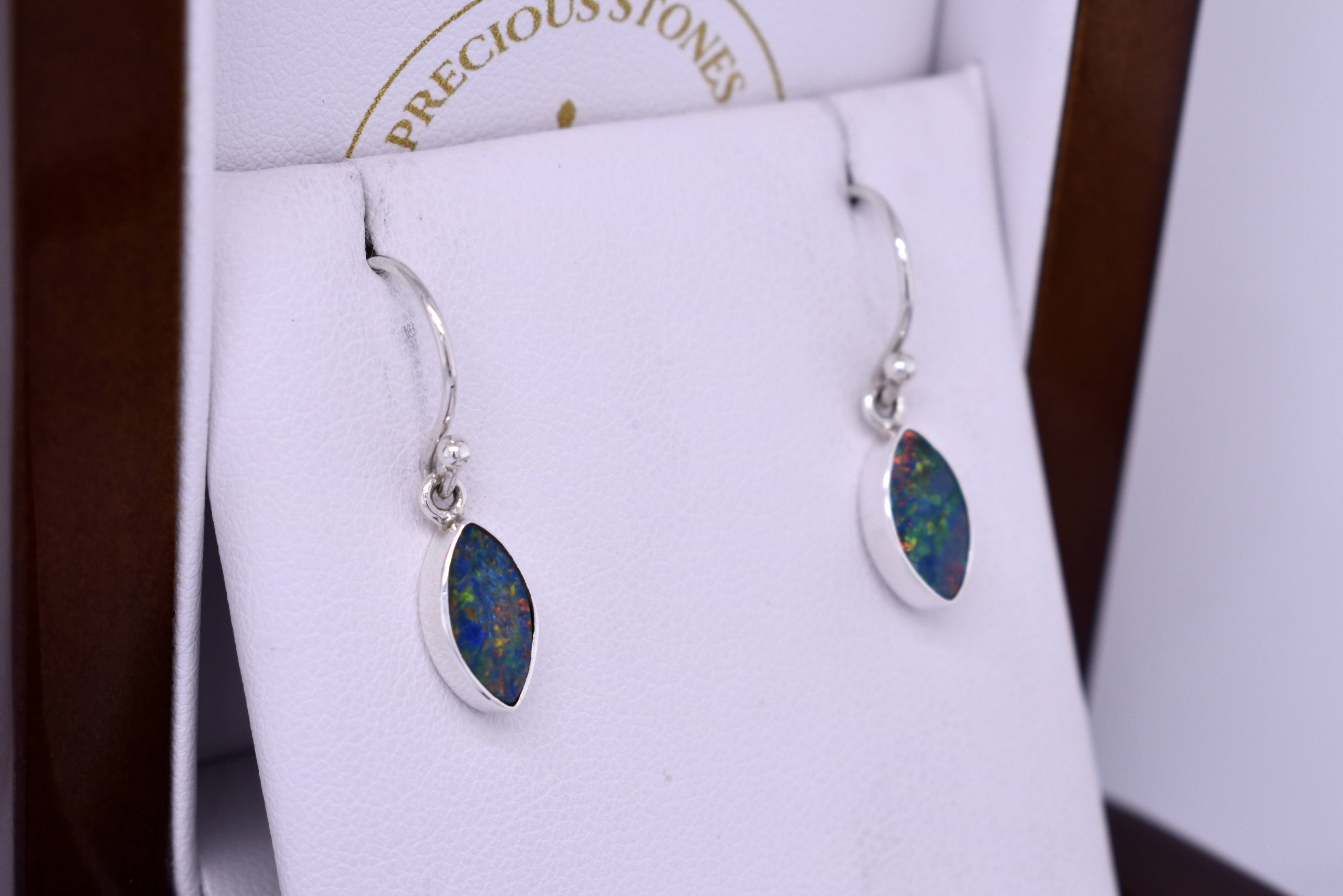 This lovely pair of handmade marquise shaped drops, featuring approx. 10.7x6.0mm Coober Pedy opal doublets. The doublet consisting of Coober Pedy opal (on top) with a boulder opal backing. These opals are blue with pretty flashes of orange and green throughout. They are bezel set in sterling silver with shepherd hook fittings.