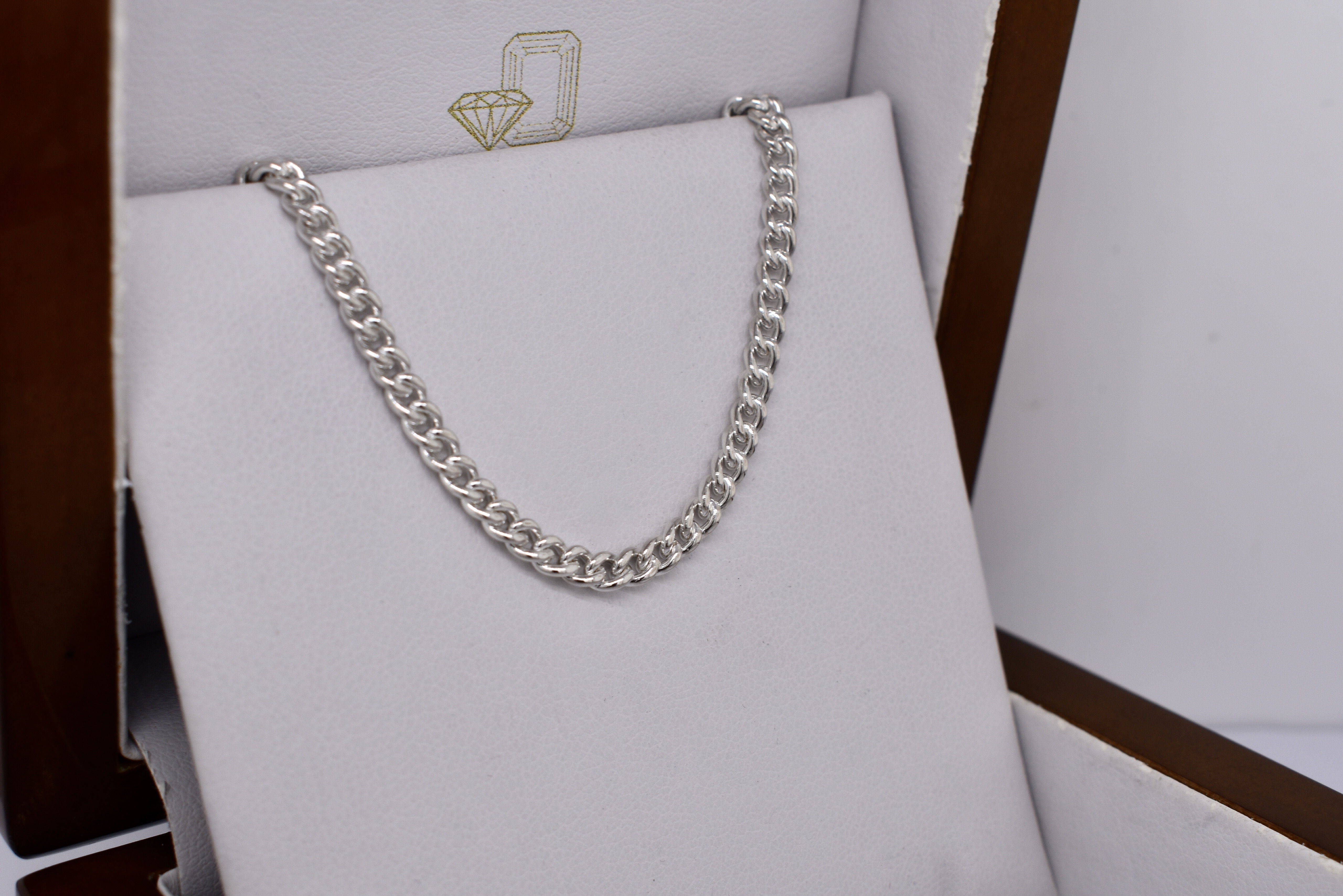 This gorgeous chain was handmade by our goldsmith in sterling silver, in this pretty curb link. It has two jump rings on the ends, offering great versatility for different clasps, carabiners and brooches. Chain measures 51cm long and weighs 15.72grams. Carabiners are available for separate purchase.