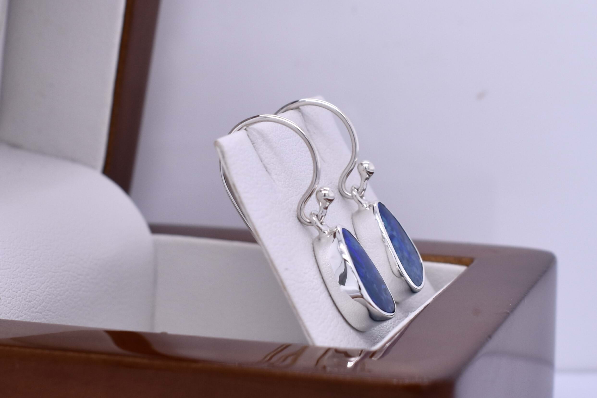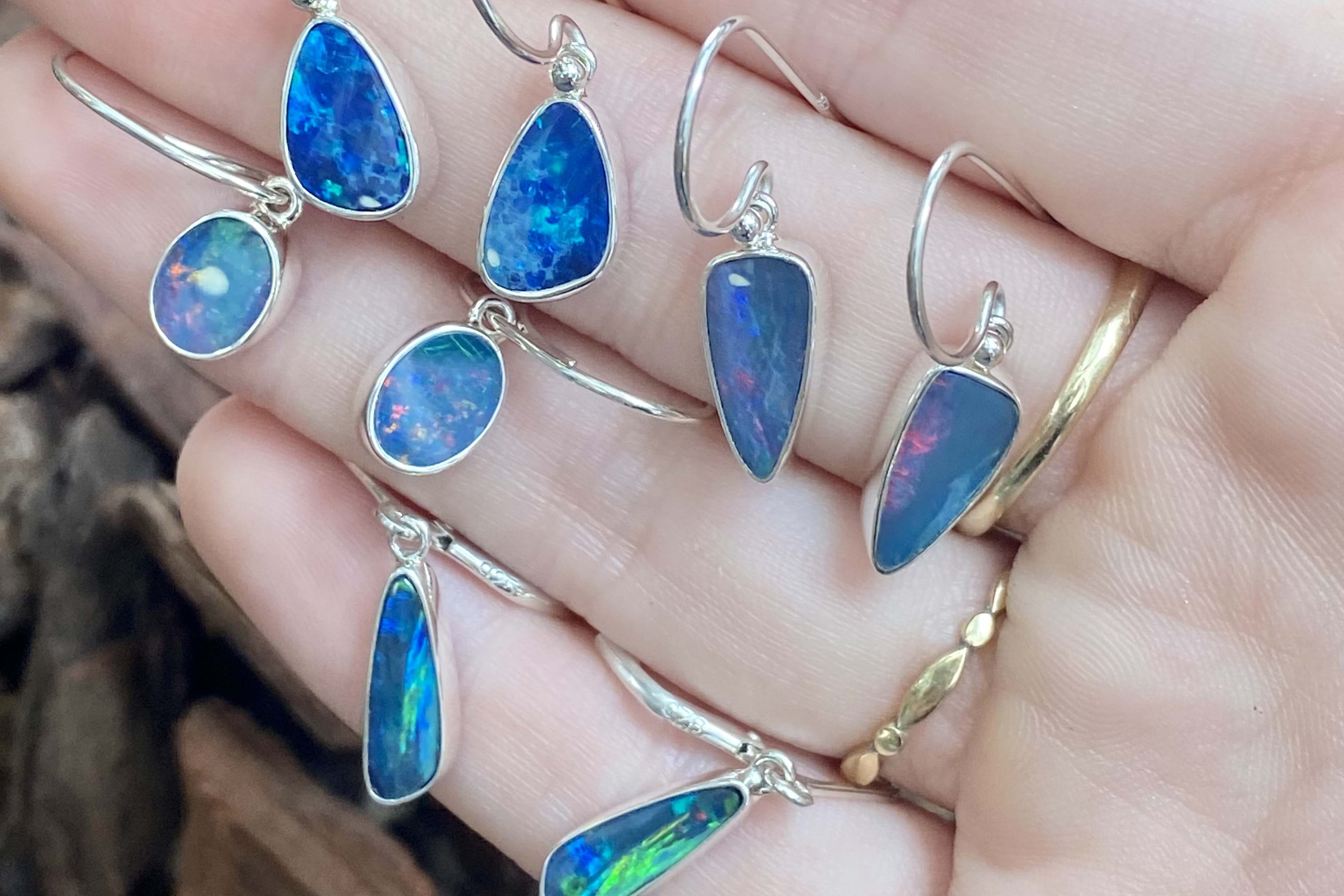 These stunning freeform Coober Pedy opals measure approx. 11.2x7.6mm, bezel set into a handmade sterling silver setting. The opal is a doublet, with a boulder opal backing and has bright flashes of blue and green throughout. Finished with shepherd hook fittings.Photographed in natural light with other pieces.