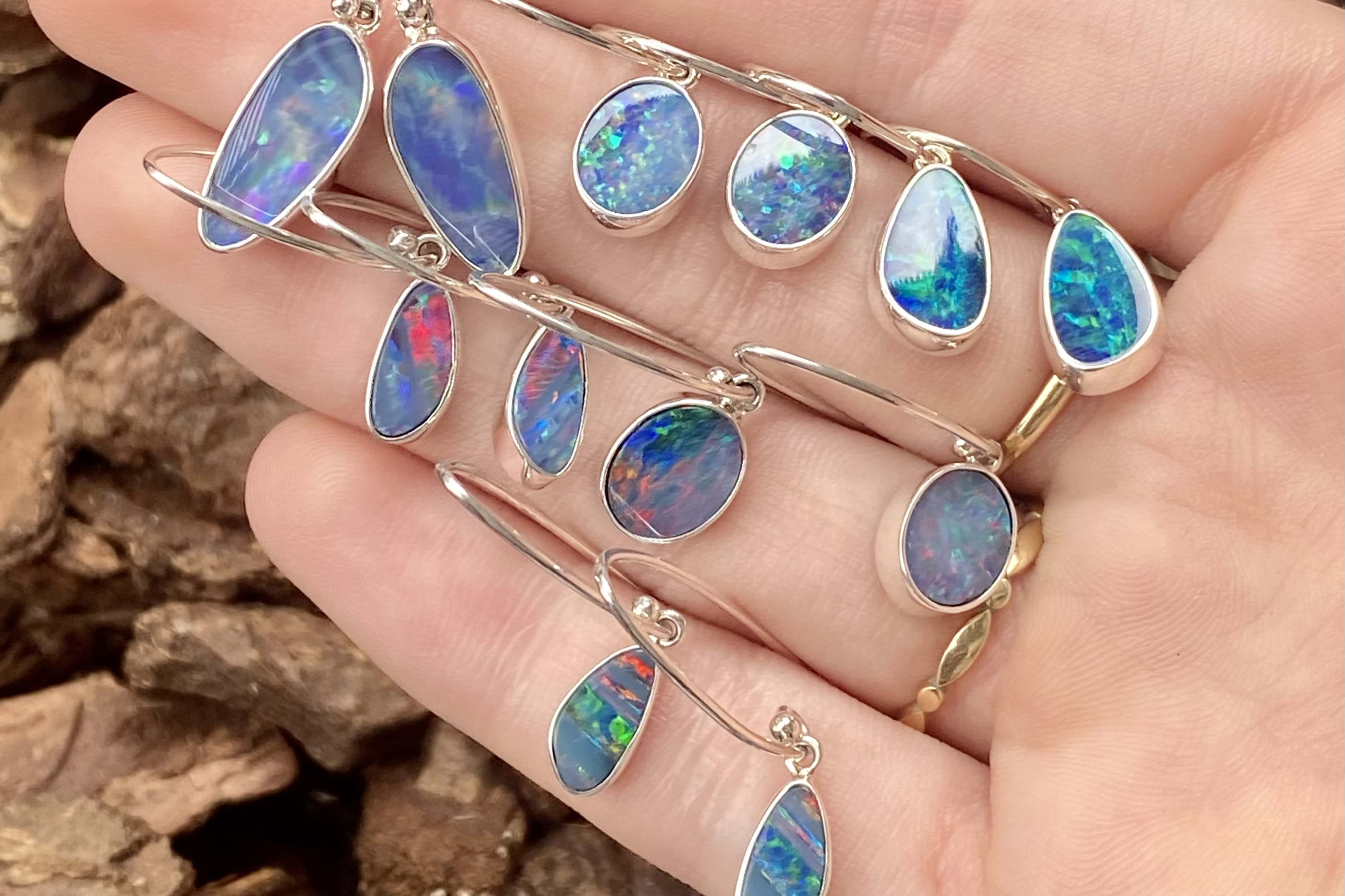 These mystical freeform Coober Pedy opals measure approx. 11.8x7.6mm, bezel set into a handmade sterling silver setting. The opal is a doublet, with a boulder opal backing and has flashes of green and blue throughout. Finished with shepherd hook fittings. Photographed in natural light with other pieces.