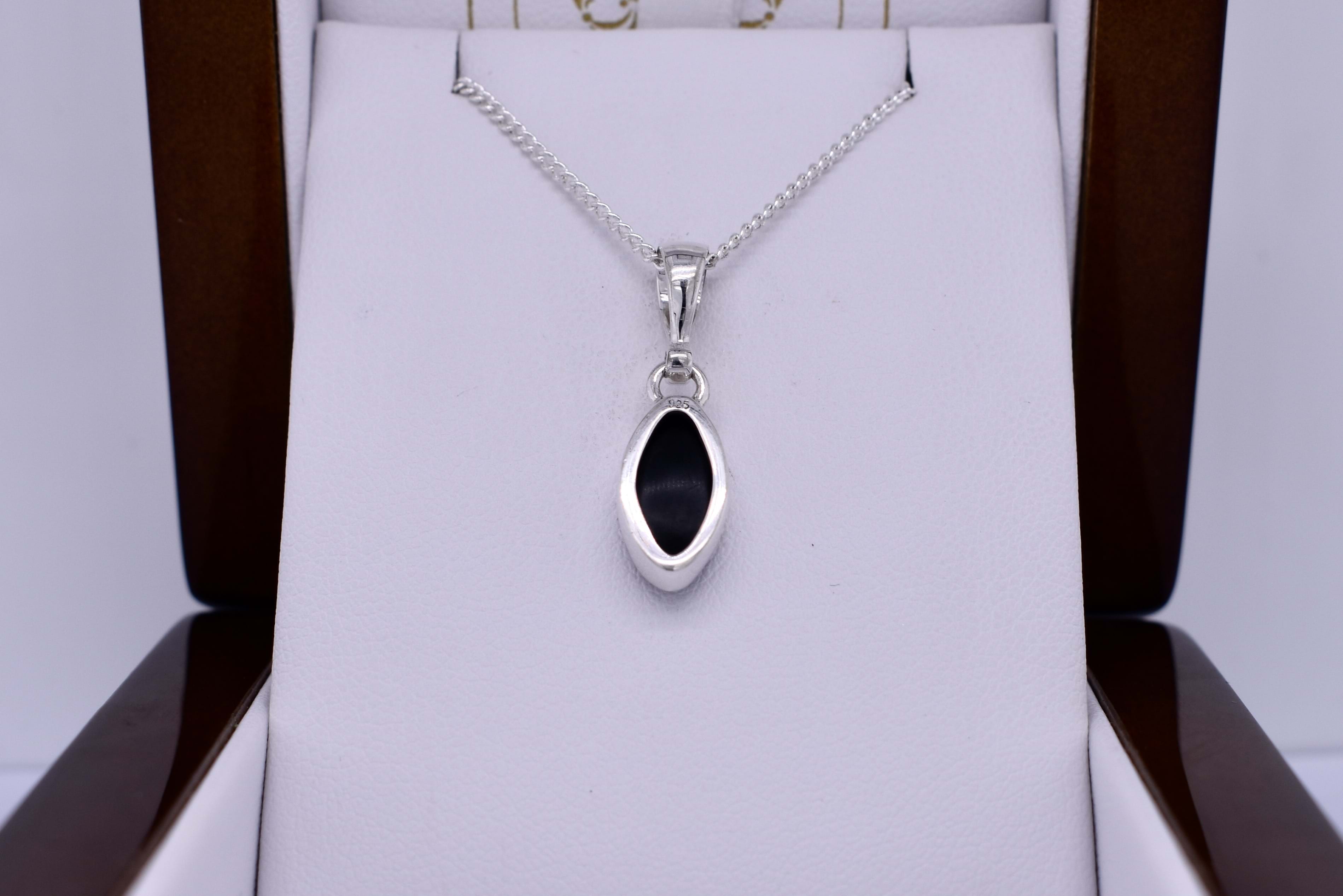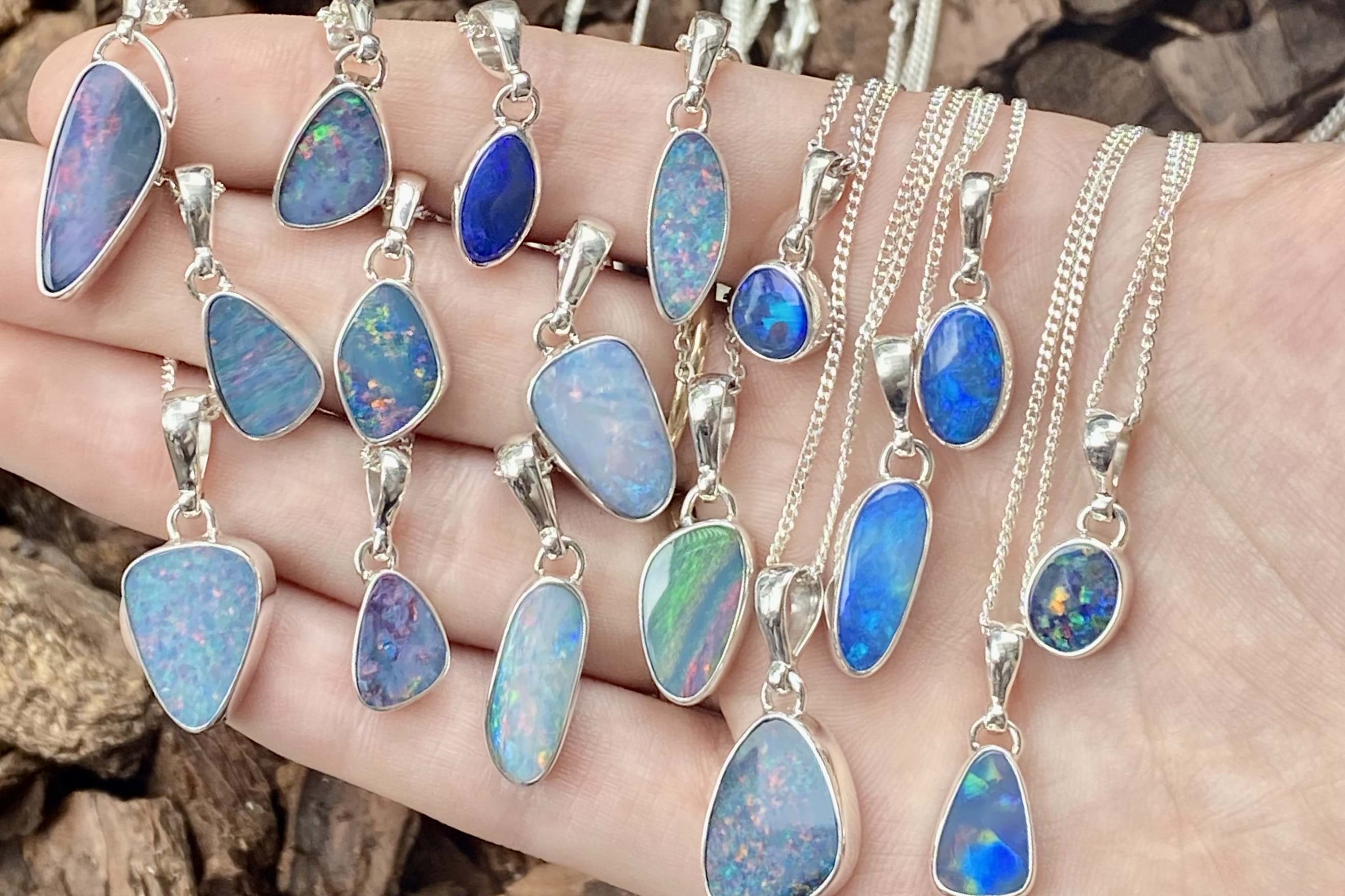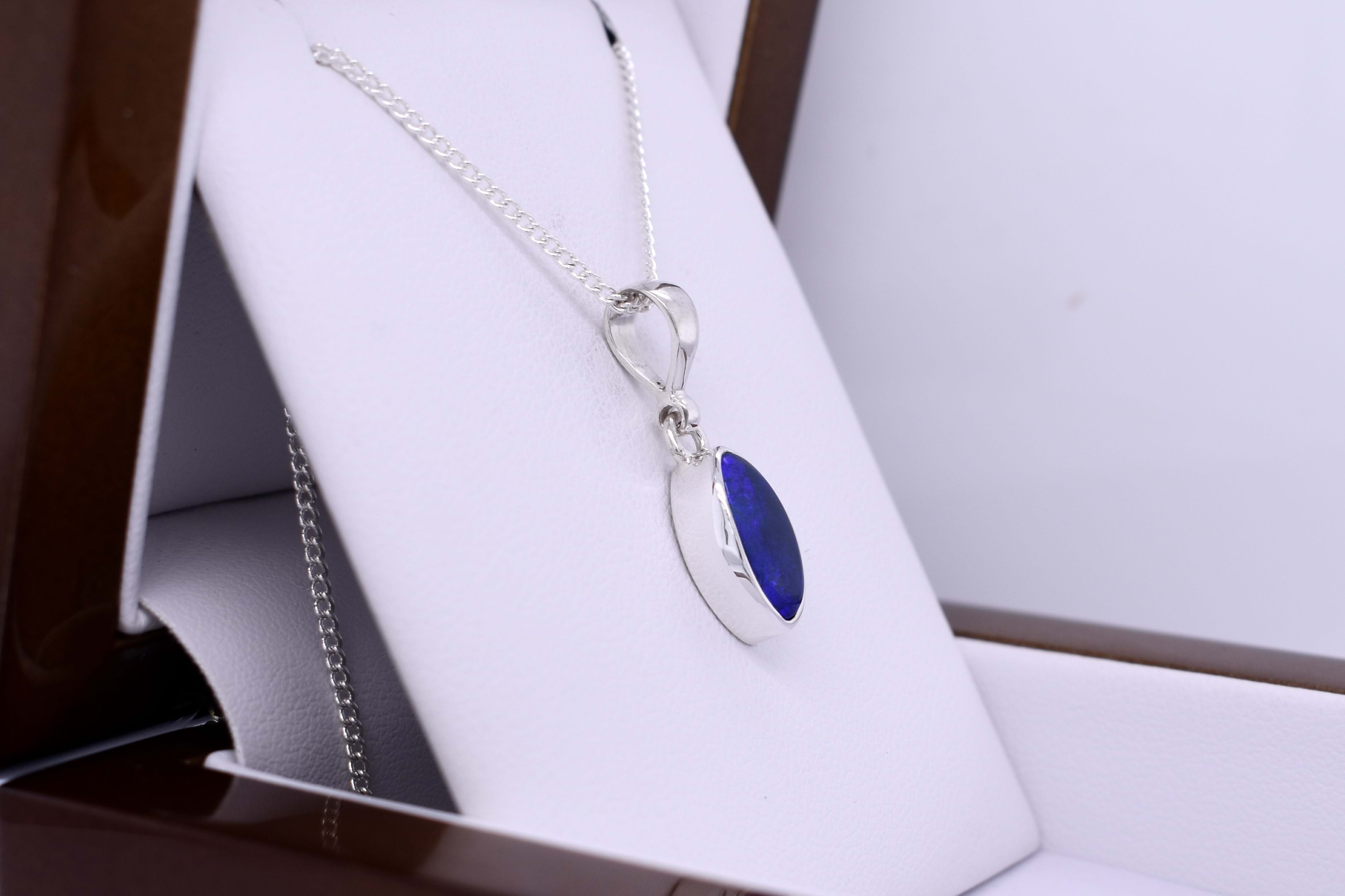 A beautiful cerulean freeform Lightning Ridge opal measuring 12.5x7.2mm, bezel set into a handmade sterling silver setting. The opal is a doublet, with a boulder opal backing and has flashes of blue throughout. Finished with a plain bale. Photographed in natural light with other pieces.