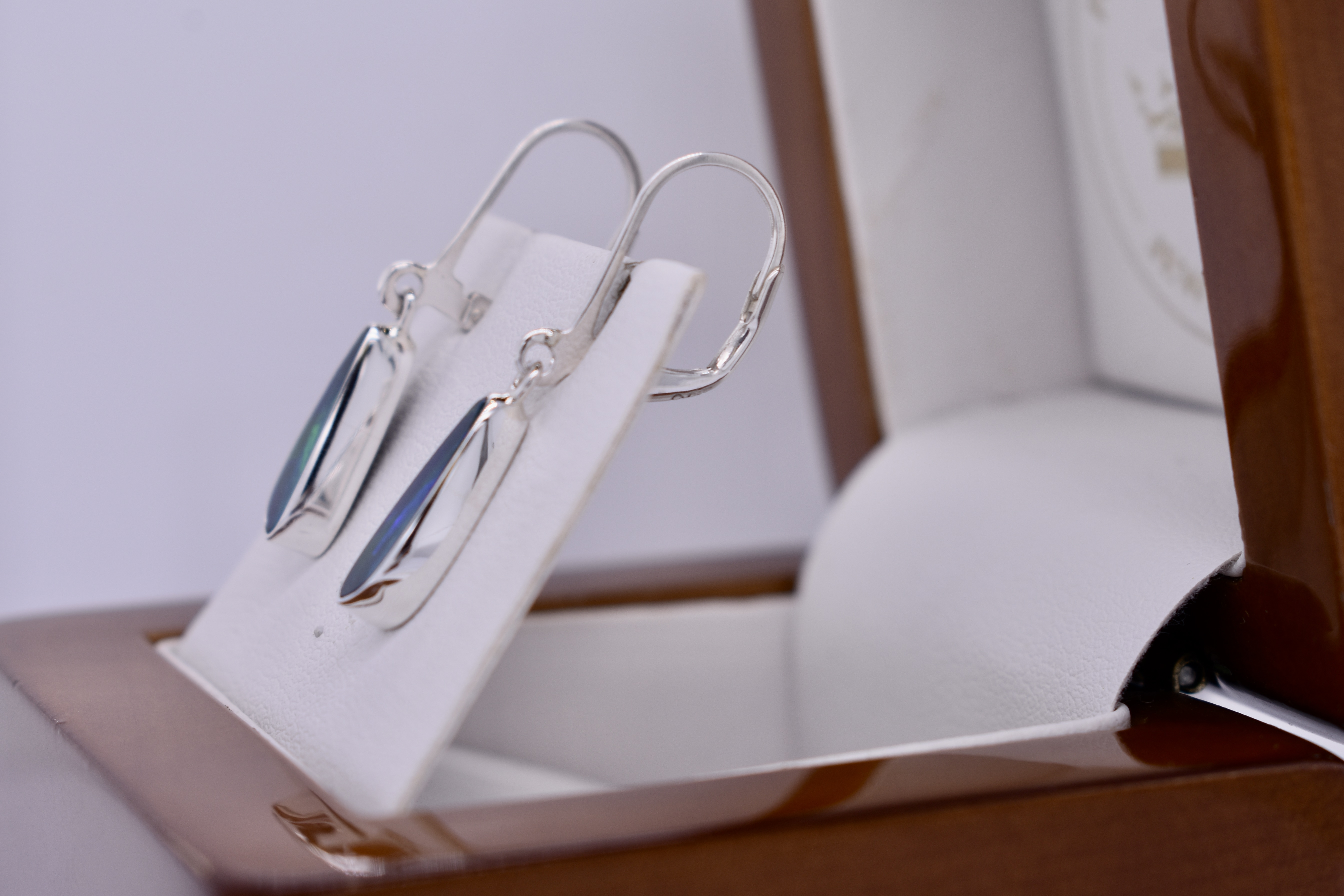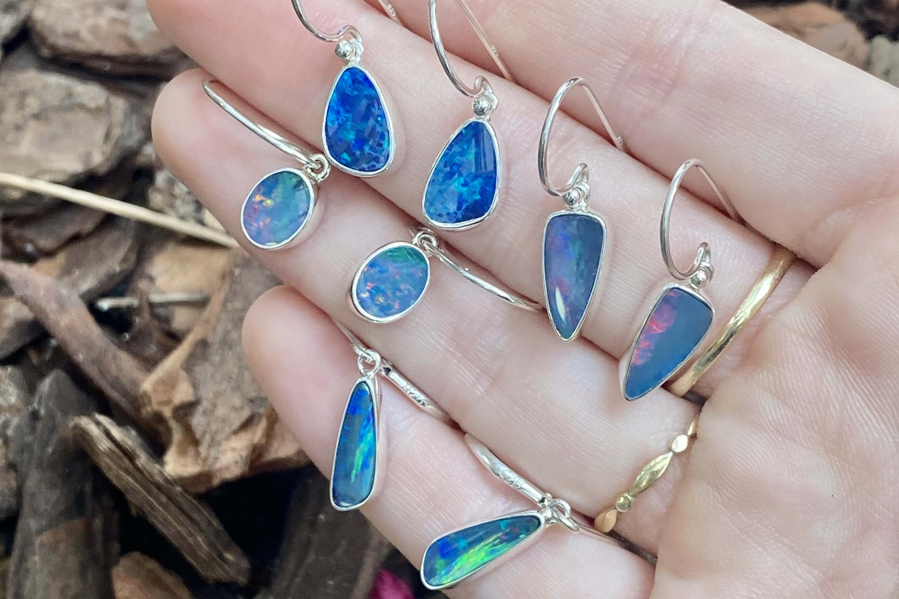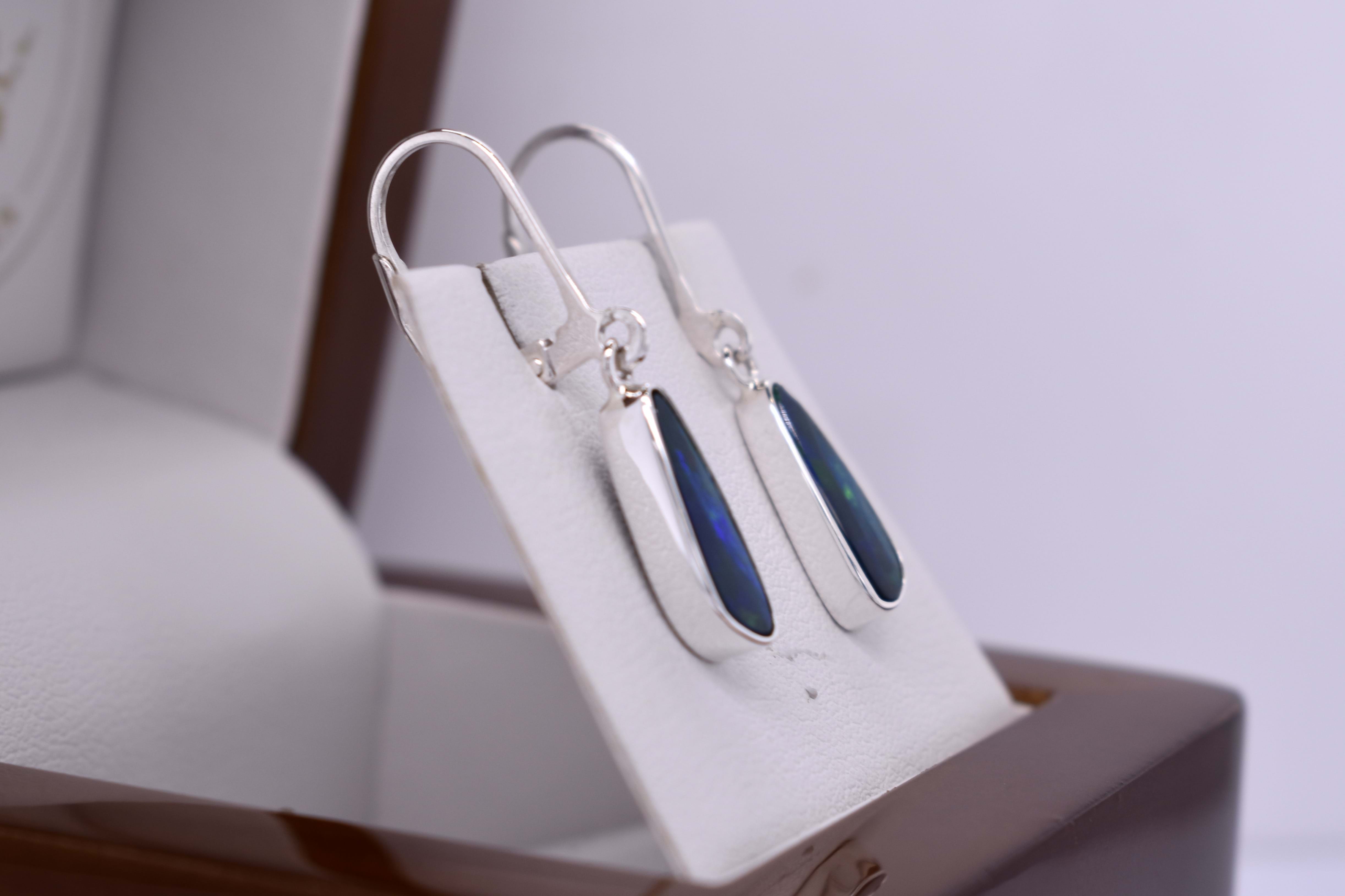 Vibrant and eye-catching, these freeform Coober Pedy opals measure approximately 13.6x5.1mm and are bezel set in handcrafted sterling silver settings. Each doublet has a boulder opal backing and flashes brilliant green and blue with every movement. Finished with secure euroclip fittings makes them a vibrant piece you cant ignore. Photographed outside with other pieces.