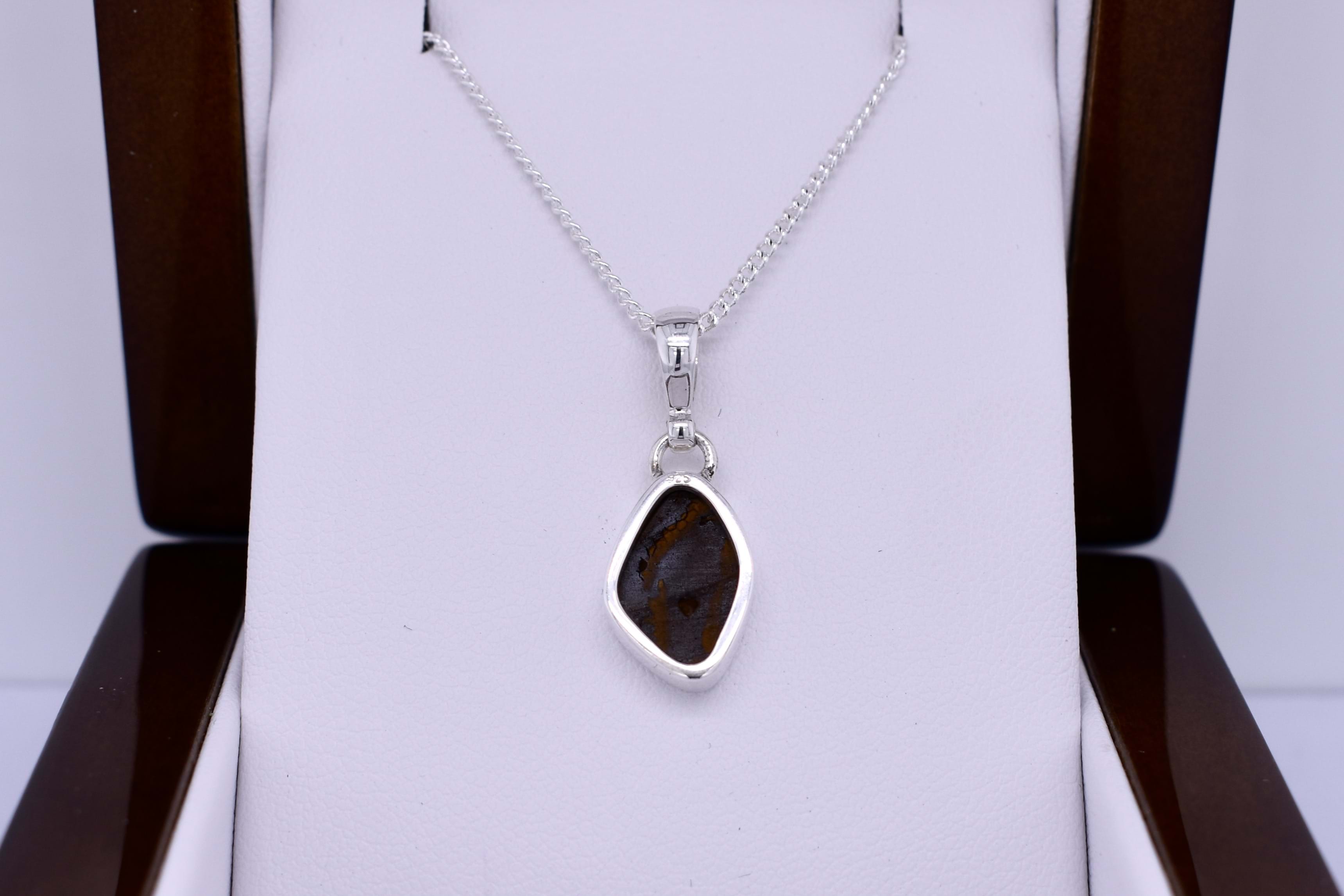 A gorgeous freeform Coober Pedy opal measuring 13.8x9.3mm, bezel set into a handmade sterling silver setting. The opal is a doublet, with a boulder opal backing and has flashes of red, orange and green throughout. Finished with a plain bale. Photographed in natural light with other pieces.