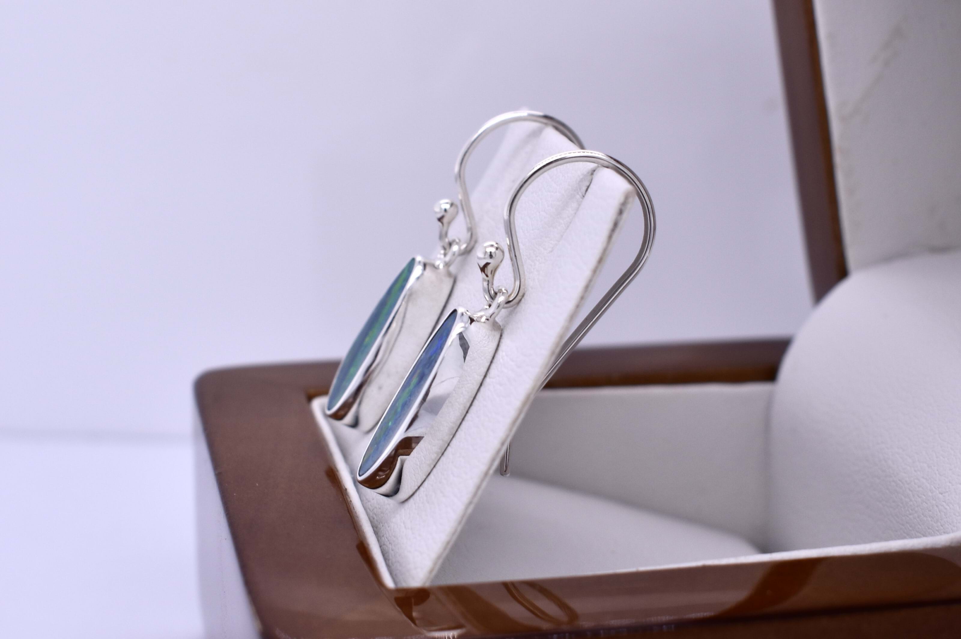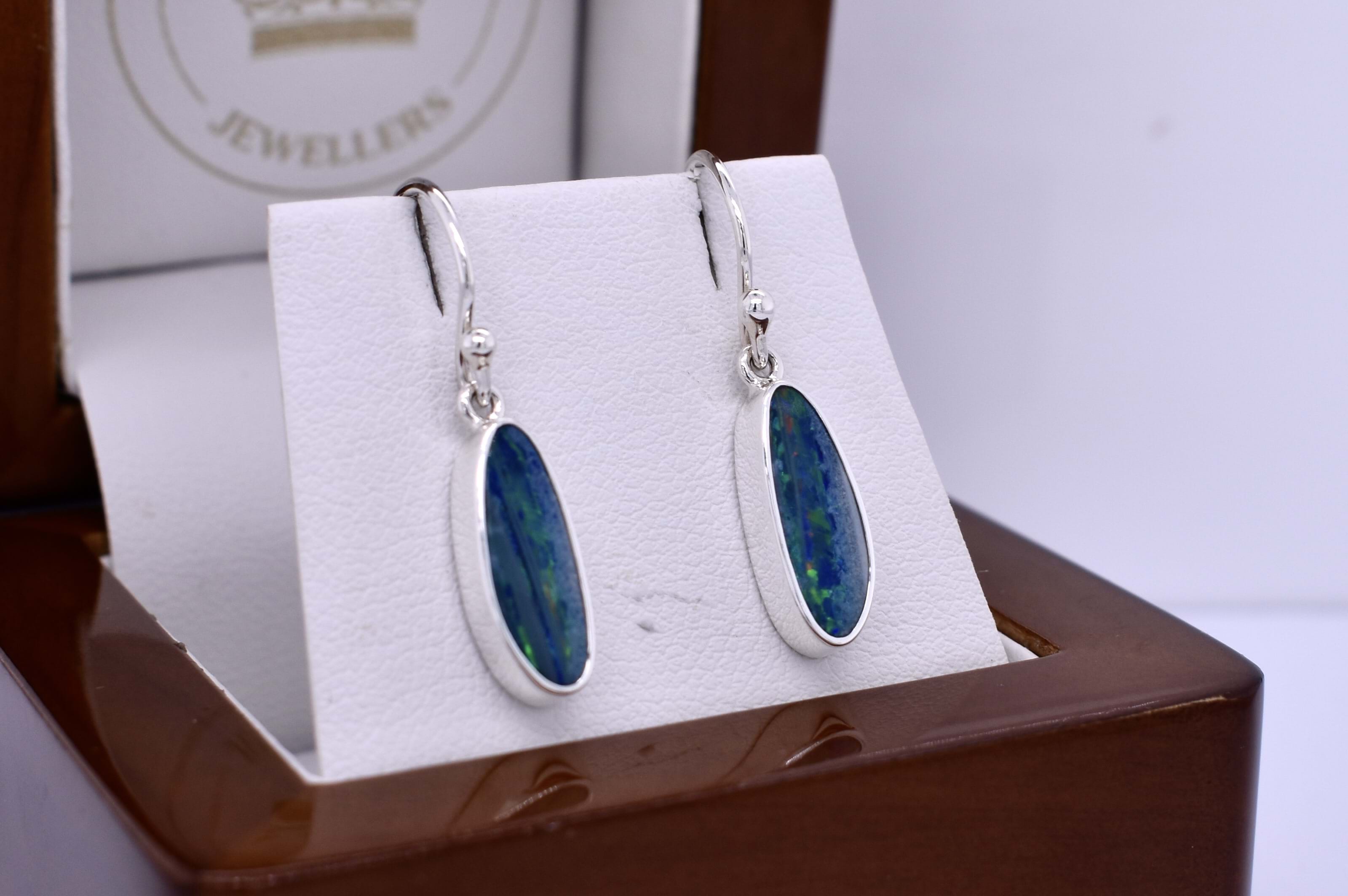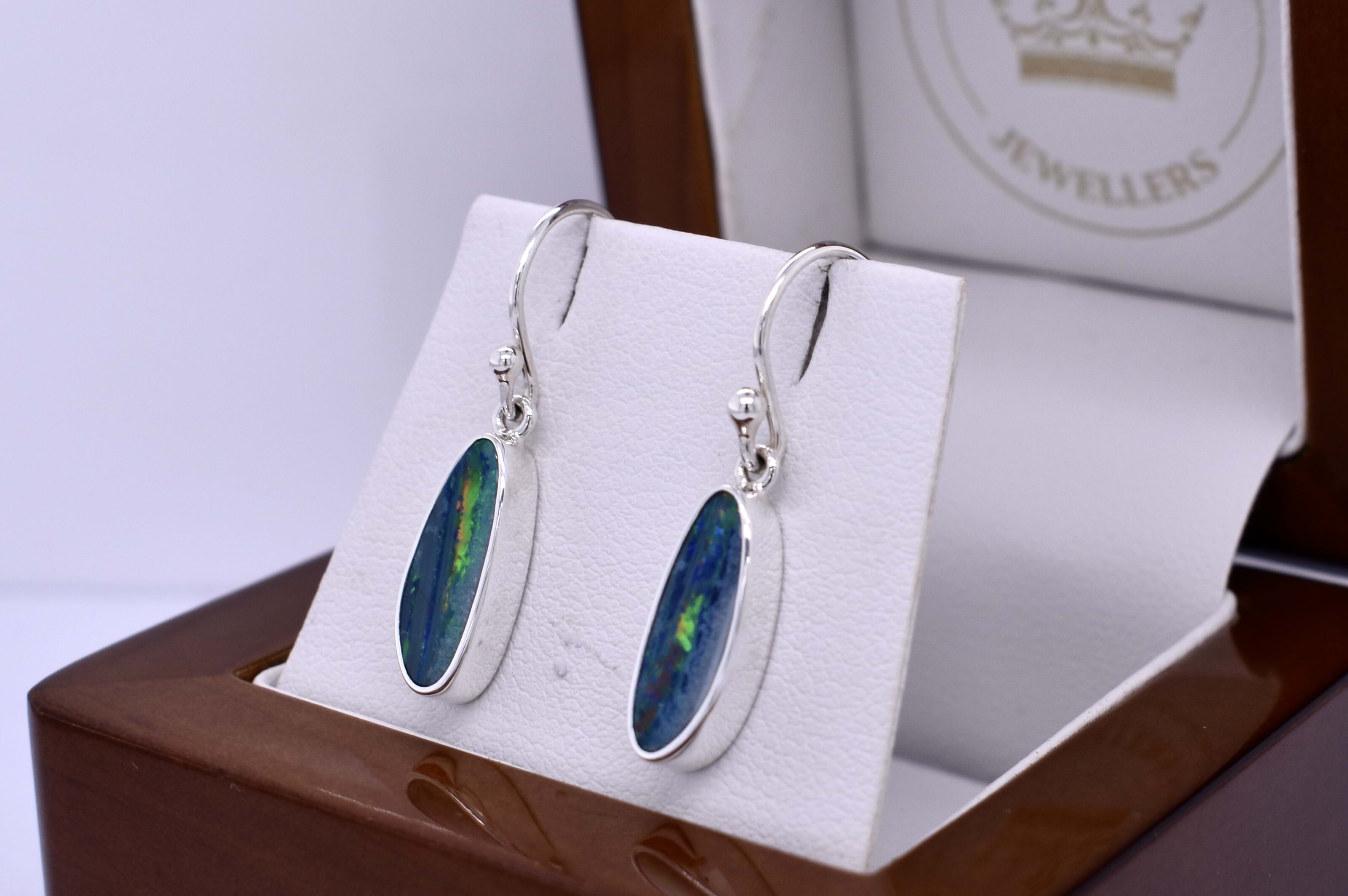 Showcasing dazzling freeform Coober Pedy opals measuring approximately 14.7x10 mm, these earrings are bezel set in handcrafted sterling silver settings. The opal doublets, backed with boulder opal, display bright flashes of green, yellow, and orange across the surface. Finished with classic sterling silver shepherd hook fittings for comfortable wear. Photographed in natural light with other pieces.