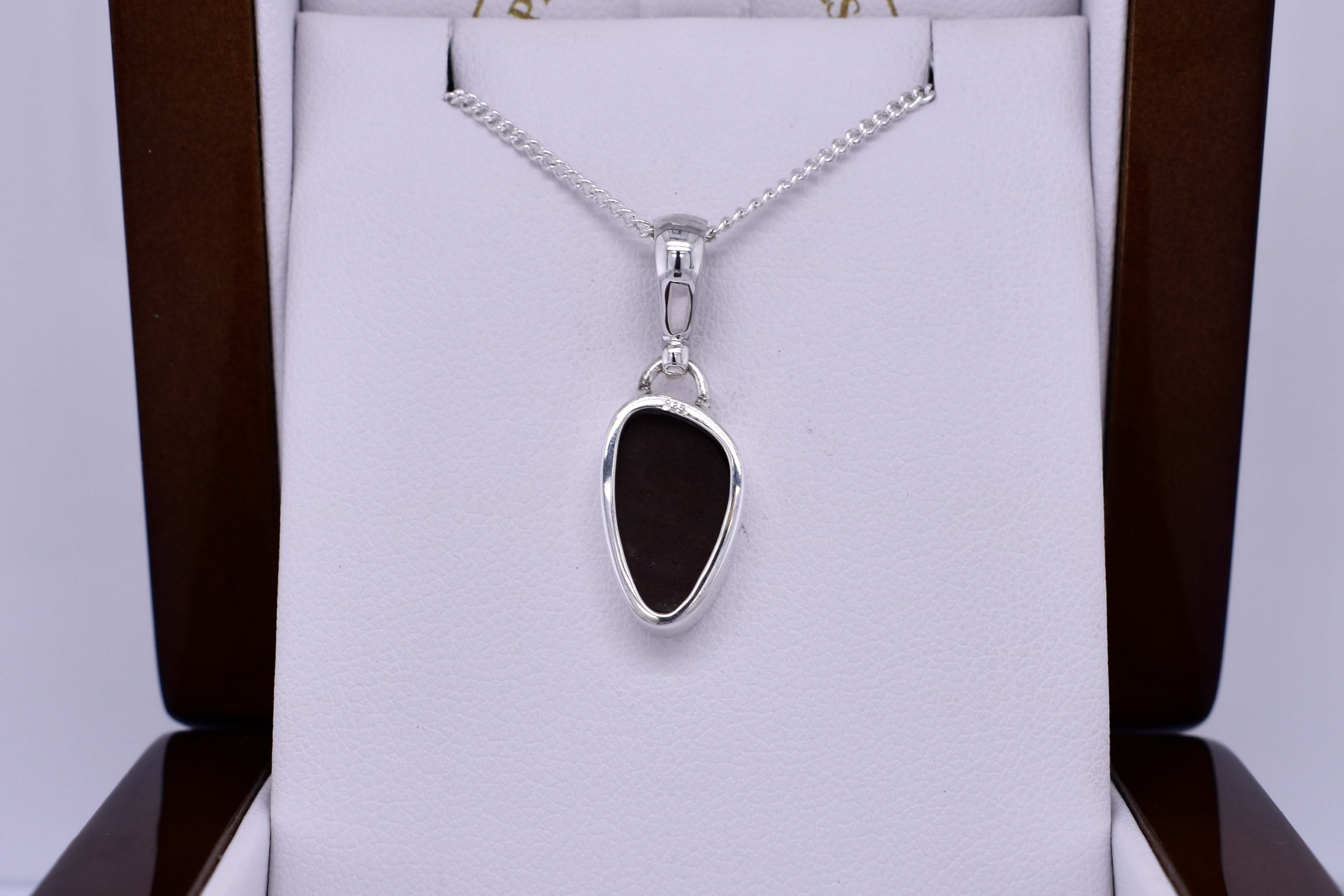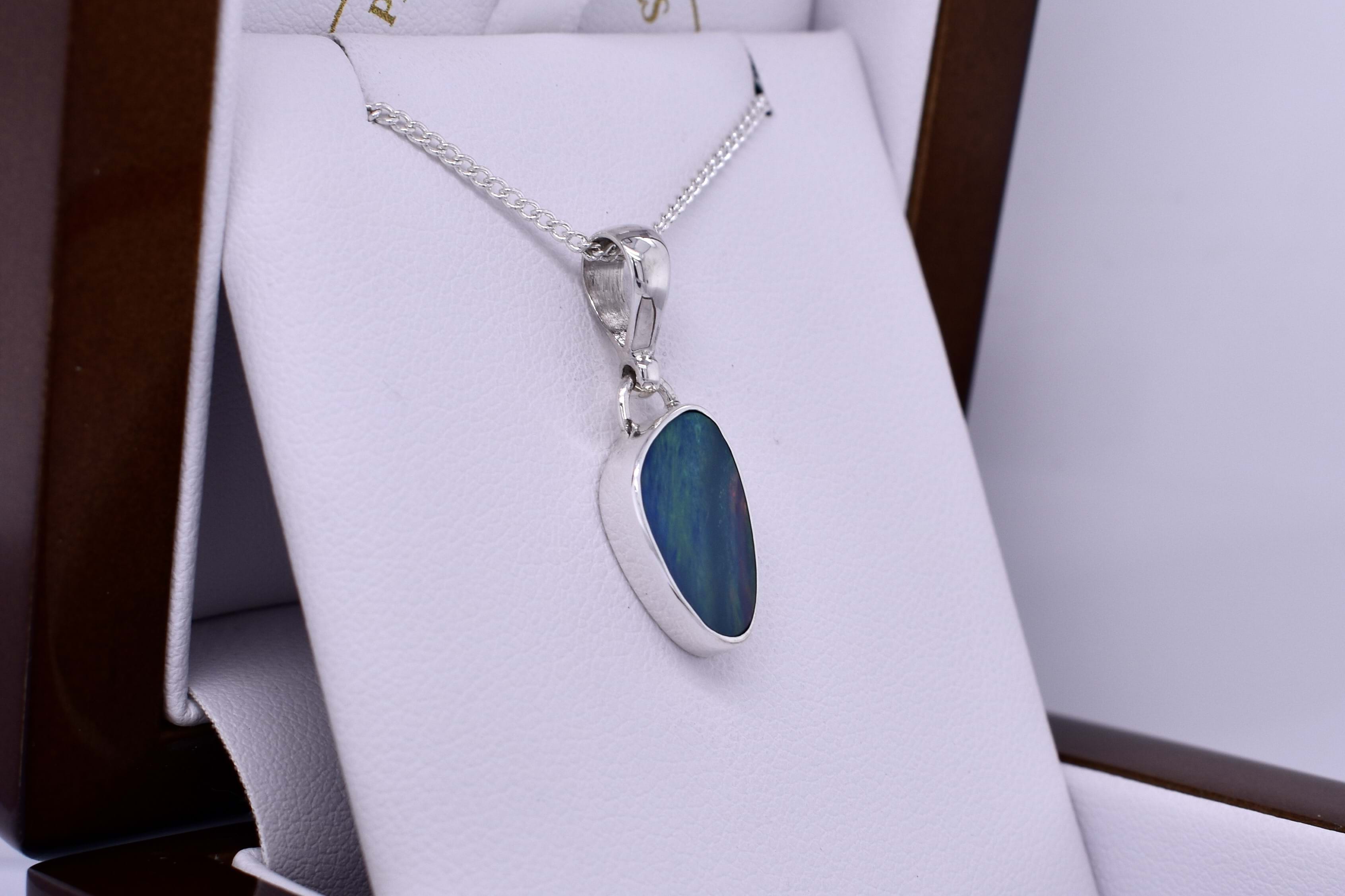 A stunning freeform shaped Coober Pedy opal measuring 15.2x9.1mm, bezel set into a handmade sterling silver setting. The opal is a doublet, with a boulder opal backing and has flashes of blue, green and red throughout. Finished with a plain bale. Photographed in natural light with other pieces.