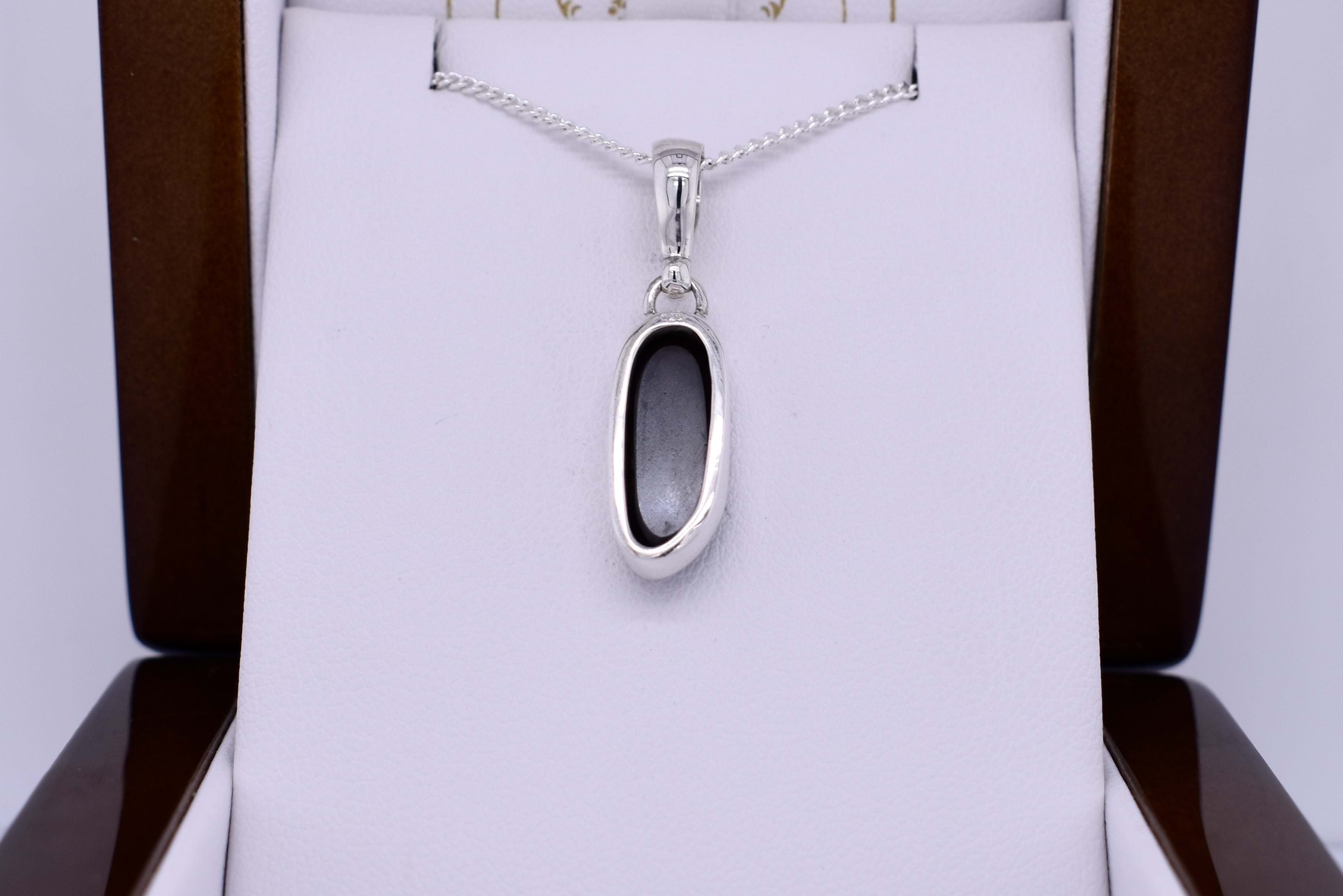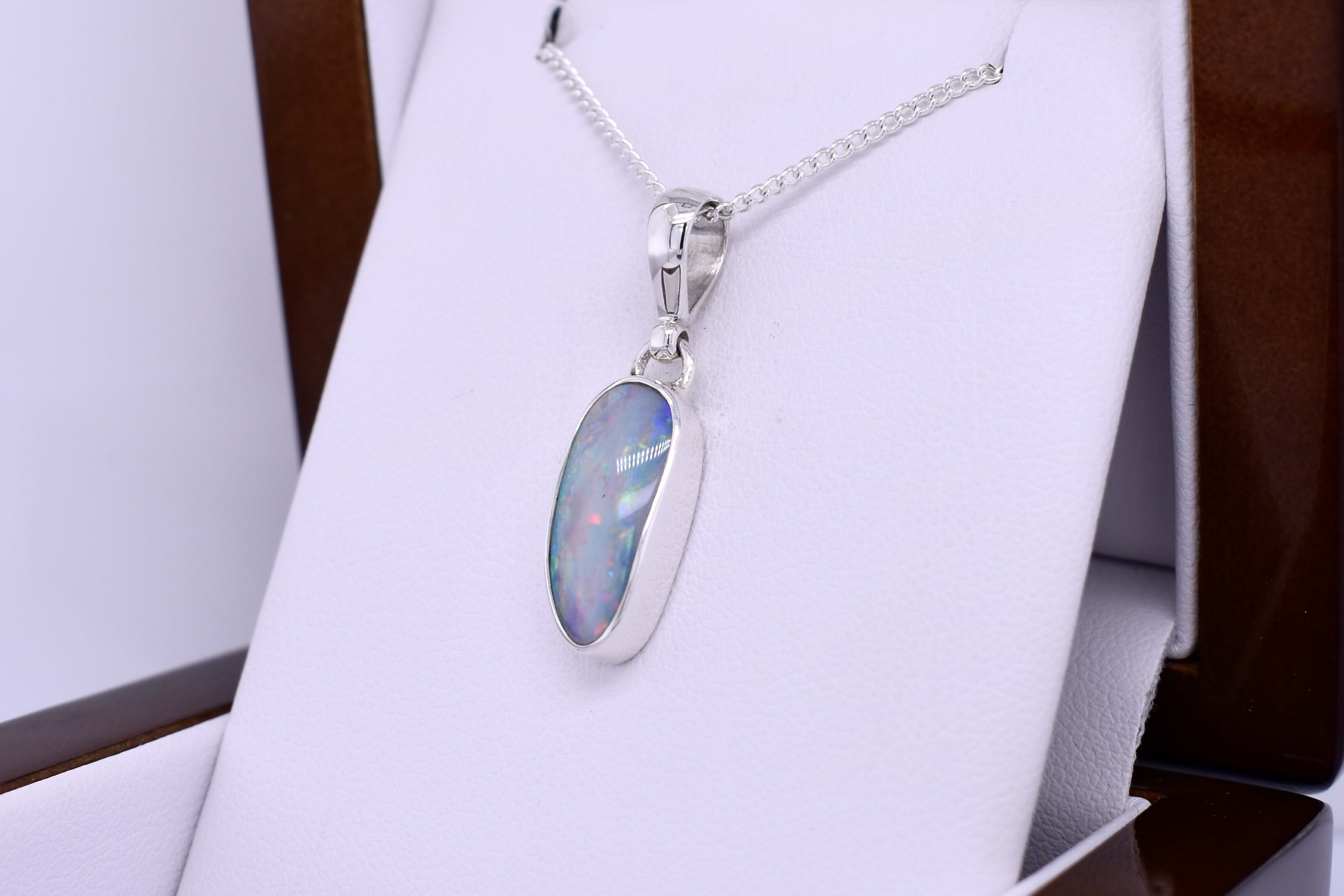 A bright freeform shaped Coober Pedy opal measuring 16.1x9.3mm, bezel set into a handmade sterling silver setting. The opal is a doublet, with a boulder opal backing and has flashes of blue, green and red in a pinfire pattern. Finished with a plain bale. Photographed in natural light with other pieces.