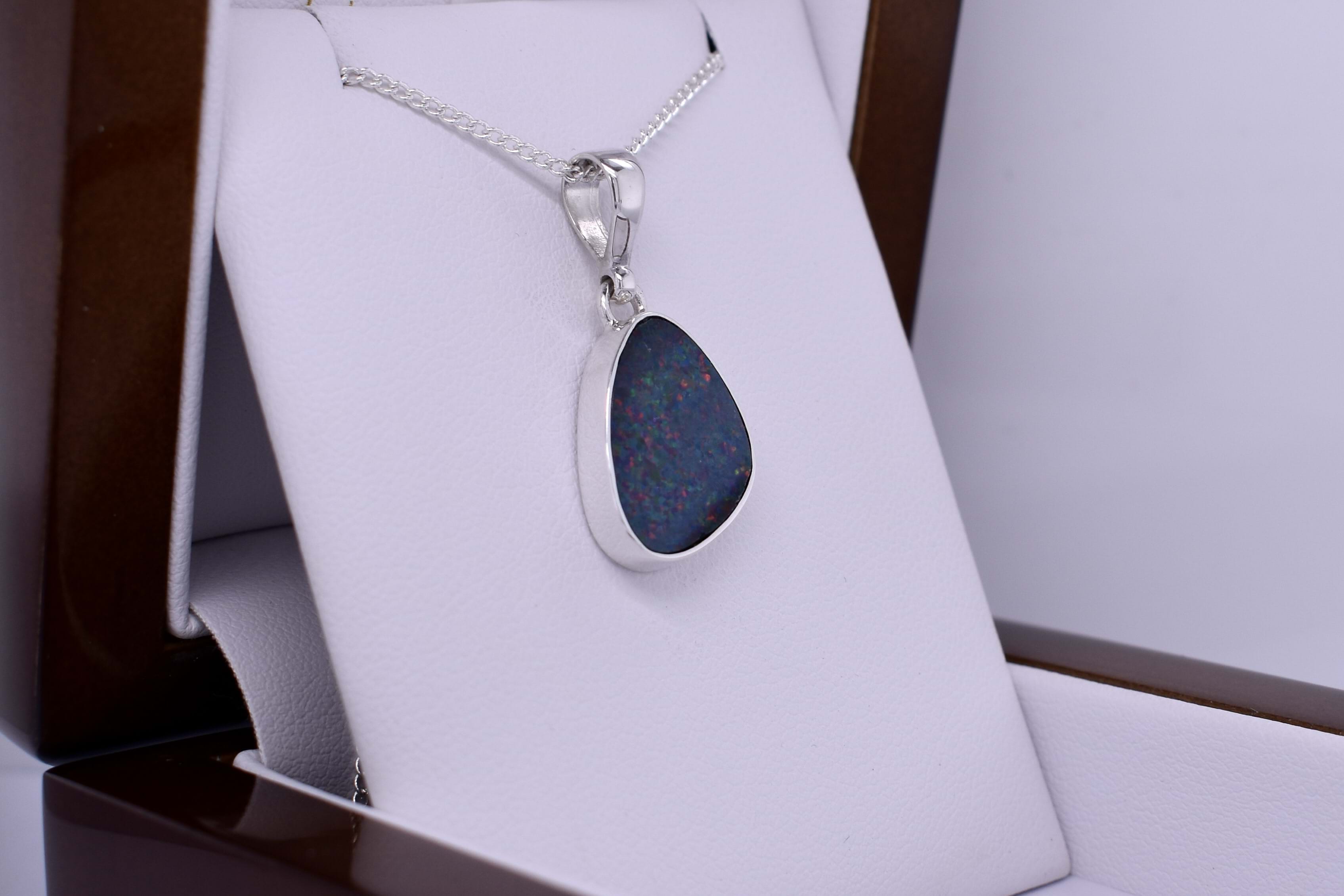 A dazzling freeform shaped Coober Pedy opal measuring 17.1x12.2mm, bezel set into a handmade sterling silver setting. The opal is a doublet, with a boulder opal backing and has flashes of red, orange and green in a pinfire pattern. Finished with a plain bale. Photographed in natural light with other pieces.