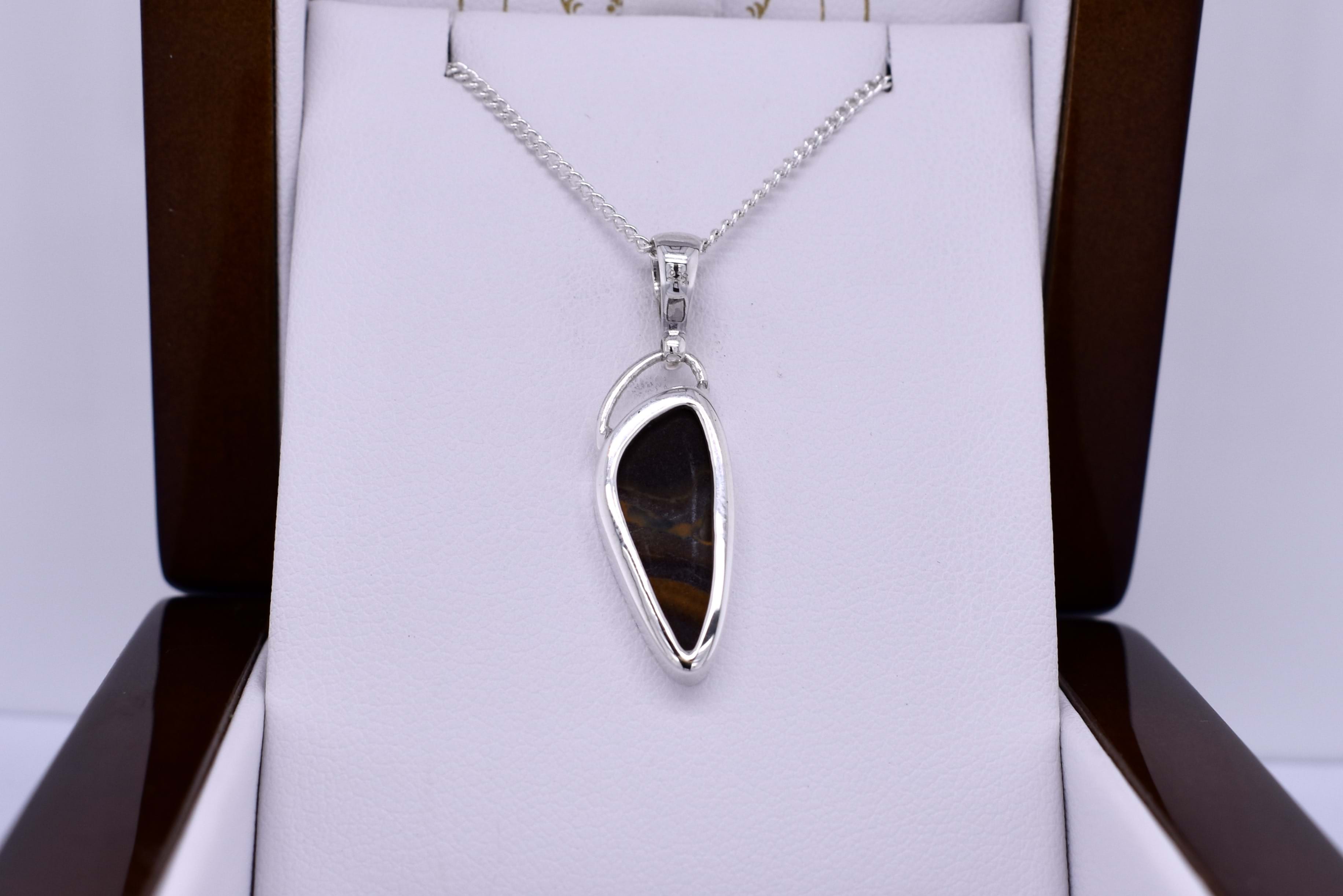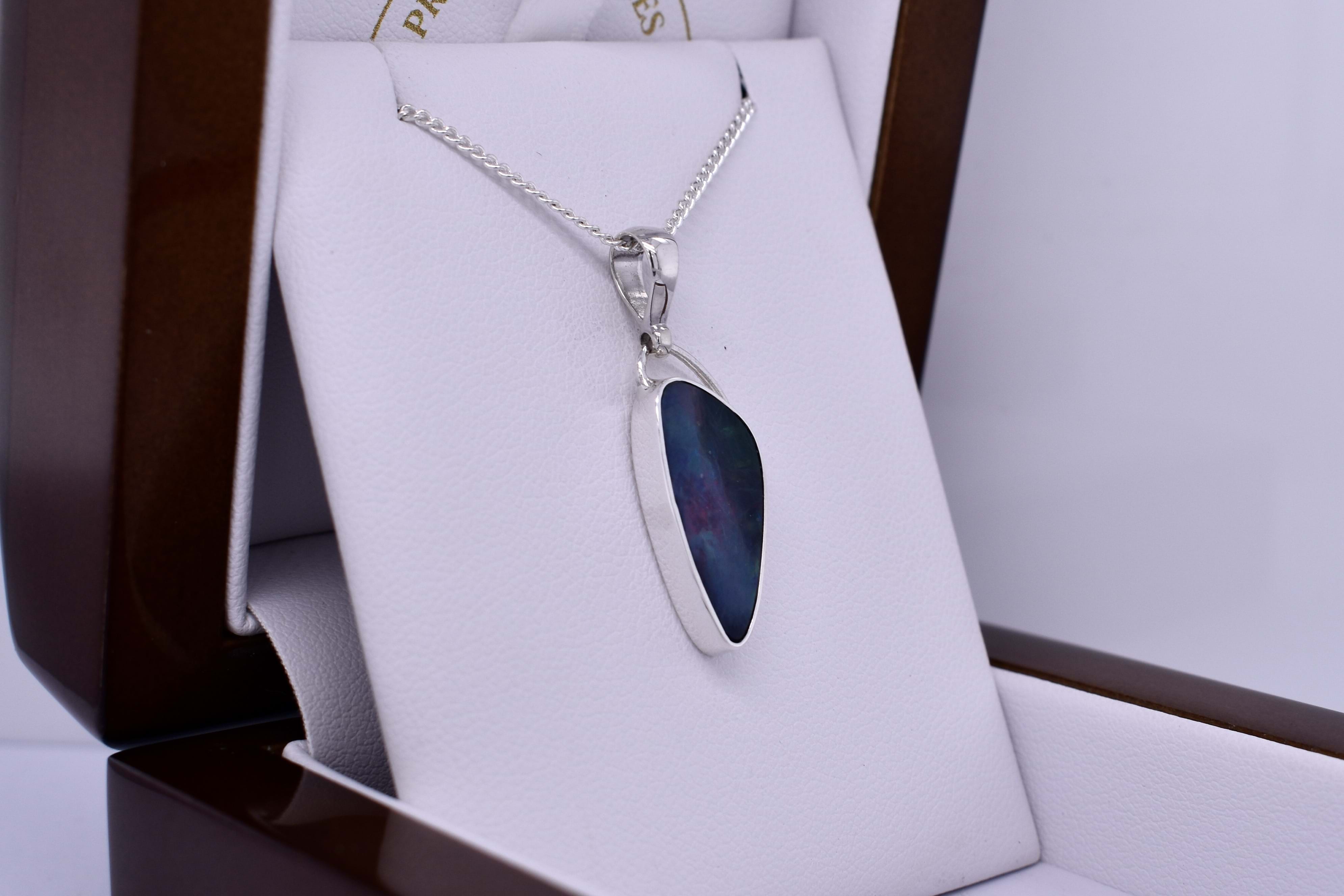 A mystical looking freeform shaped Coober Pedy opal measuring 19.7x9.4mm, bezel set into a handmade sterling silver setting. The opal is a doublet, with a boulder opal backing and has flashes of red, purple and green throughout. Finished with a plain bale. Photographed in natural light with other pieces.