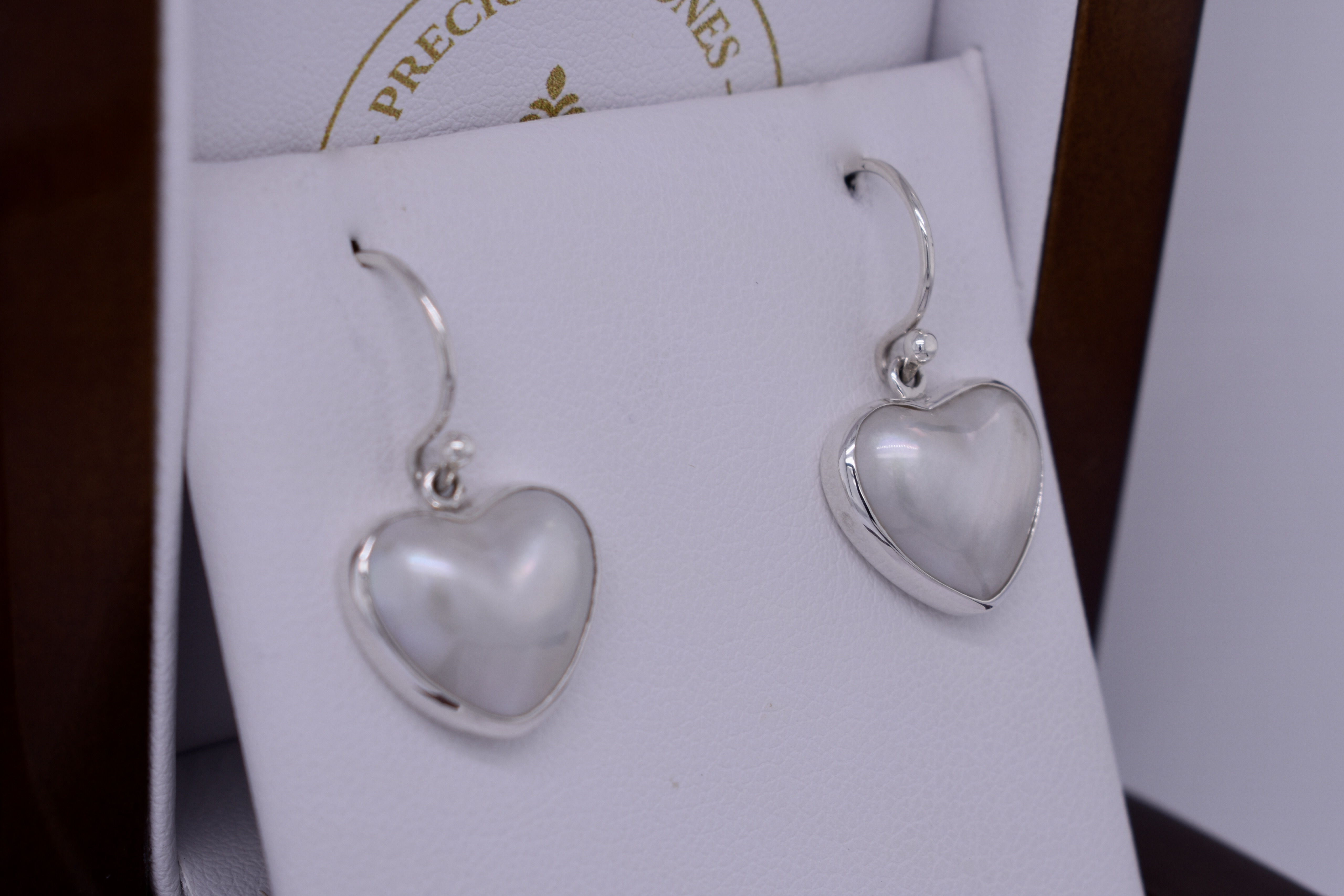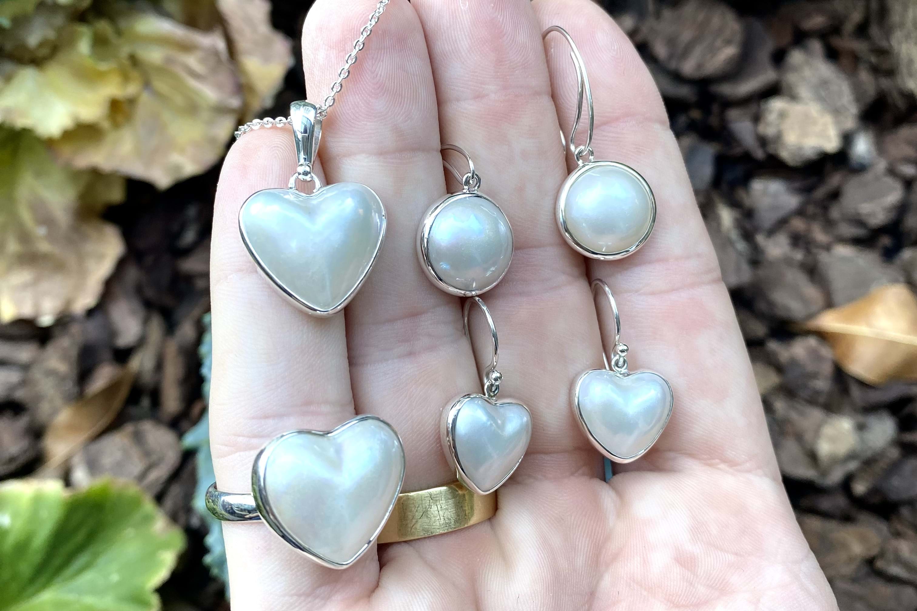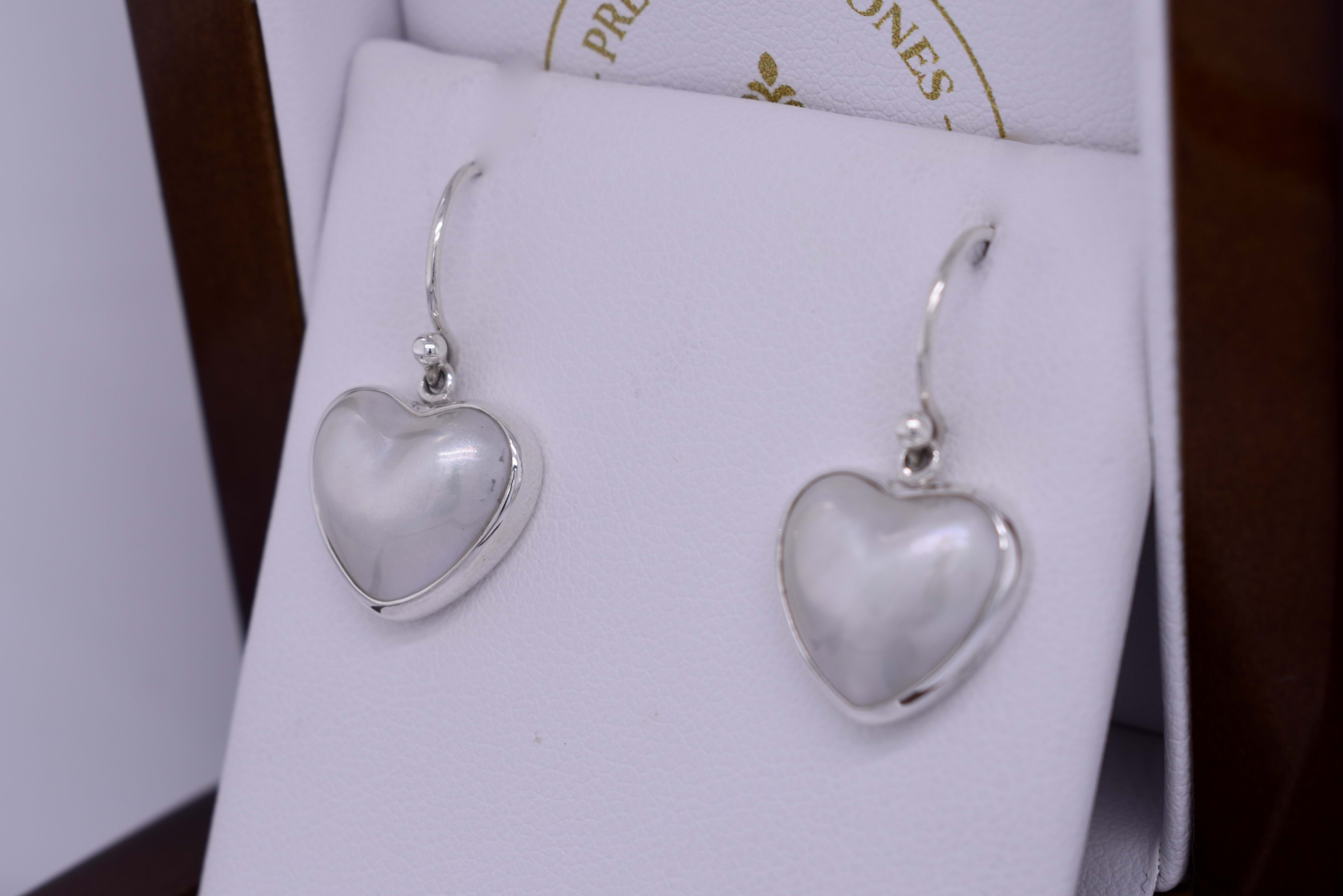 These eye-catching mabe pearl drops feature two white mabe pearls measuring approx. 12.9x14.4mm bezel set into a handmade sterling silver setting finished with shepherd hooks.
