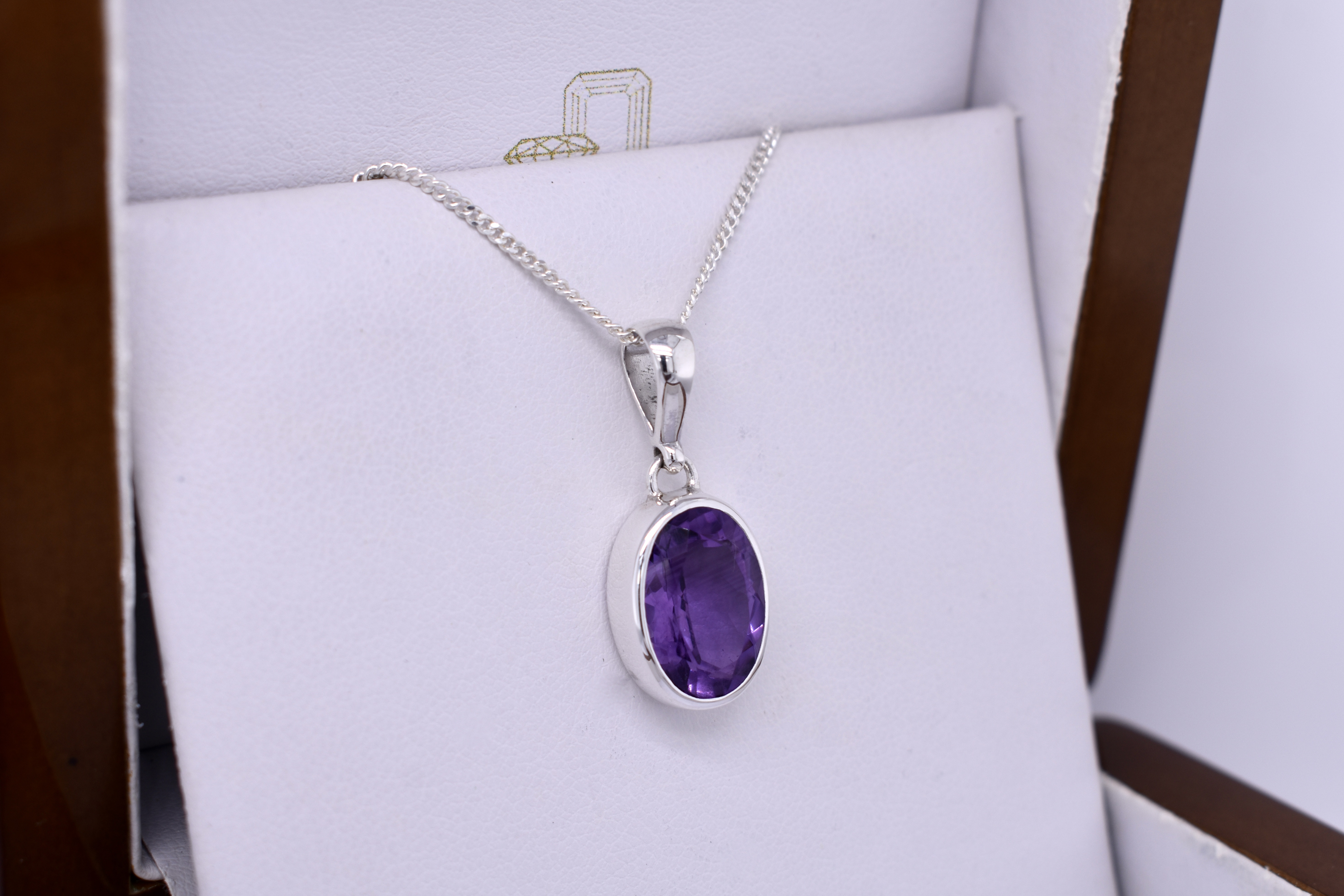 Lovely oval shaped amethyst pendant, bezel set in sterling silver with a plain bale. Amethyst measures 14x10mm and is finished with a plain pendant bale. Chains available for separate purchase.