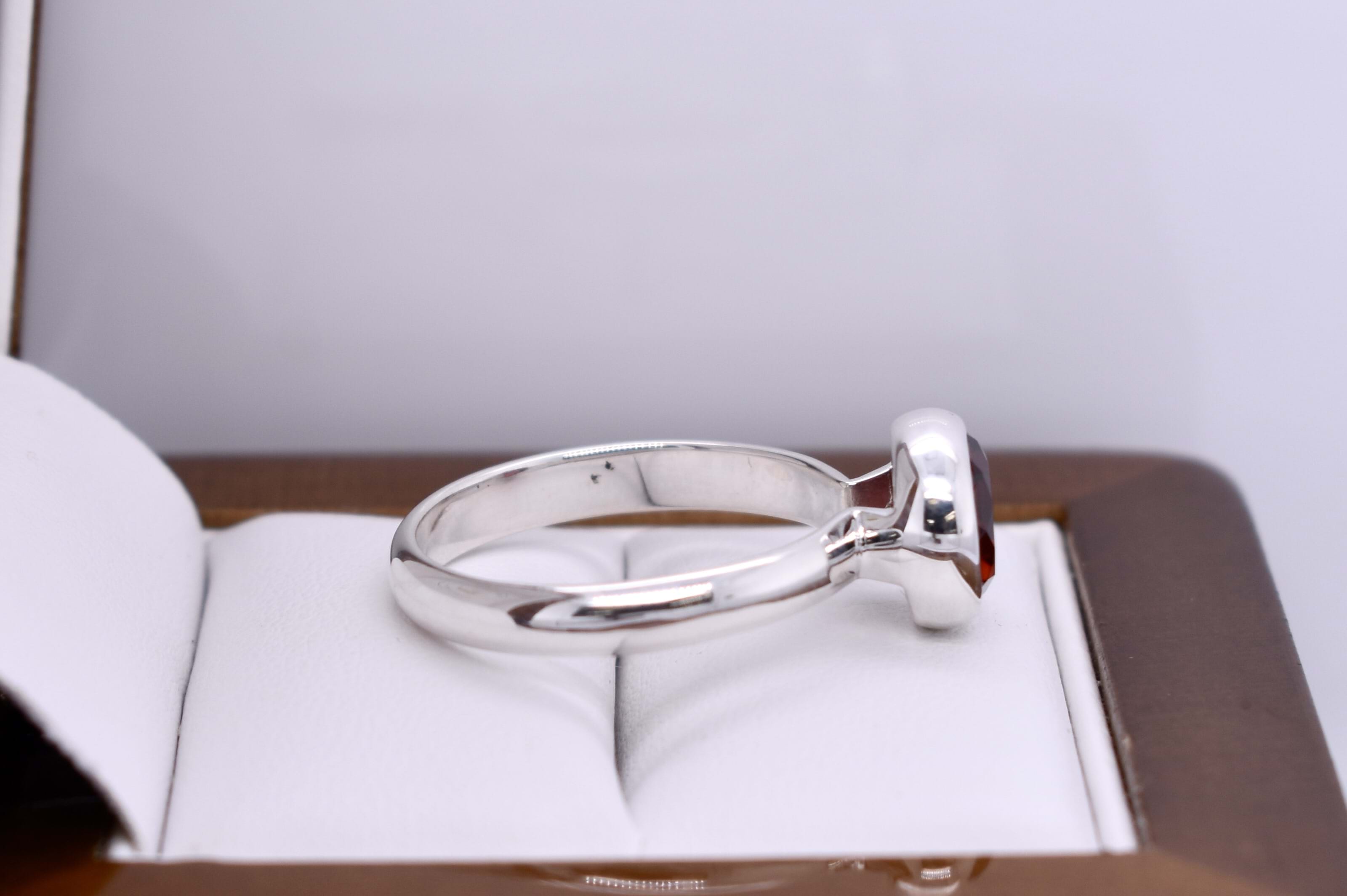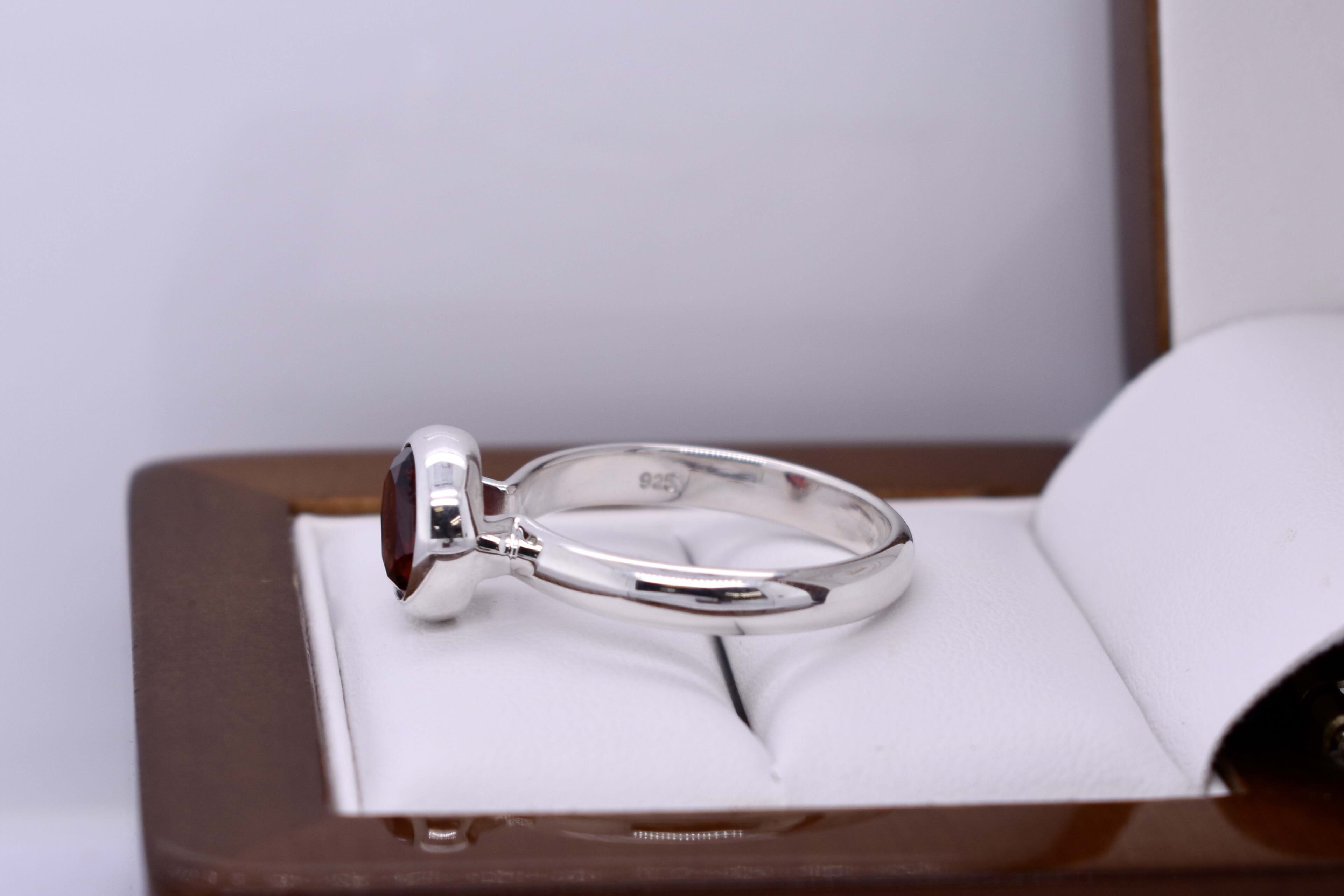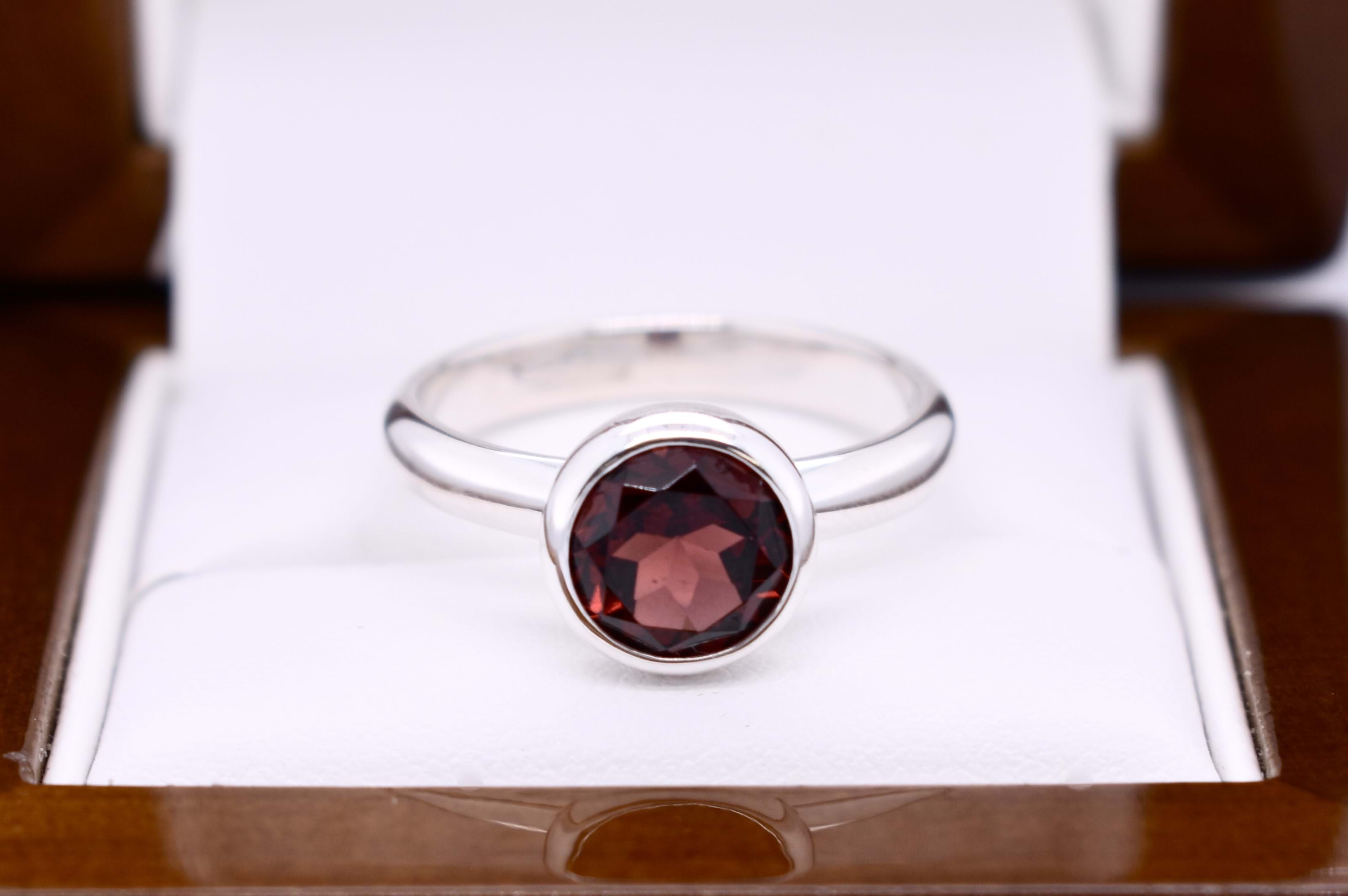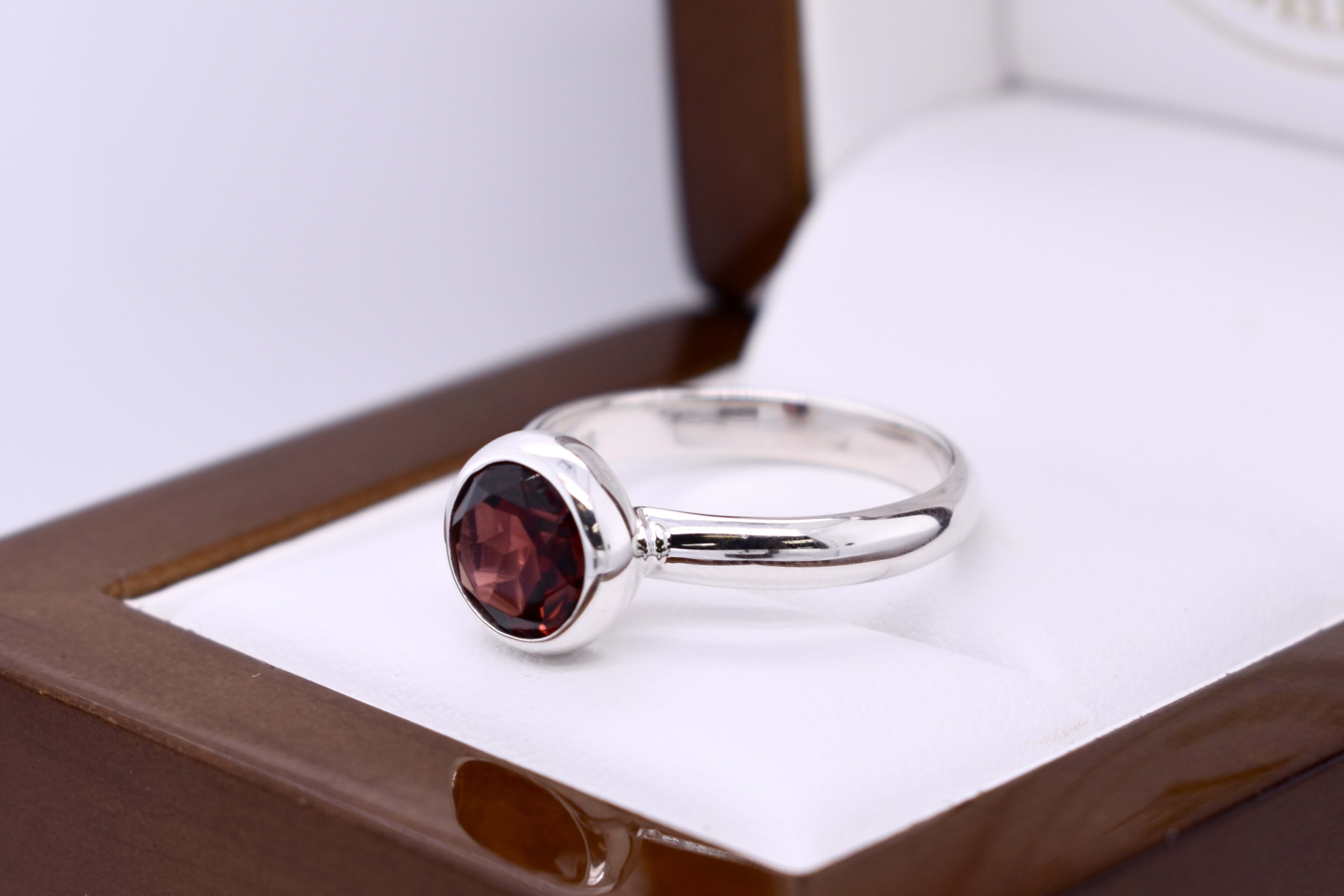 A magical round shaped garnet ring, bezel set, in sterling silver. This handmade ring measures 9.9mm round and is completed with a plain silver band. Finger size R.