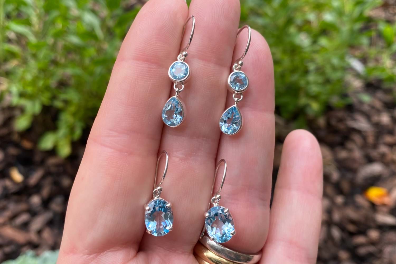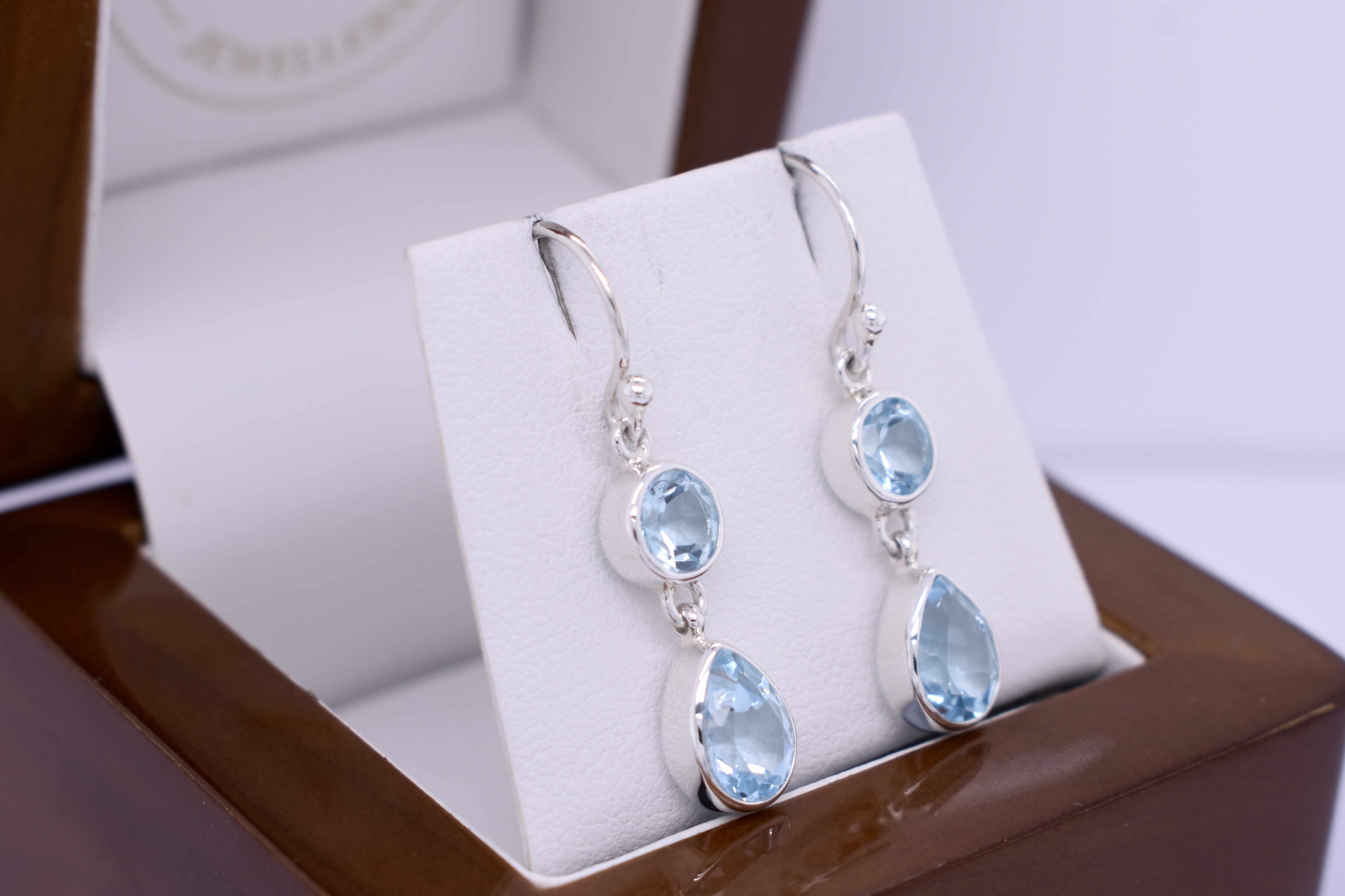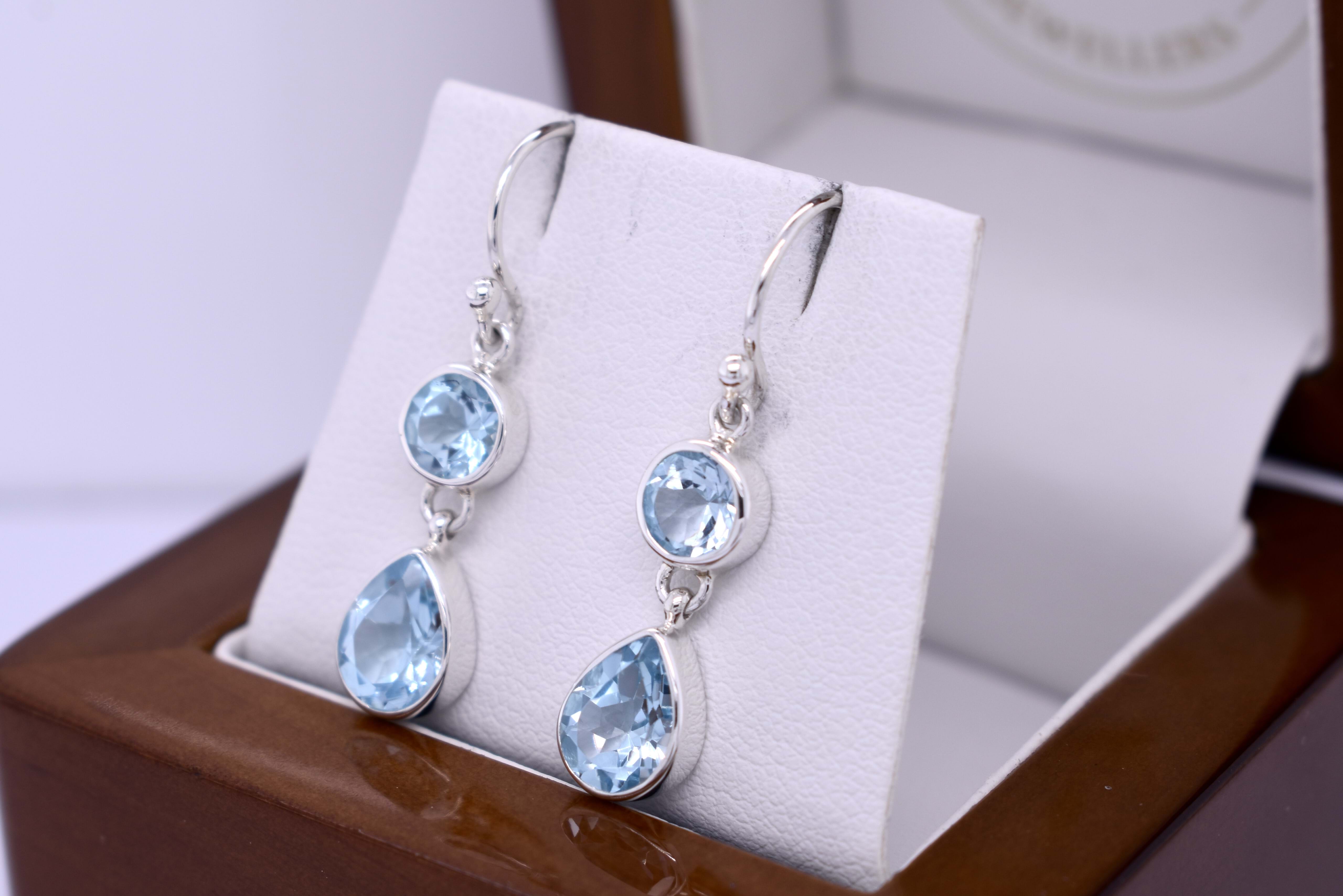 This pair of stunning sterling silver double drops featuring two 9.1x6.9mm pear shaped stones suspended from 6.5mm round stones, bezel set in a handmade settings with shepherd hook fittings.