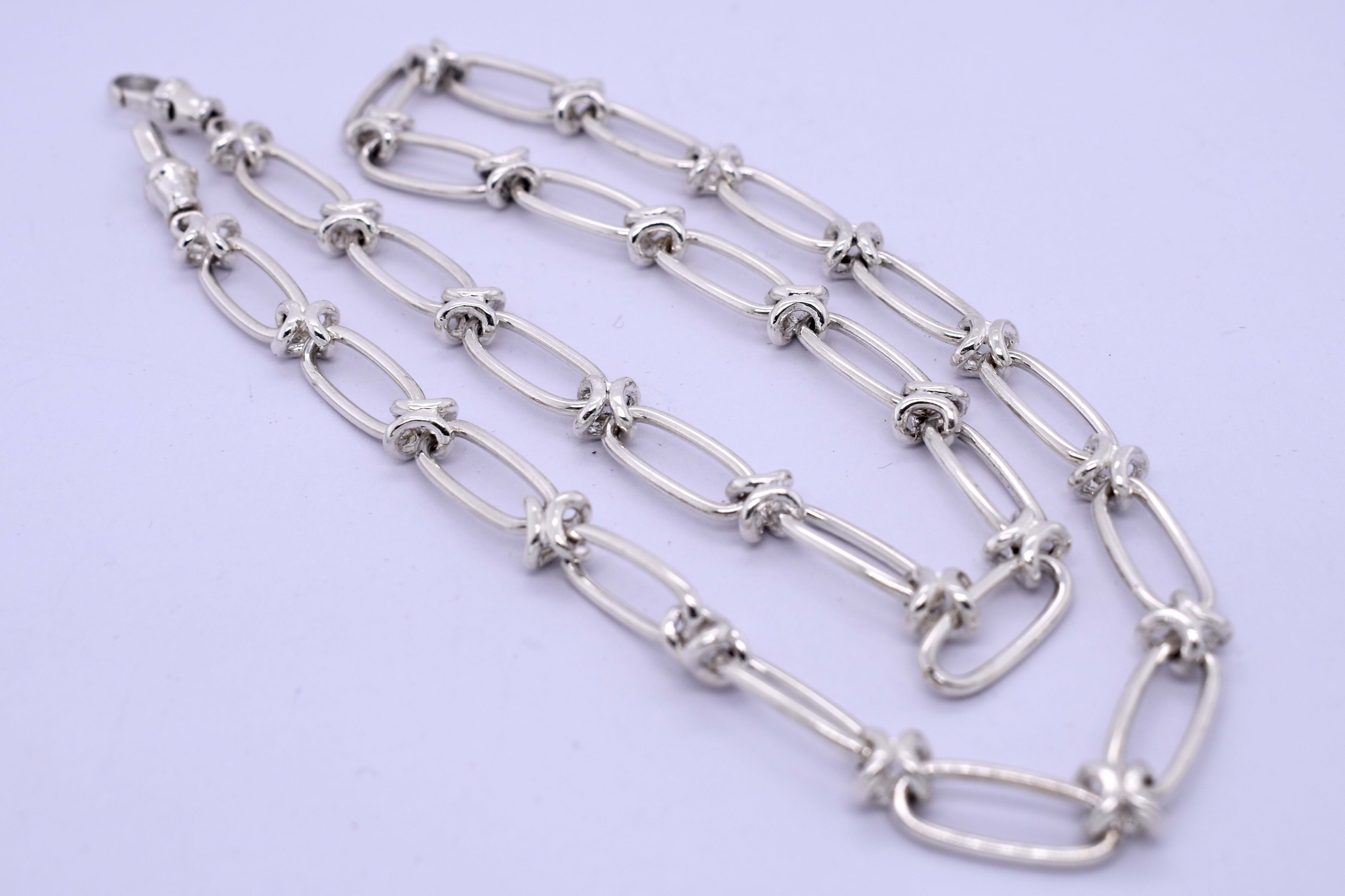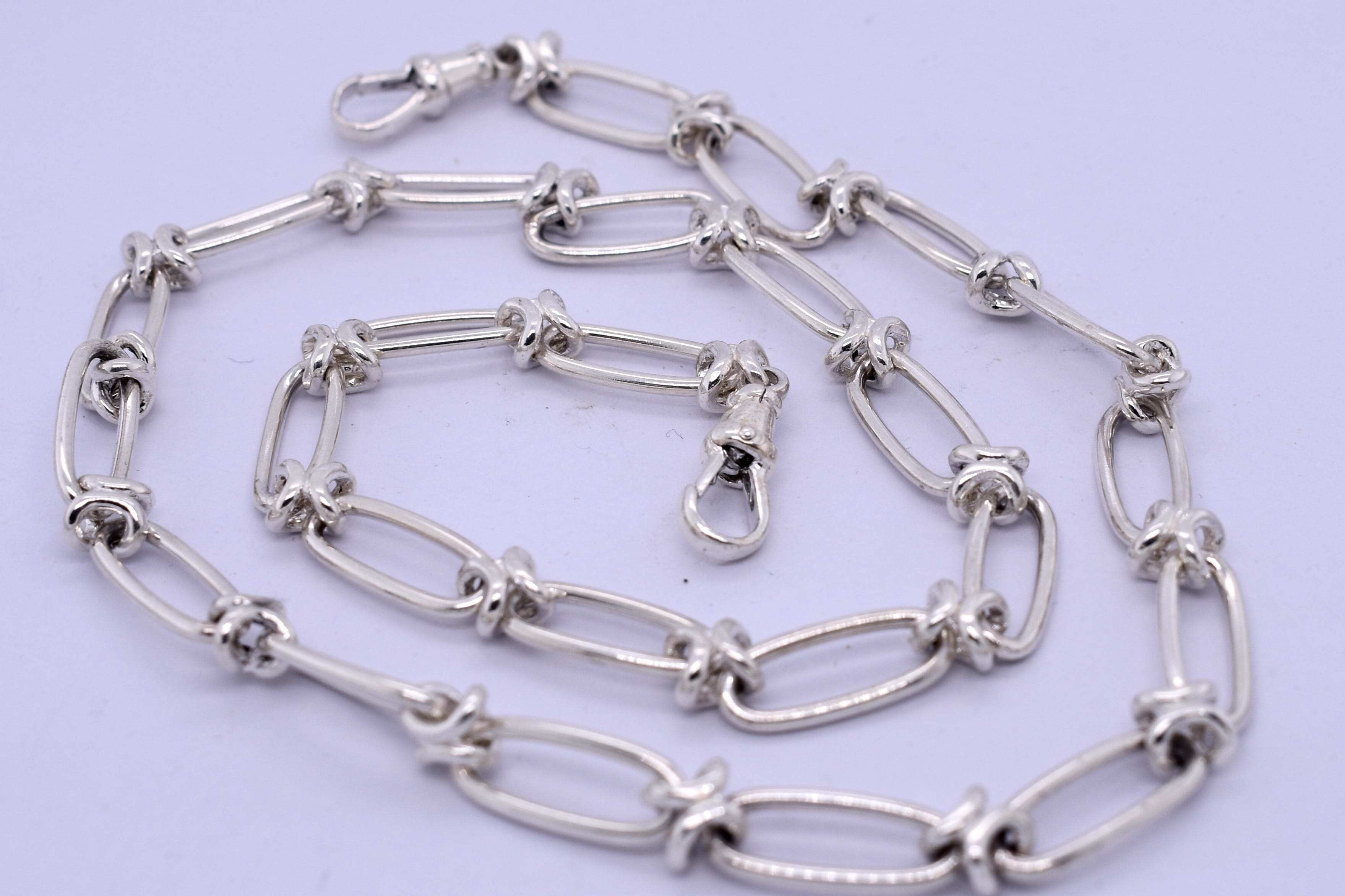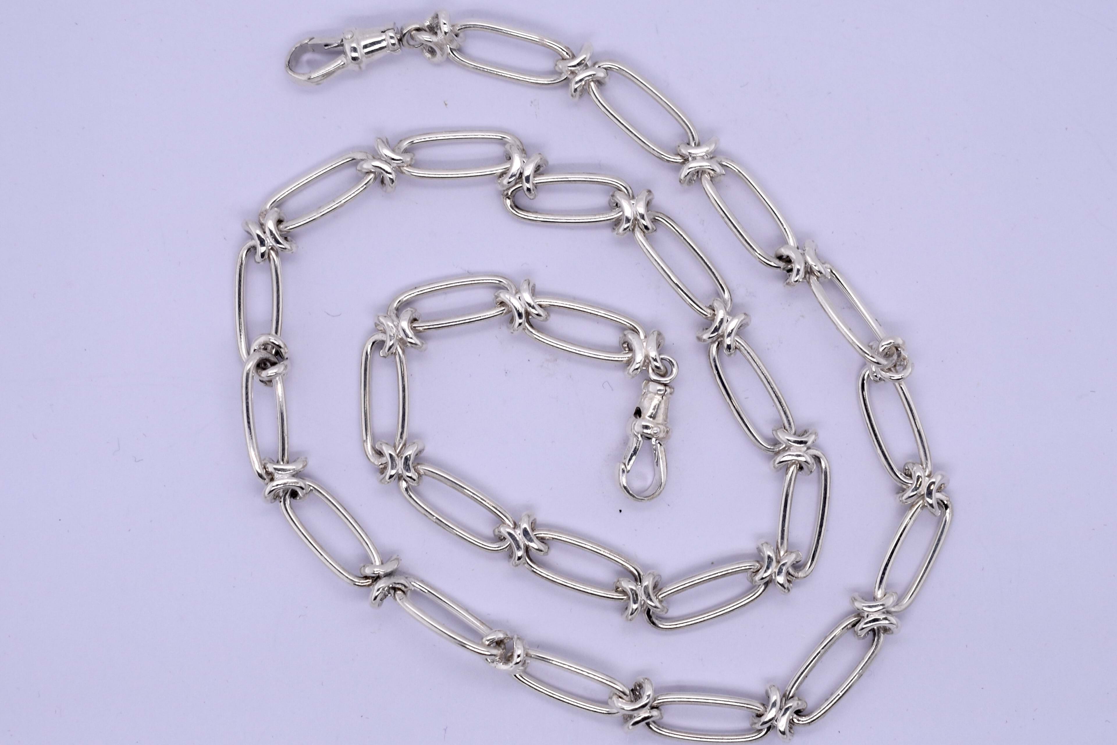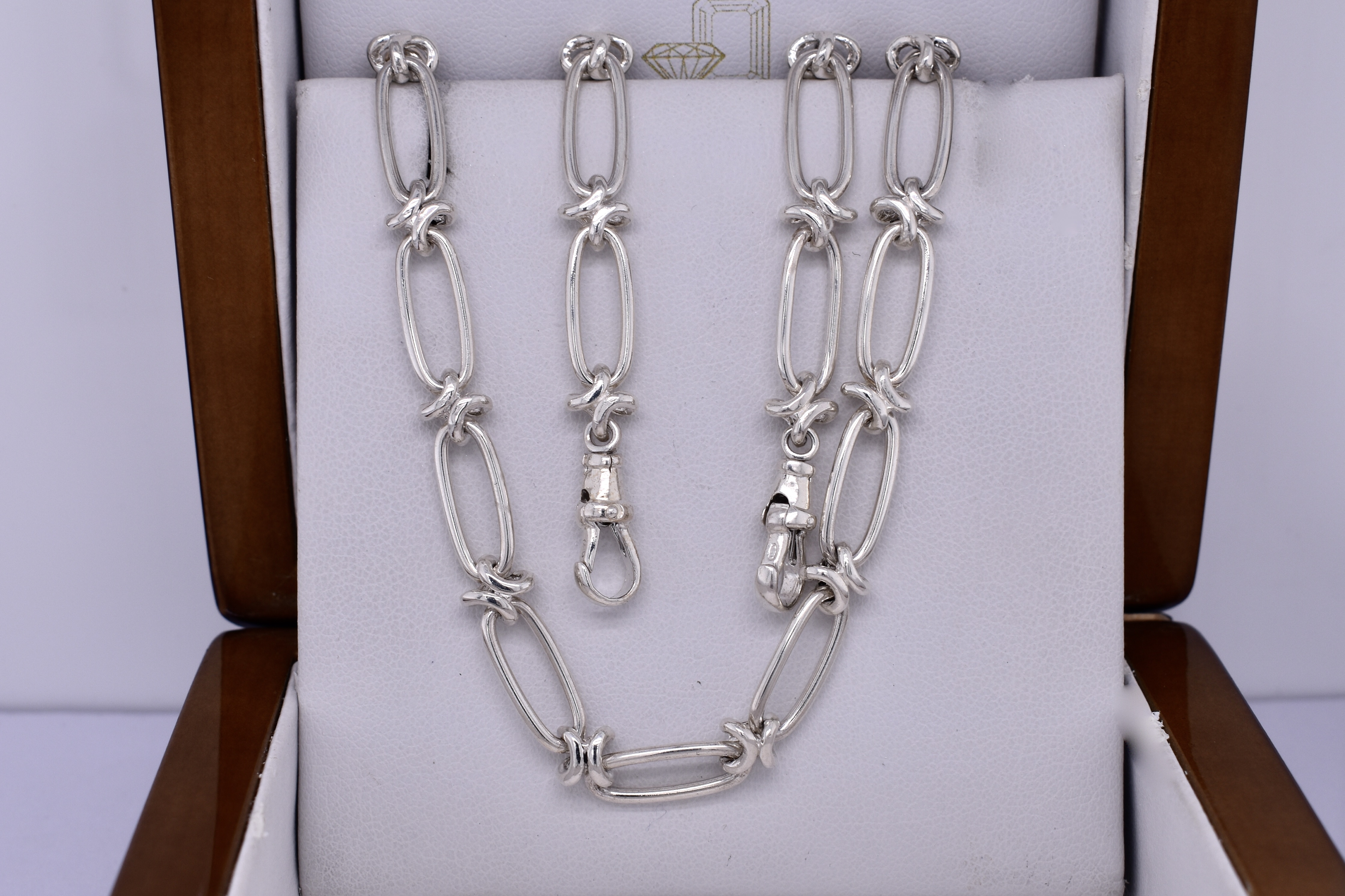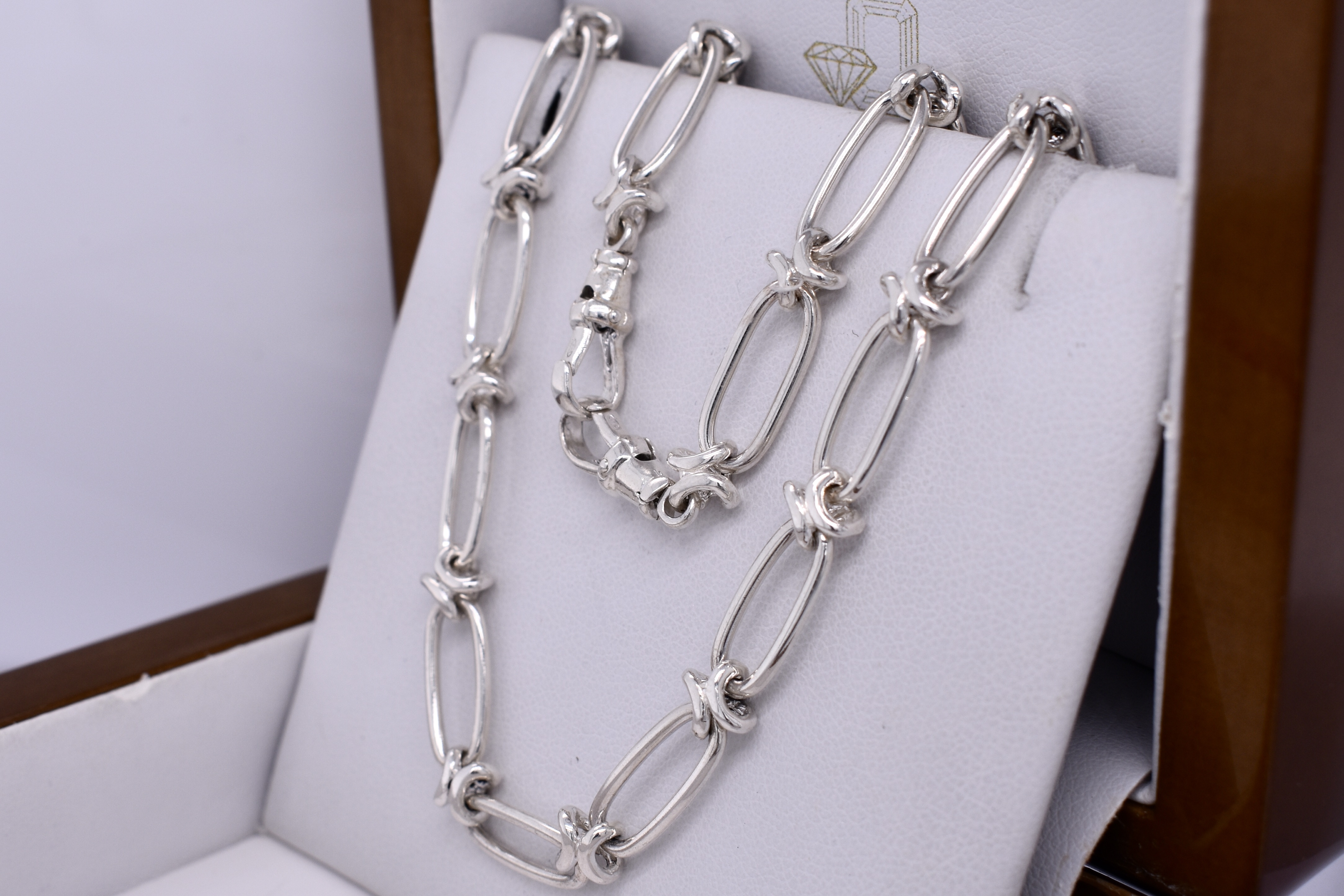 Our appealing Star of the Sea link, handcrafted by our goldsmith in sterling silver. Featuring elongated oval links paired with smaller twisted connectors, it creates a flow of texture and movement. Measuring 47cm and finished with two 17cmm swivels, the chain weighs 25.65g and is available to order in sterling silver or gold.