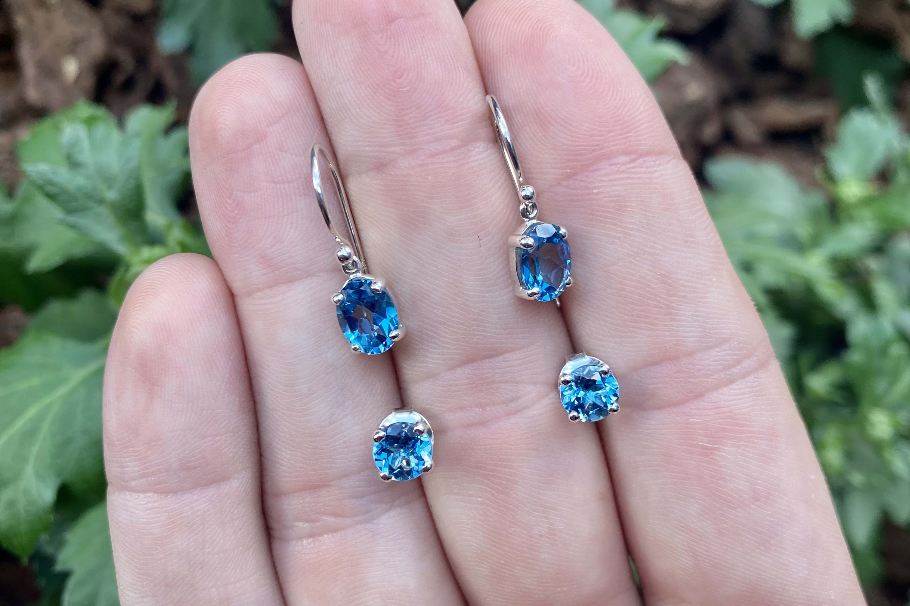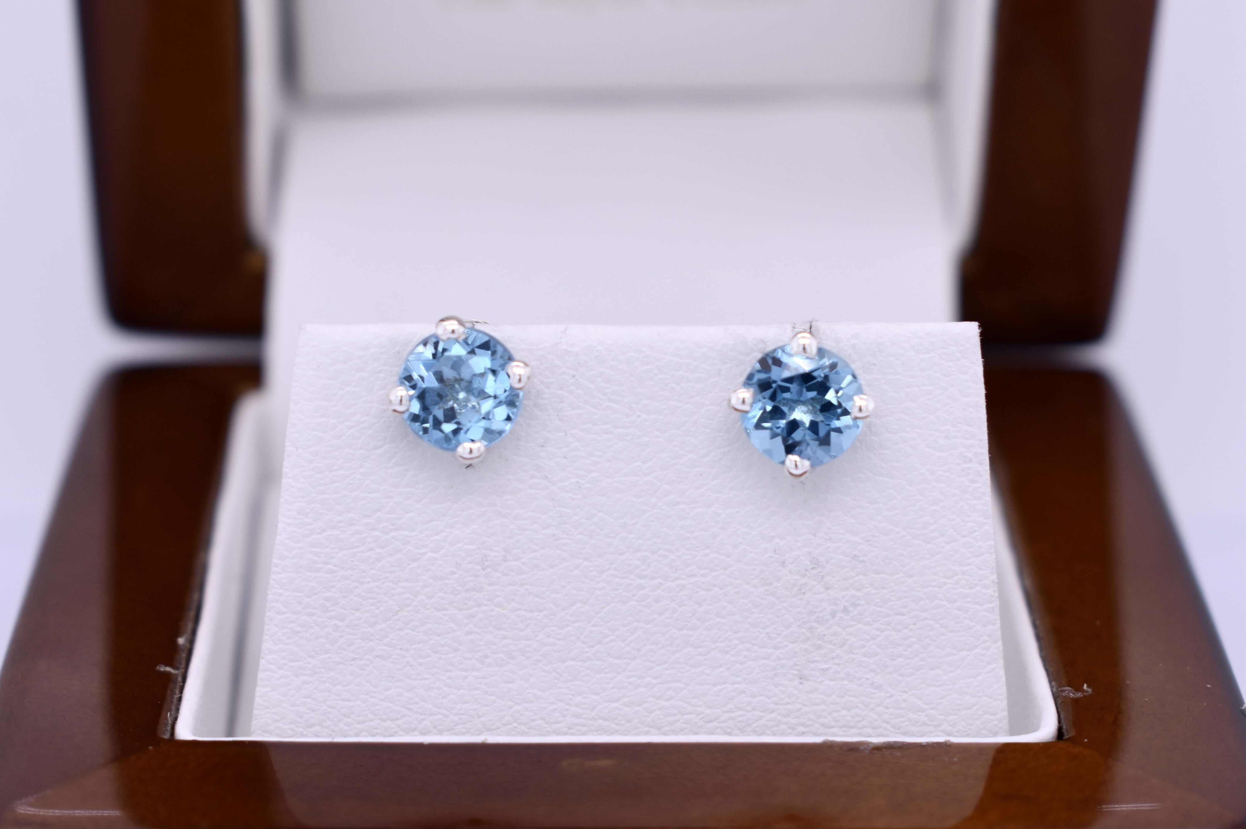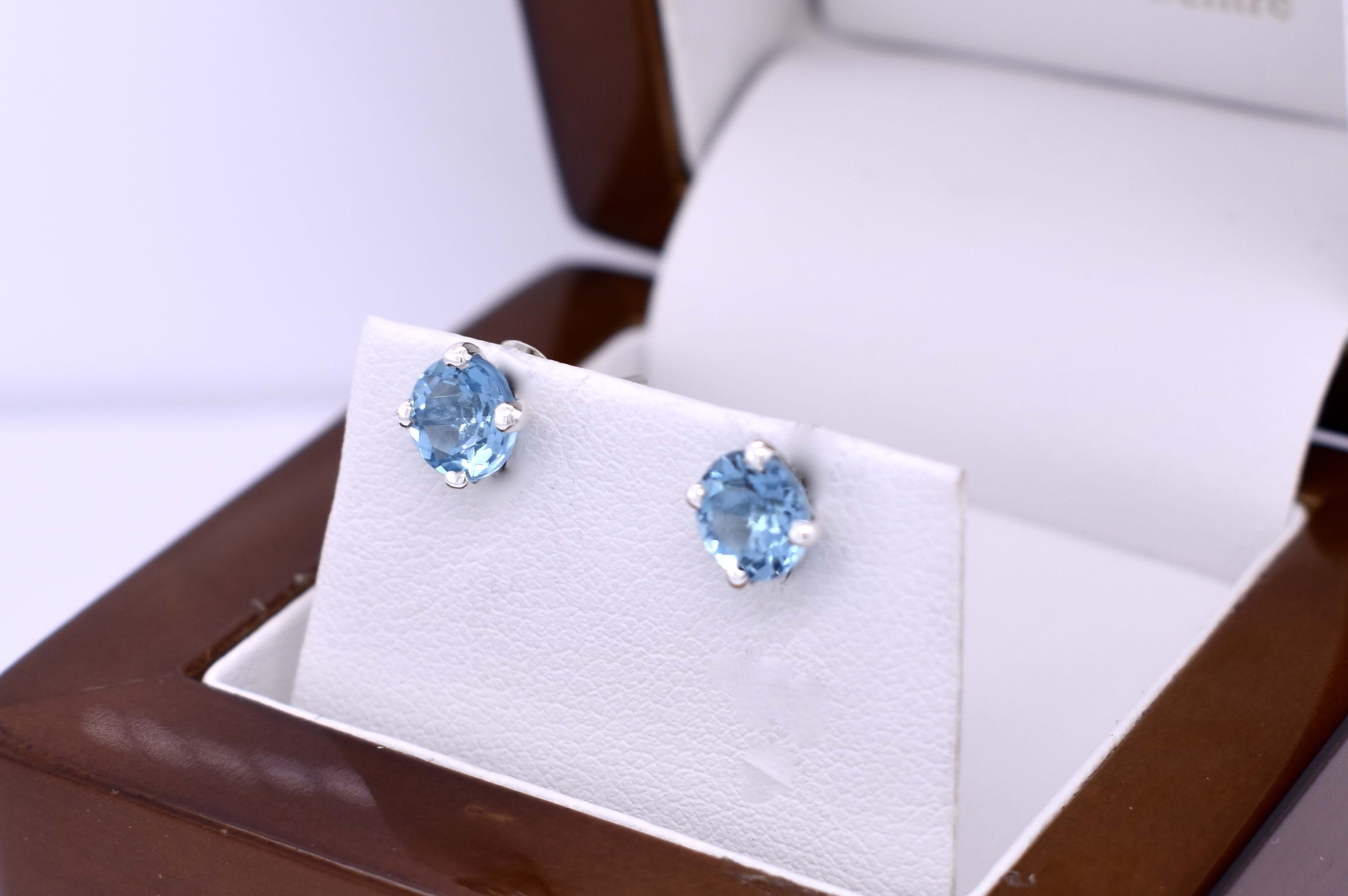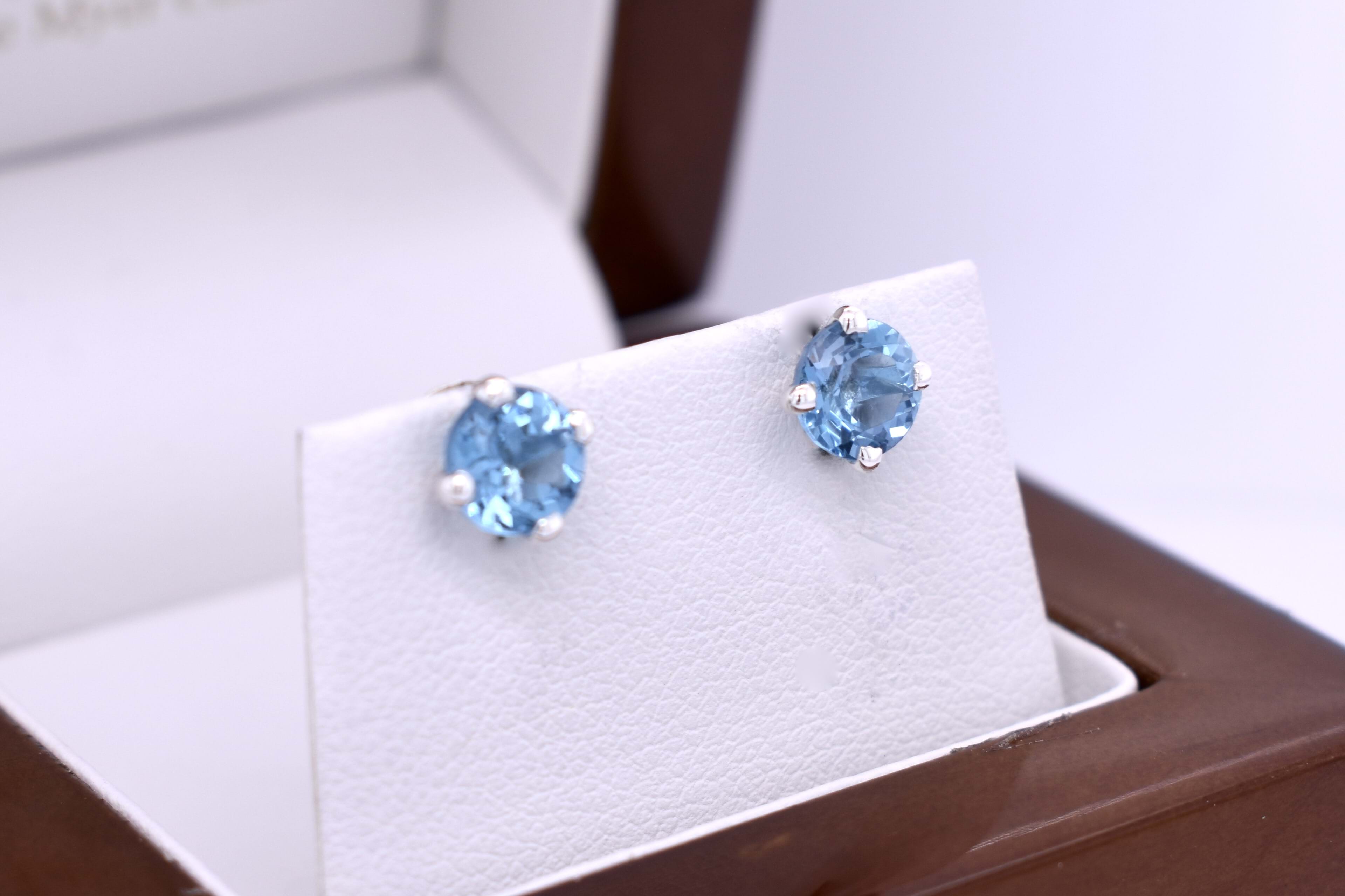 These pretty Swiss blue topaz studs, measure 6mm round and are four claw set in handmade sterling silver settings. Finished with post and butterfly fittings.