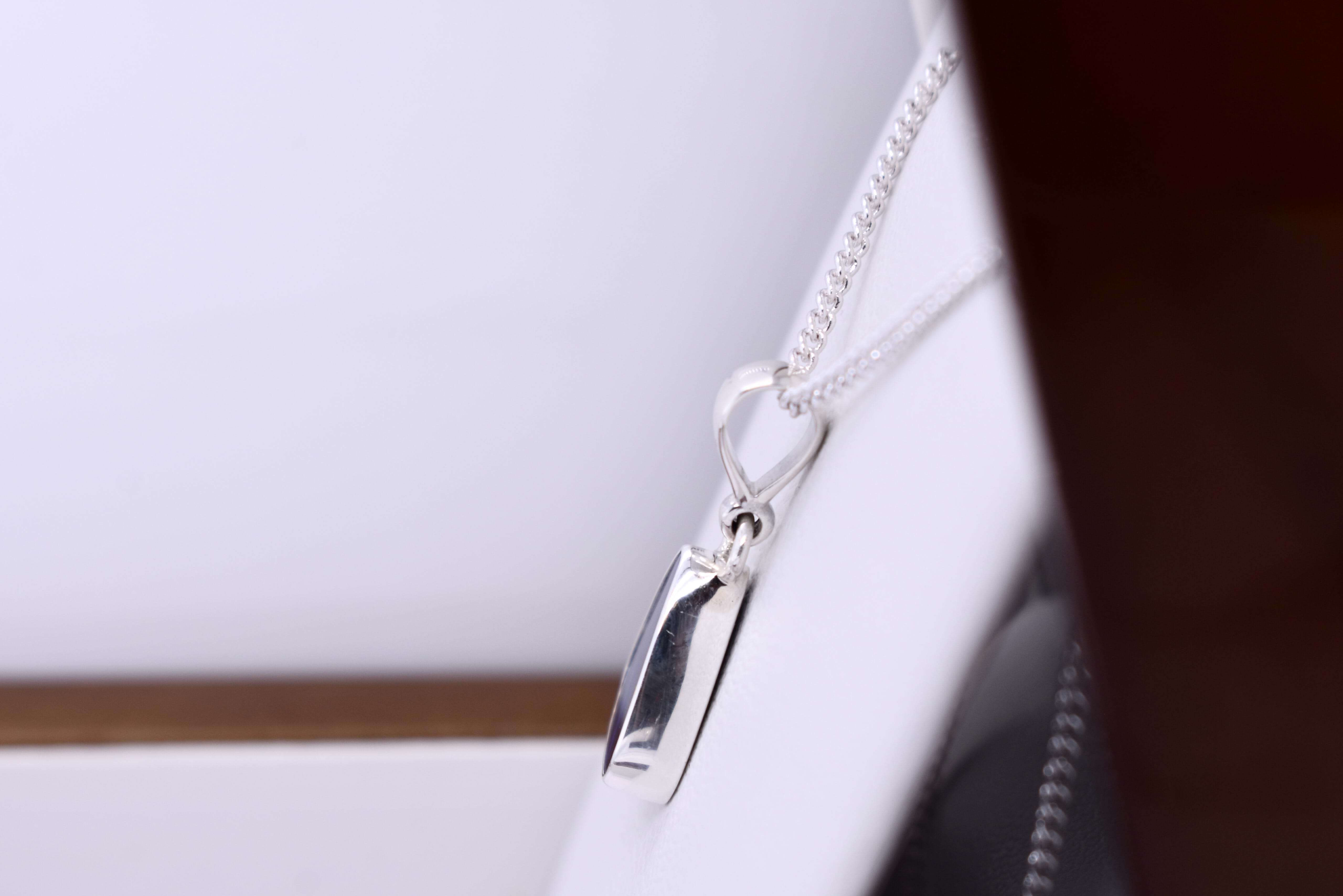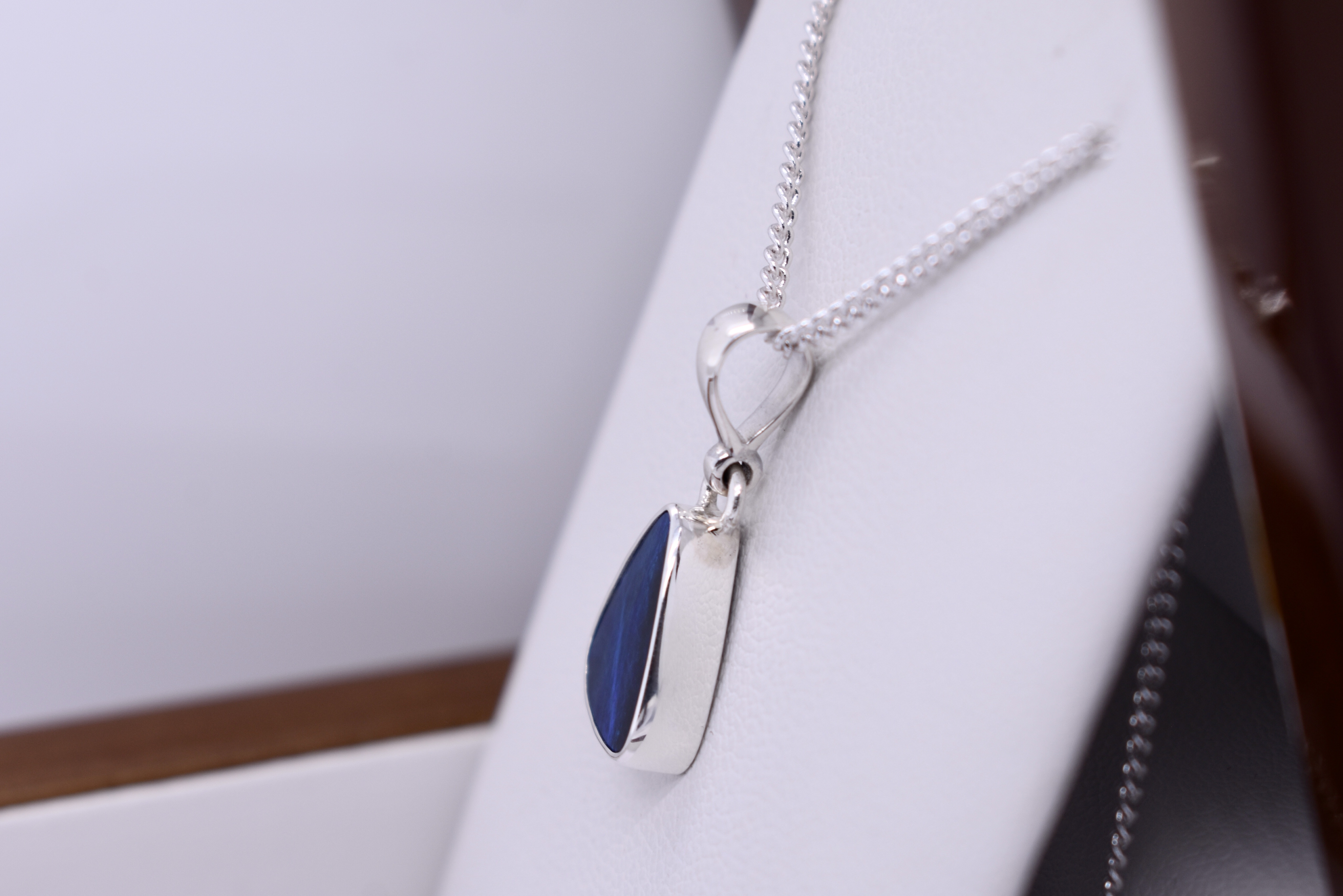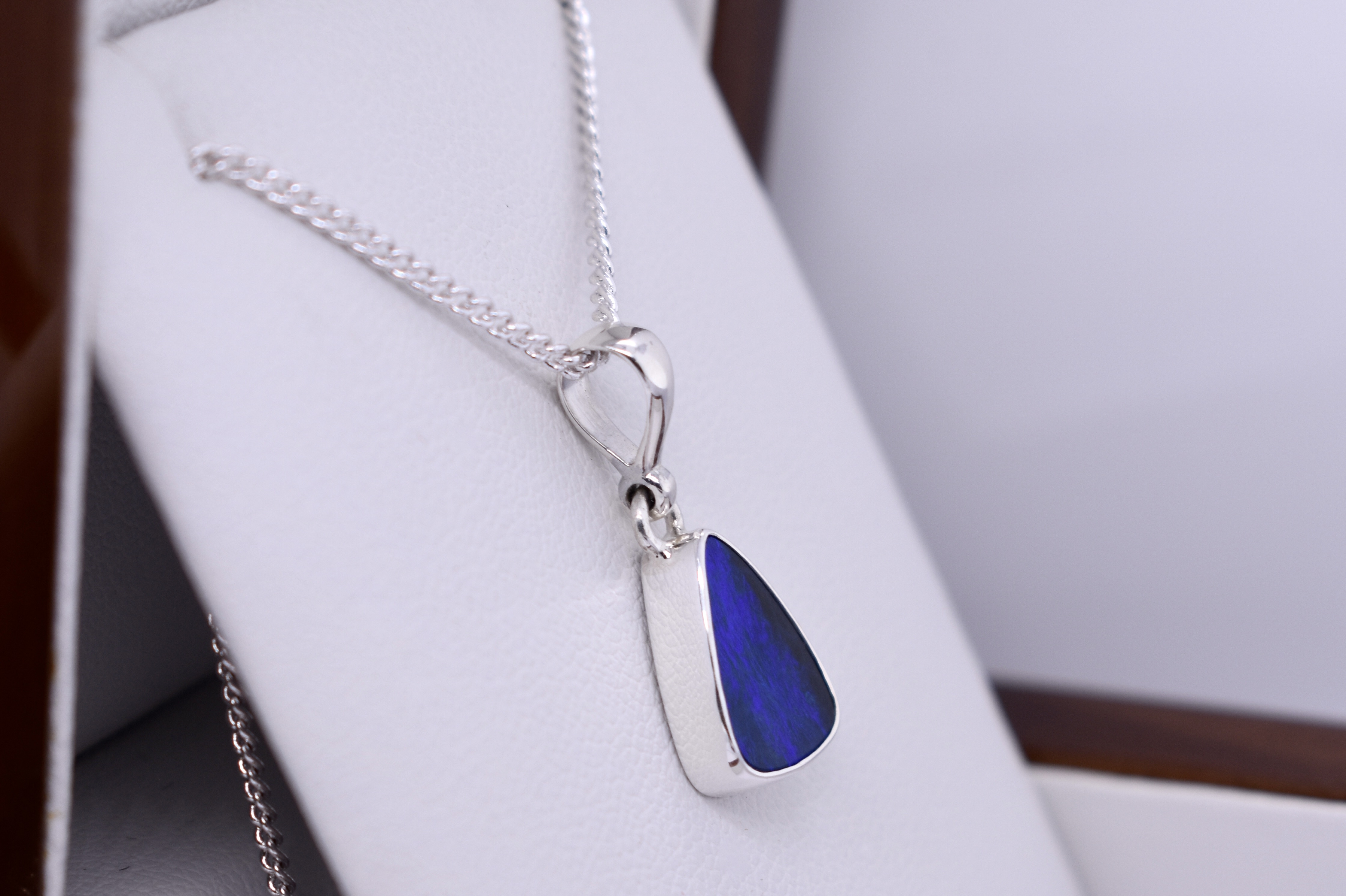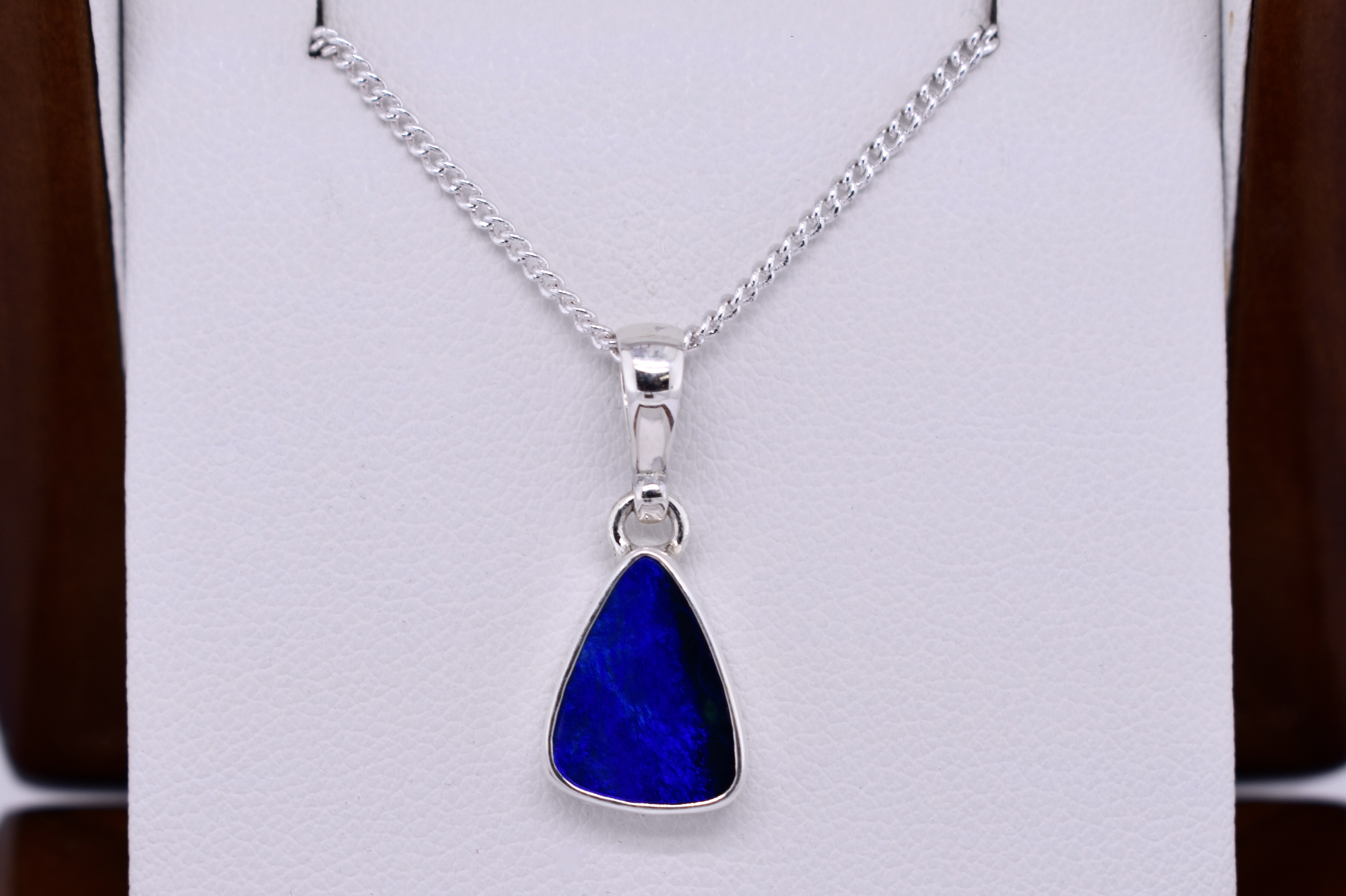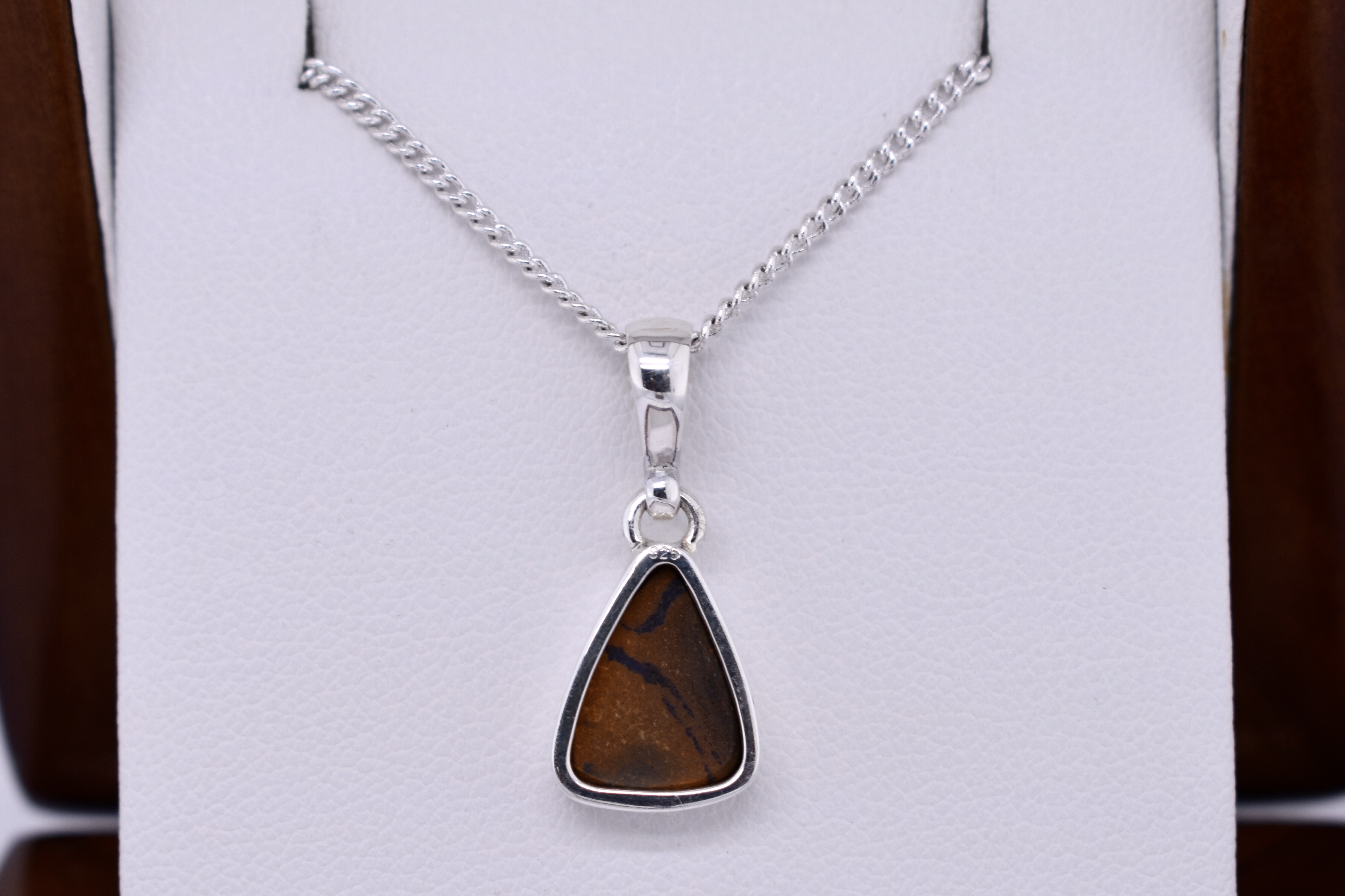 A pretty handmade trilliant shaped pendant featuring a 12.3x9.8mm Coober Pedy opal doublet. The doublet consisting of Coober Pedy opal (on top) with a boulder opal backing, is bezel set in sterling silver. Completed with a plain bale. Chains are available for separate purchase.
