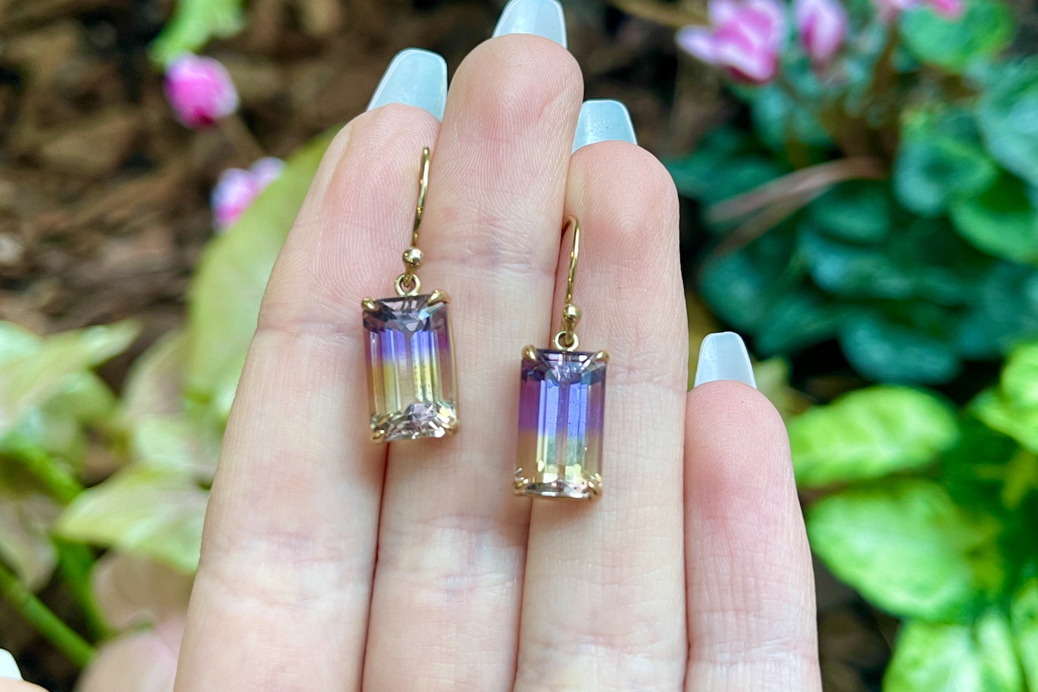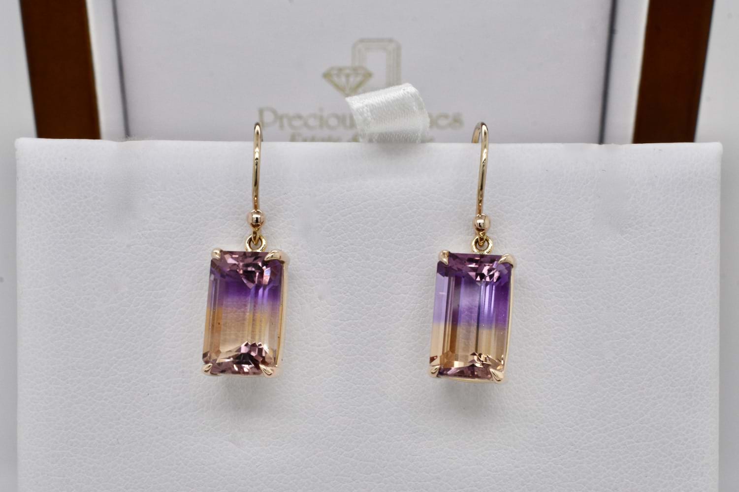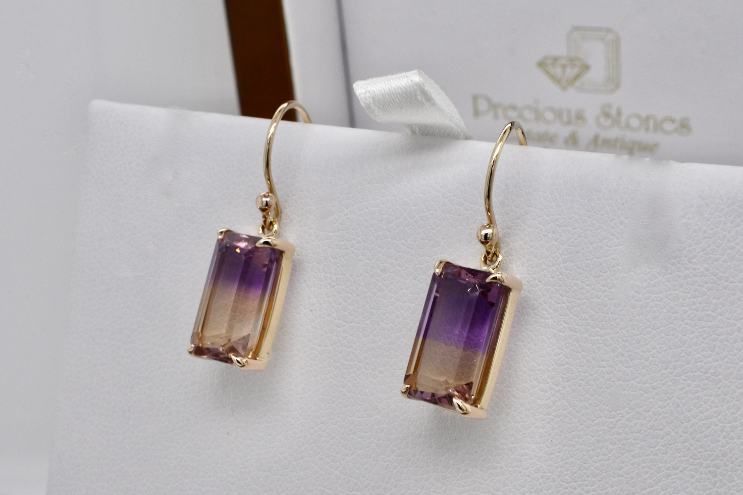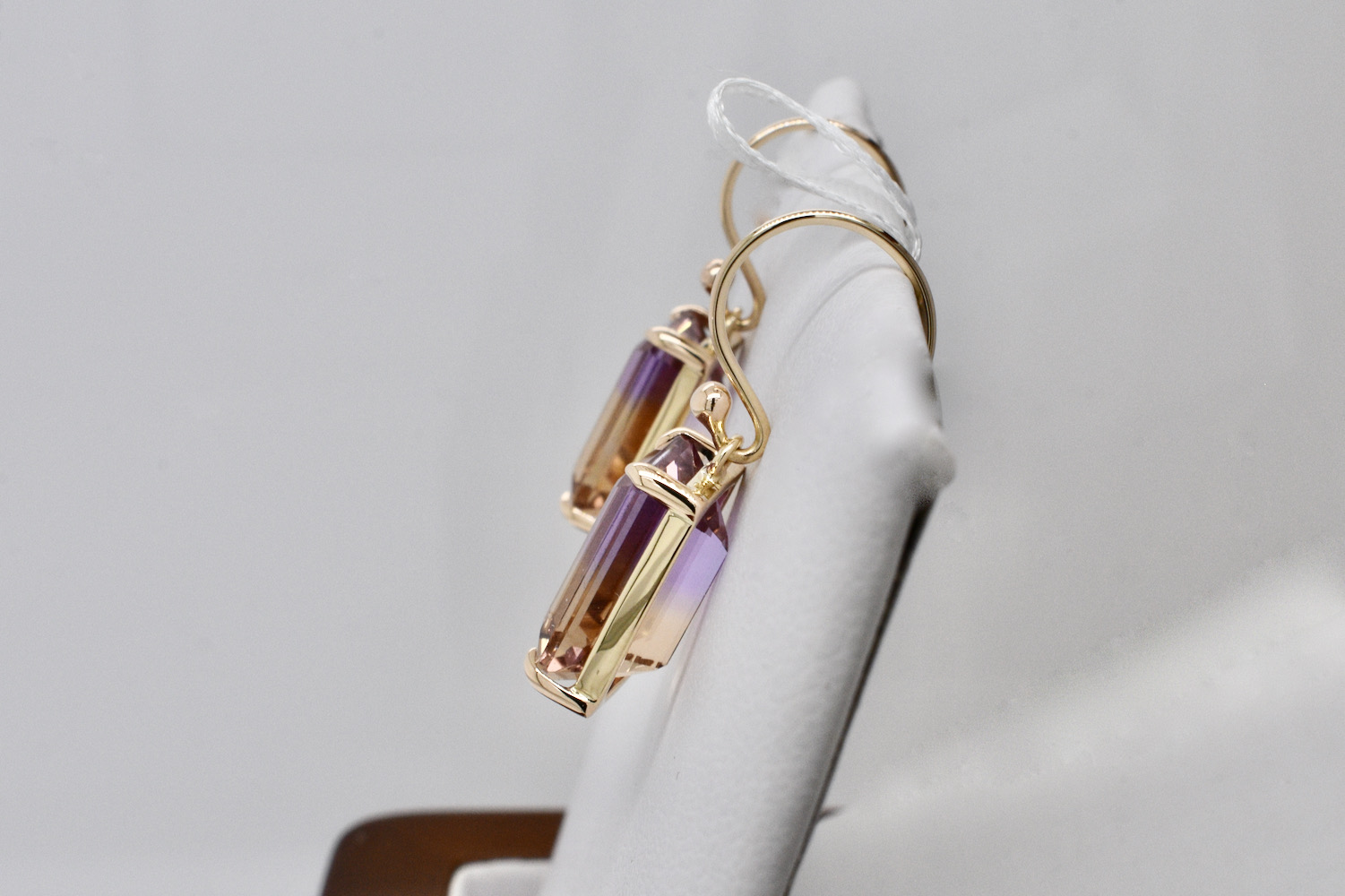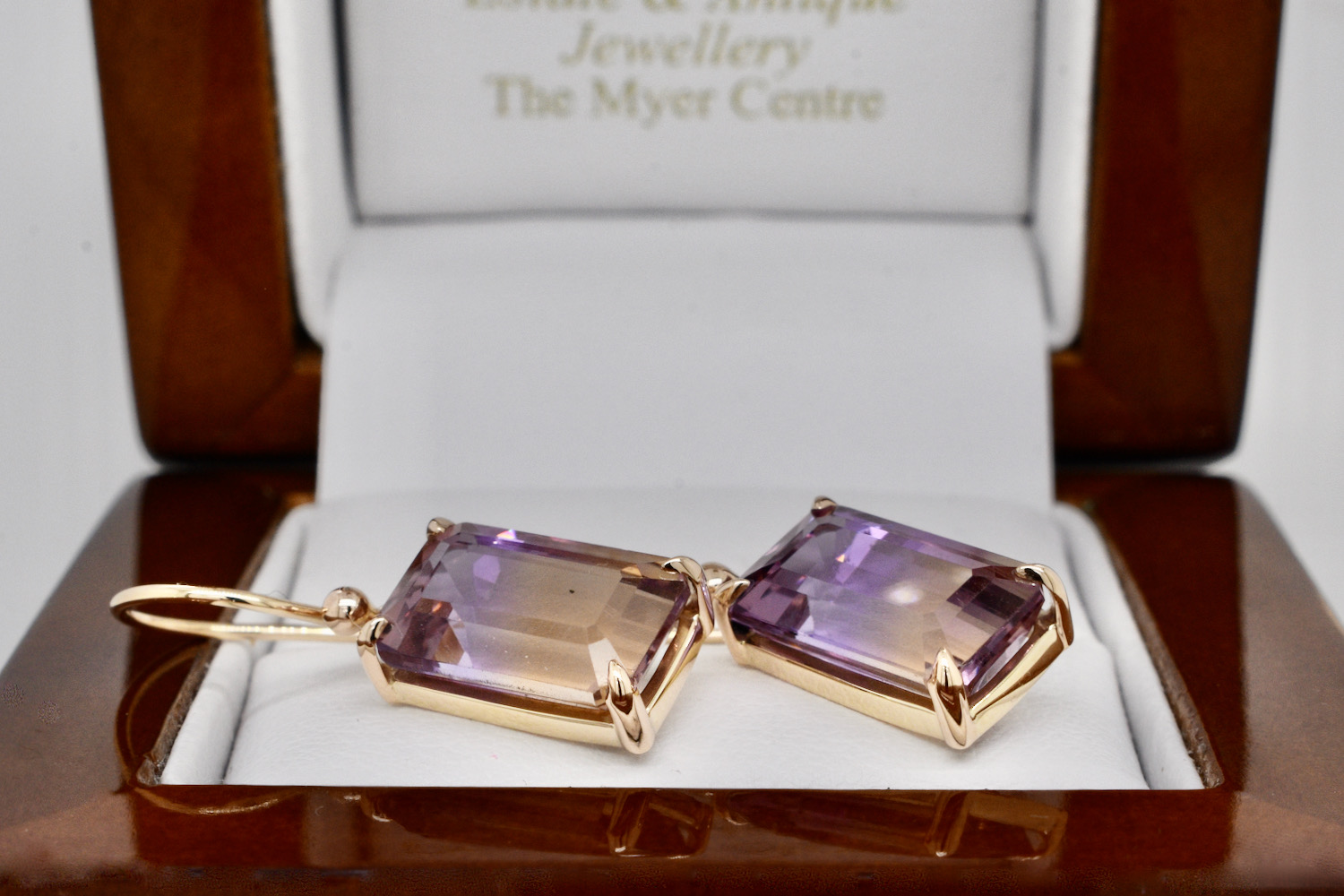 Striking pair of emerald cut ametrines measuring approx 13x8mm set into handmade 9ct yellow gold four claw settings and suspended from shepherd hook fittings