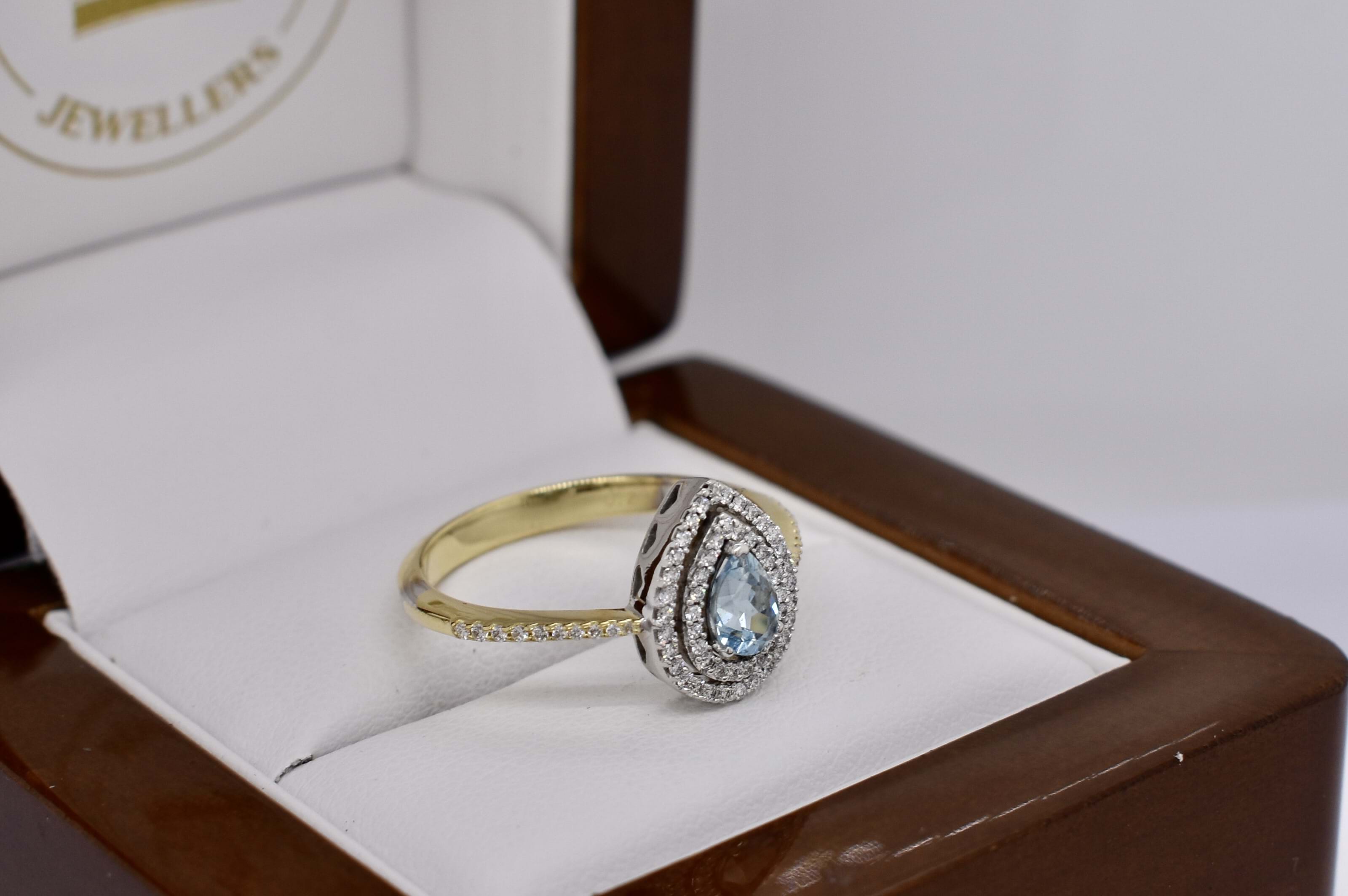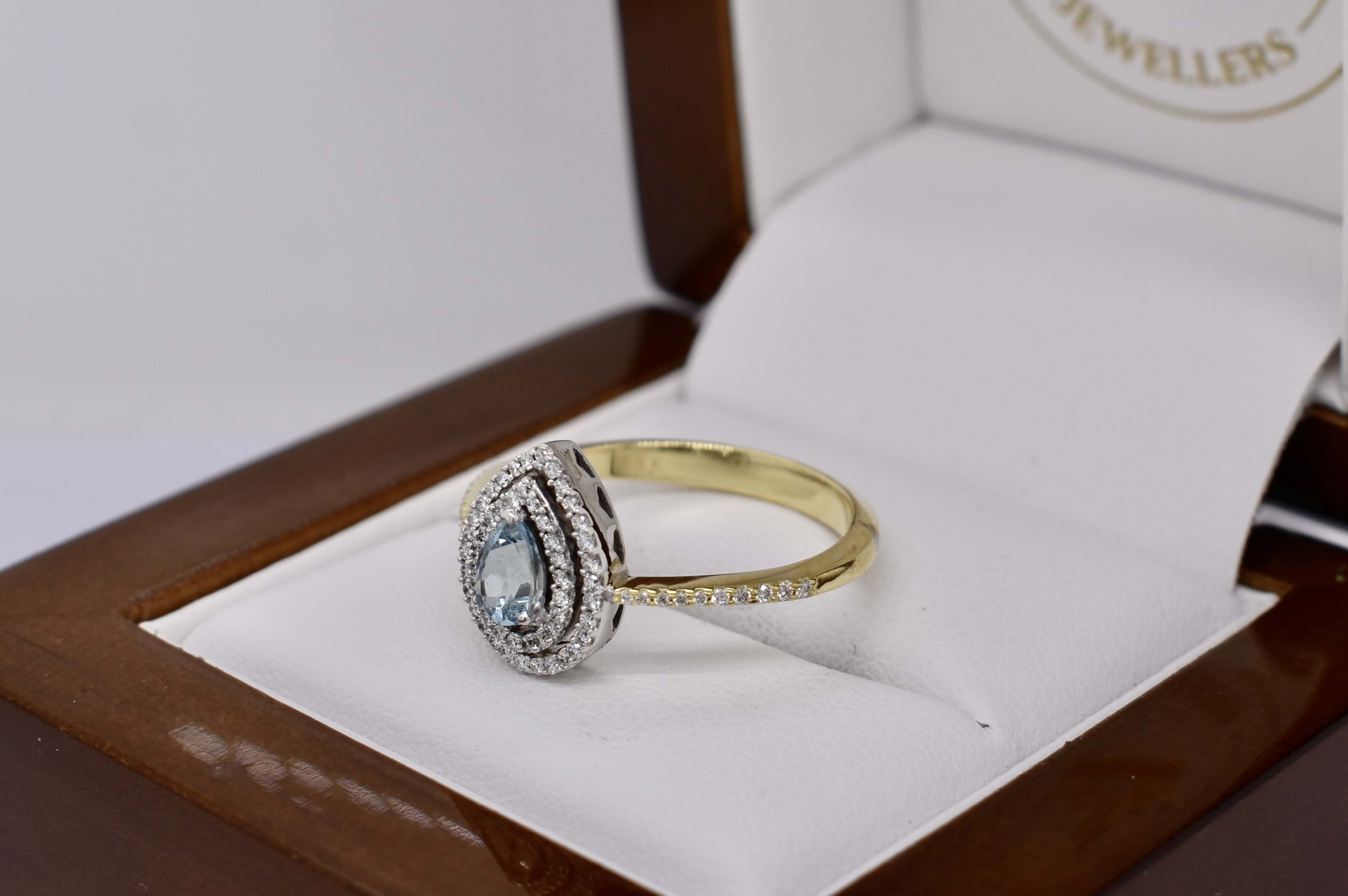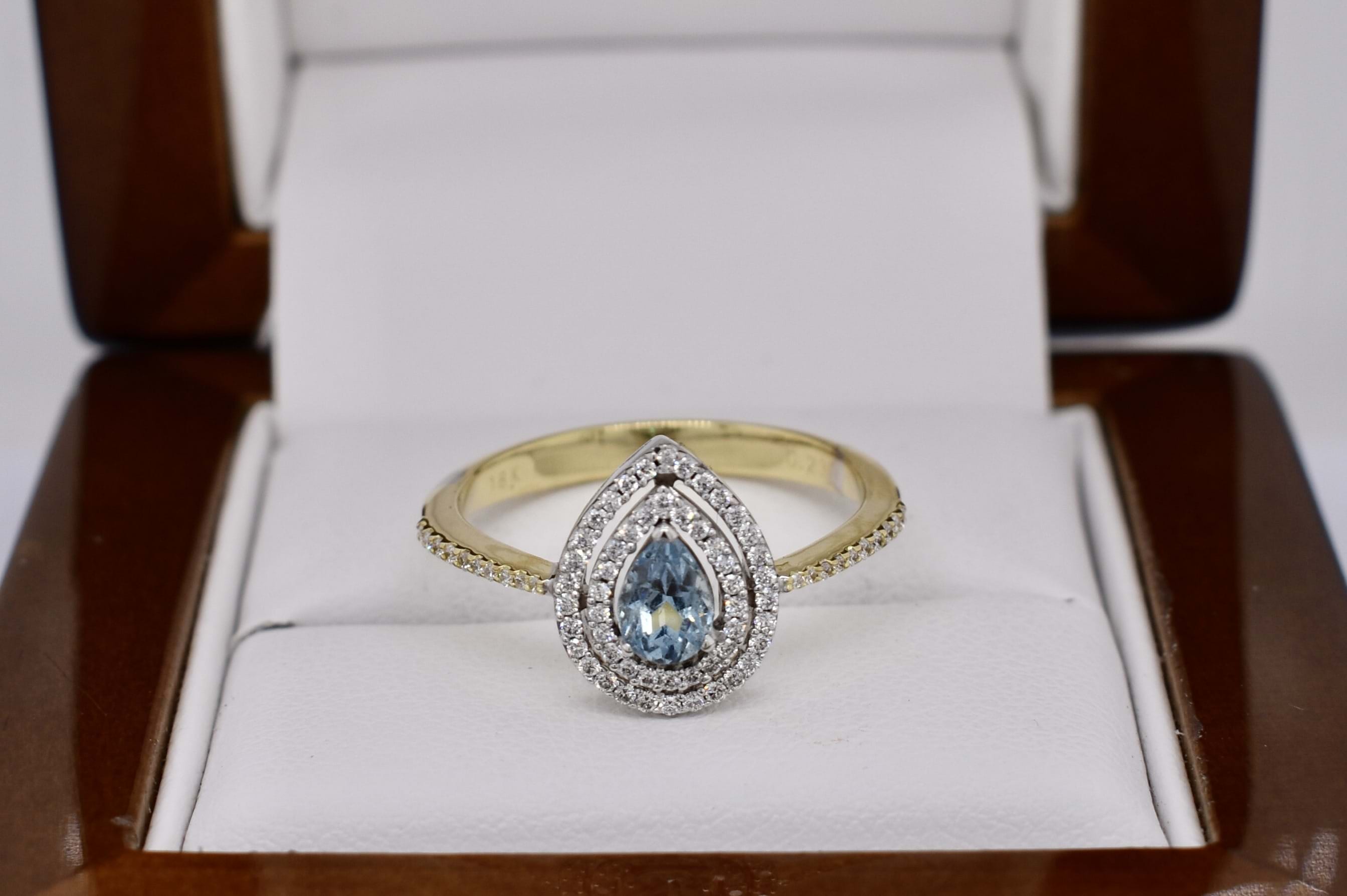A secondhand steal! This beautiful pear shaped aquamarine, measuring 5.5x3.9x3.3mm, is three claw set and surrounded with a double halo of 0.8mm round brilliant cut diamonds, micro pave set, with a further 20 round 0.8-1.0mm diamonds set on the shoulders. Total of 72 diamonds with a weight of 0.23ct FG SI. Finished on a yellow gold high domed 1.1-2.6mm wide band with tapering shoulders. Finger size N. Independent Valuation Supplied.
