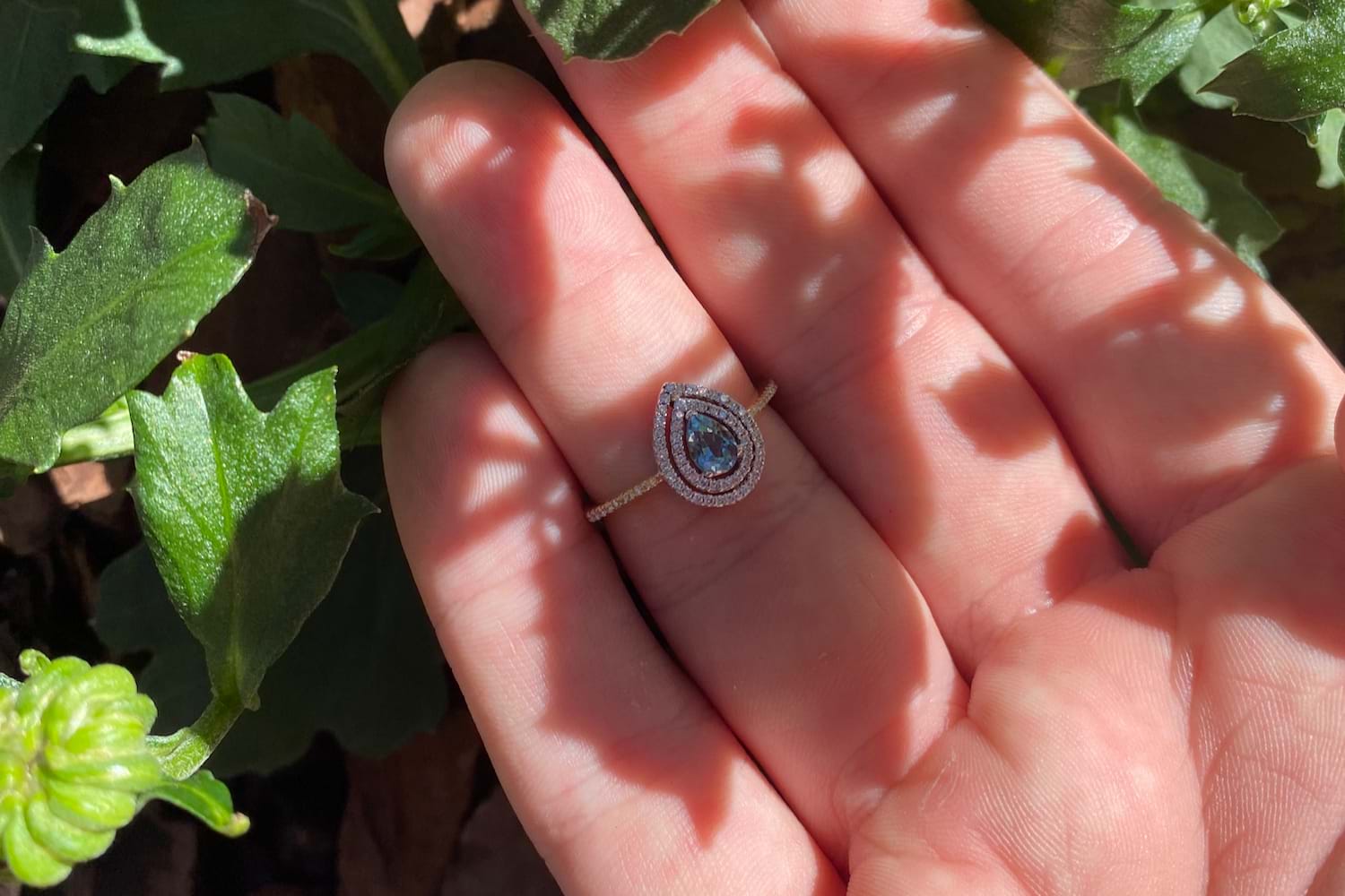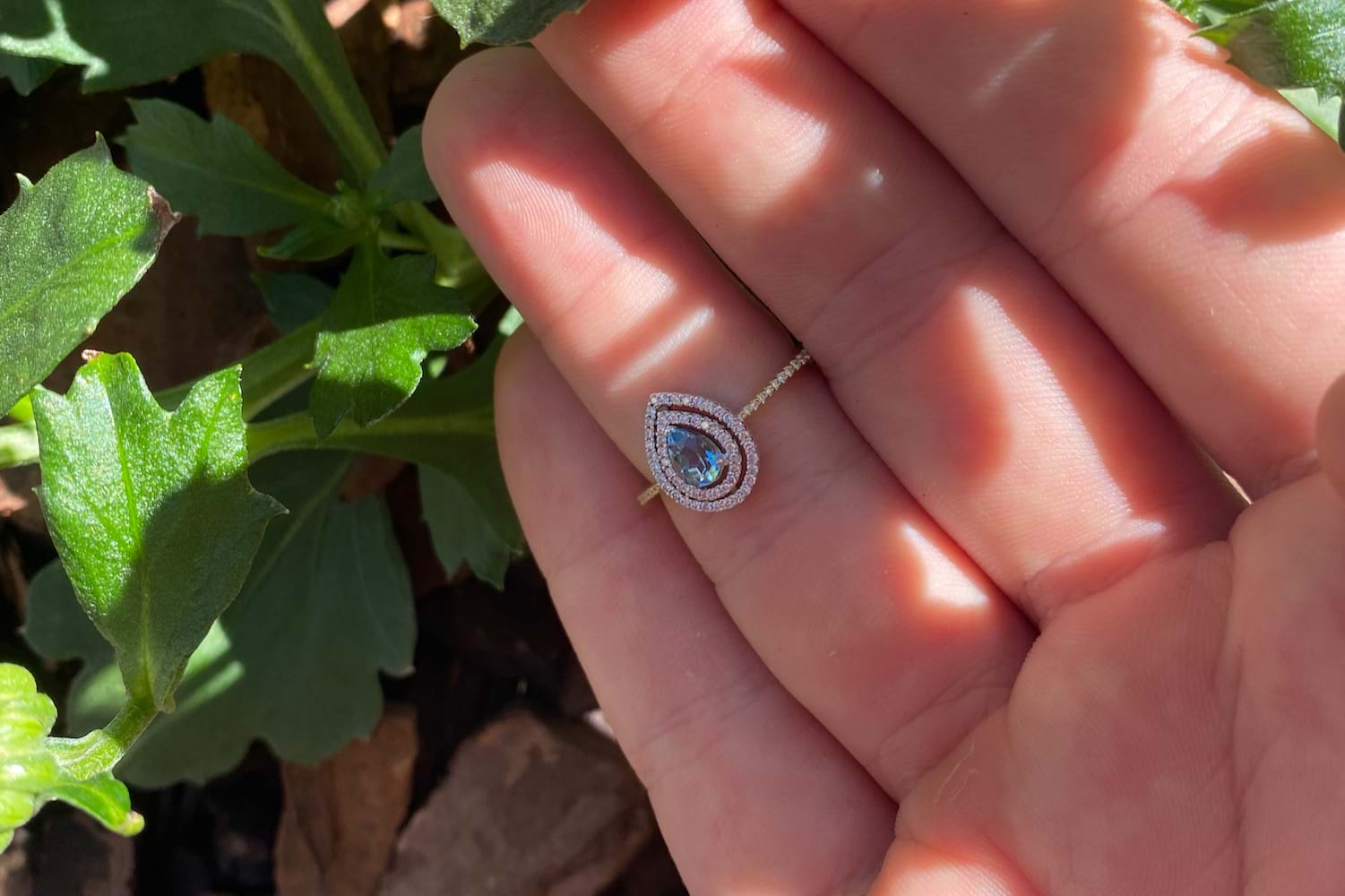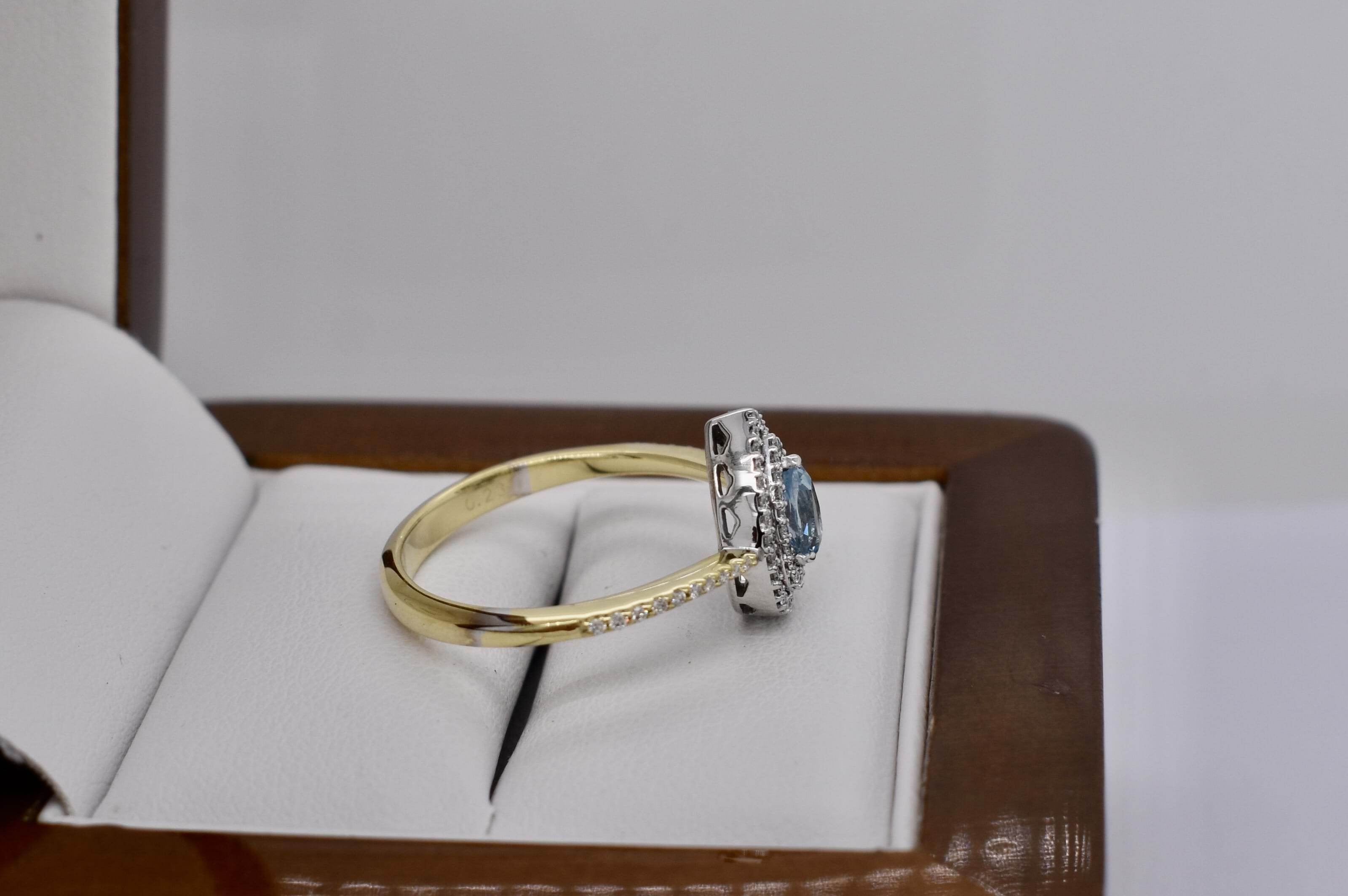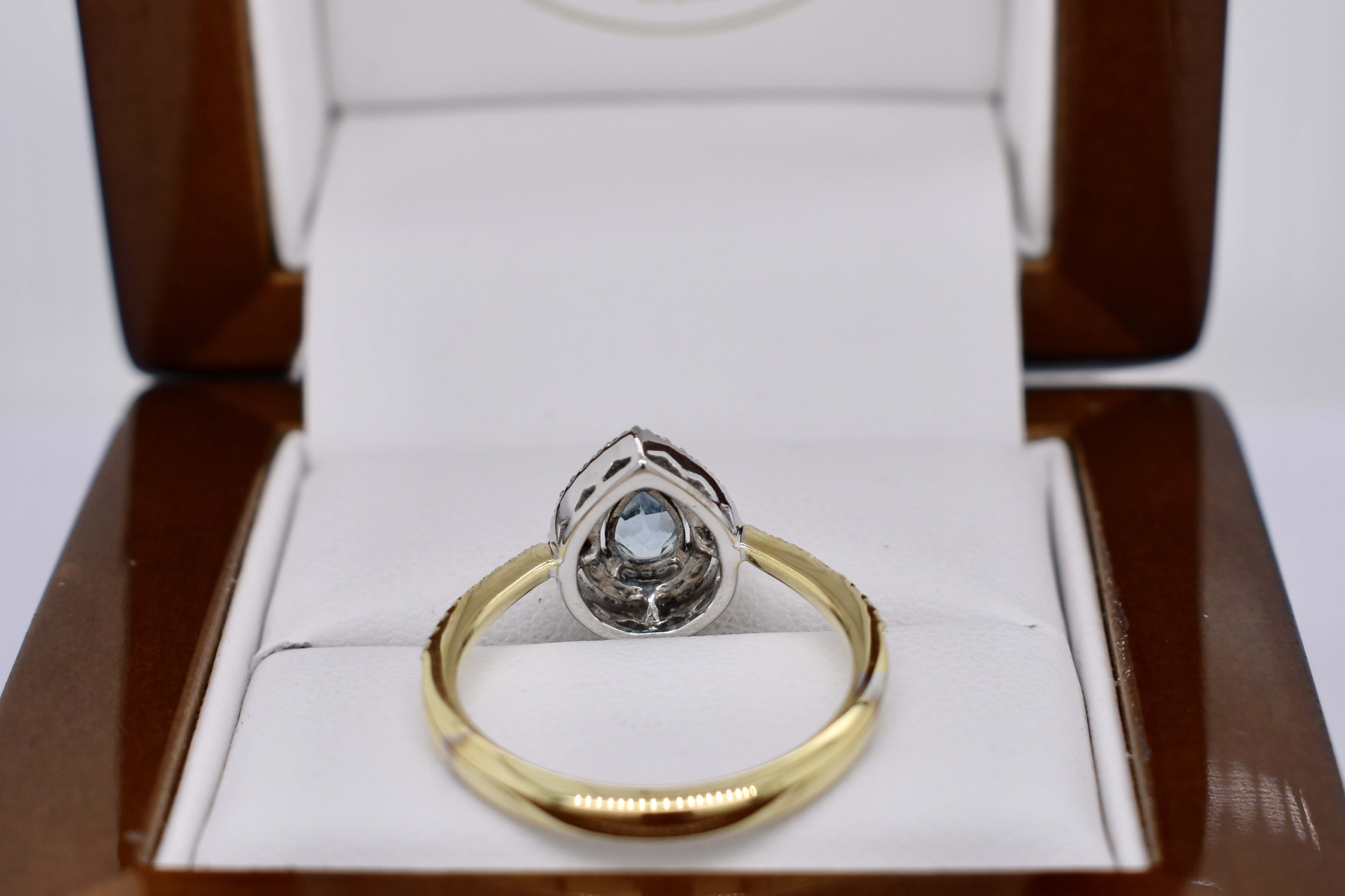 A secondhand steal! This beautiful pear shaped aquamarine, measuring 5.5x3.9x3.3mm, is three claw set and surrounded with a double halo of 0.8mm round brilliant cut diamonds, micro pave set, with a further 20 round 0.8-1.0mm diamonds set on the shoulders. Total of 72 diamonds with a weight of 0.23ct FG SI. Finished on a yellow gold high domed 1.1-2.6mm wide band with tapering shoulders. Finger size N. Independent Valuation Supplied.
