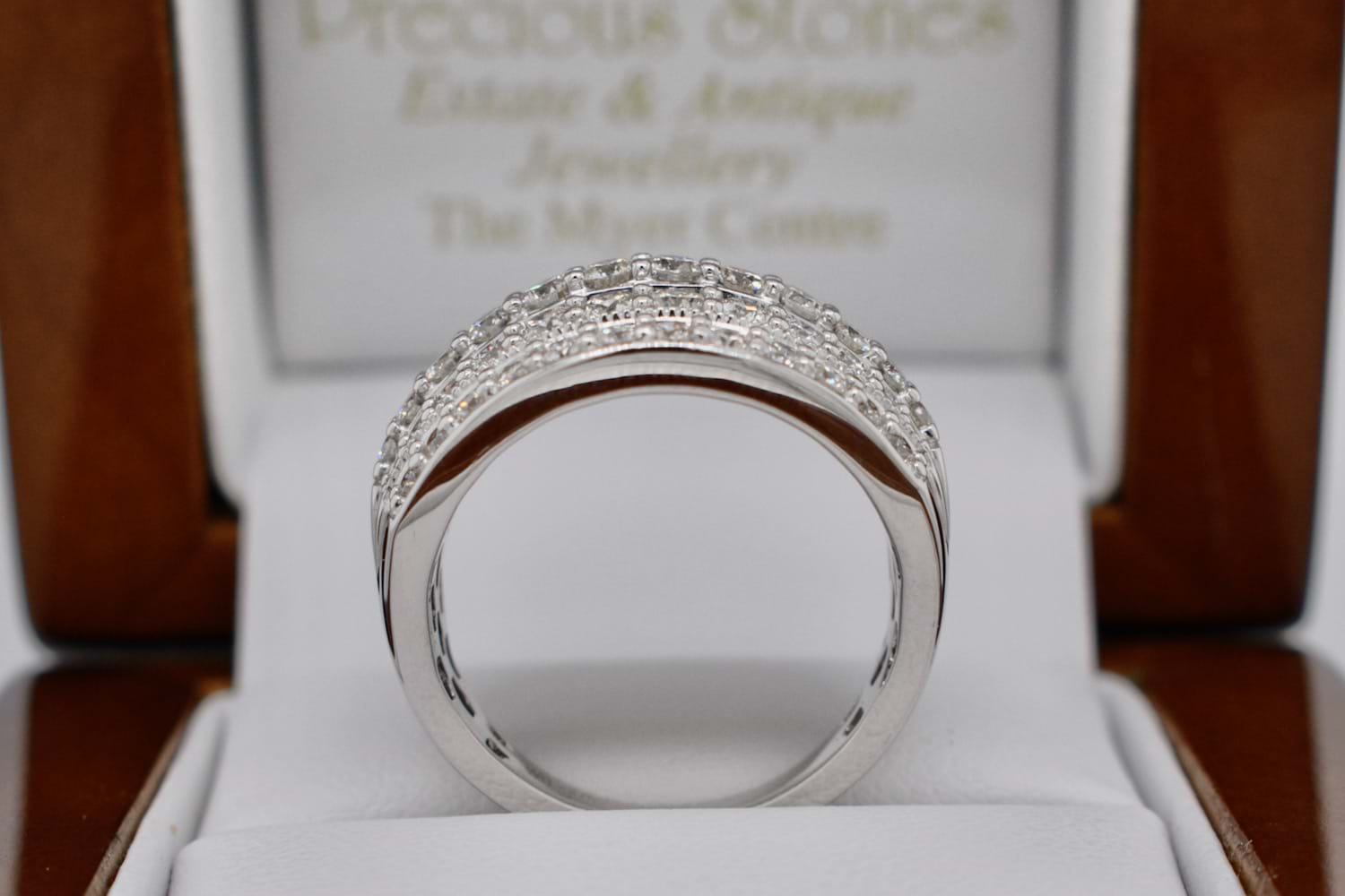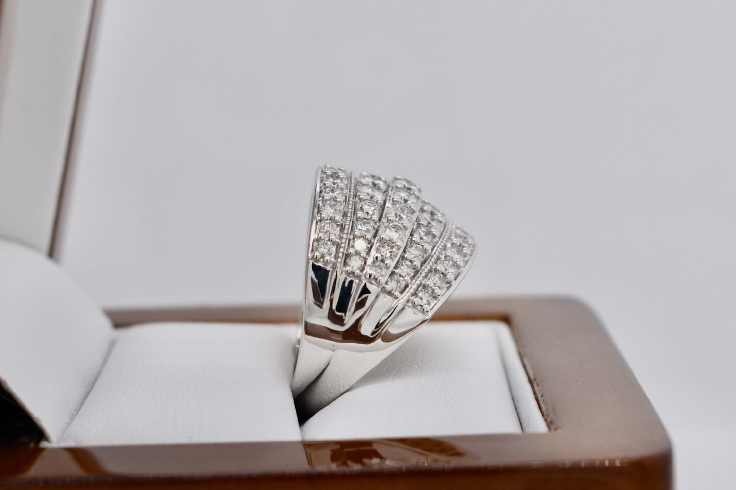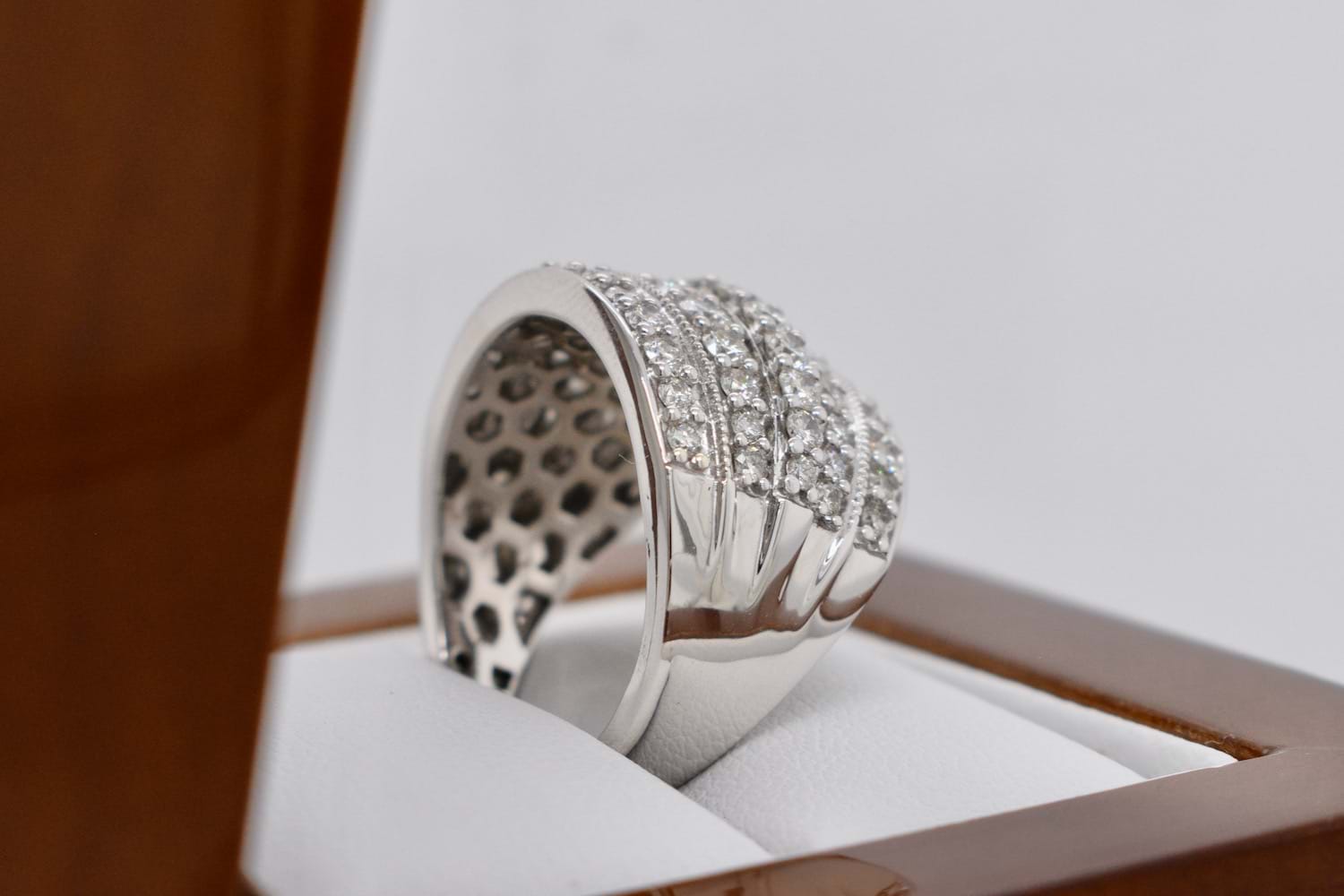 This sparkling and fabulous wide 9ct white gold 16.5mm wide dome ring is encrusted with five rows of scintillating round brilliant cut diamonds and is a fantastic Secondhand bargain buy!! Containing a total of 60 diamonds equalling an impressive 2.00cts (HI/P1-2), it makes the perfect, impressive, dress ring. Finger size P+