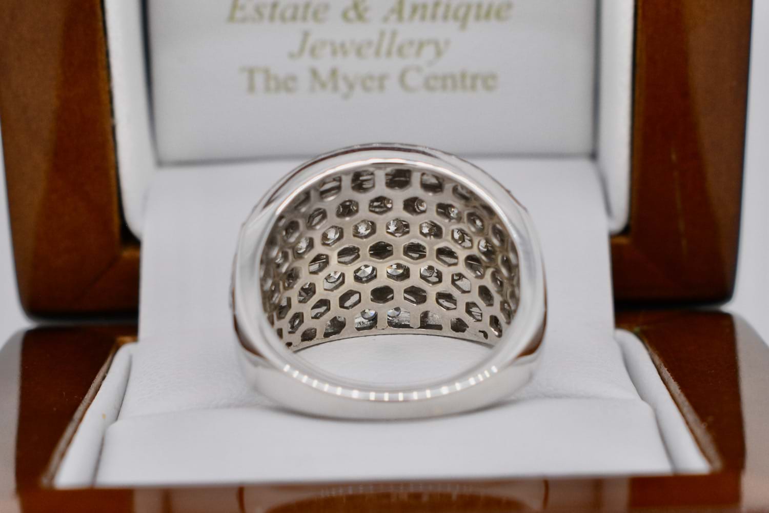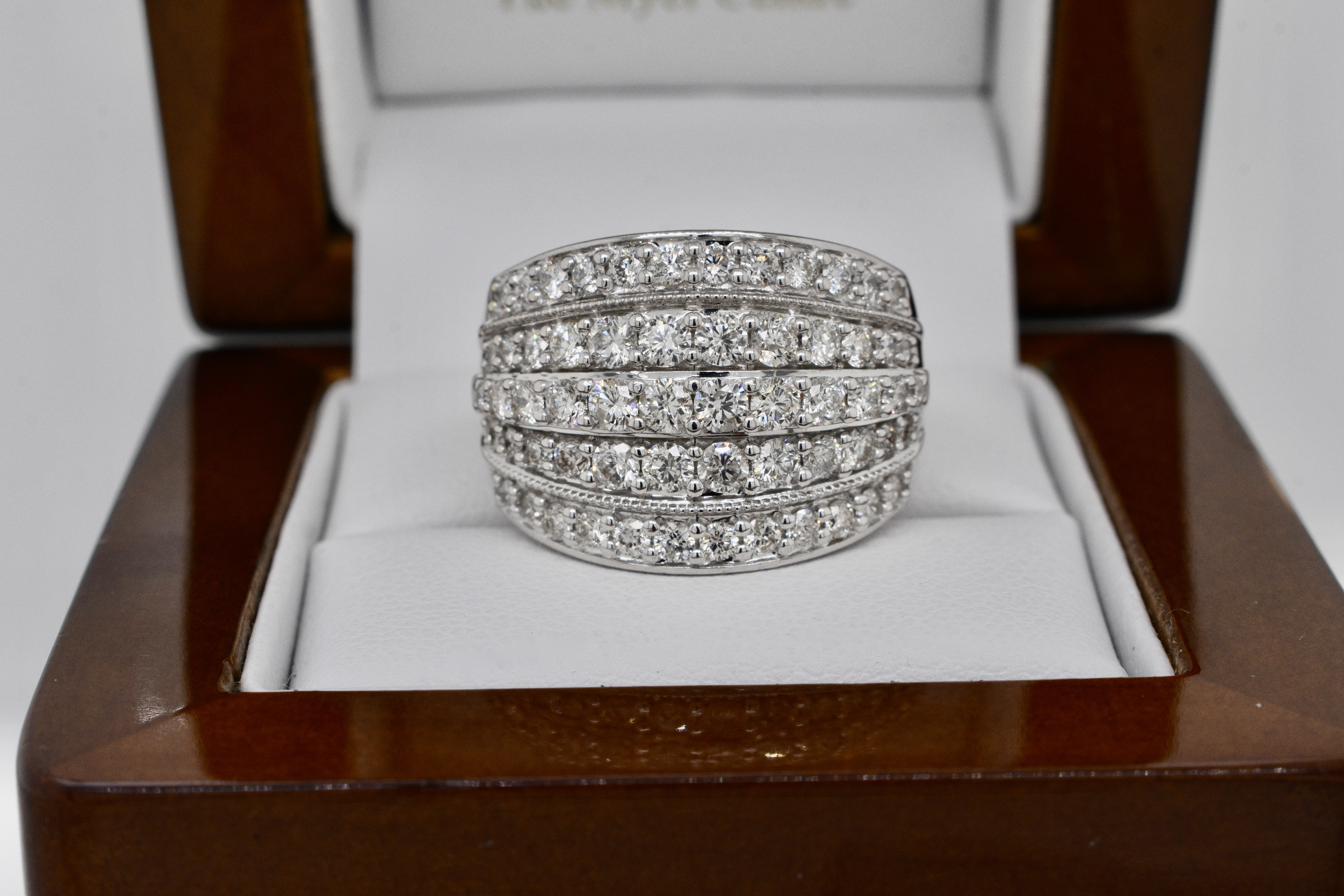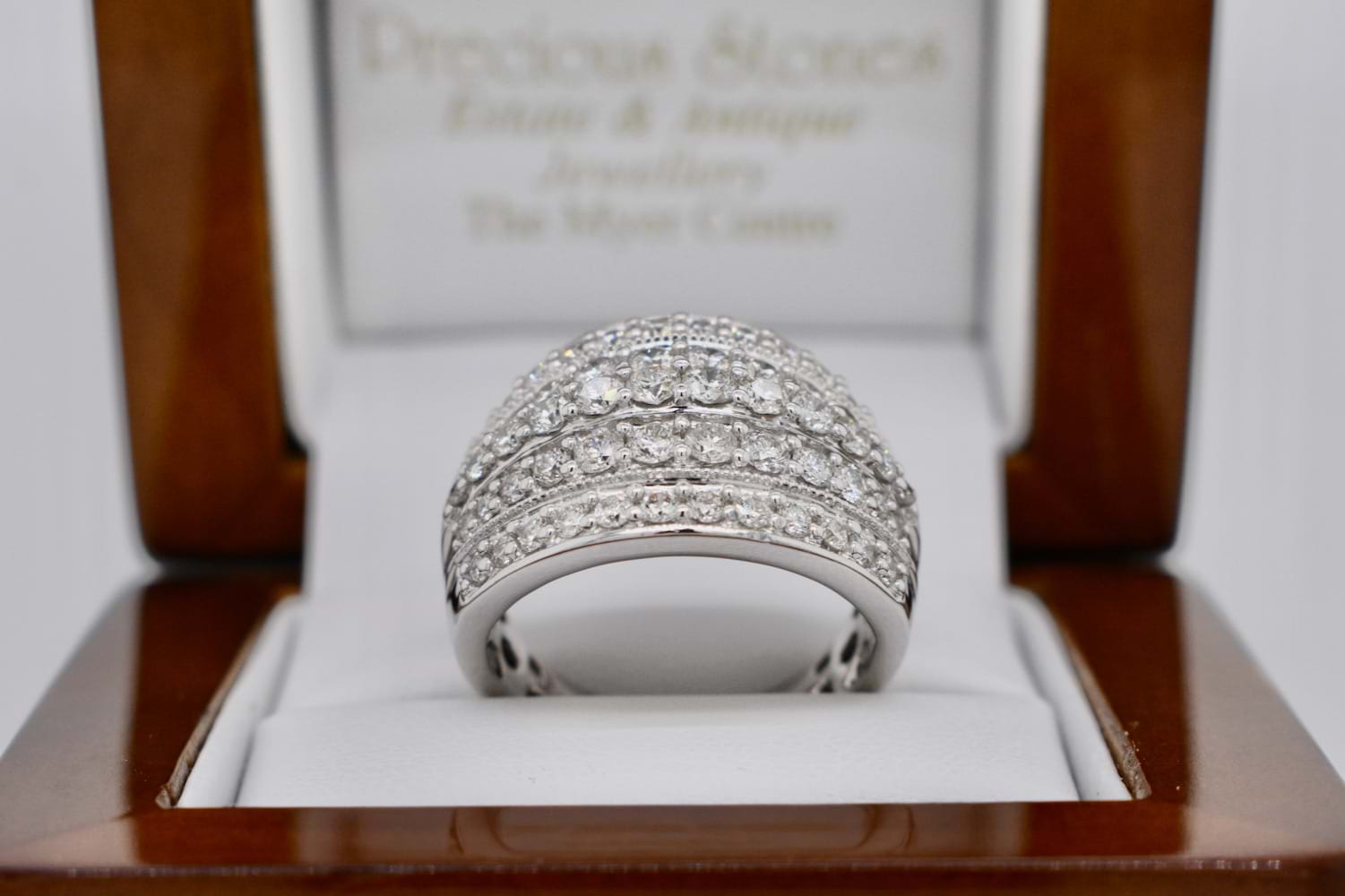 This sparkling and fabulous wide 9ct white gold 16.5mm wide dome ring is encrusted with five rows of scintillating round brilliant cut diamonds and is a fantastic Secondhand bargain buy!! Containing a total of 60 diamonds equalling an impressive 2.00cts (HI/P1-2), it makes the perfect, impressive, dress ring. Finger size P+