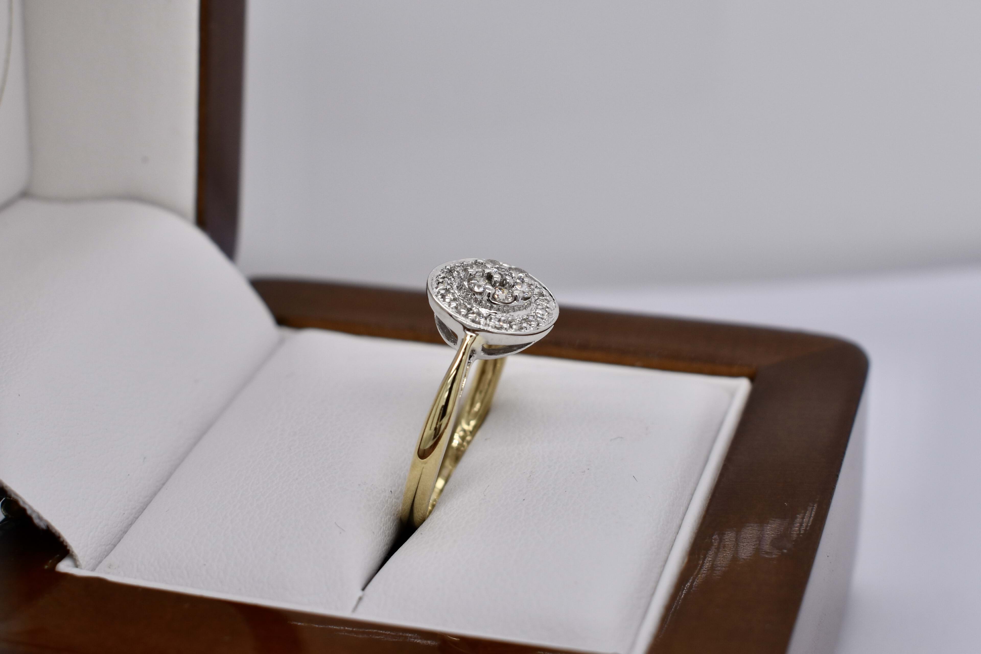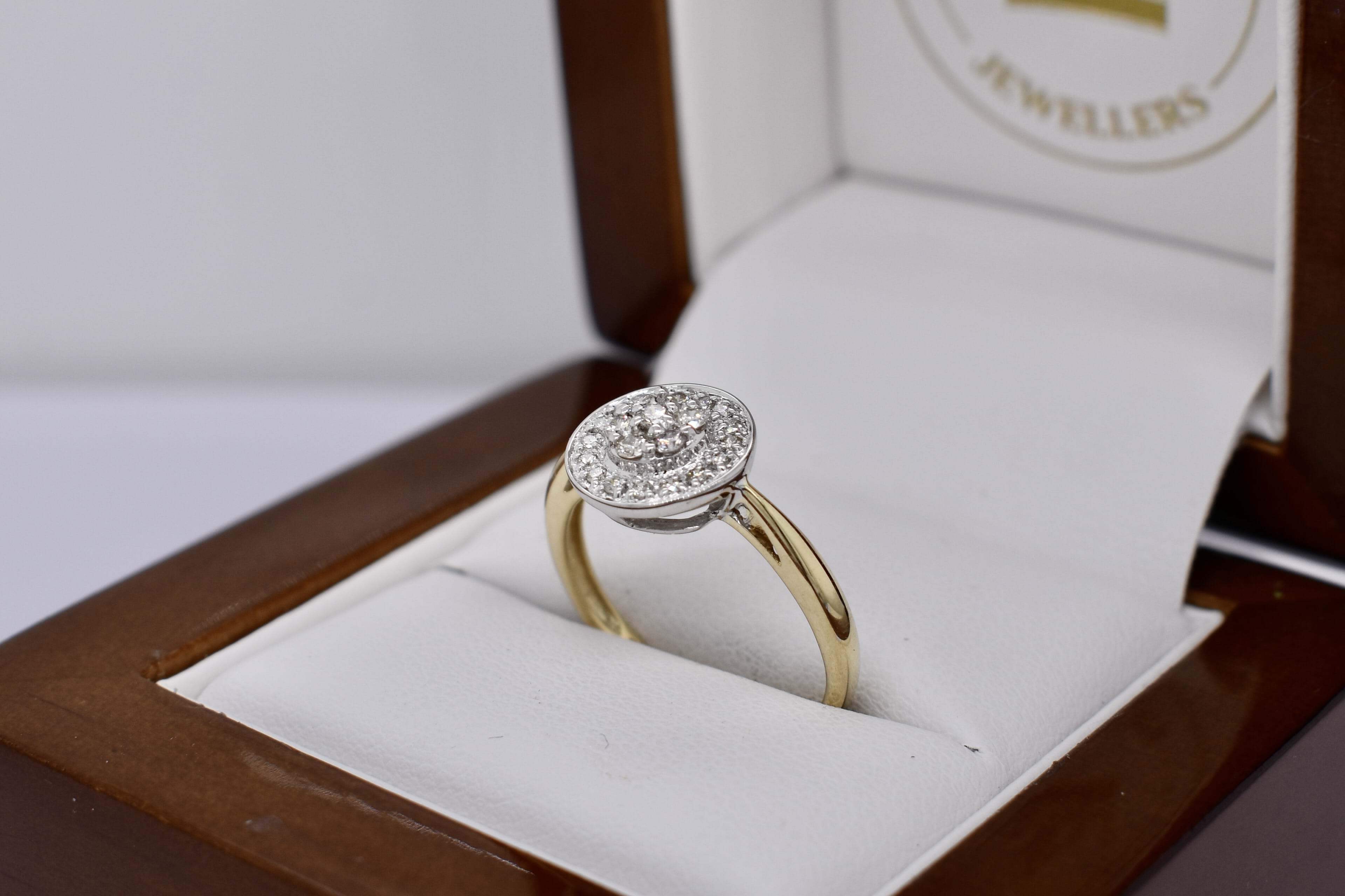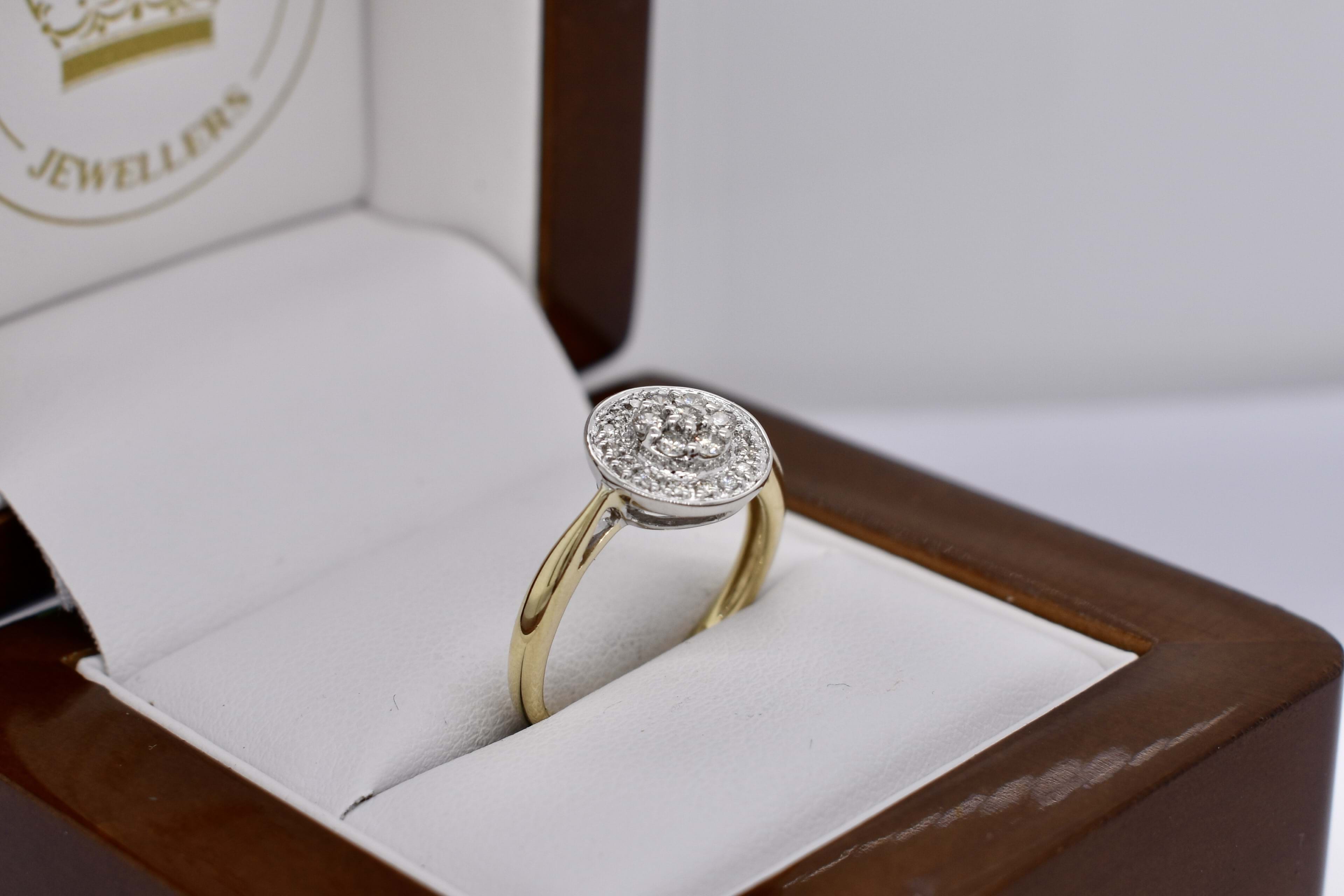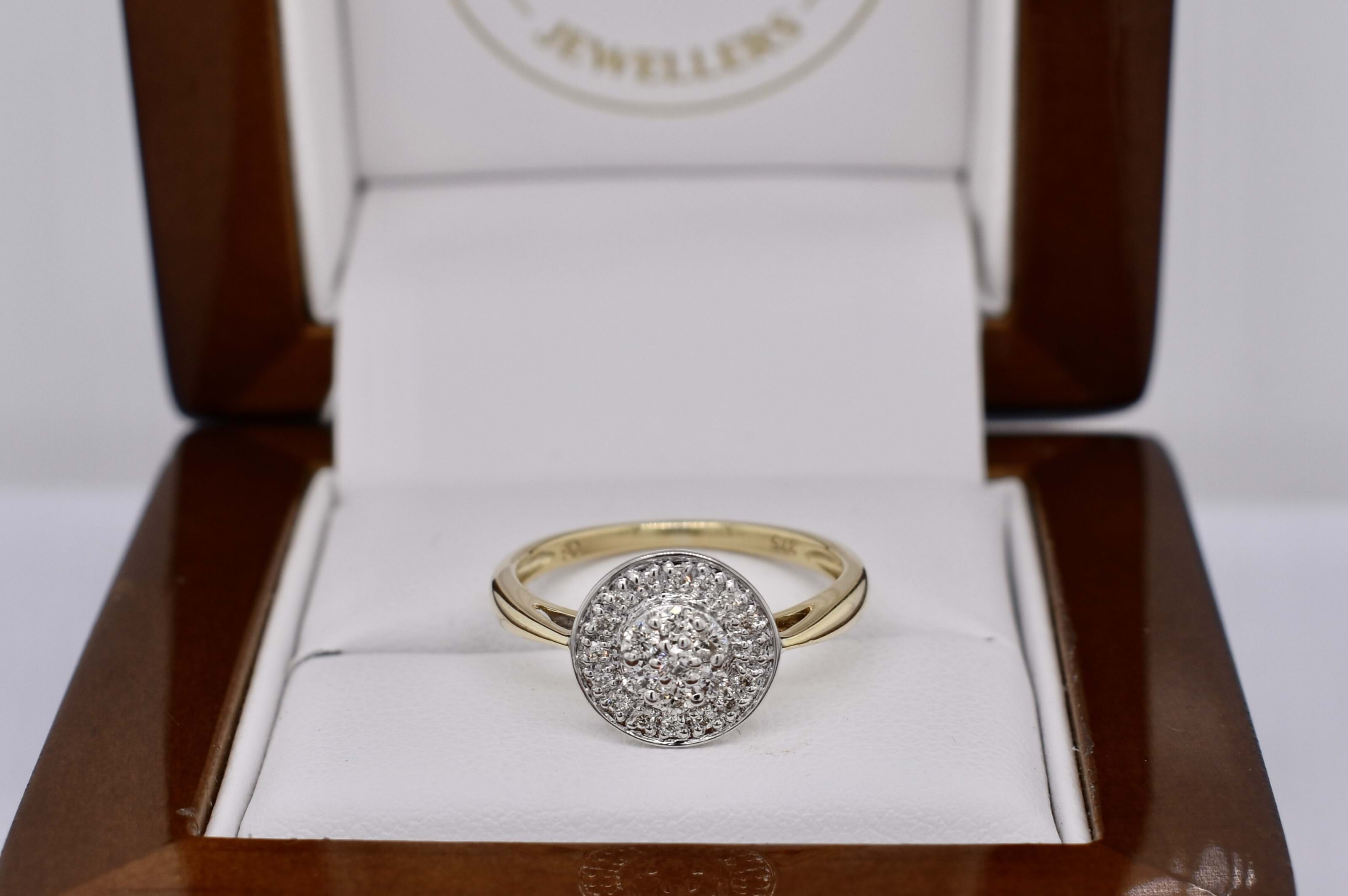 Sparkly and classic, this secondhand ring features a round 10mm top, set with a cluster of diamonds and a grain set halo surrounding. 2.07 grams. Finger size L.