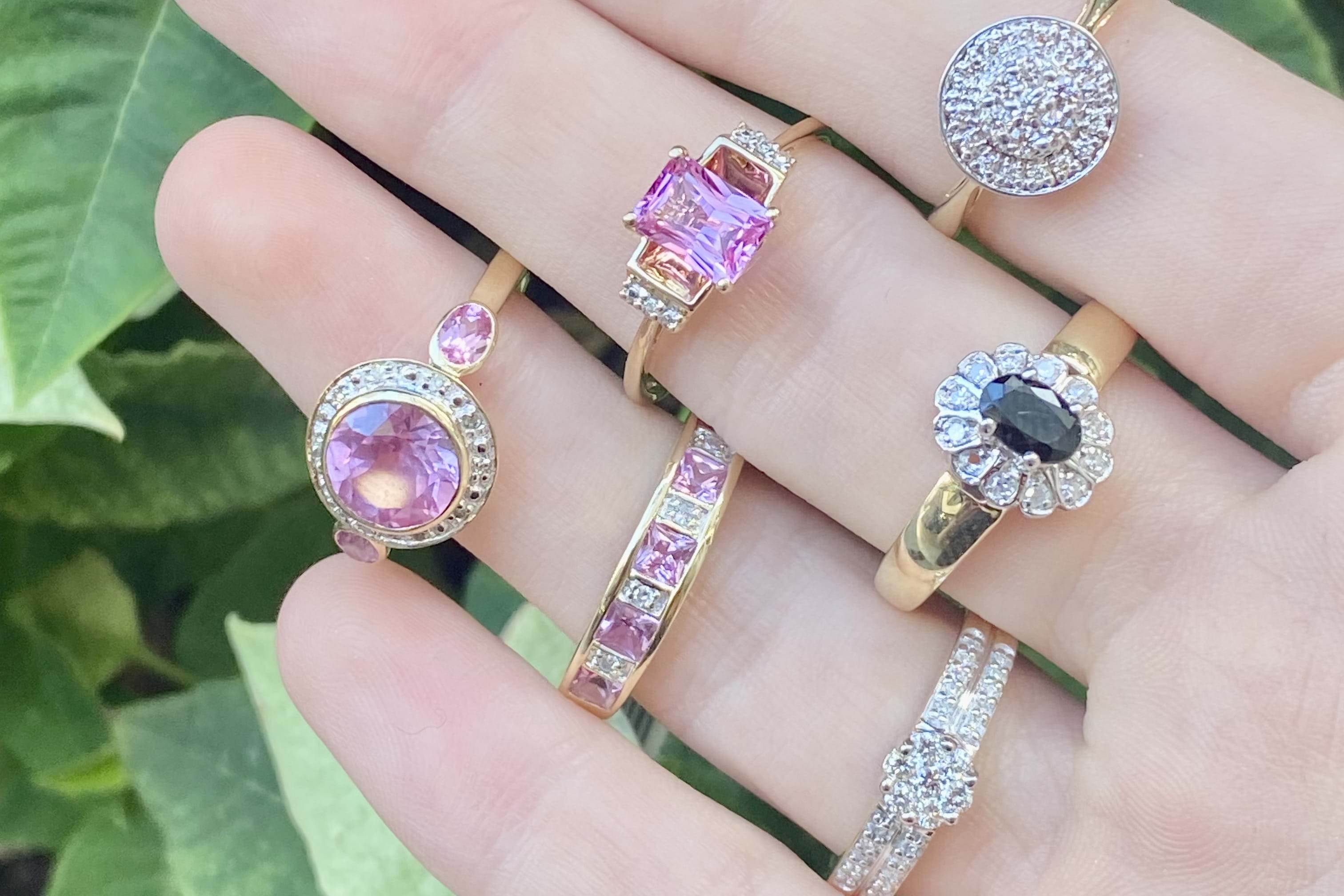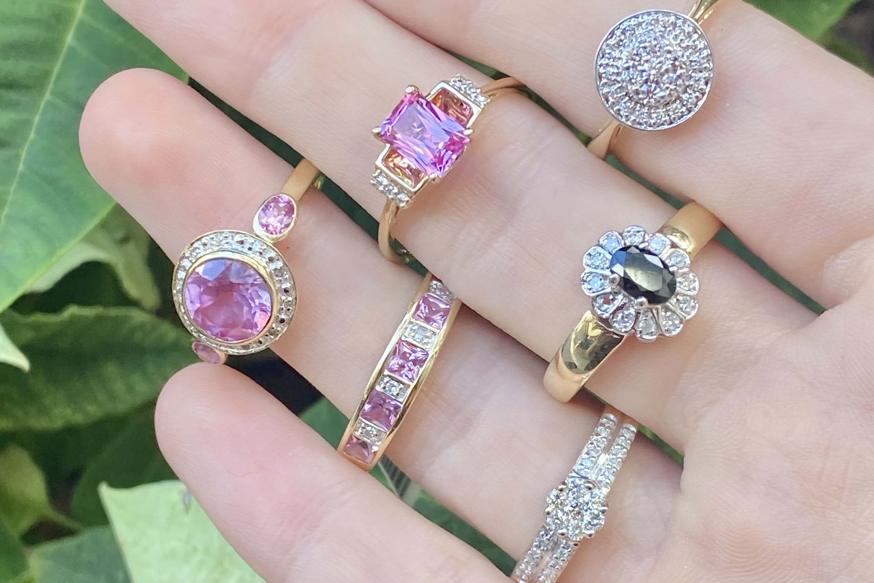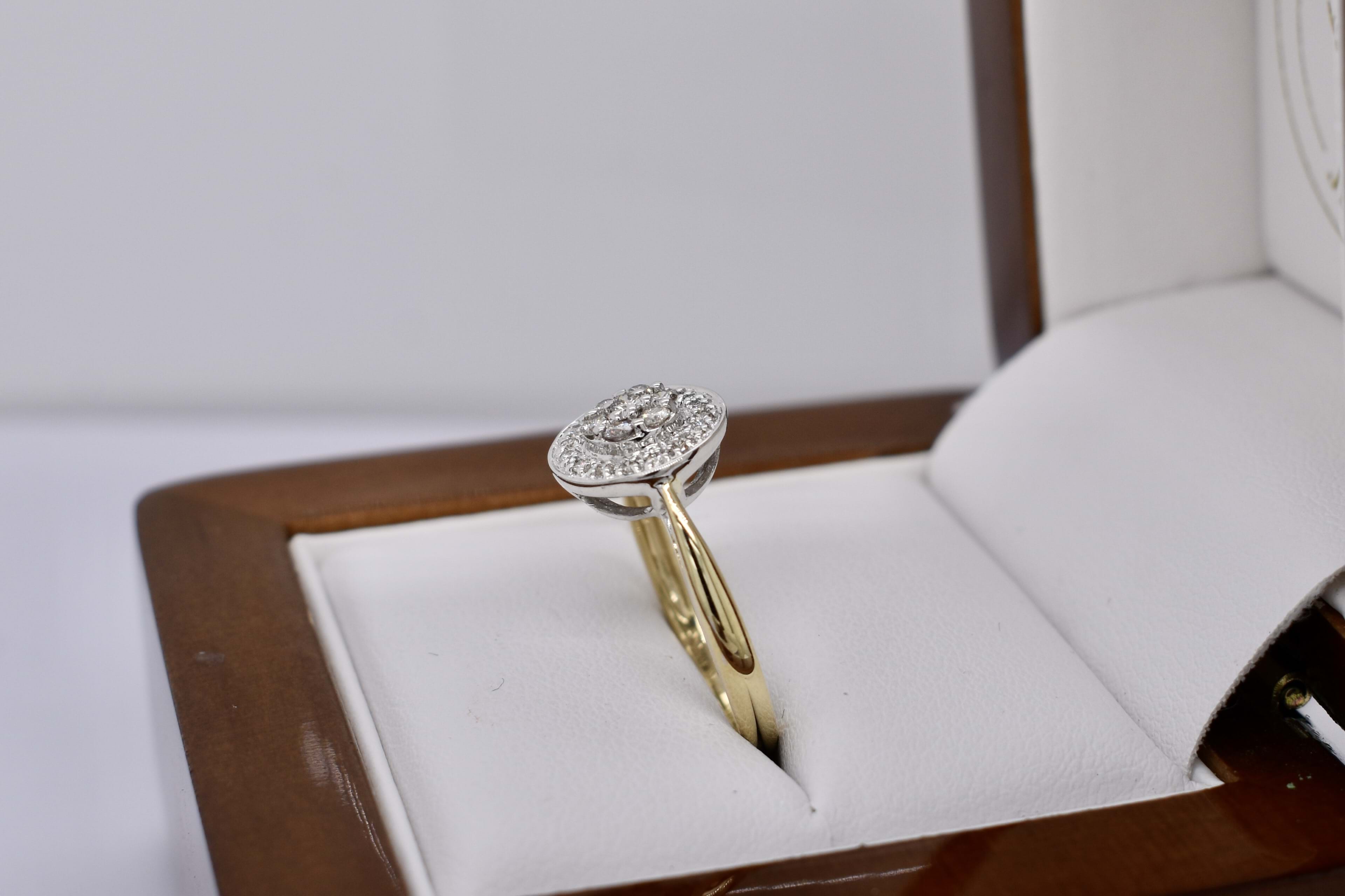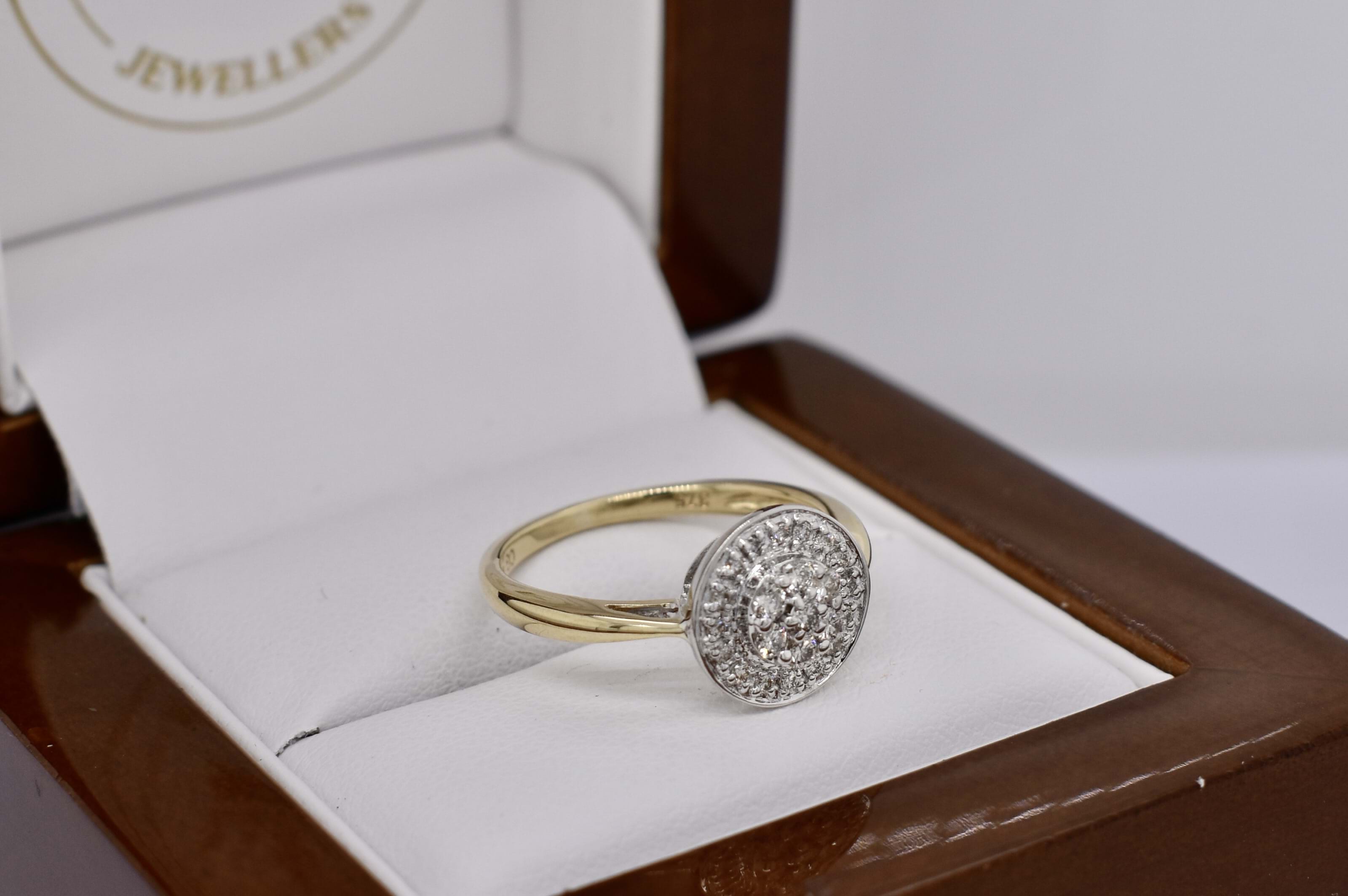 Sparkly and classic, this secondhand ring features a round 10mm top, set with a cluster of diamonds and a grain set halo surrounding. 2.07 grams. Finger size L.
