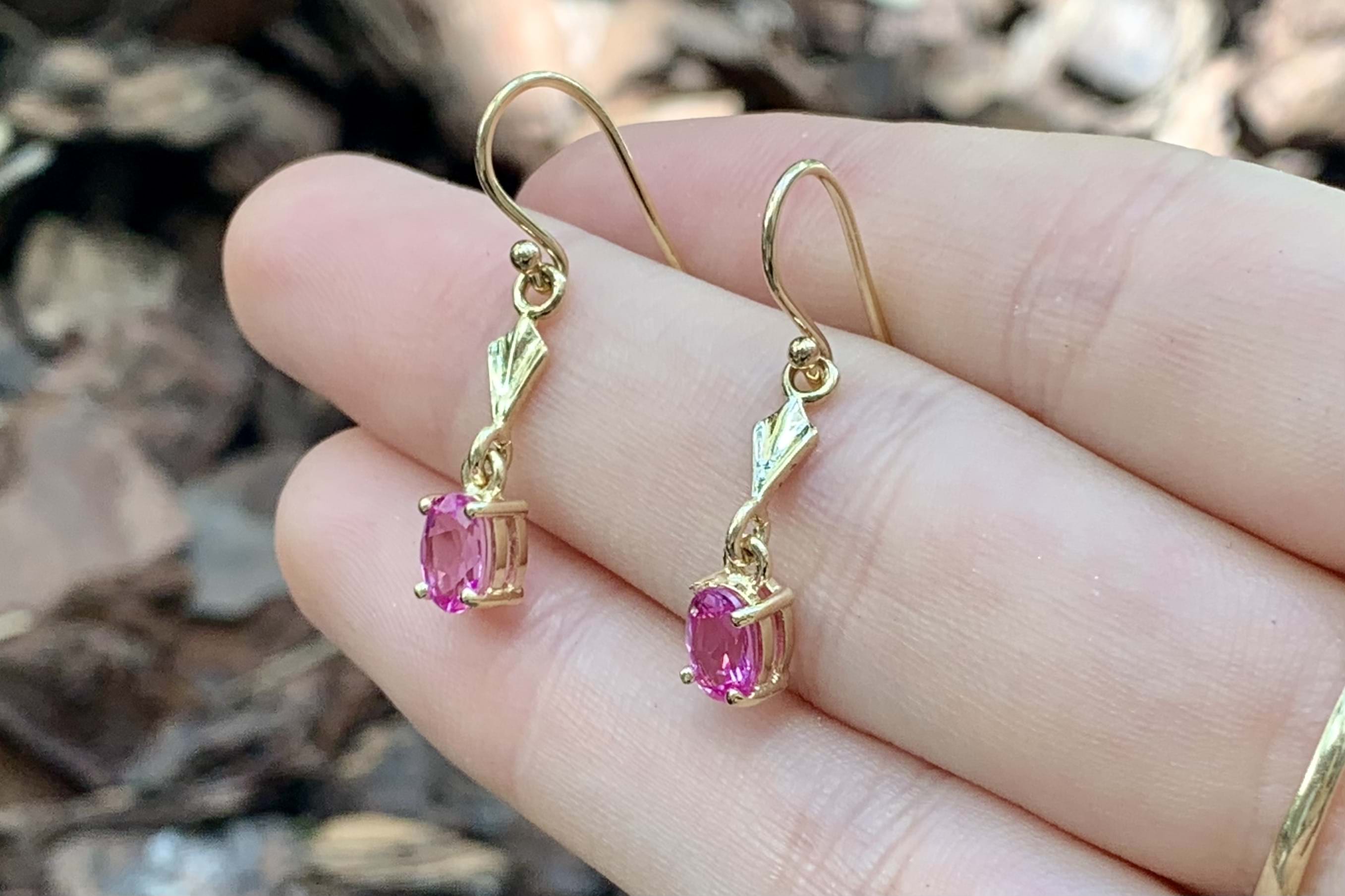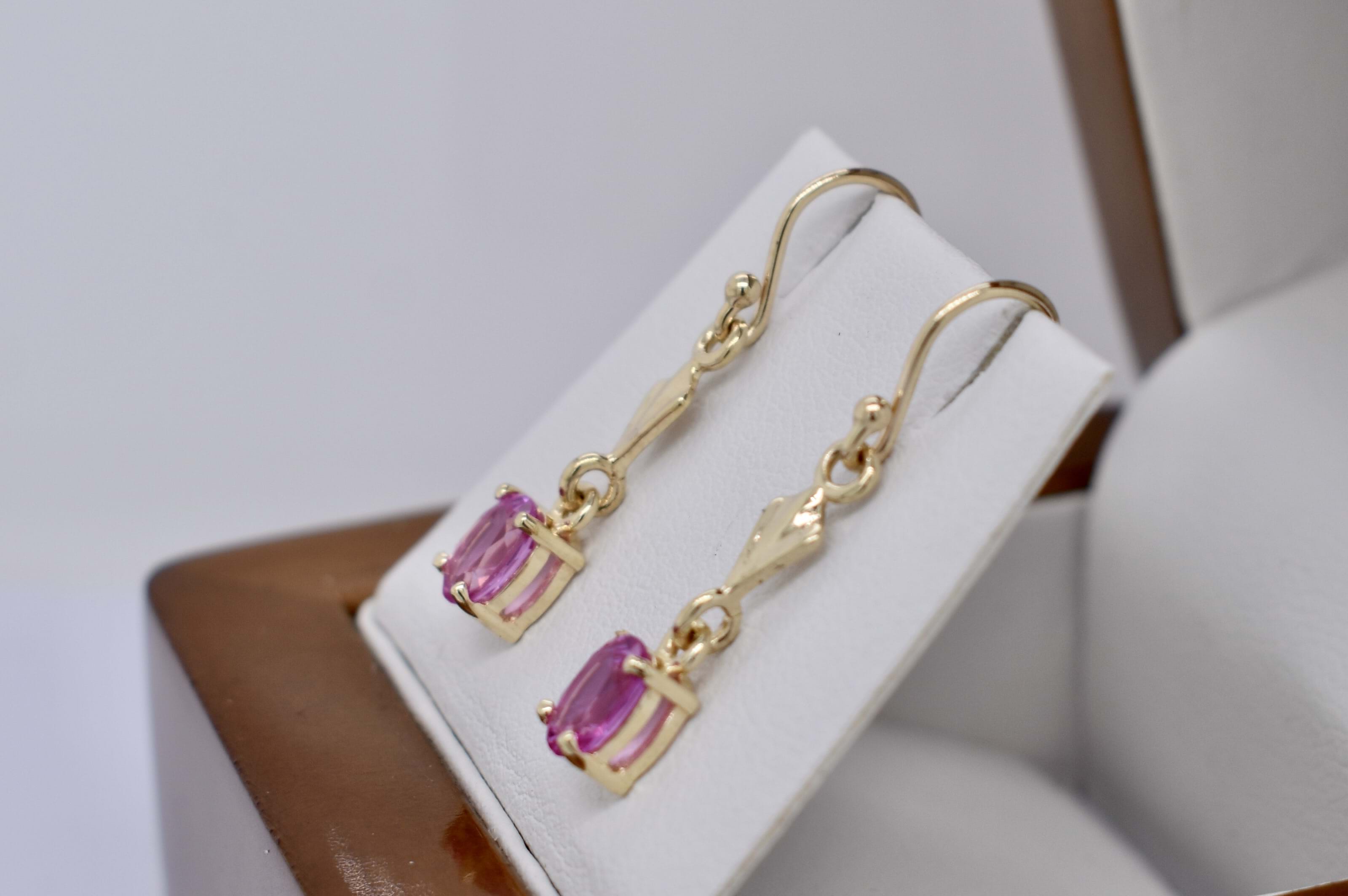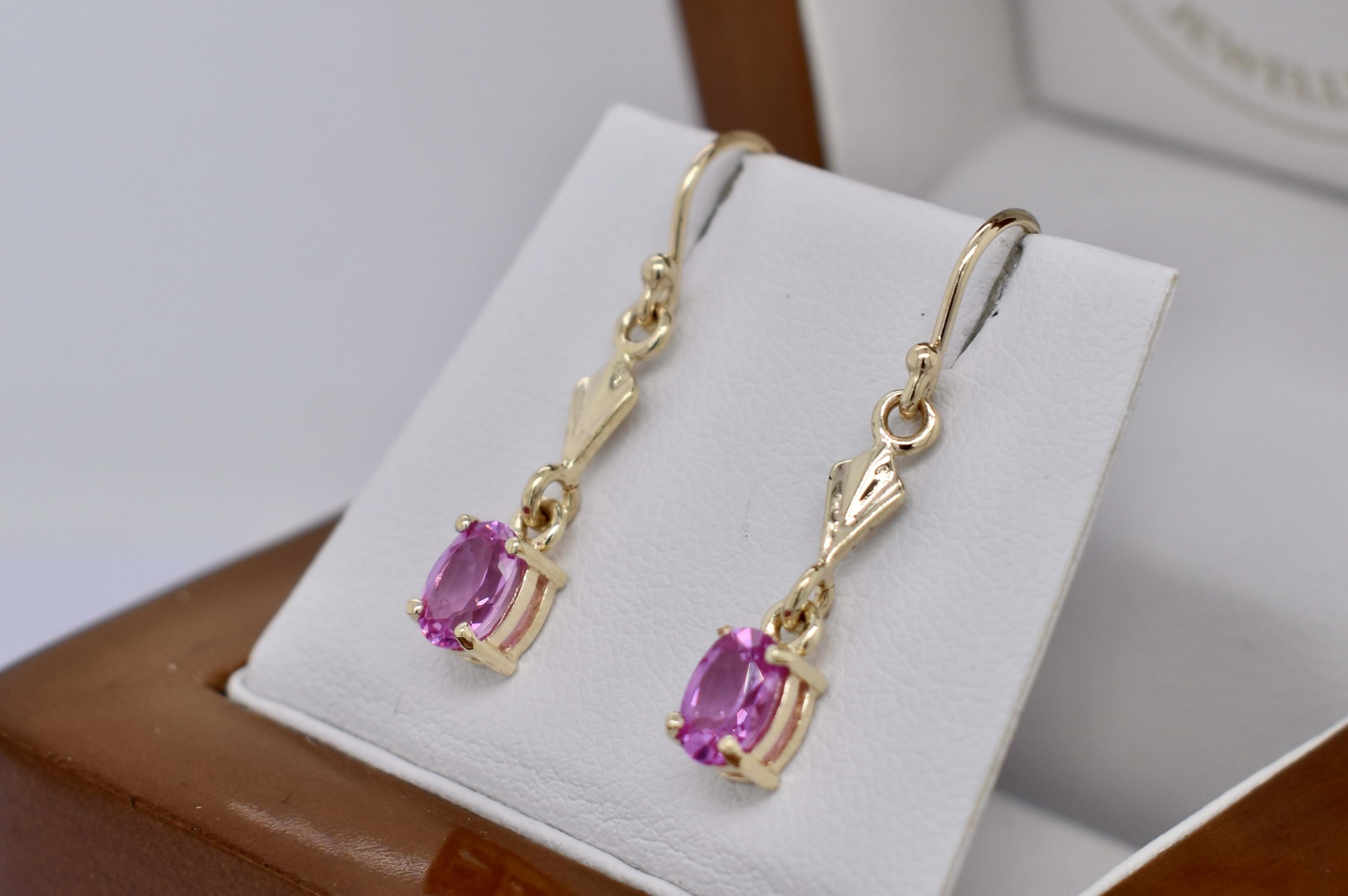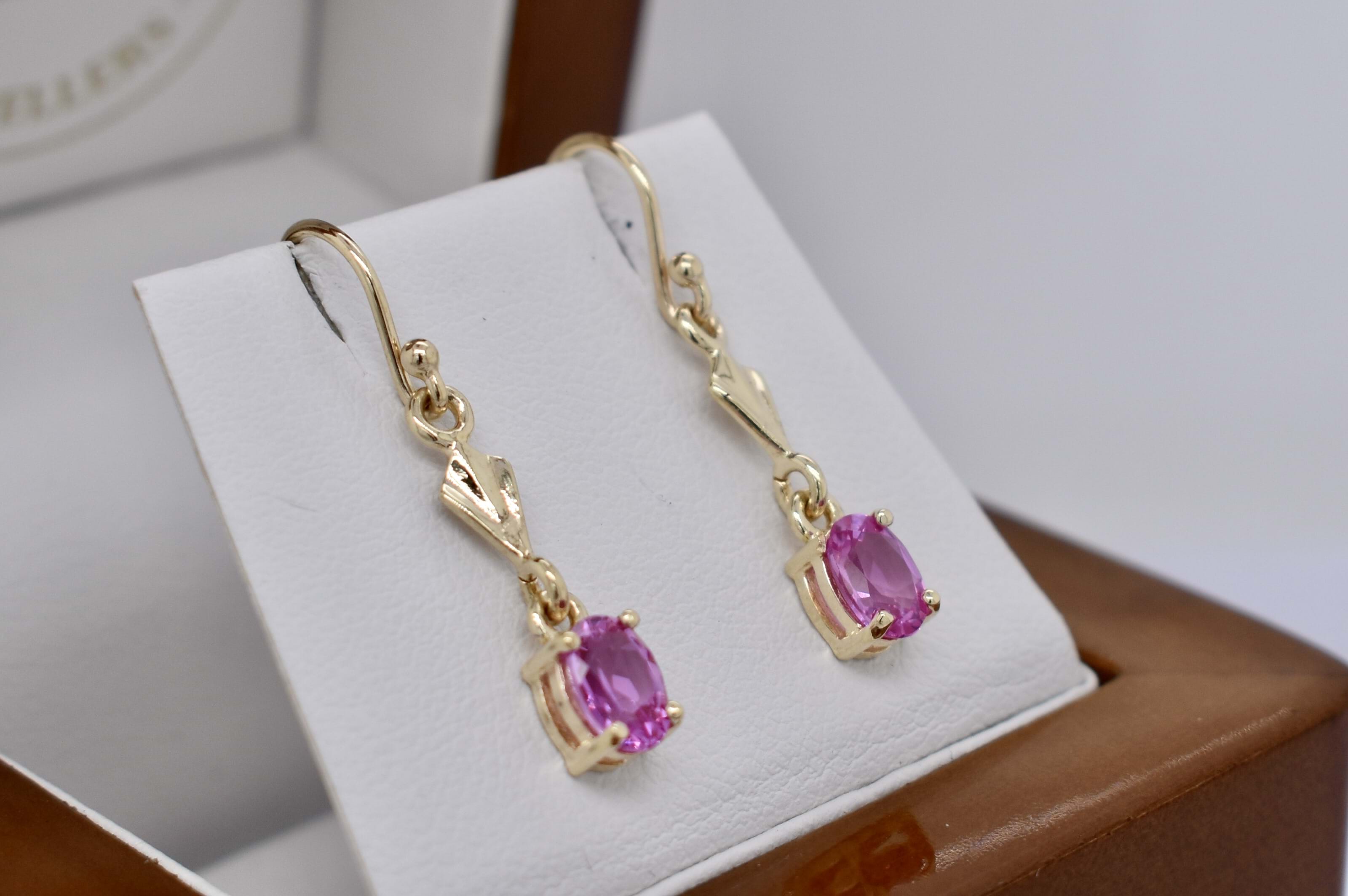 Beautiful secondhand 9ct yellow gold drops, featuring two oval 6x4mm pink synthetic sapphires, four claw set with fancy detailed shepherd hook fittings. 1.65 grams.