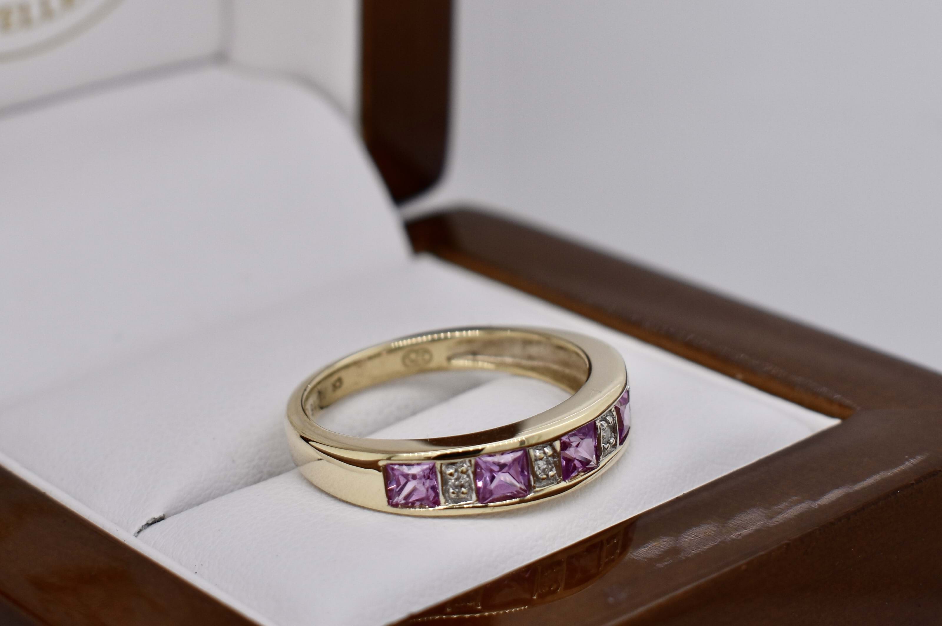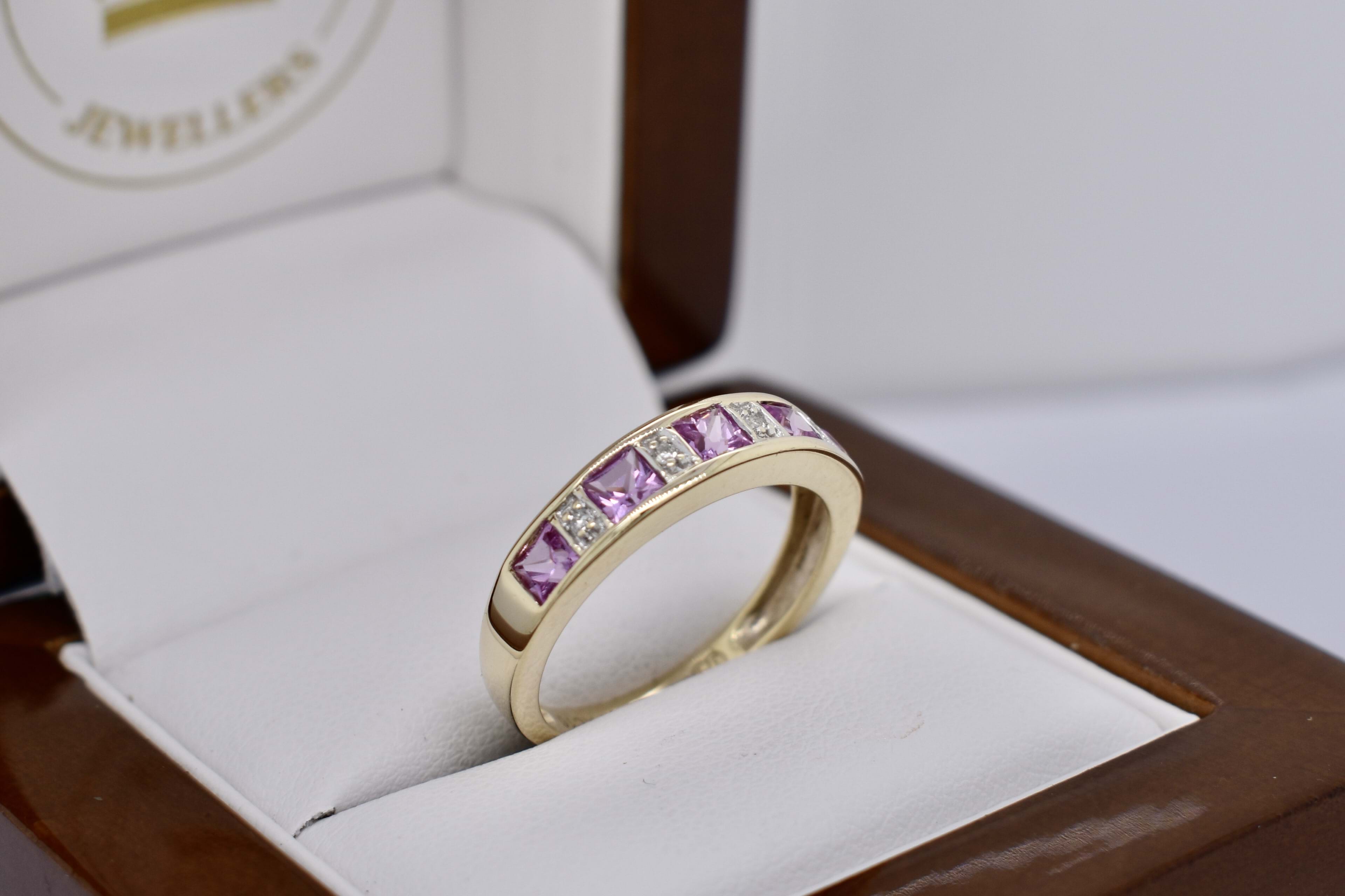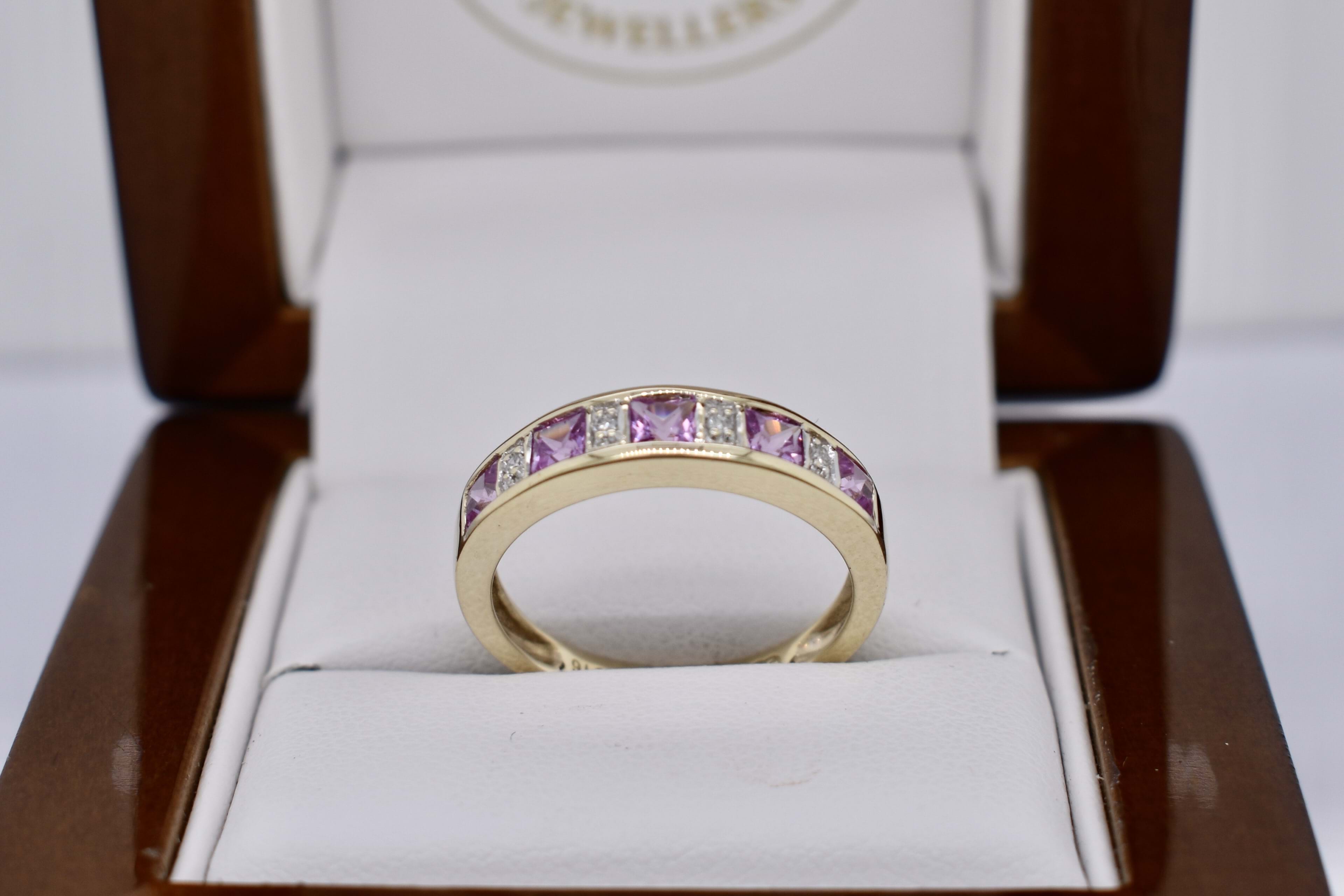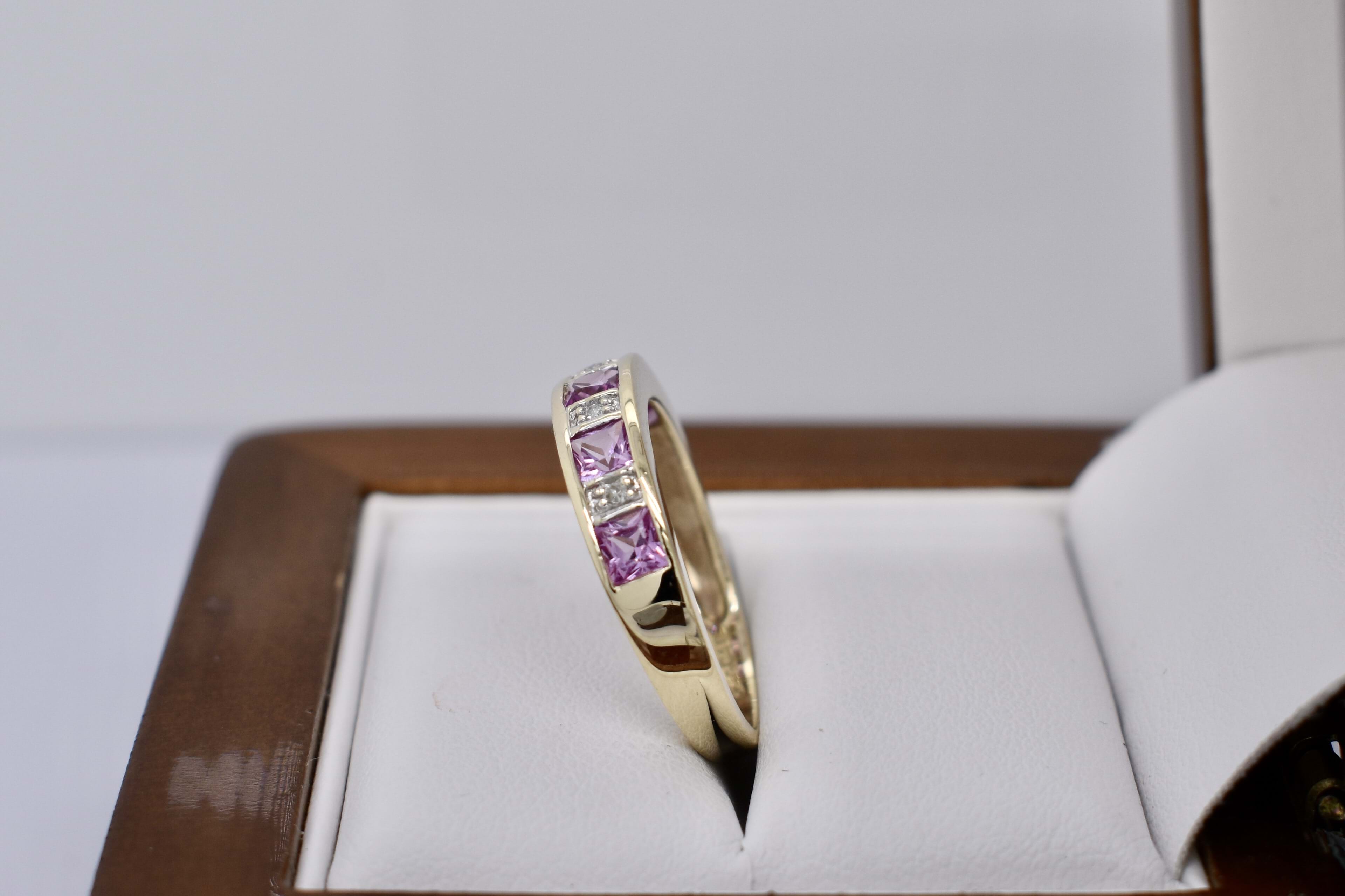 Pretty and pink, this secondhand ring features square pink synthetic sapphires alternating with 4.5-2.5mm diamonds, all channel and grain set. 2.46 grams. Finger size N+.