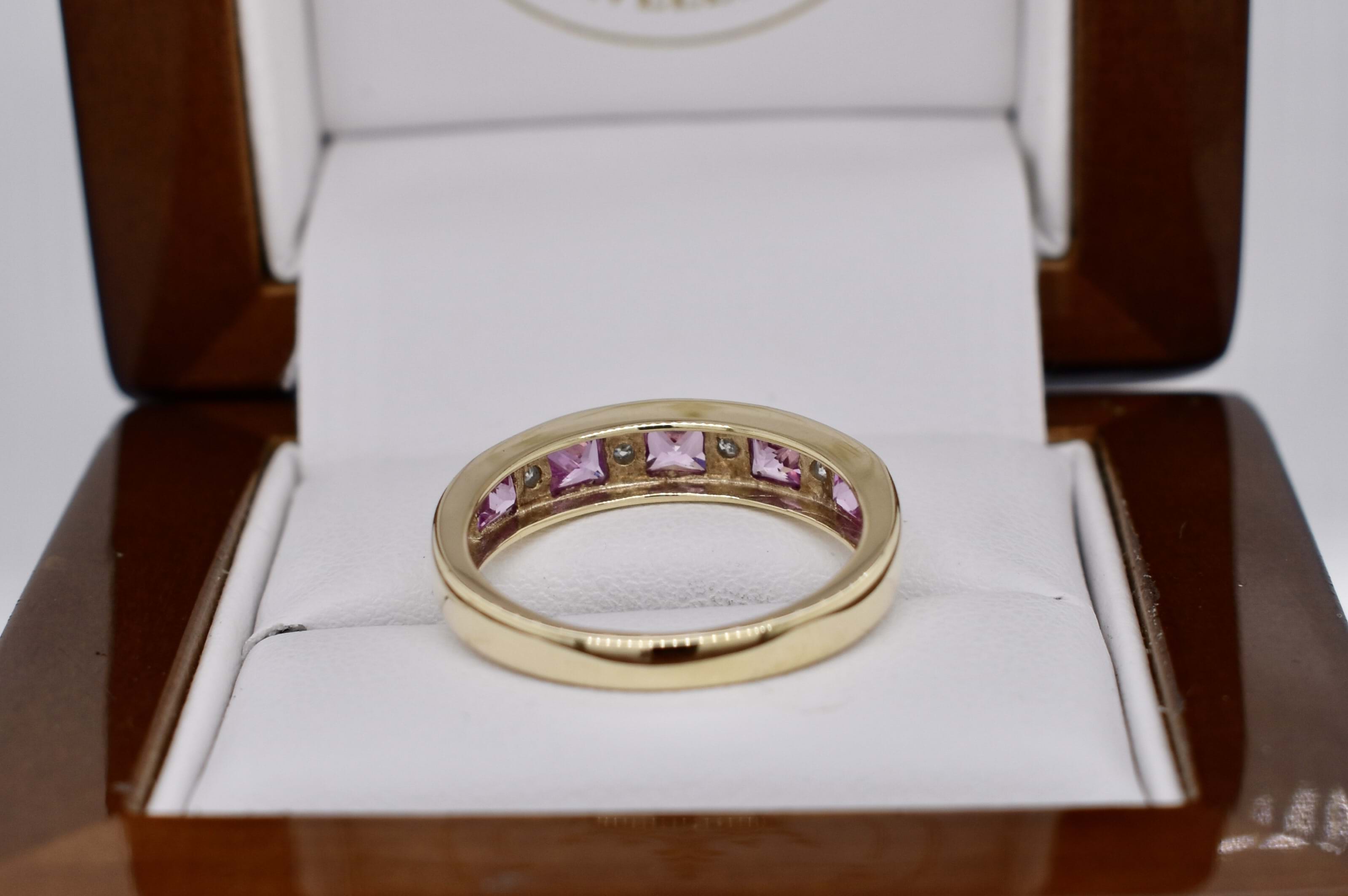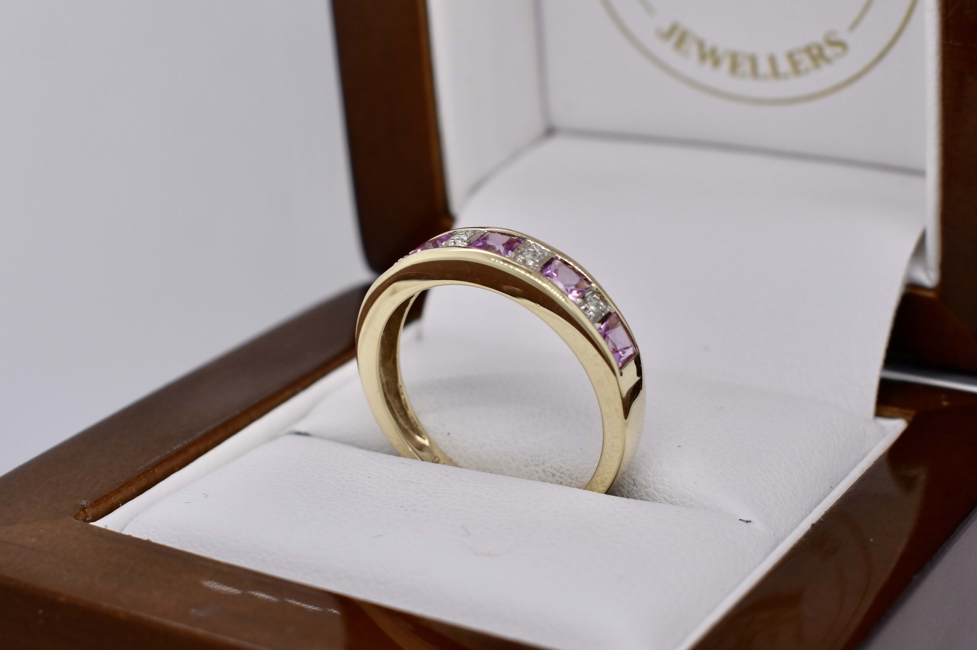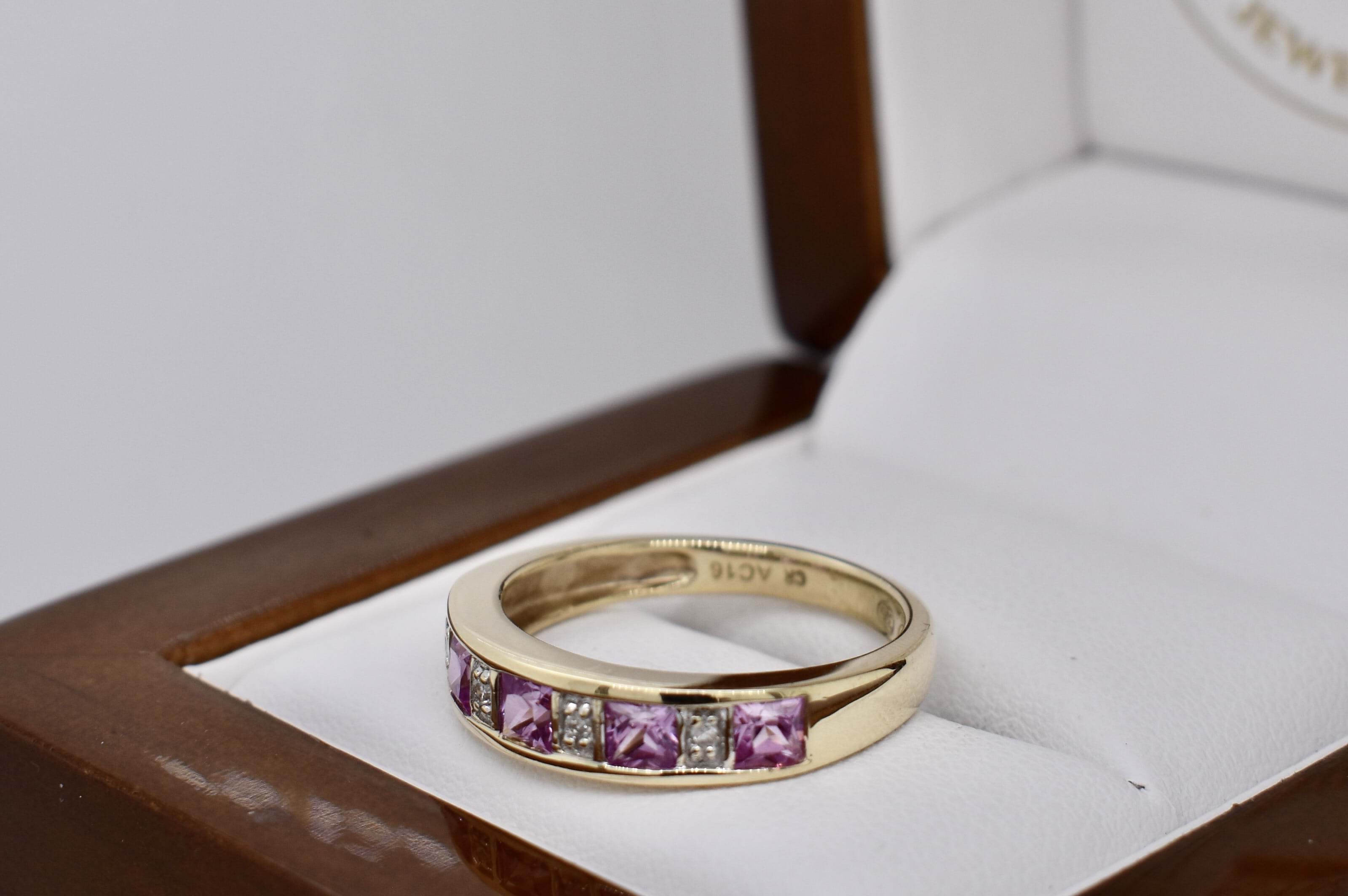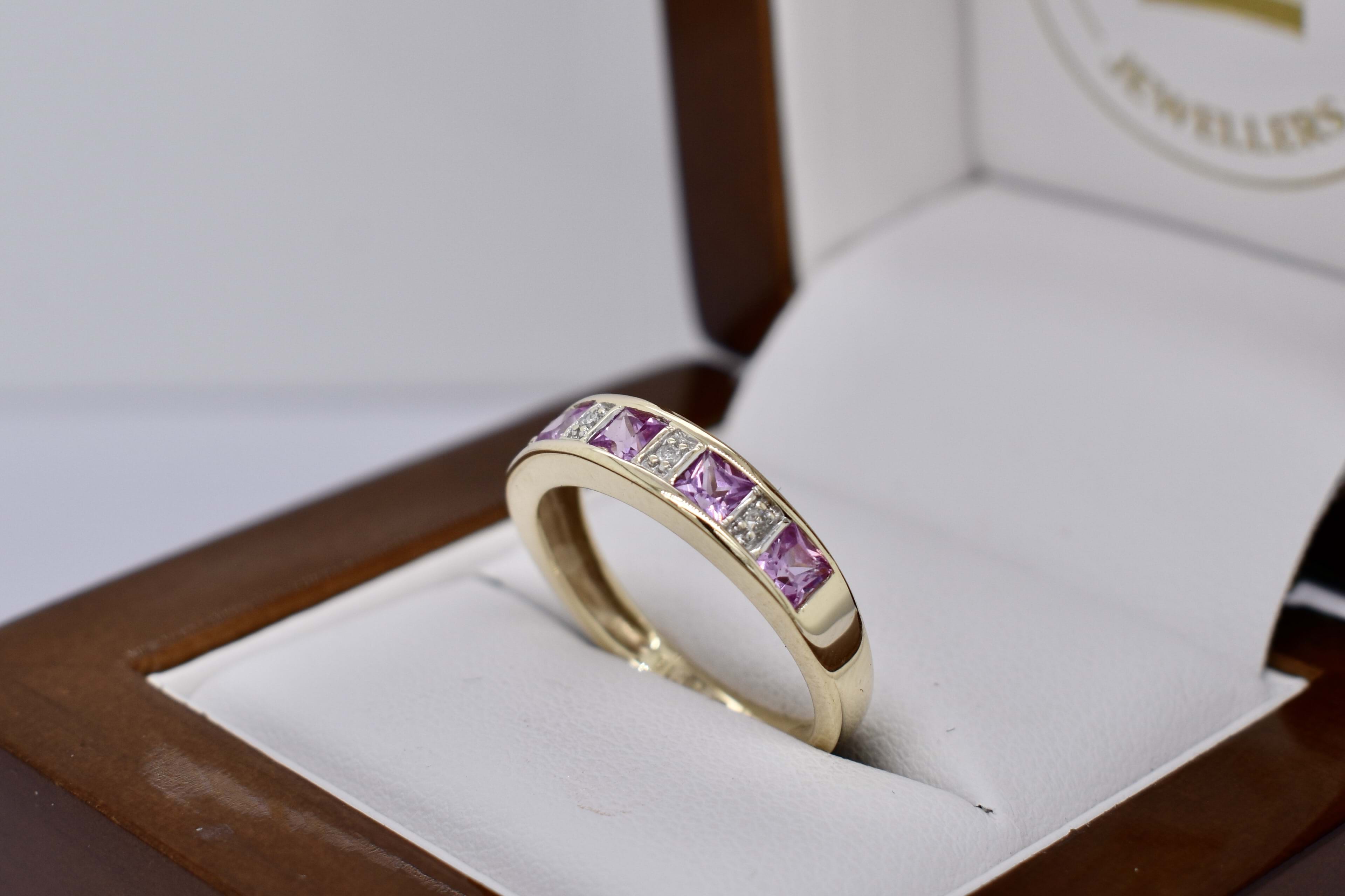 Pretty and pink, this secondhand ring features square pink synthetic sapphires alternating with 4.5-2.5mm diamonds, all channel and grain set. 2.46 grams. Finger size N+.