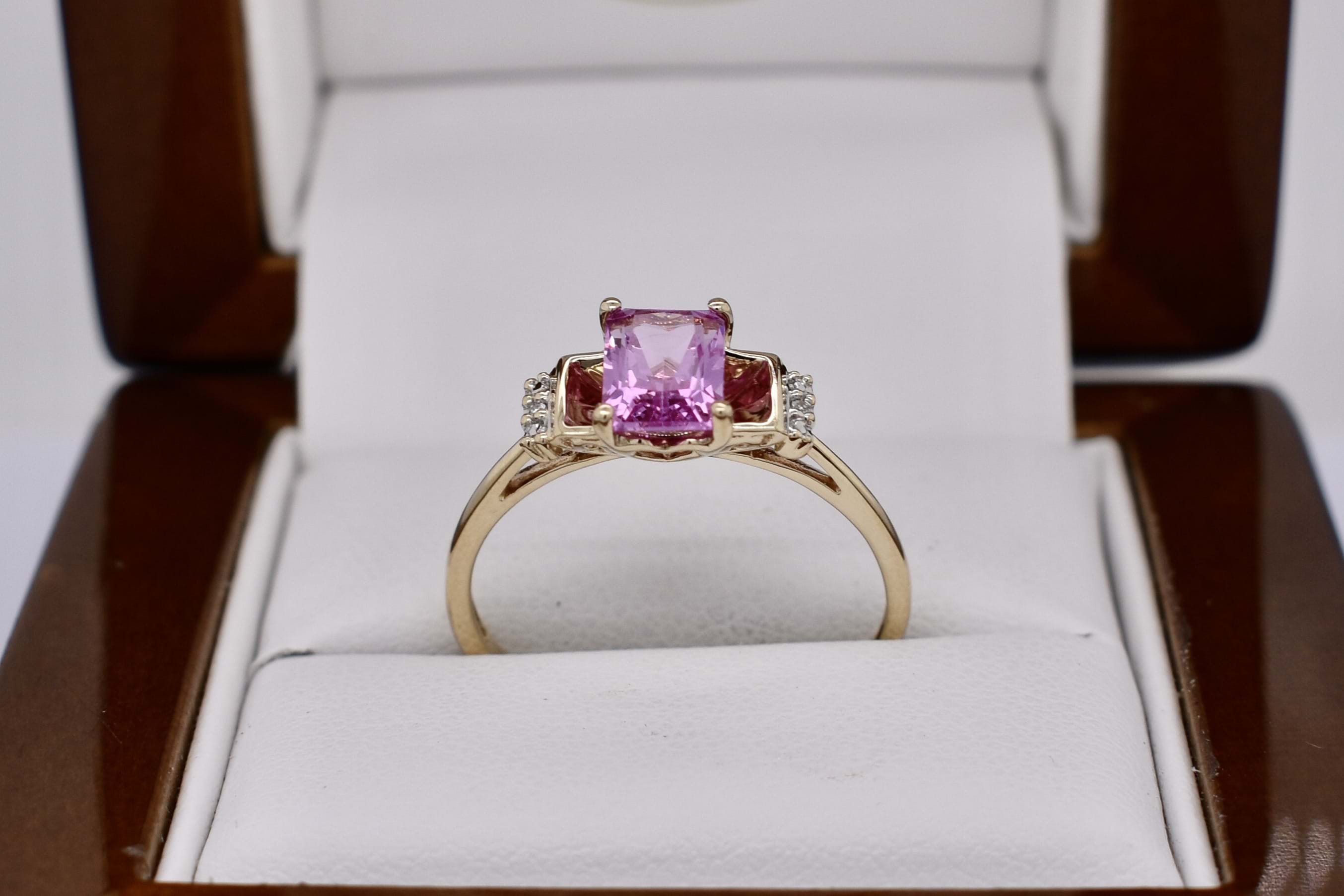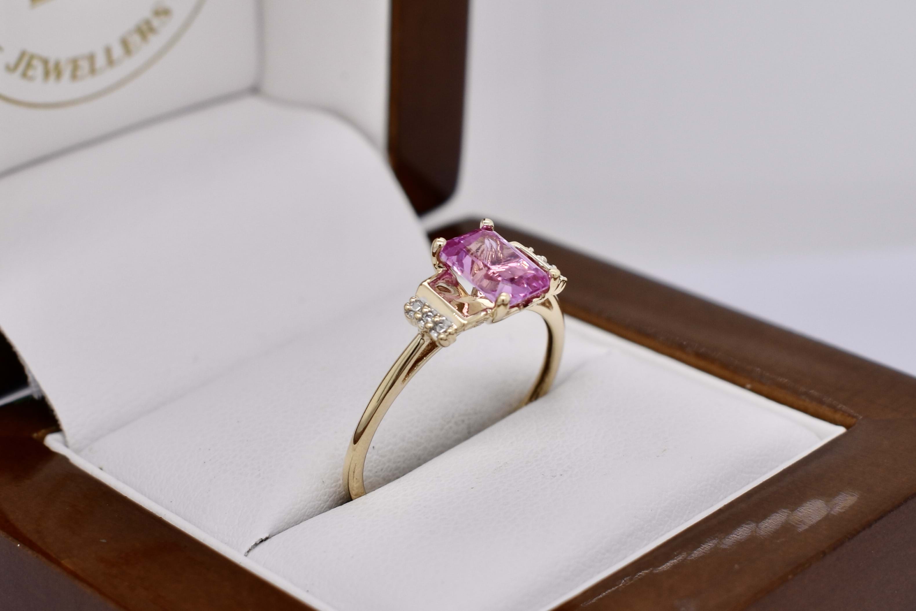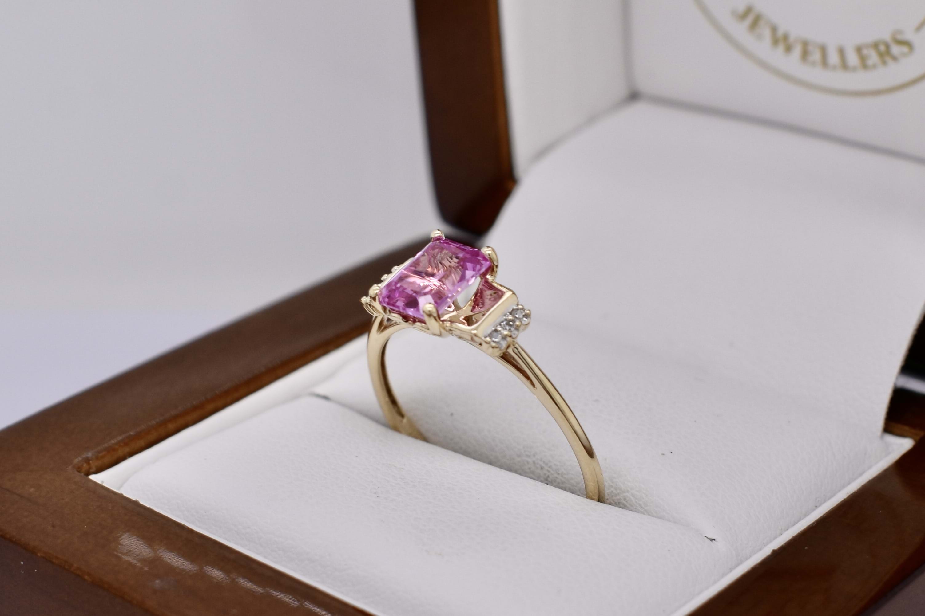 Gorgeous and bright, this secondhand trilogy ring features a radiant cut pink synthetic 7x5mm sapphire, claw set in 9ct yellow gold with a bezel set tourmaline either side and row of diamonds. Completed on a plain gold band. 1.86 grams. Finger size P+.