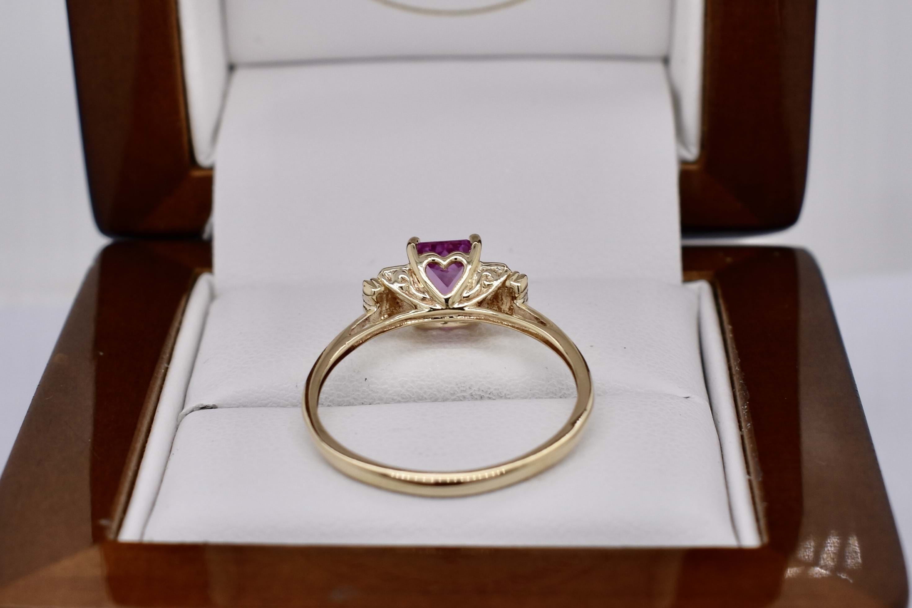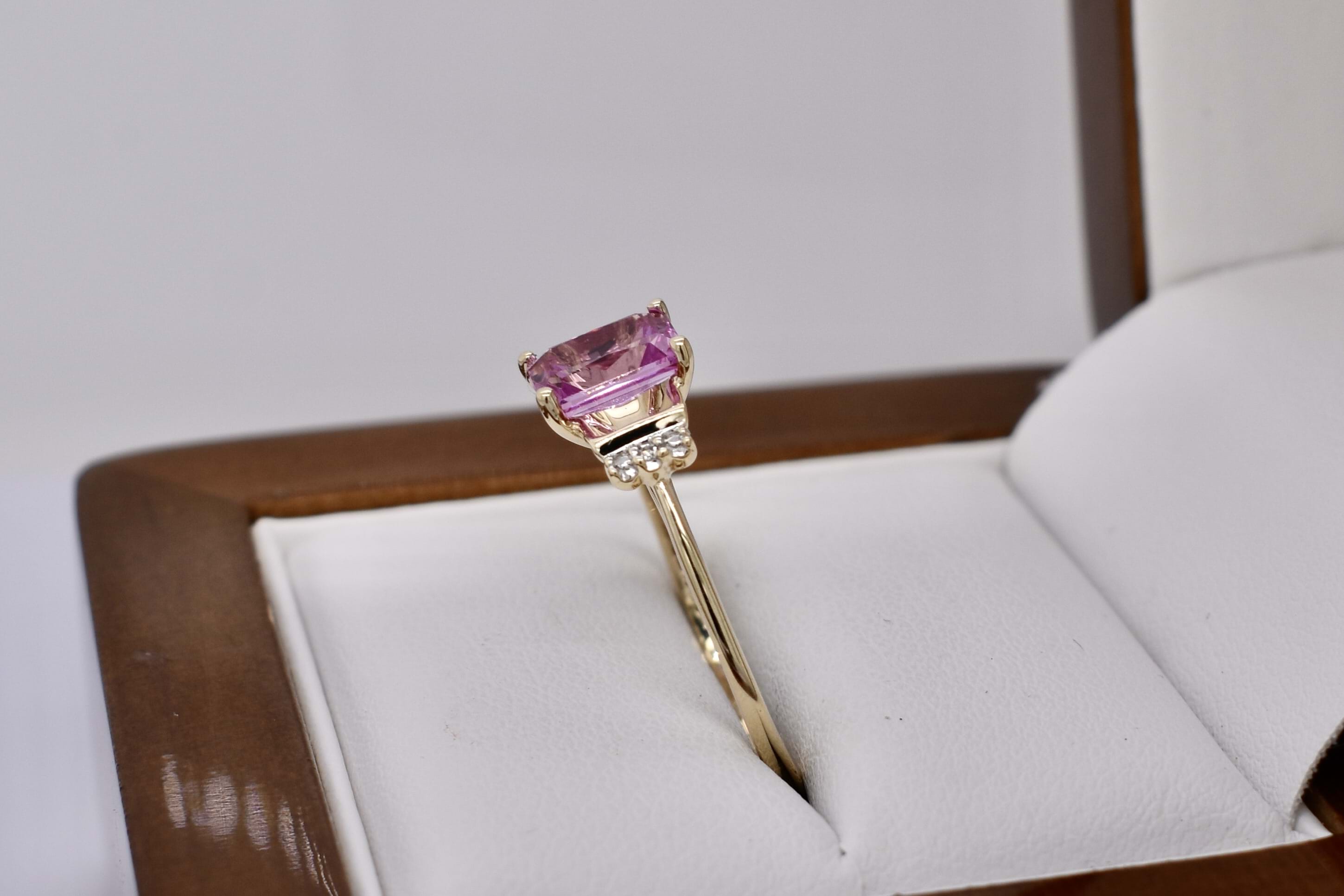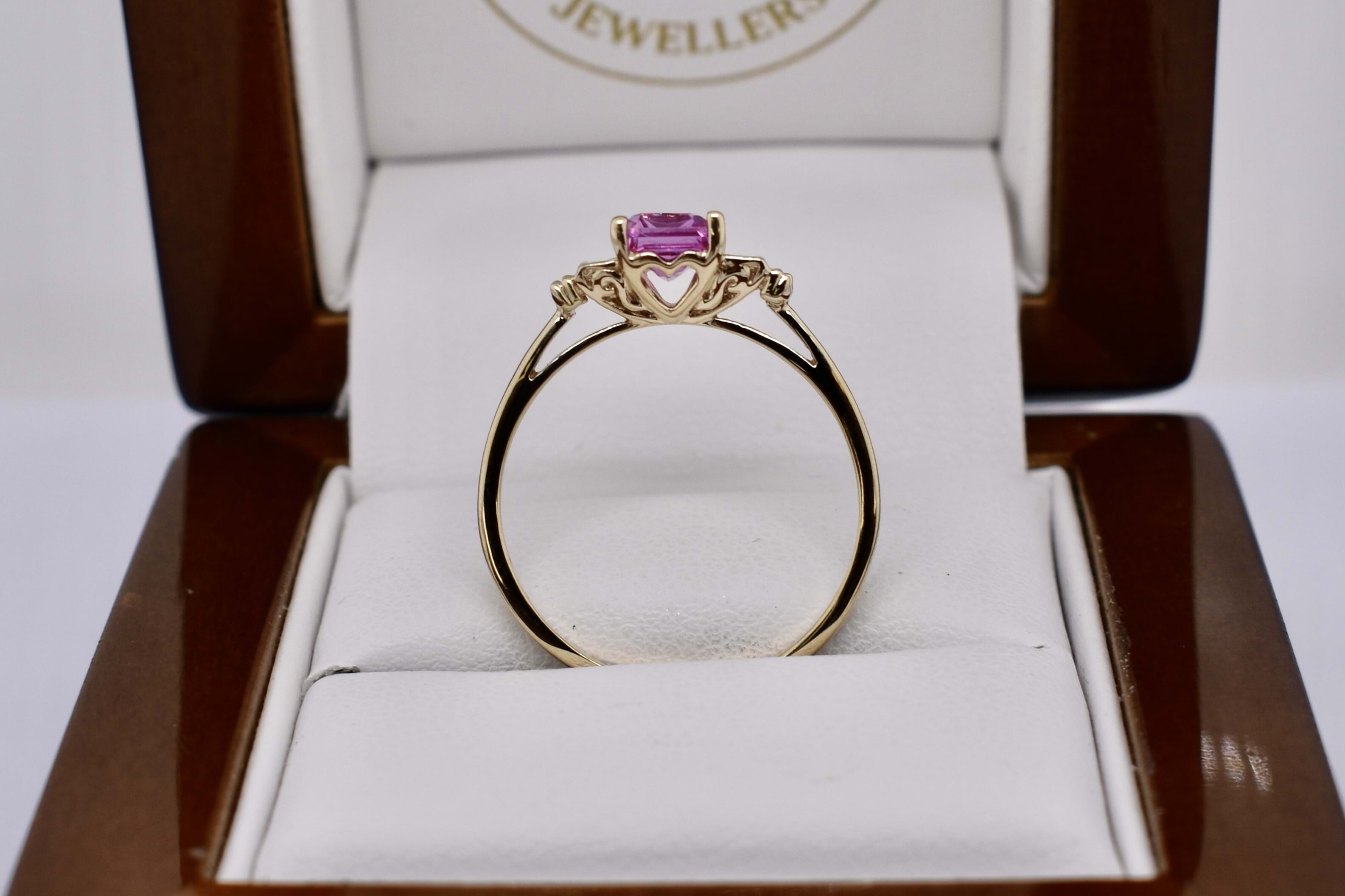 Gorgeous and bright, this secondhand trilogy ring features a radiant cut pink synthetic 7x5mm sapphire, claw set in 9ct yellow gold with a bezel set tourmaline either side and row of diamonds. Completed on a plain gold band. 1.86 grams. Finger size P+.