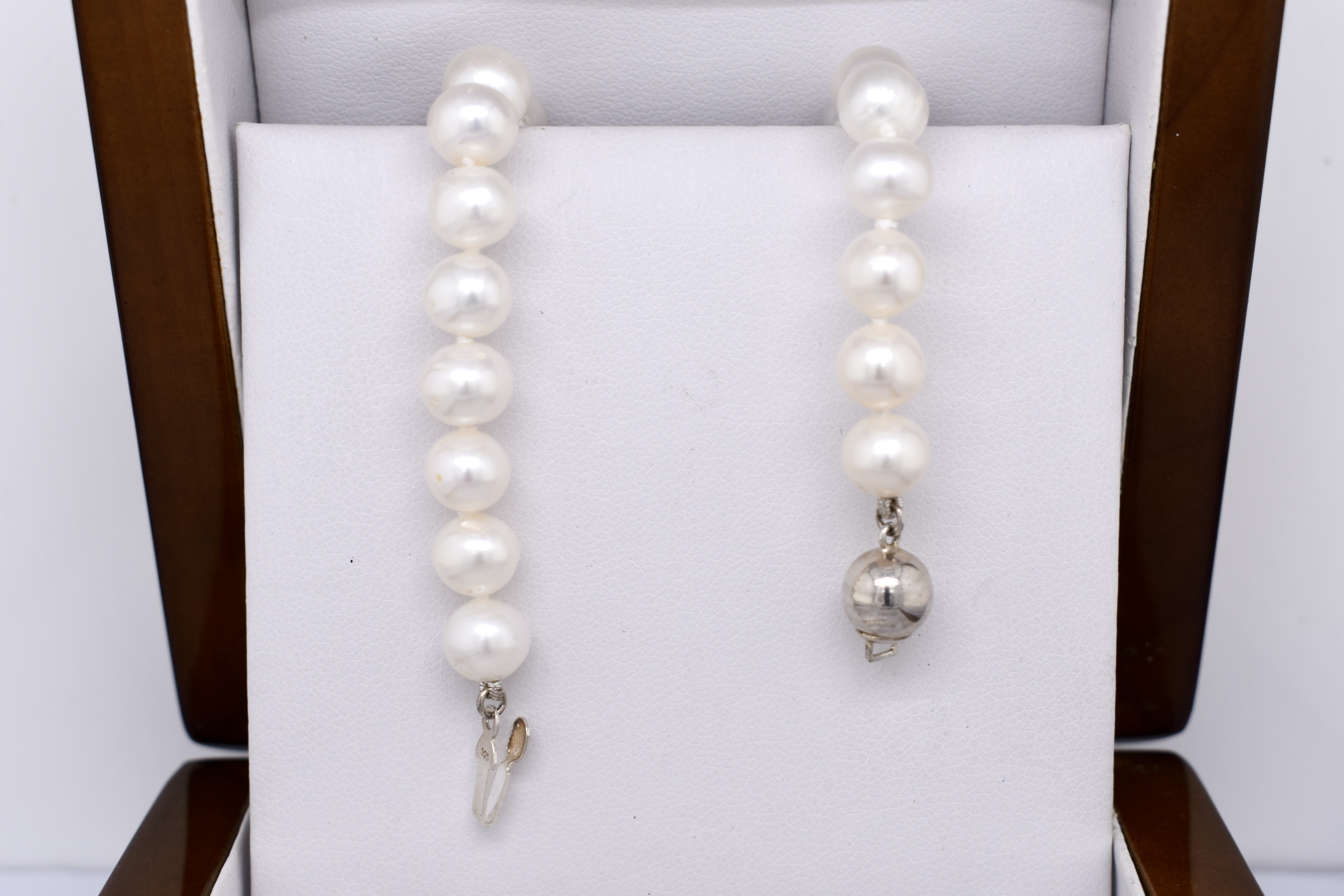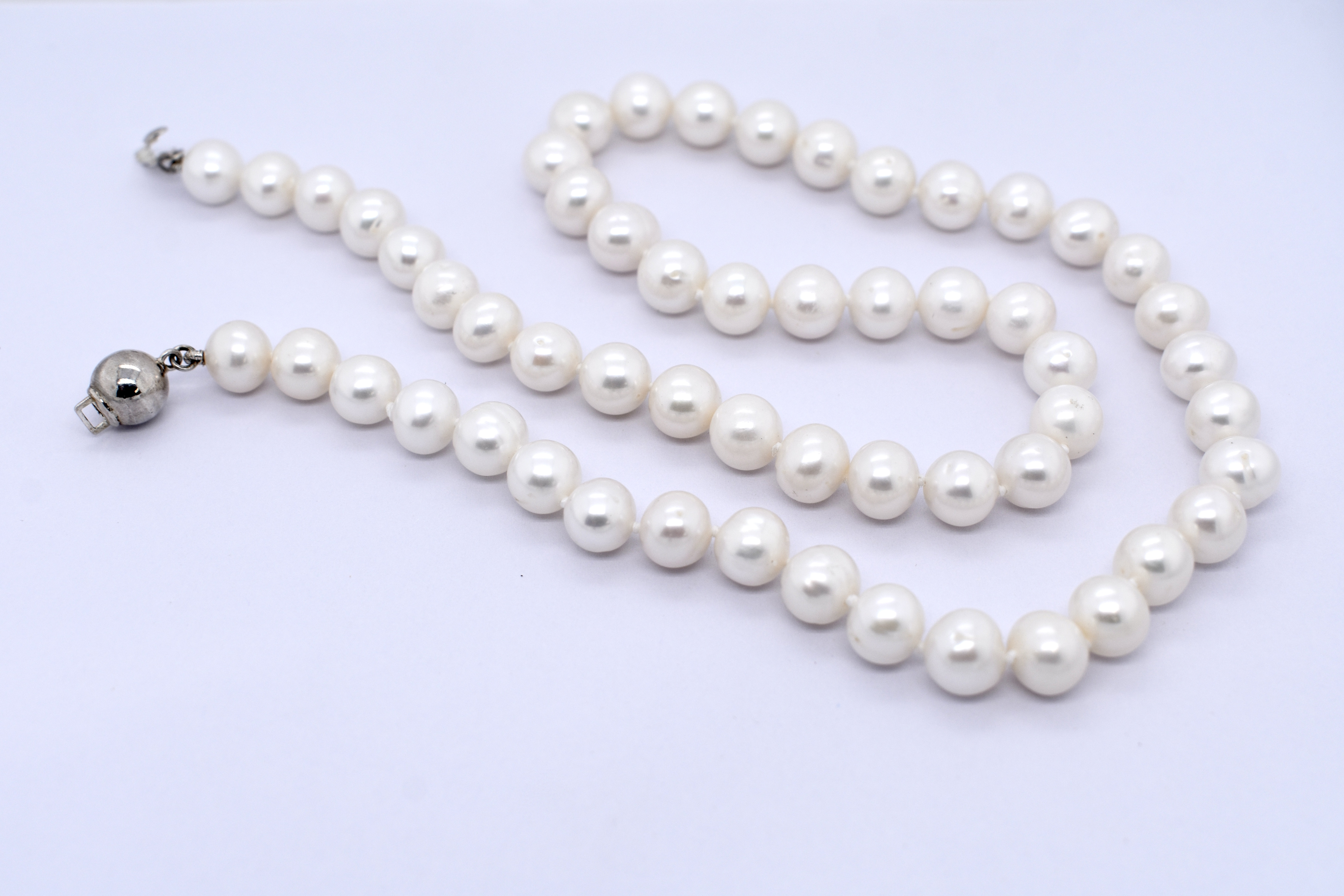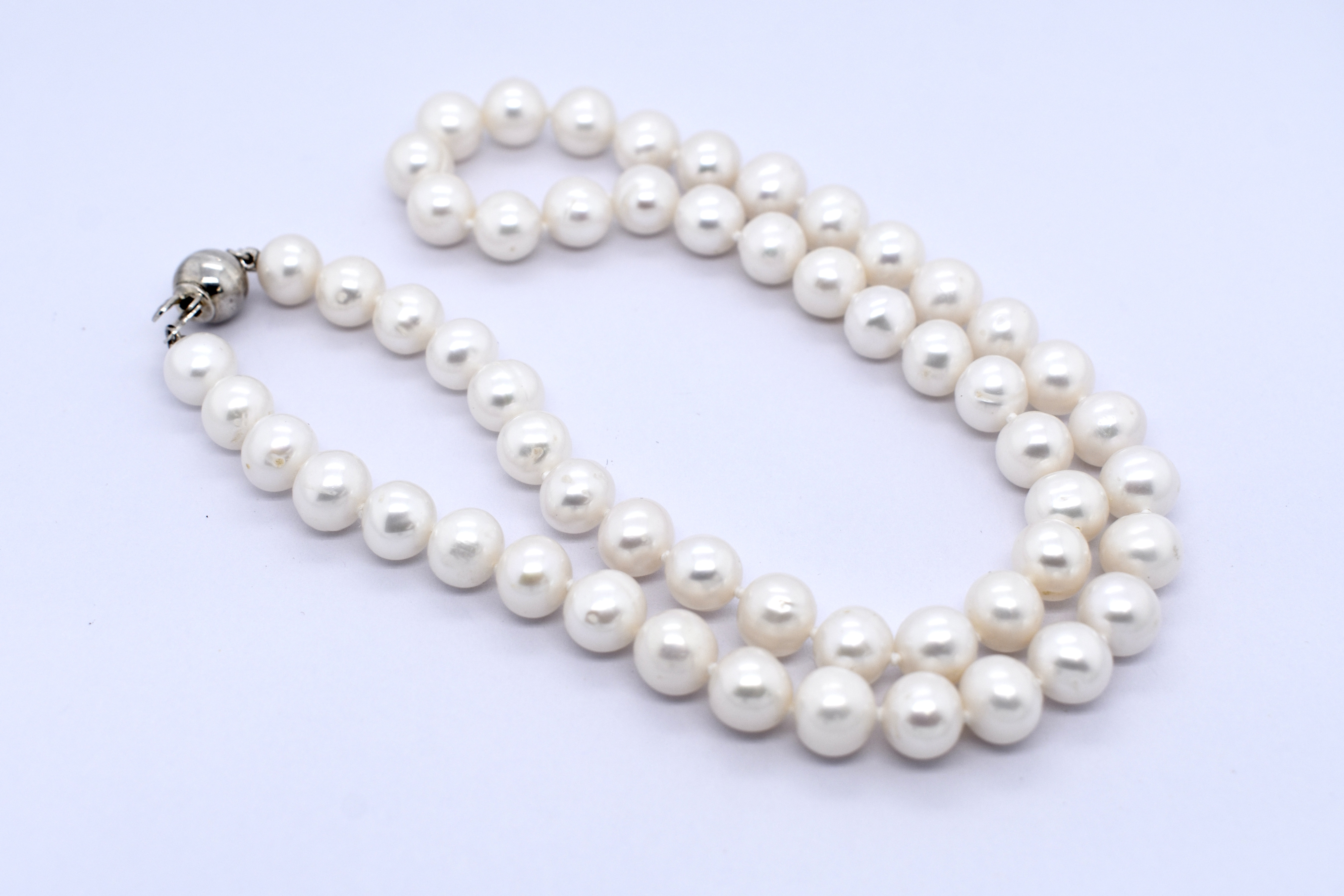 A pretty strand of white Freshwater pearls, measuring 7-8mm near round. The pearls have been hand strung on silk and individually knotted with a sterling silver ball clasp. Strand length 46cm. Complete the set with the matching bracelet: 20374860.
