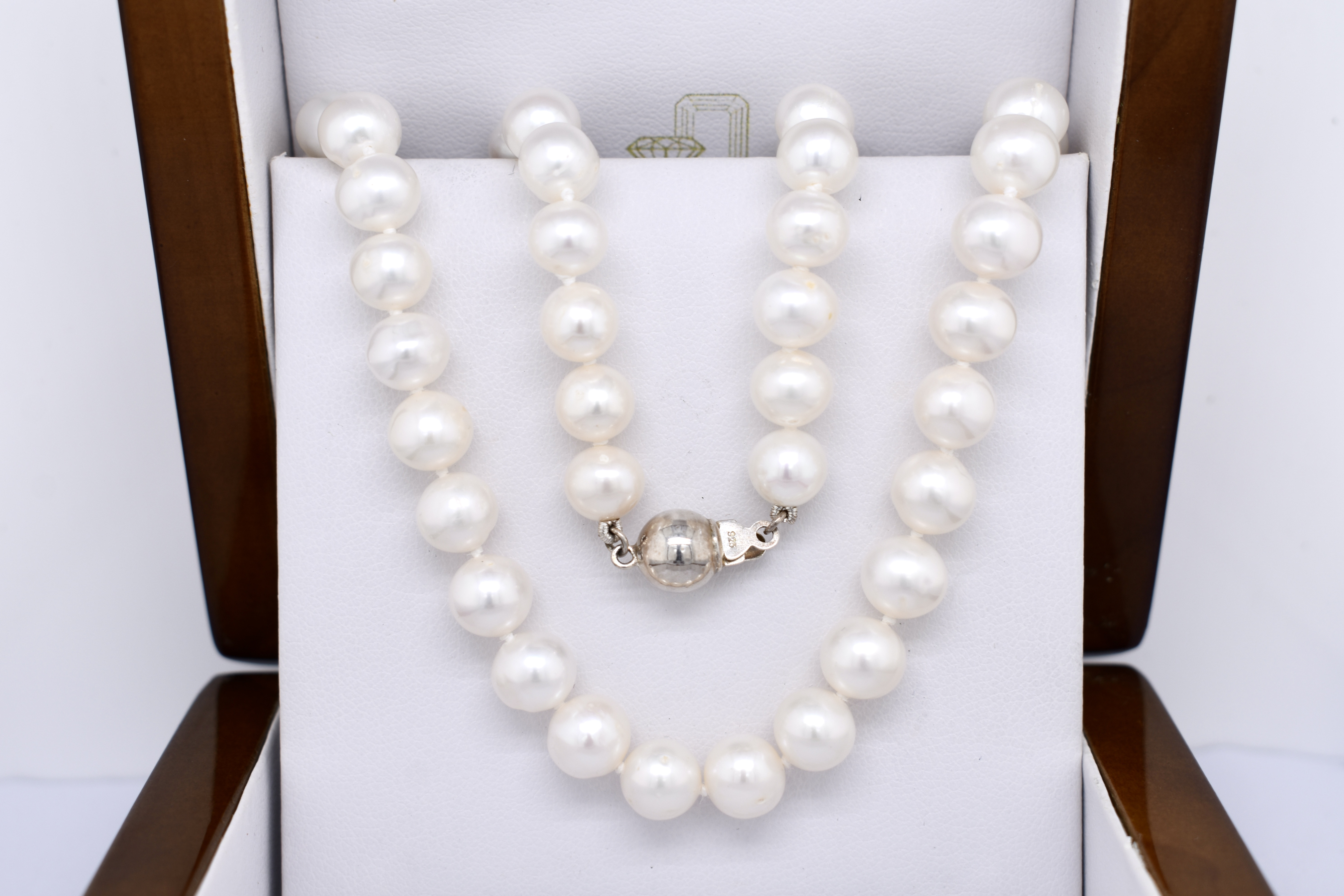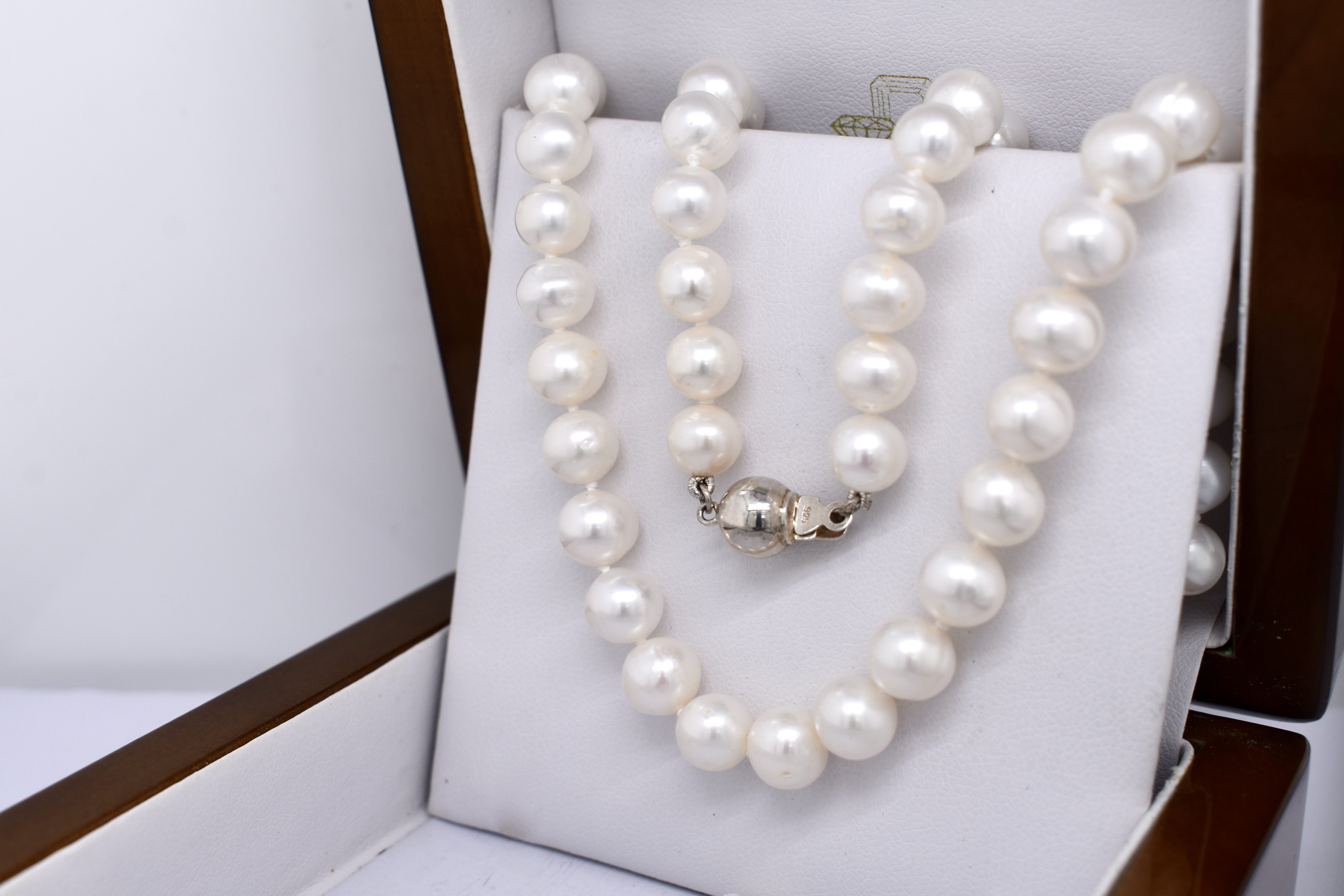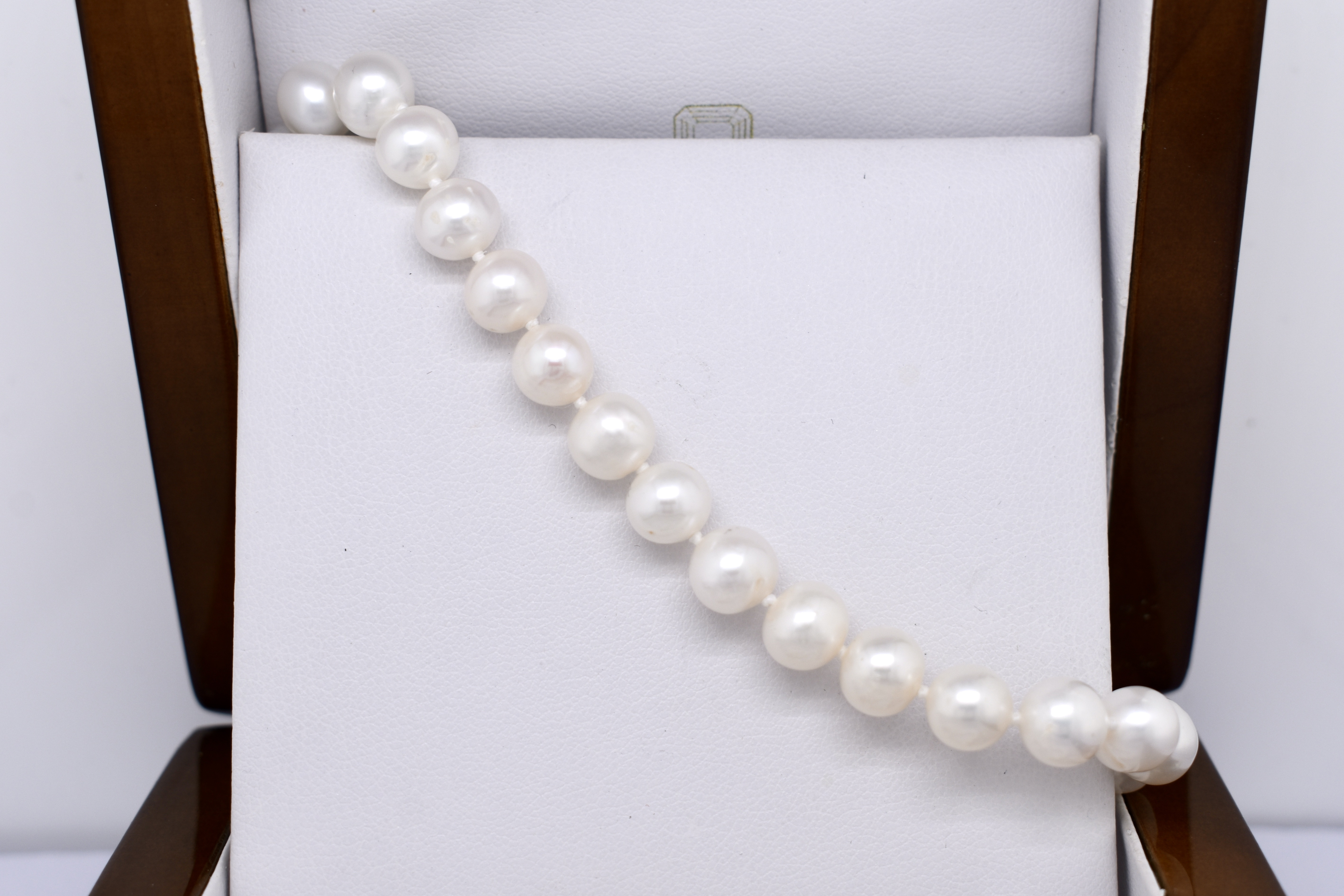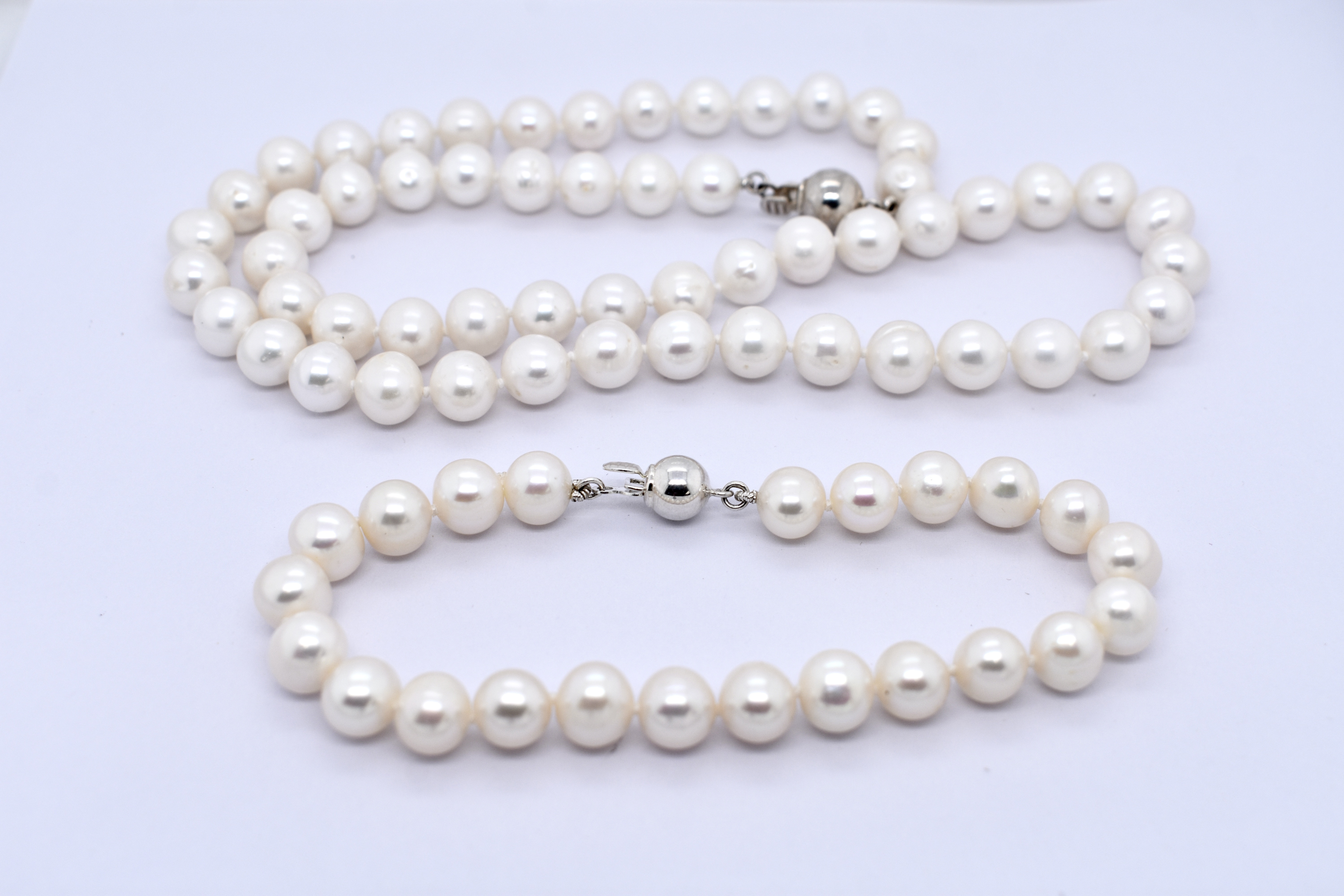 A pretty strand of white Freshwater pearls, measuring 7-8mm near round. The pearls have been hand strung on silk and individually knotted with a sterling silver ball clasp. Strand length 46cm. Complete the set with the matching bracelet: 20374860.
