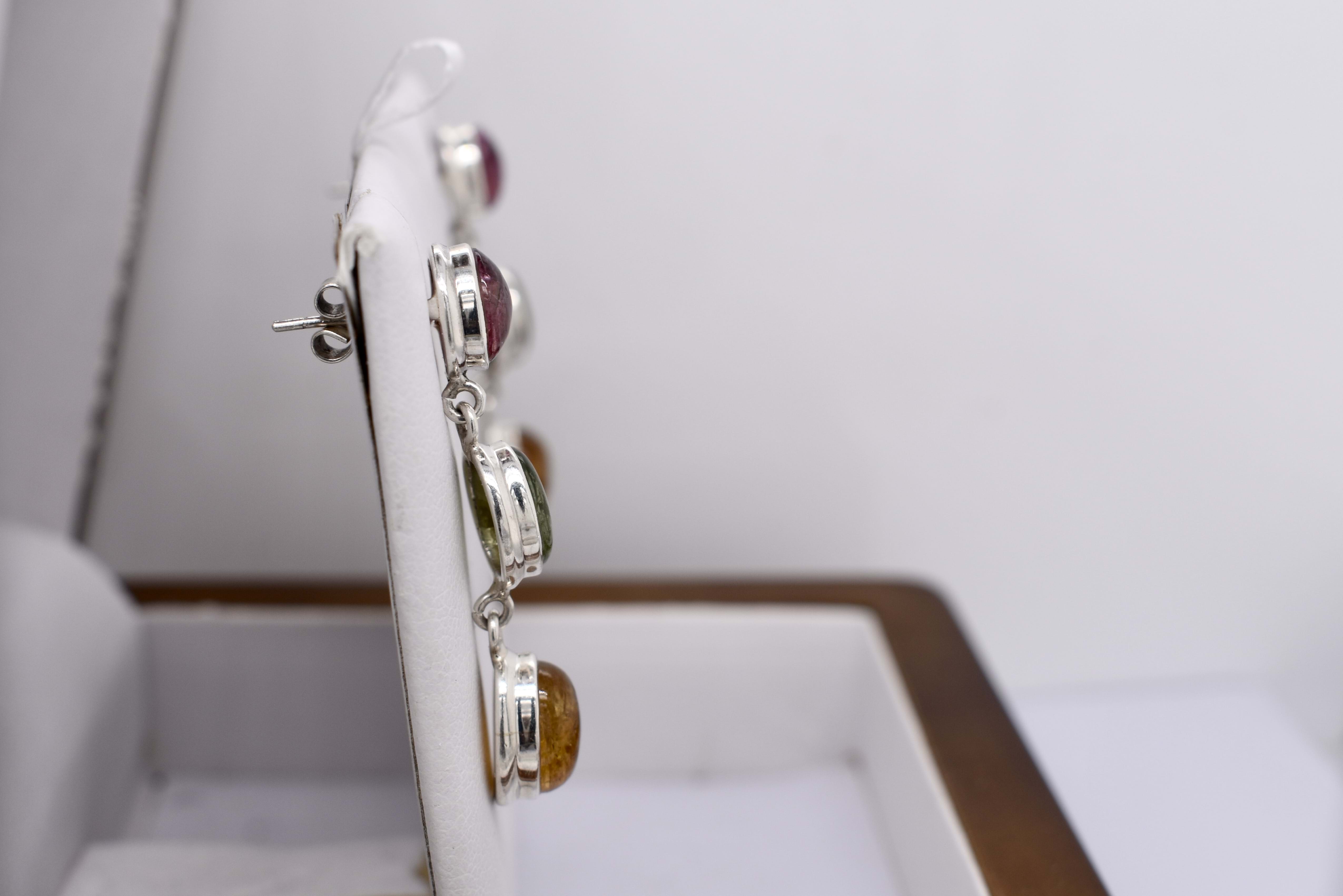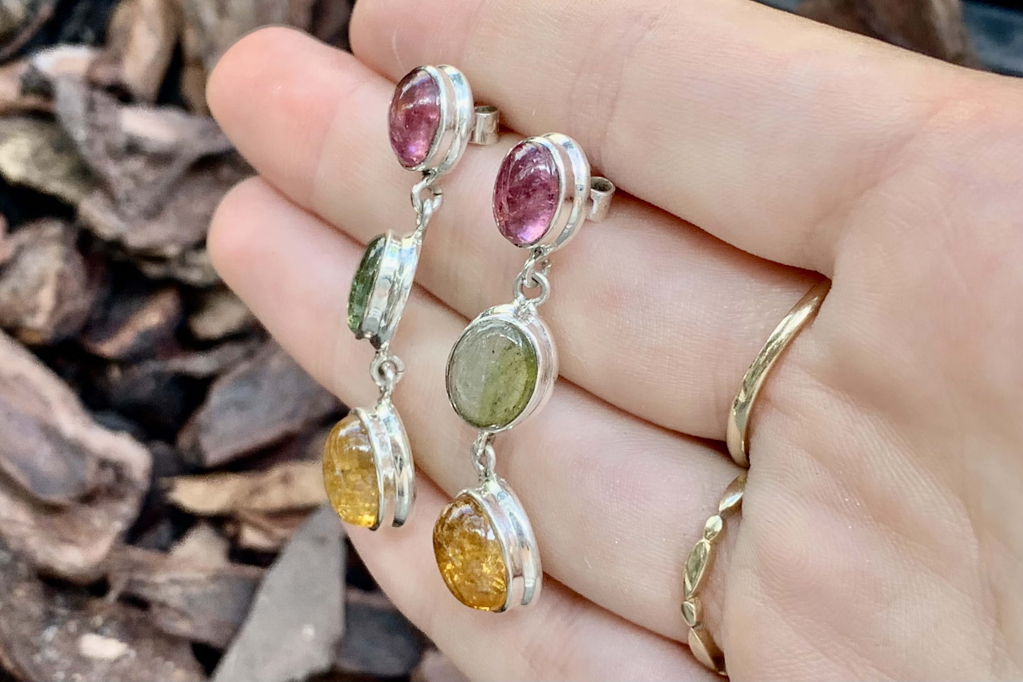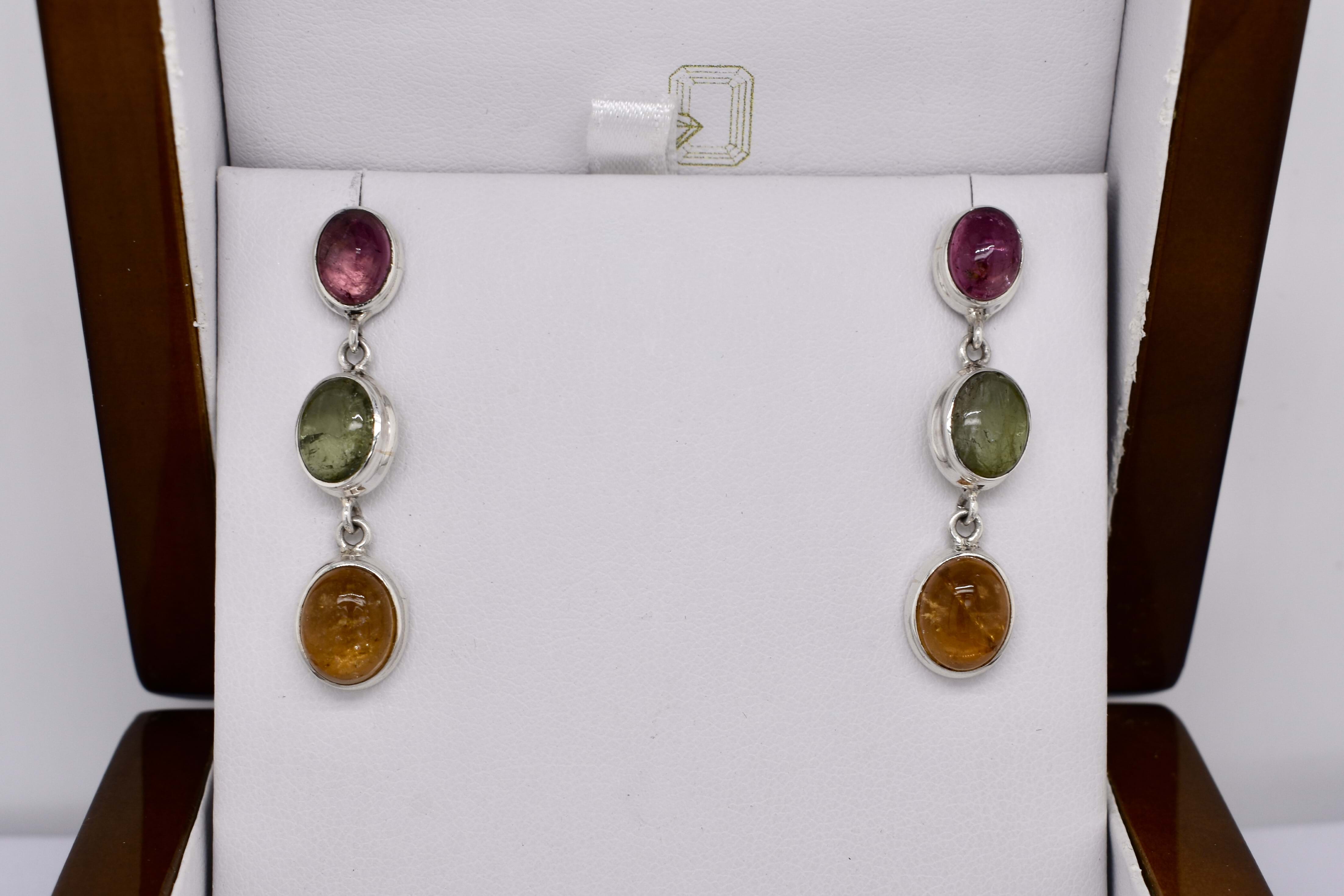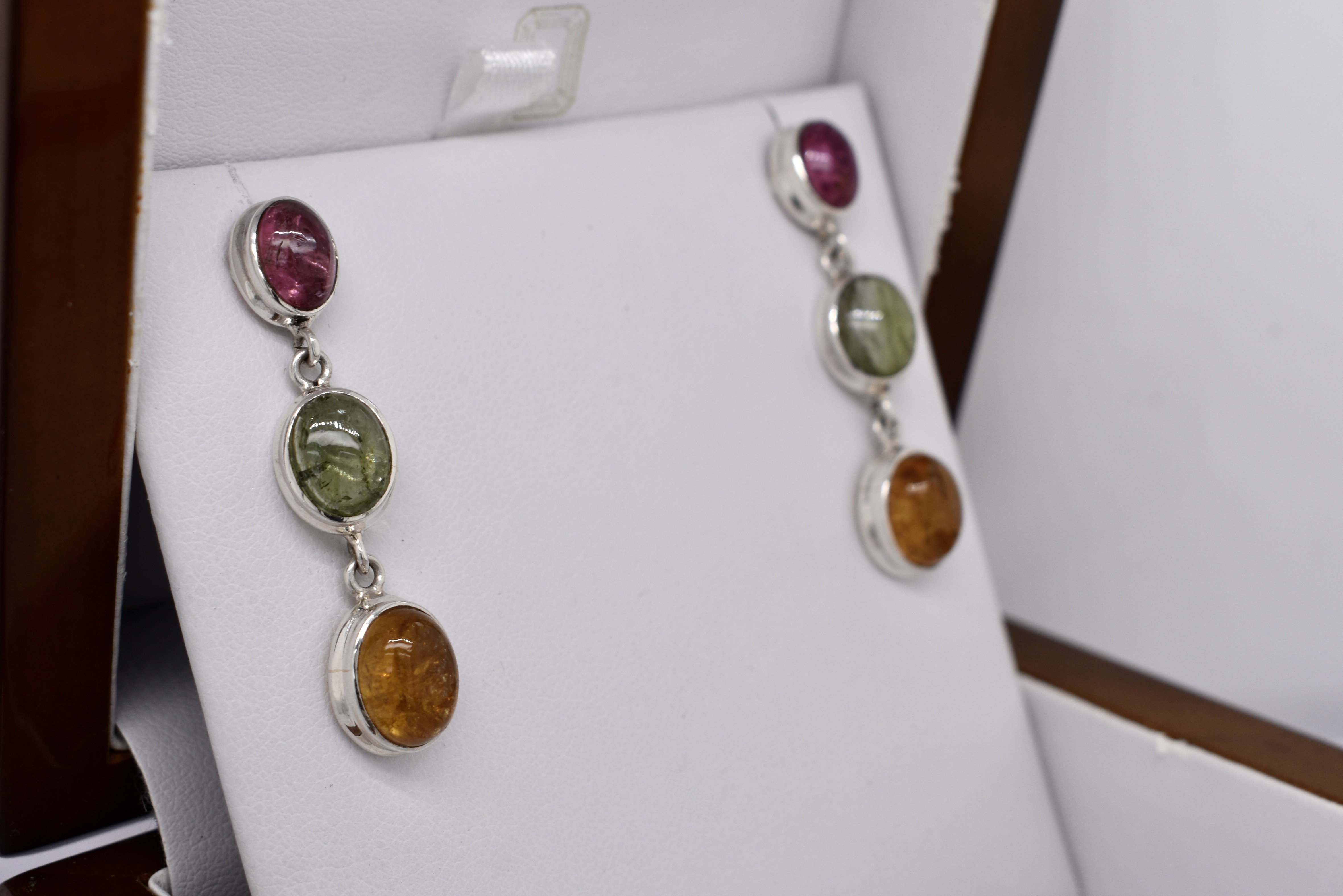 SOLD Sterling Silver Cabochon Pink, Green and Orange Tourmaline Triple Drop Earrings