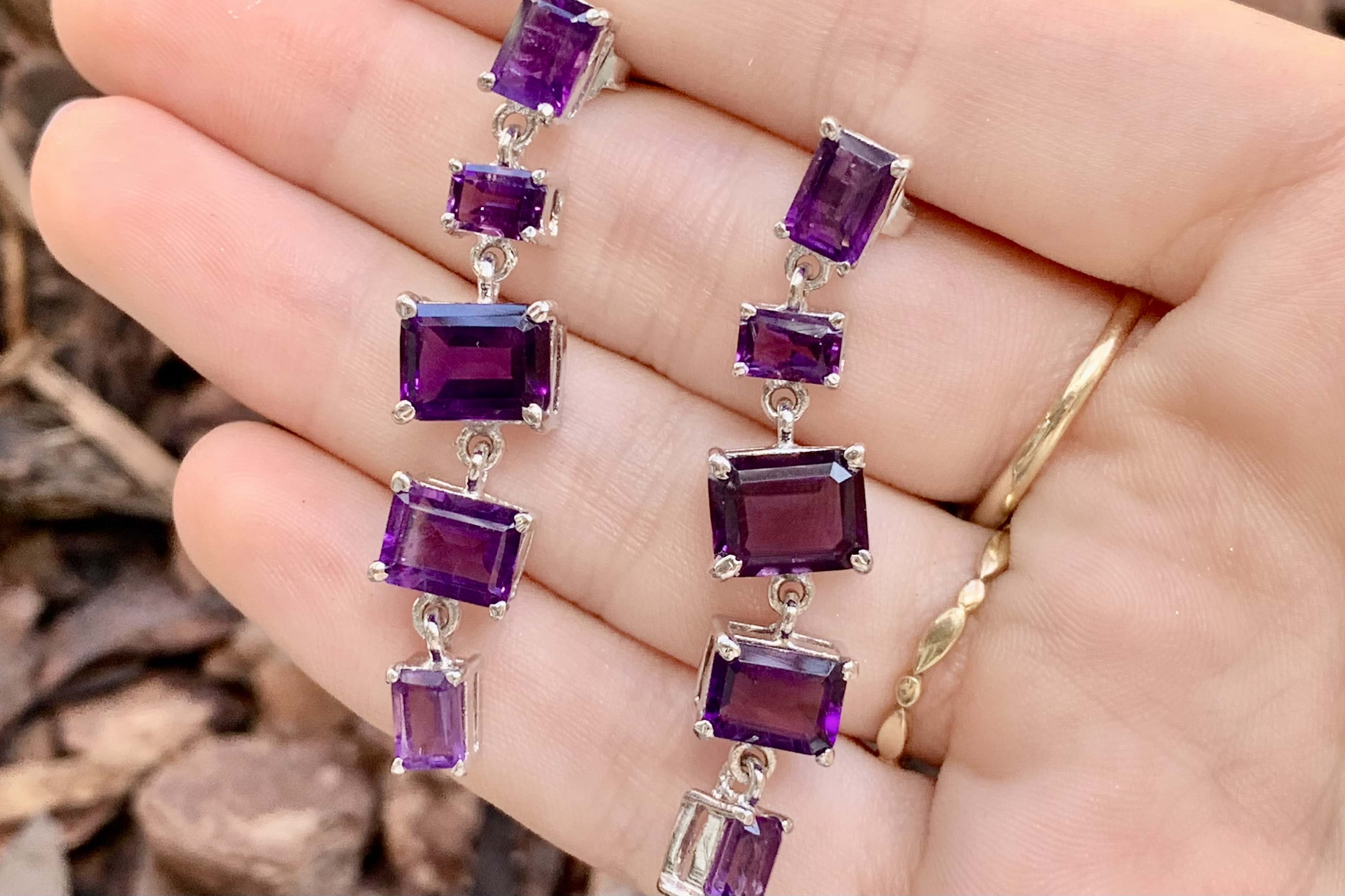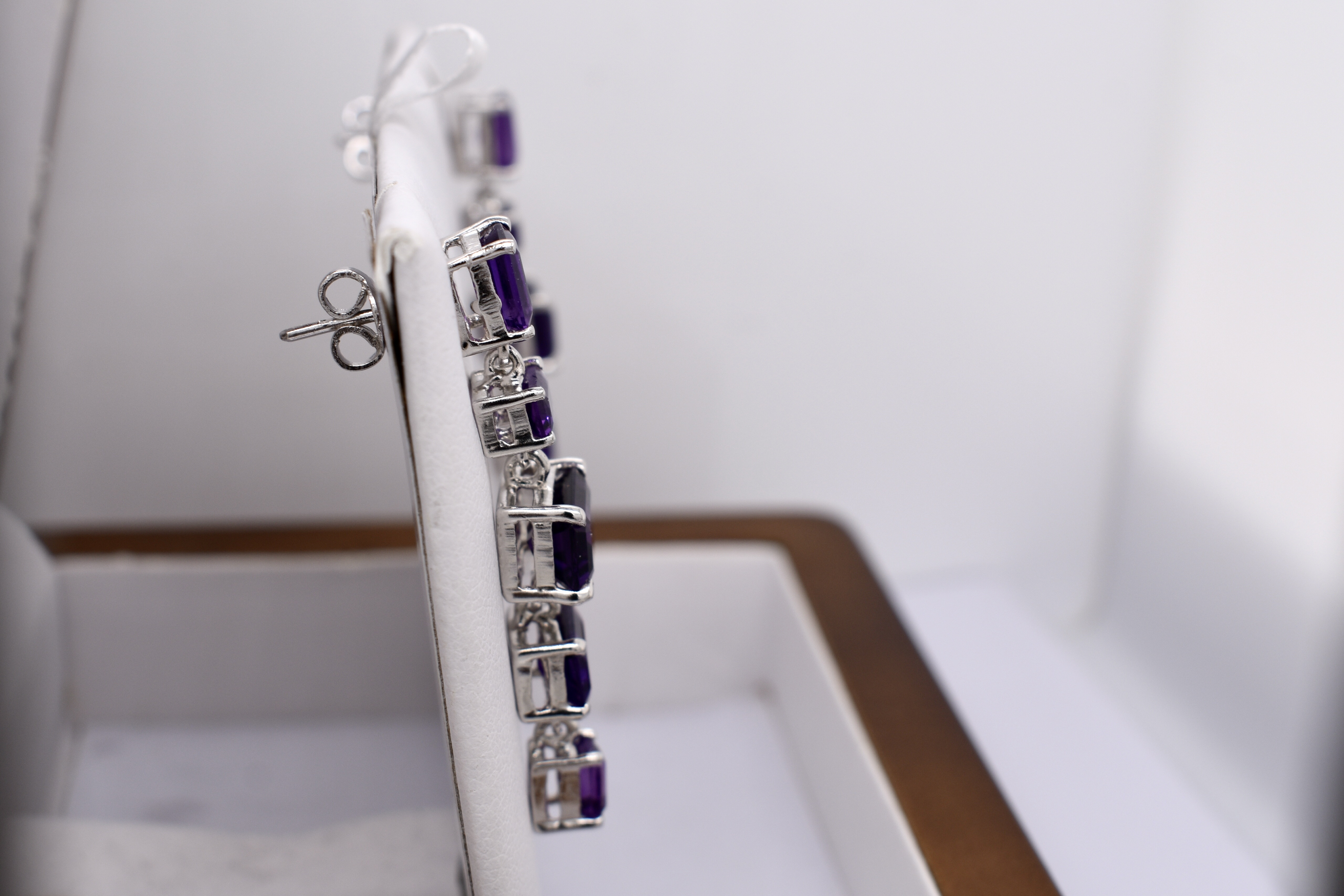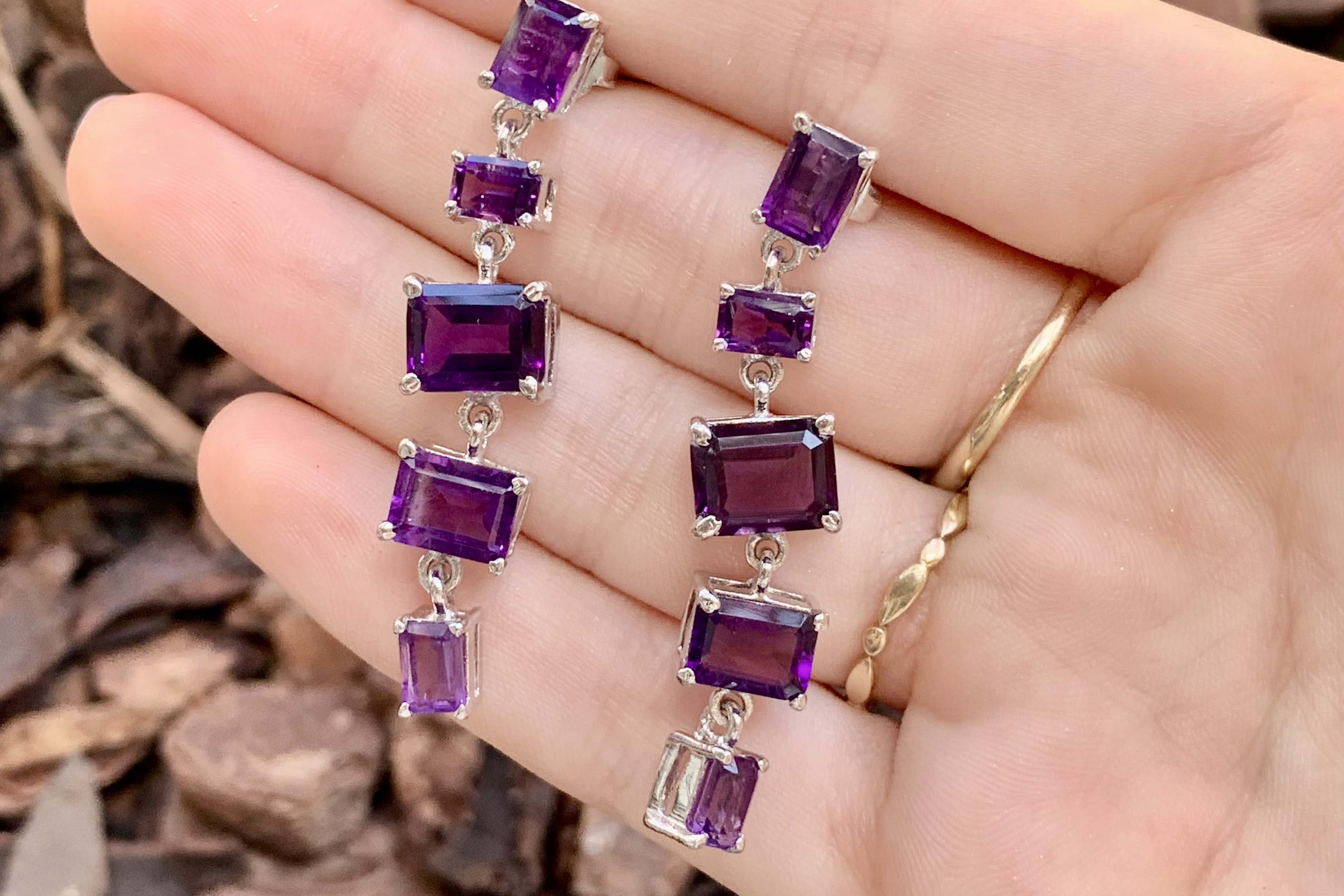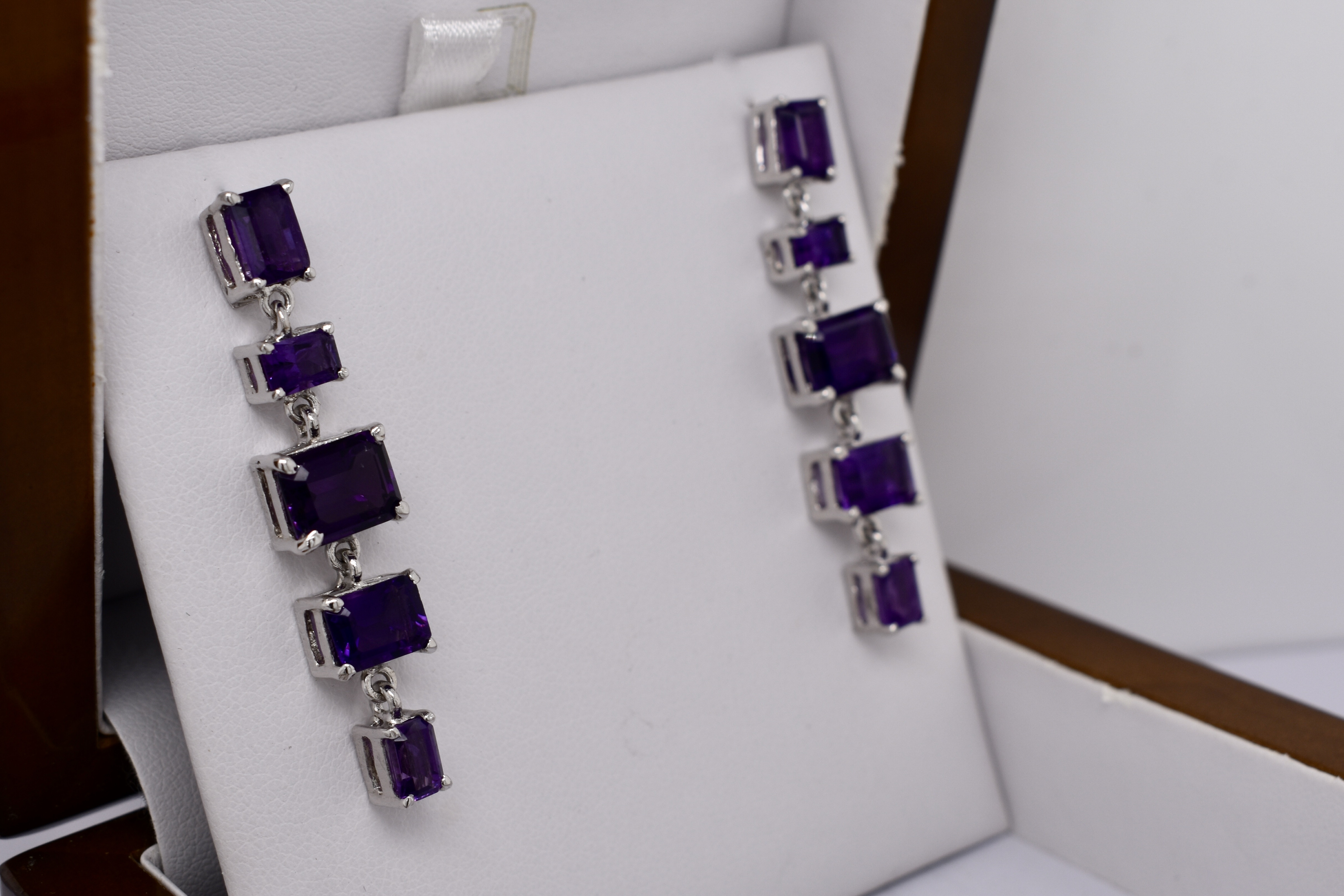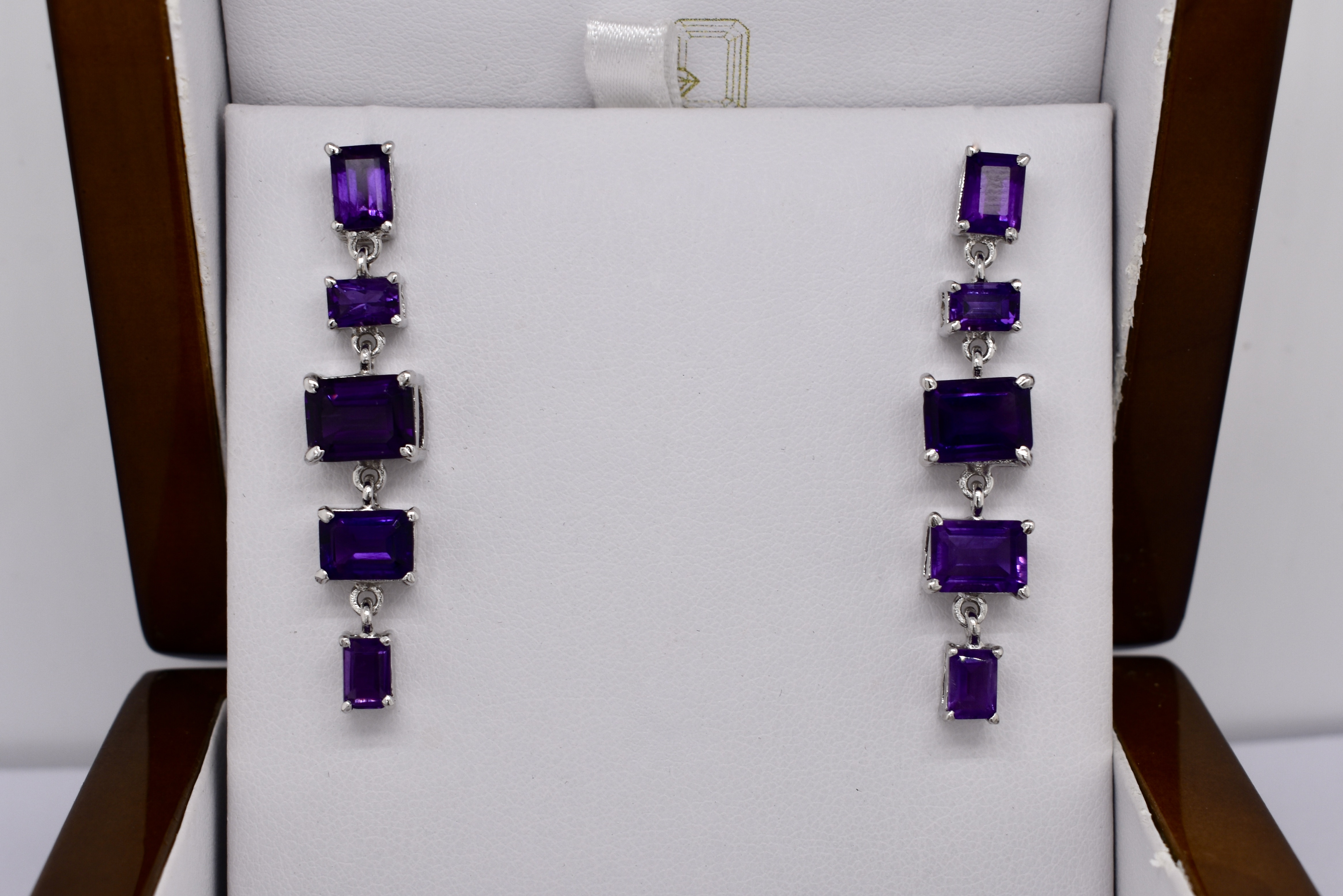 These wonderful sterling silver articulated drop earrings, feature 10 total emerald cut amethyst stones, ranging in size from 9-6mmx7-4mm. Four claw set vertically and horizontally in a linear drop, secure with a post and butterfly fitting.