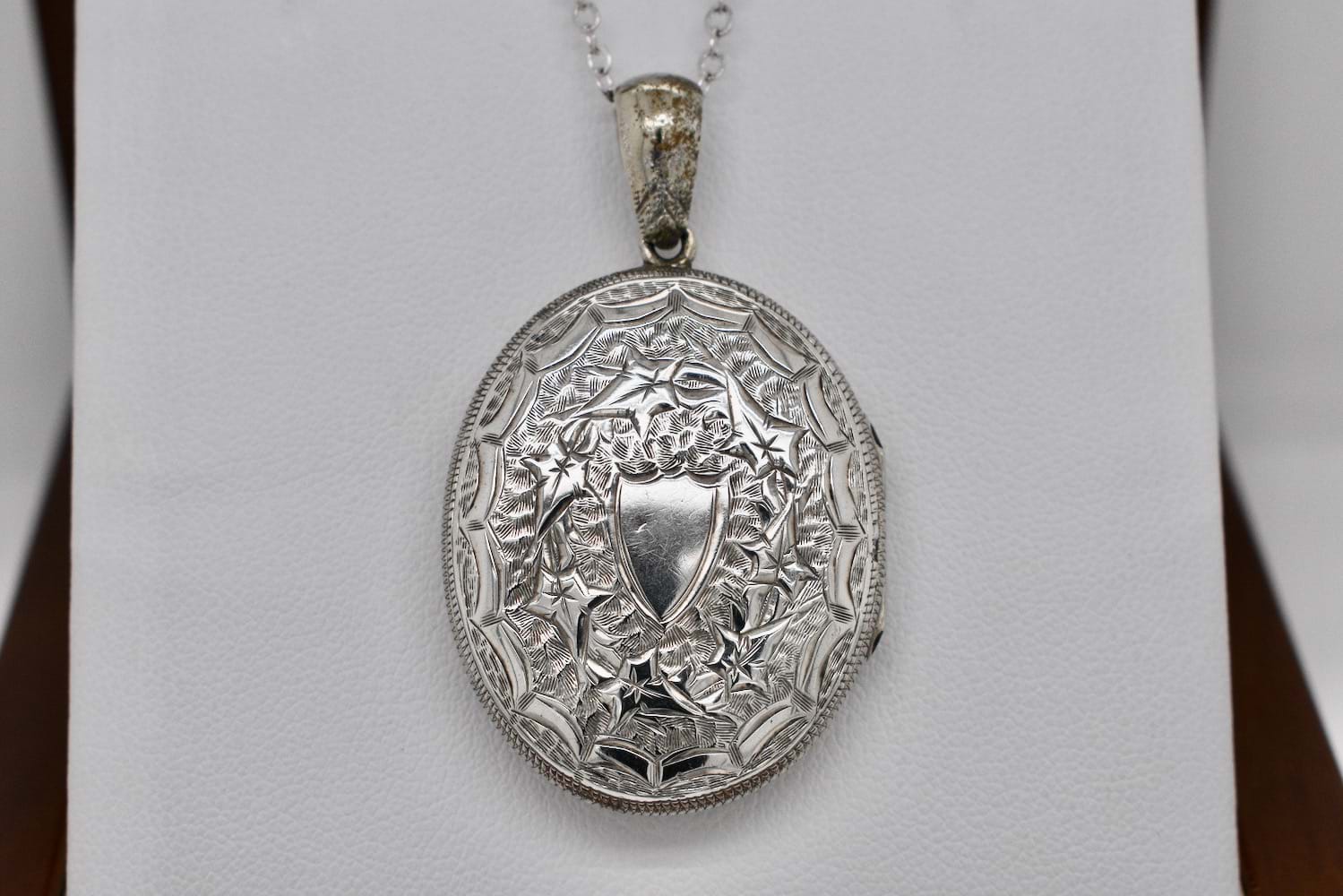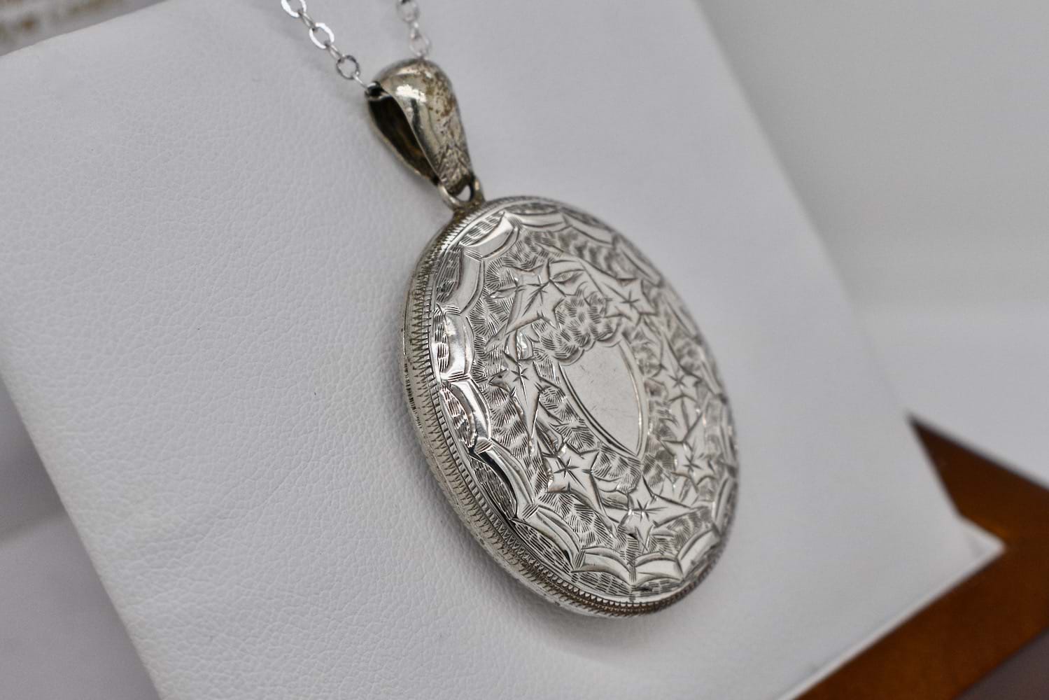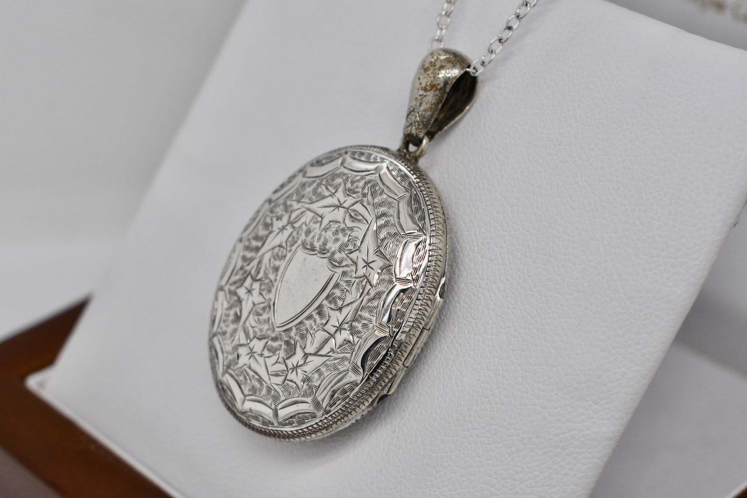 A striking large oval engraved locket crafted in sterling silver with a geometric pattern and a blank shield at the front. Dated circa 1950's. Chains available for separate purchase. Pendant measures approx 33x27x9mm