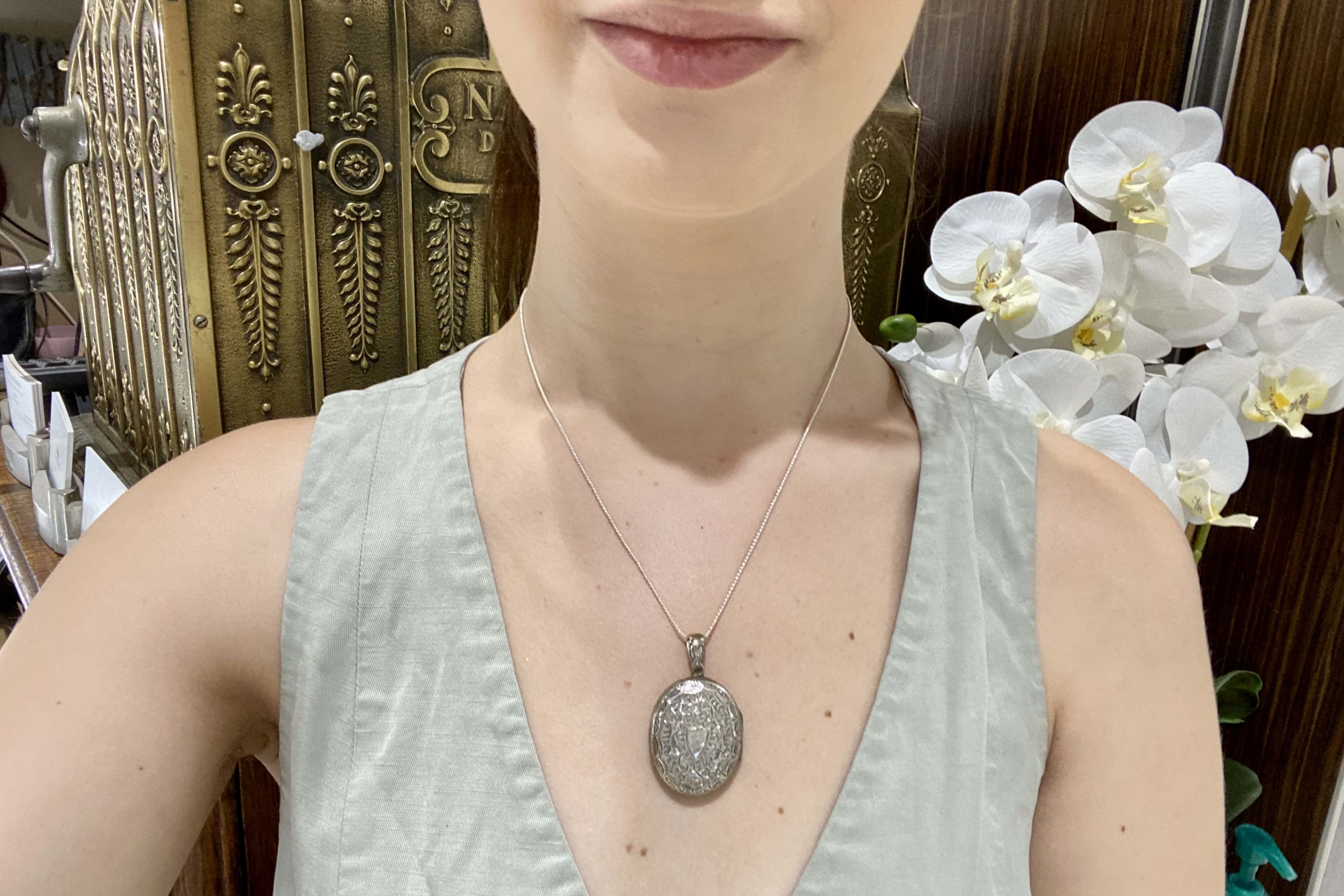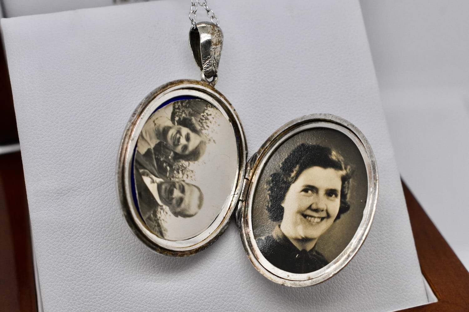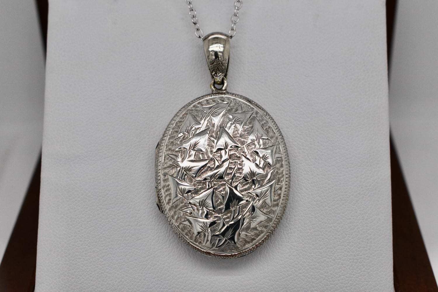A striking large oval engraved locket crafted in sterling silver with a geometric pattern and a blank shield at the front. Dated circa 1950's. Chains available for separate purchase. Pendant measures approx 33x27x9mm