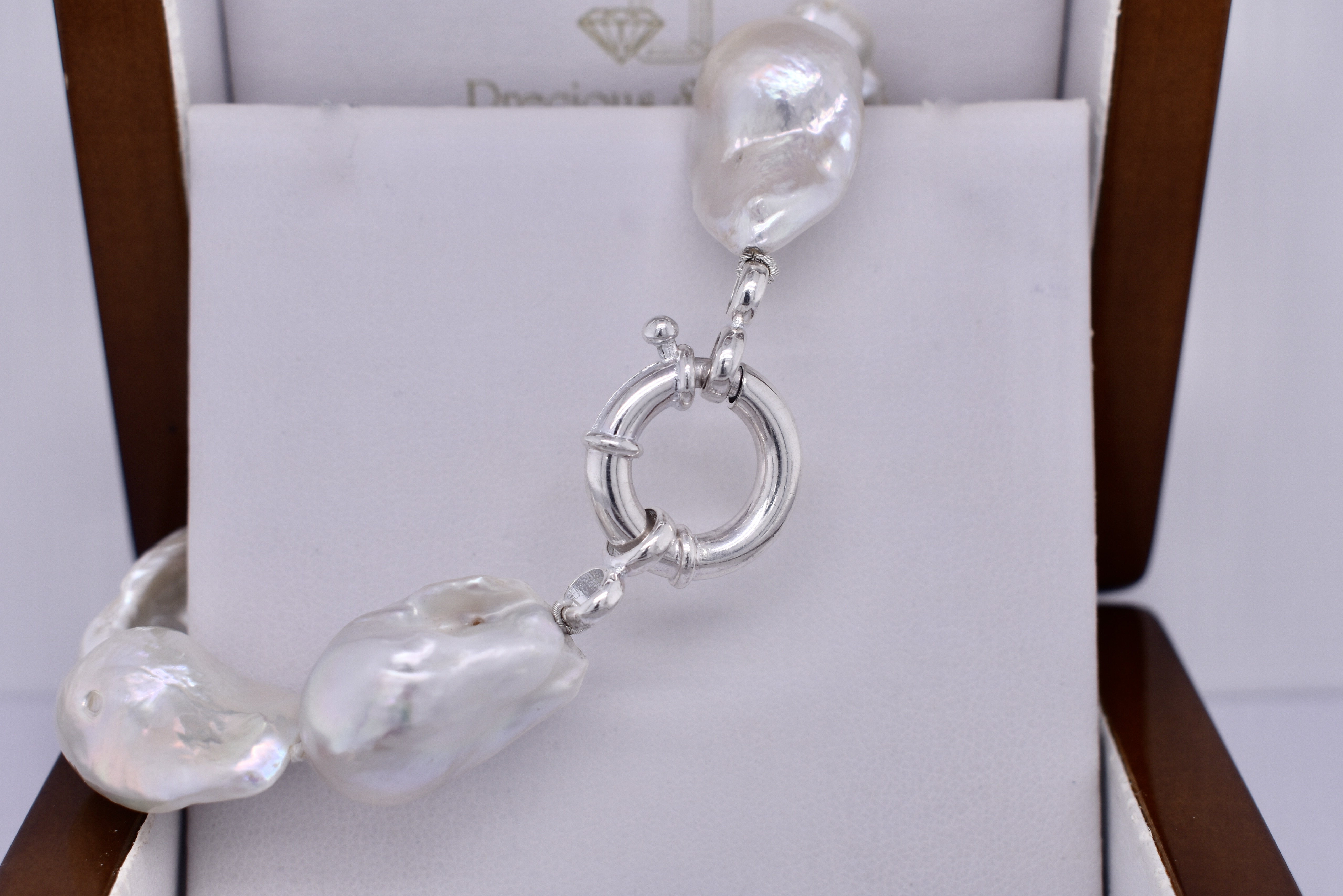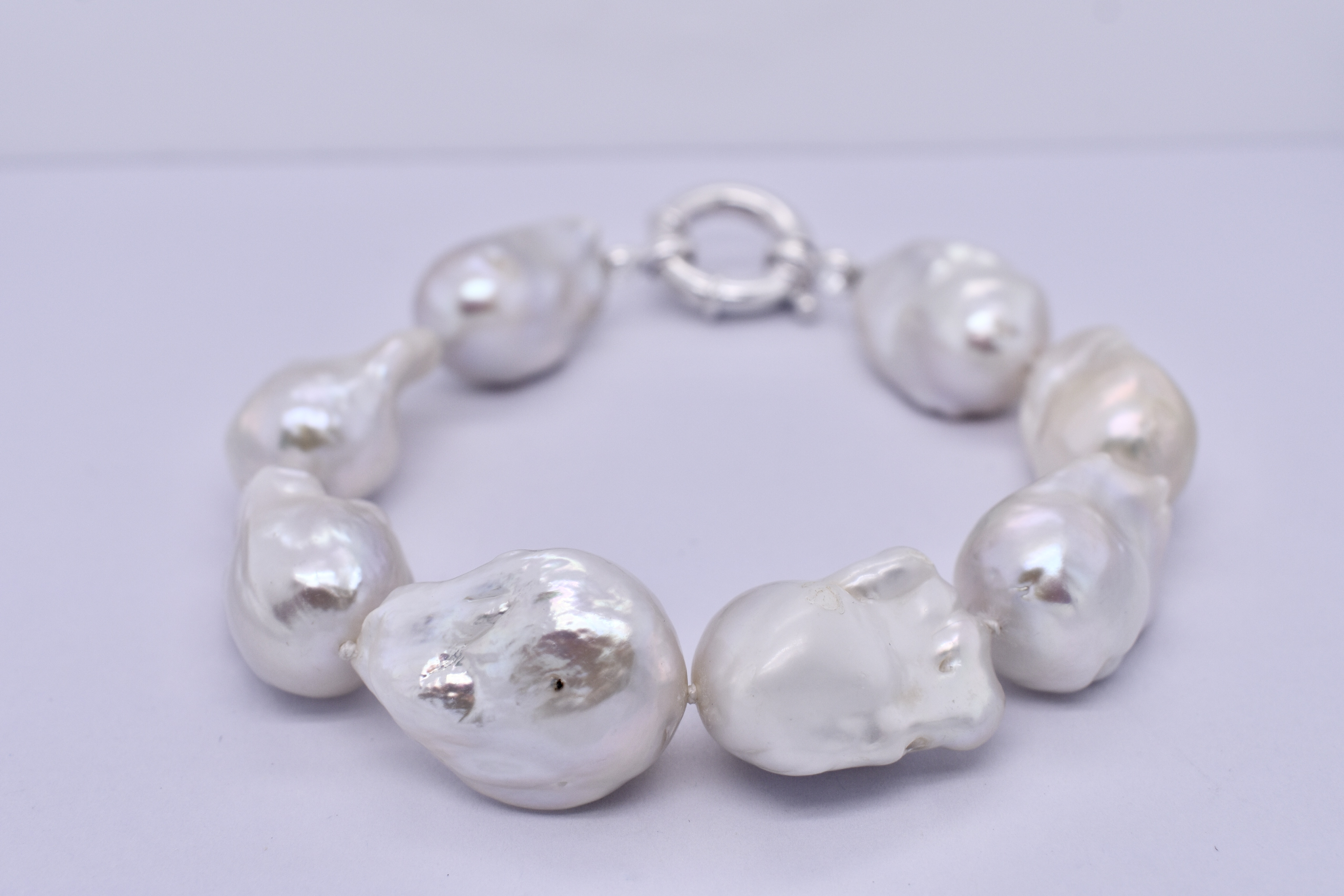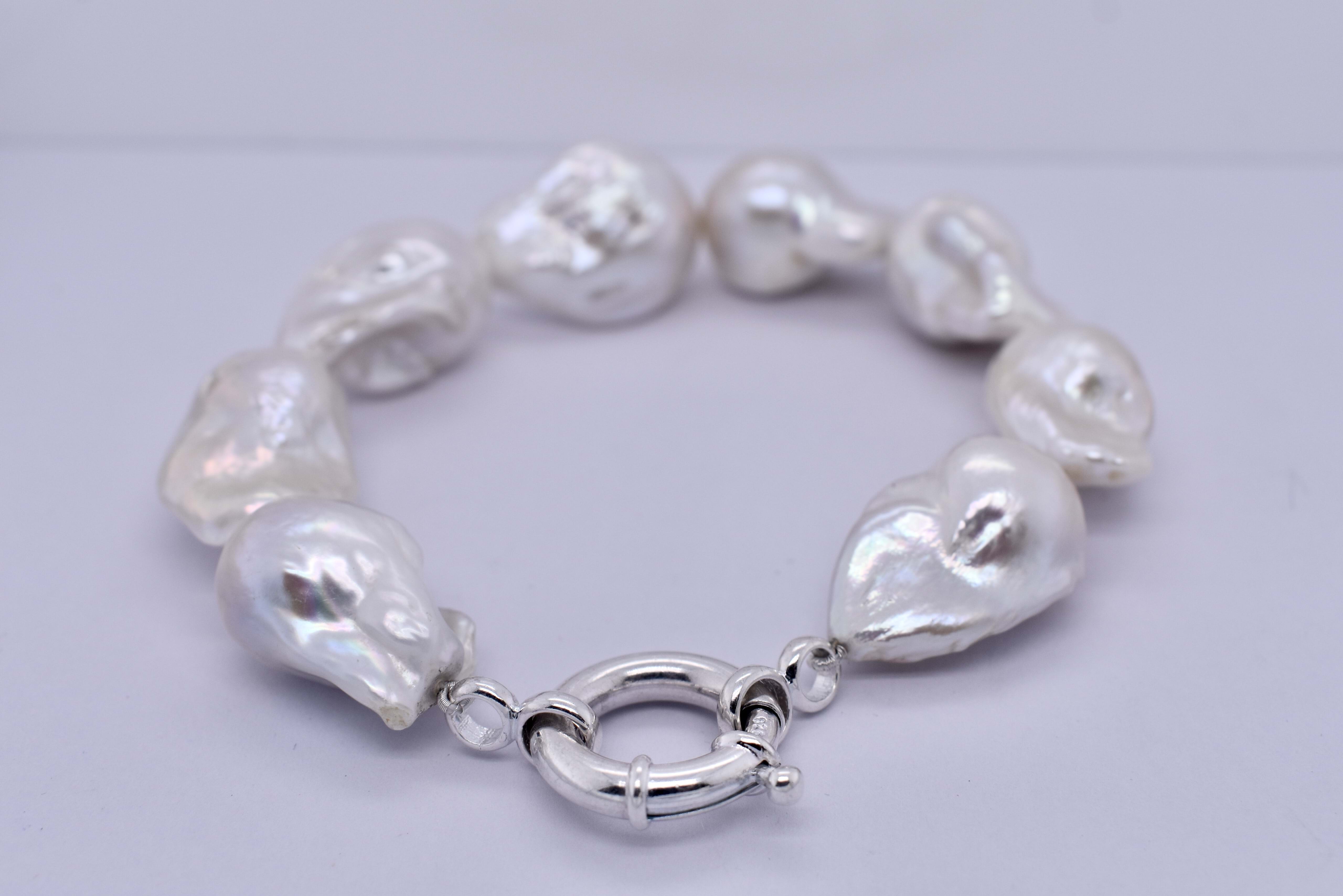 The cutest white freshwater pearl bracelet. Featuring 13-14mm white baroque pearls. This classic bracelet measures 23cm long and is finished with a sterling silver bolt ring clasp. Complete the set with the matching strand: 20380373.