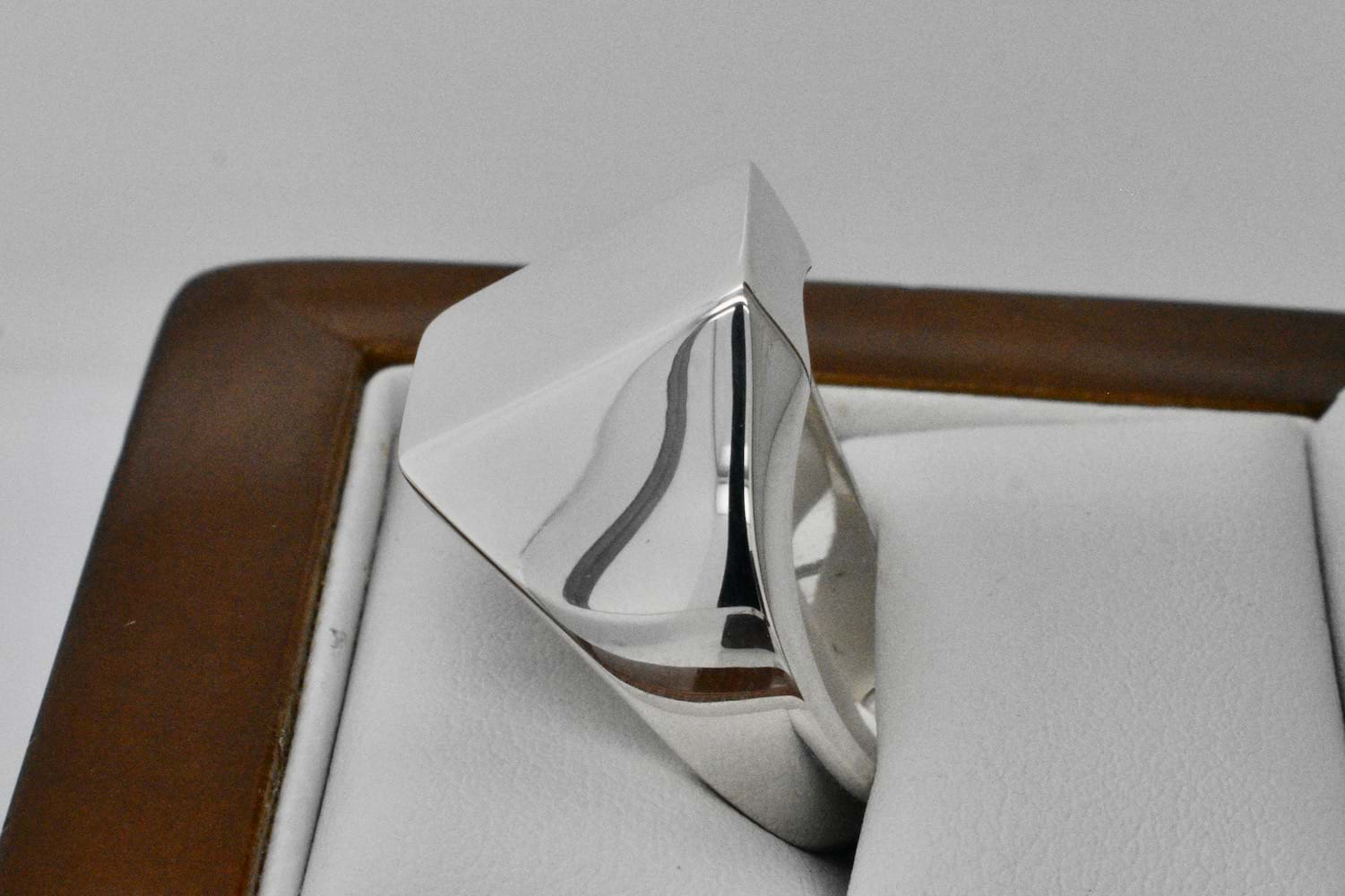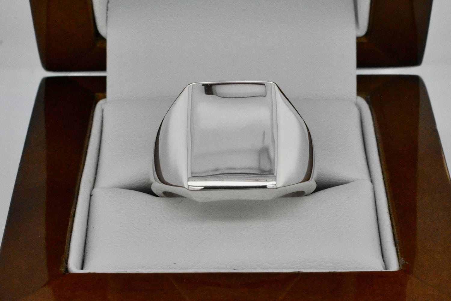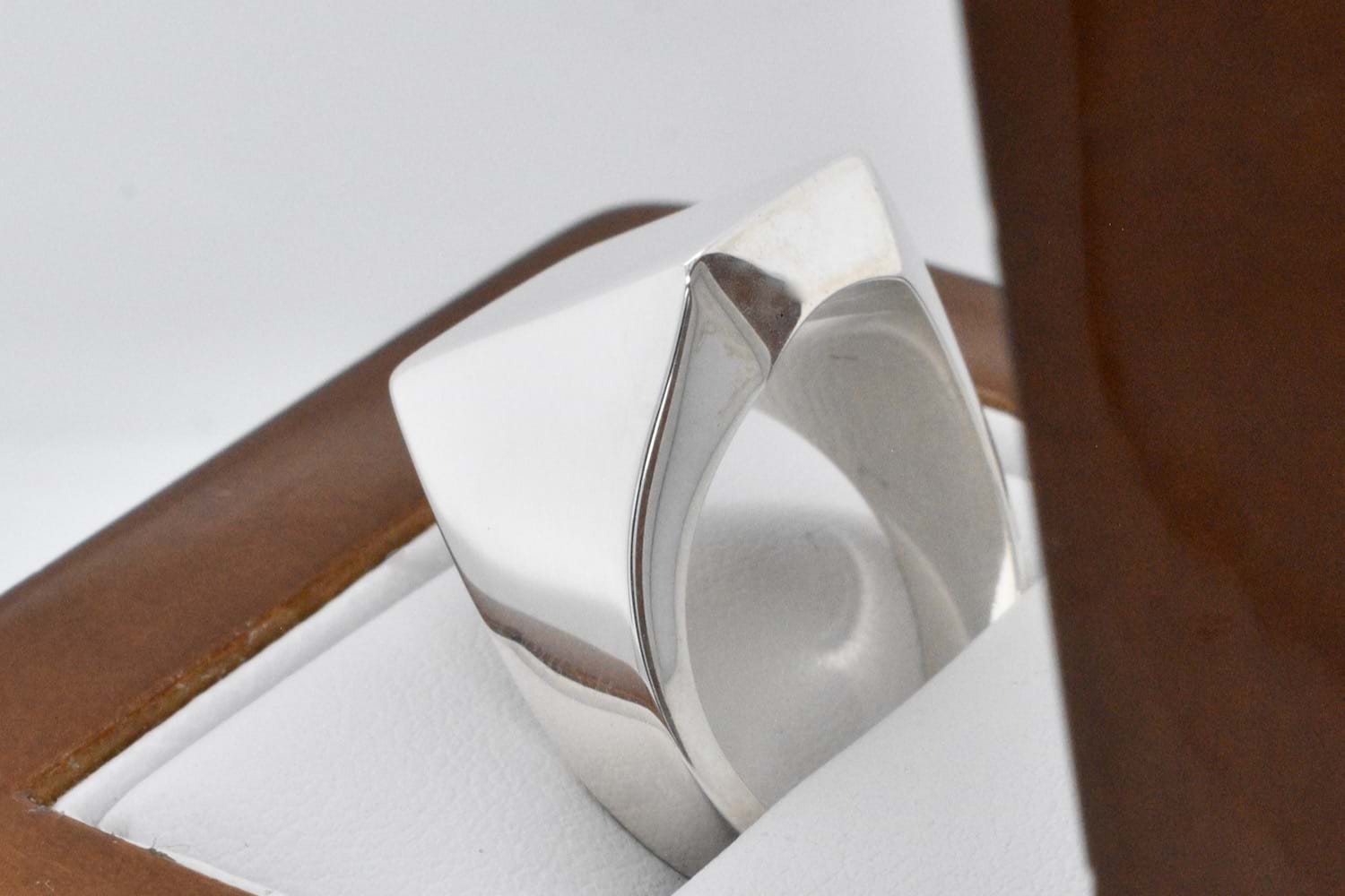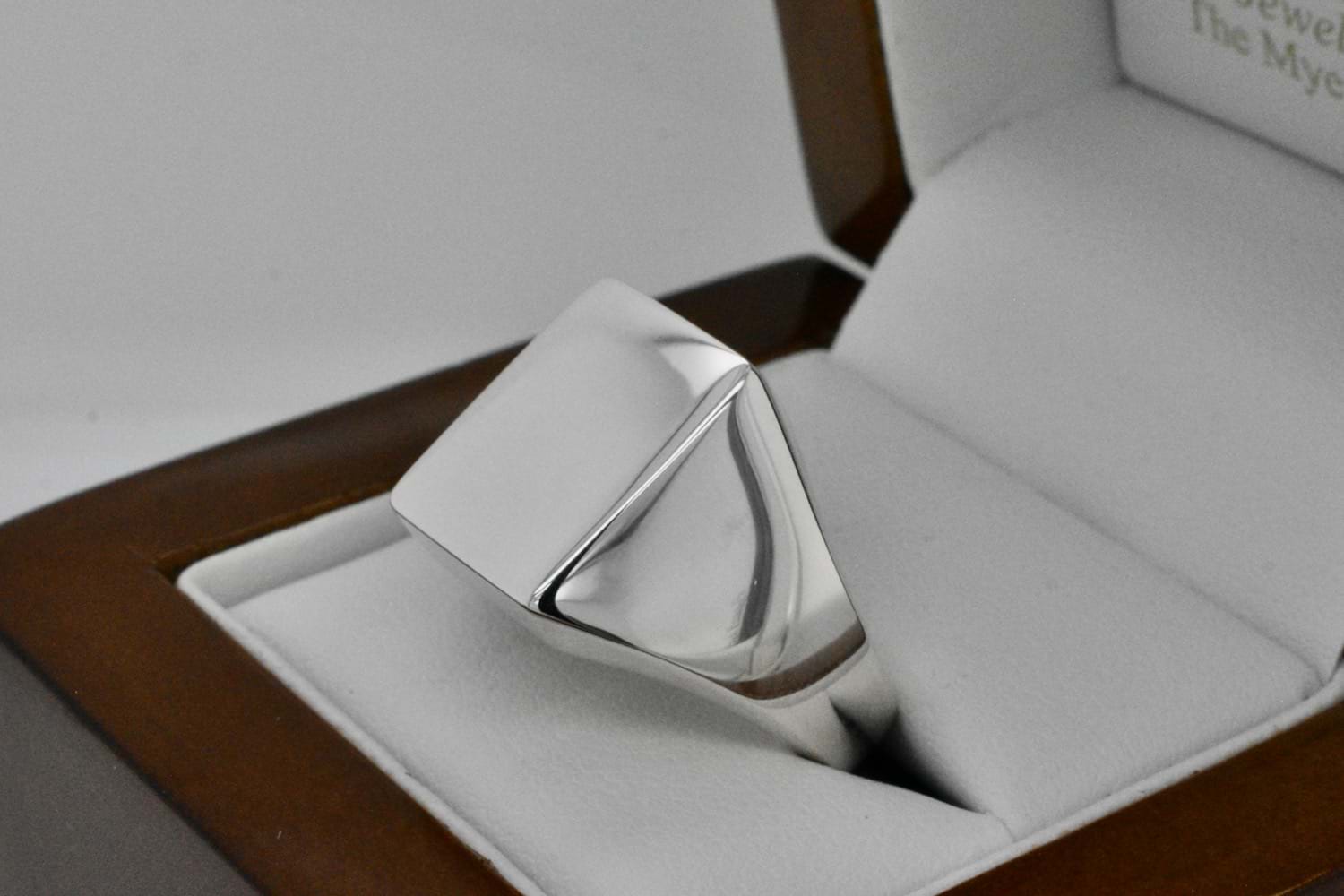 A classic, hollow sterling silver signet ring with a generously sized rectangular top measuring approximately 14 x 10mm. The ring has a tapered band and engraving can be considered for further personalisation. Finger size T
