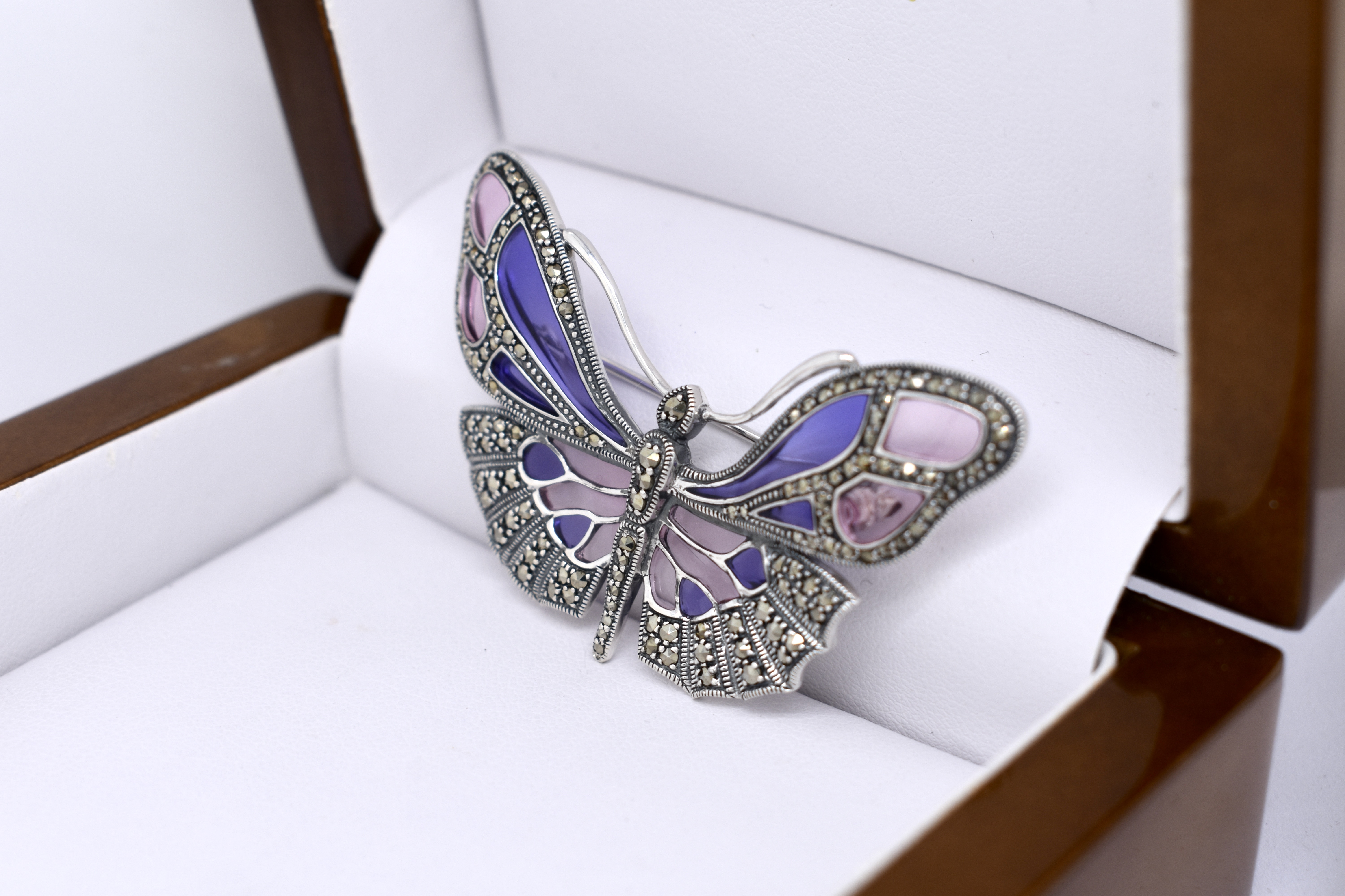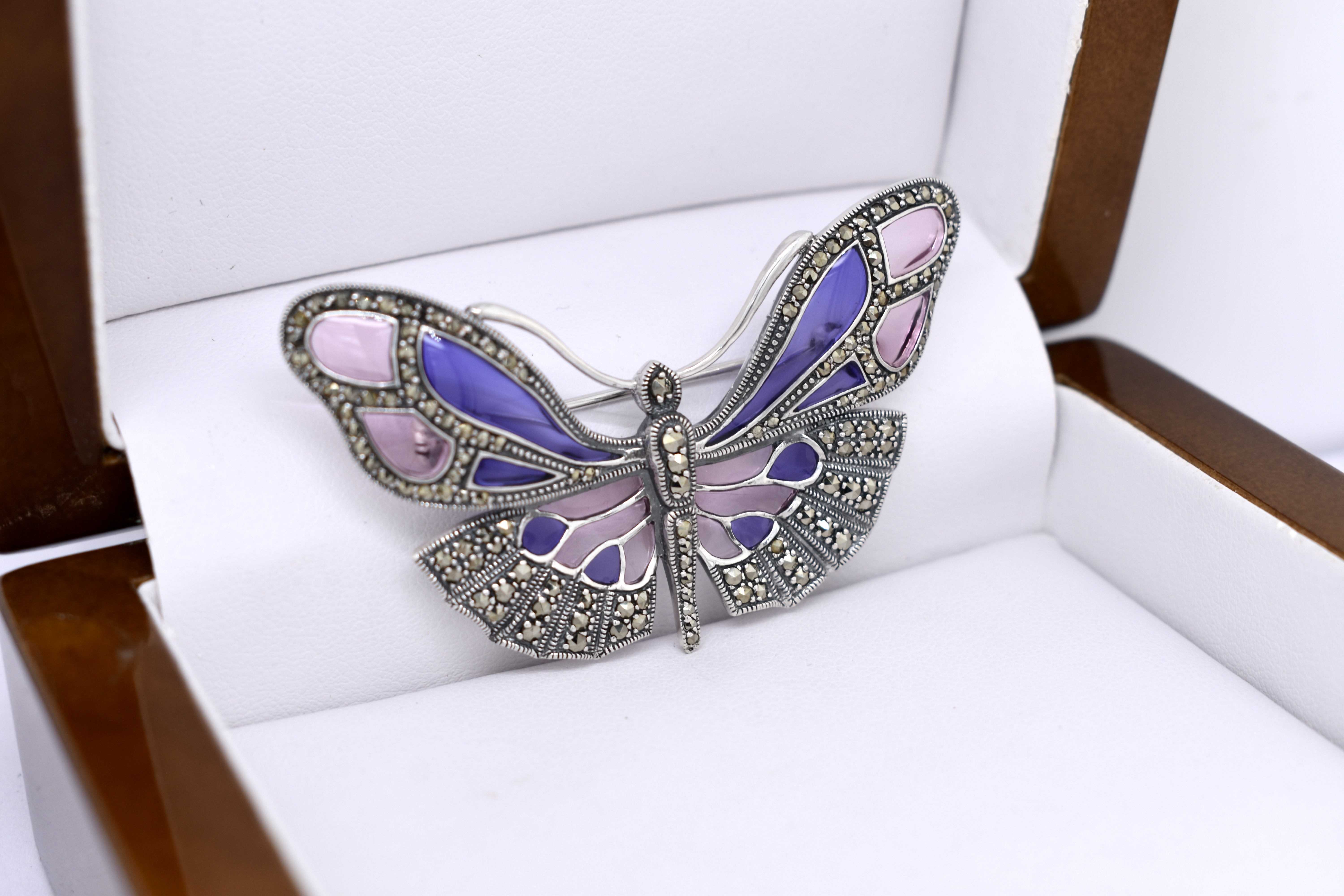 This beautiful butterfly brooch is crafted in sterling silver and features pink and purple/blue enamel wings. The body and wings are detailed with marcasites.