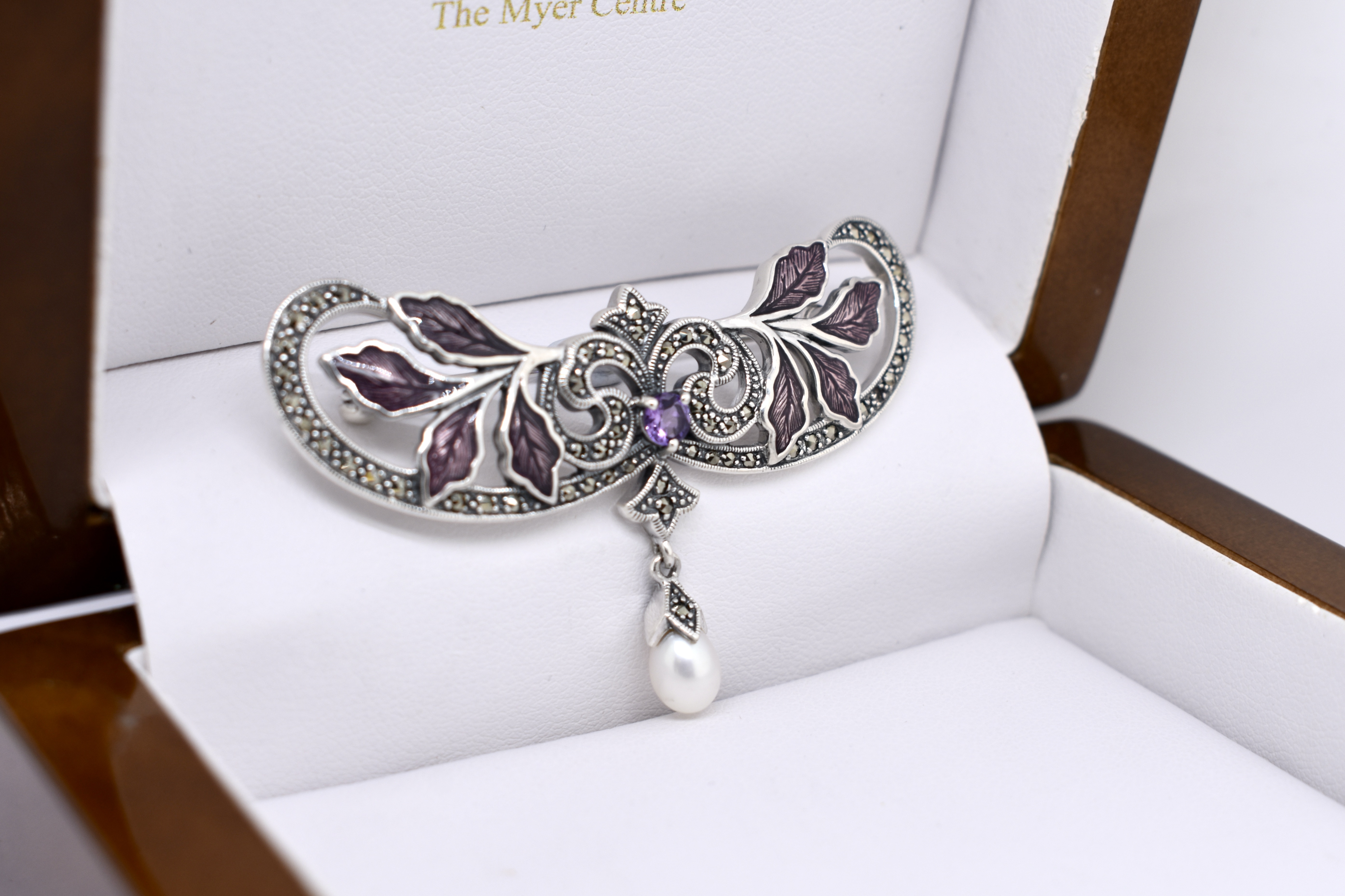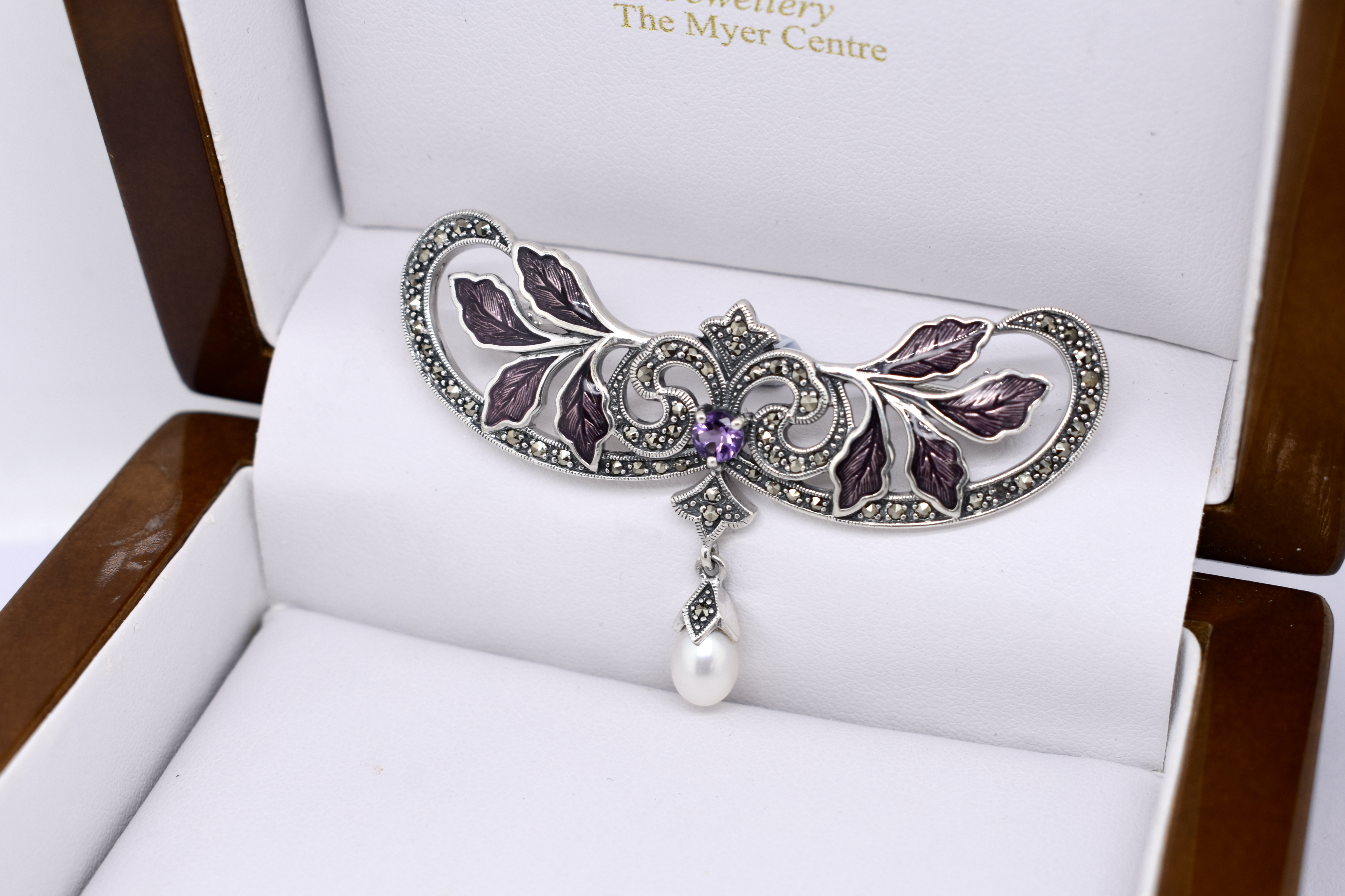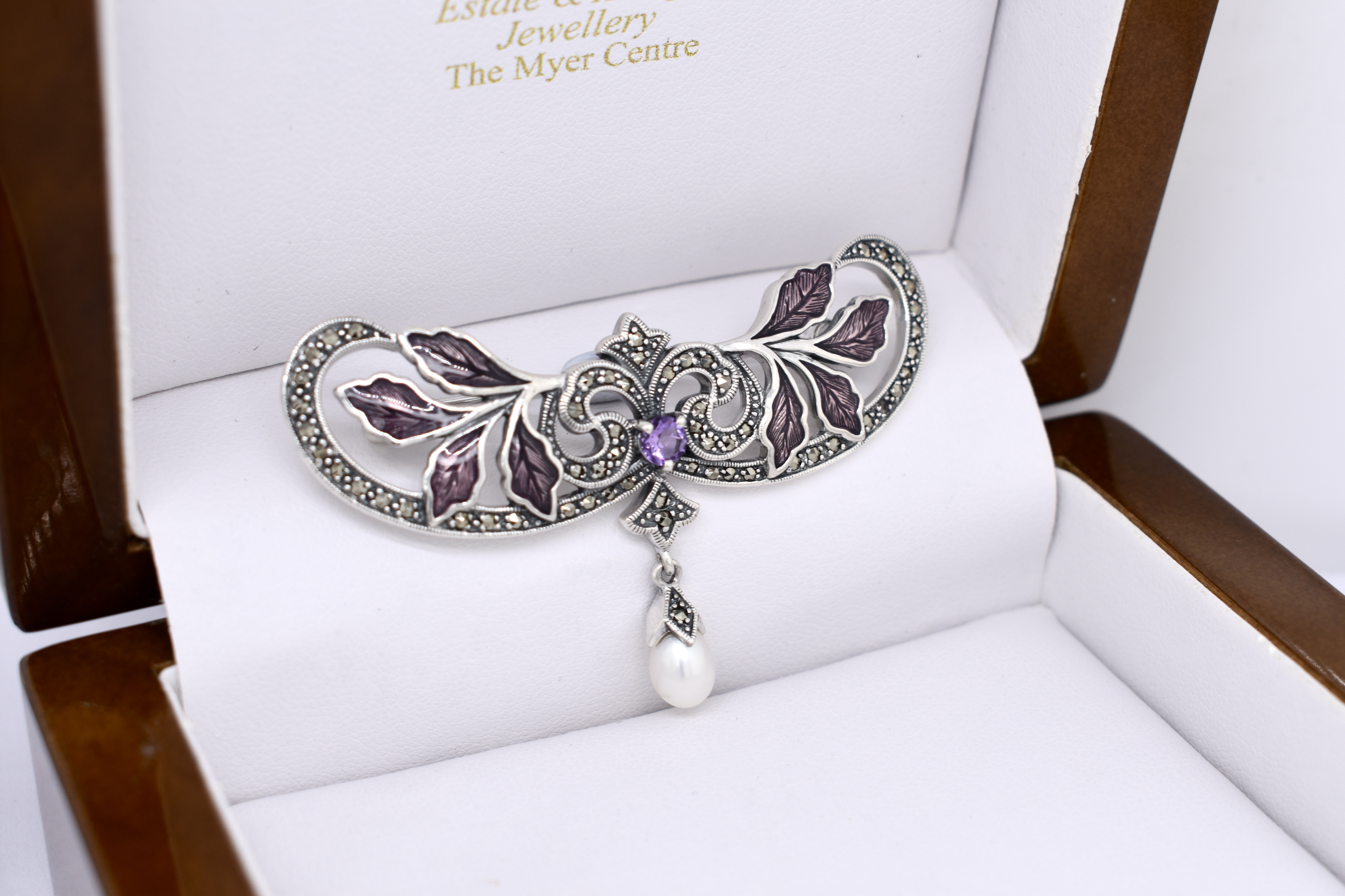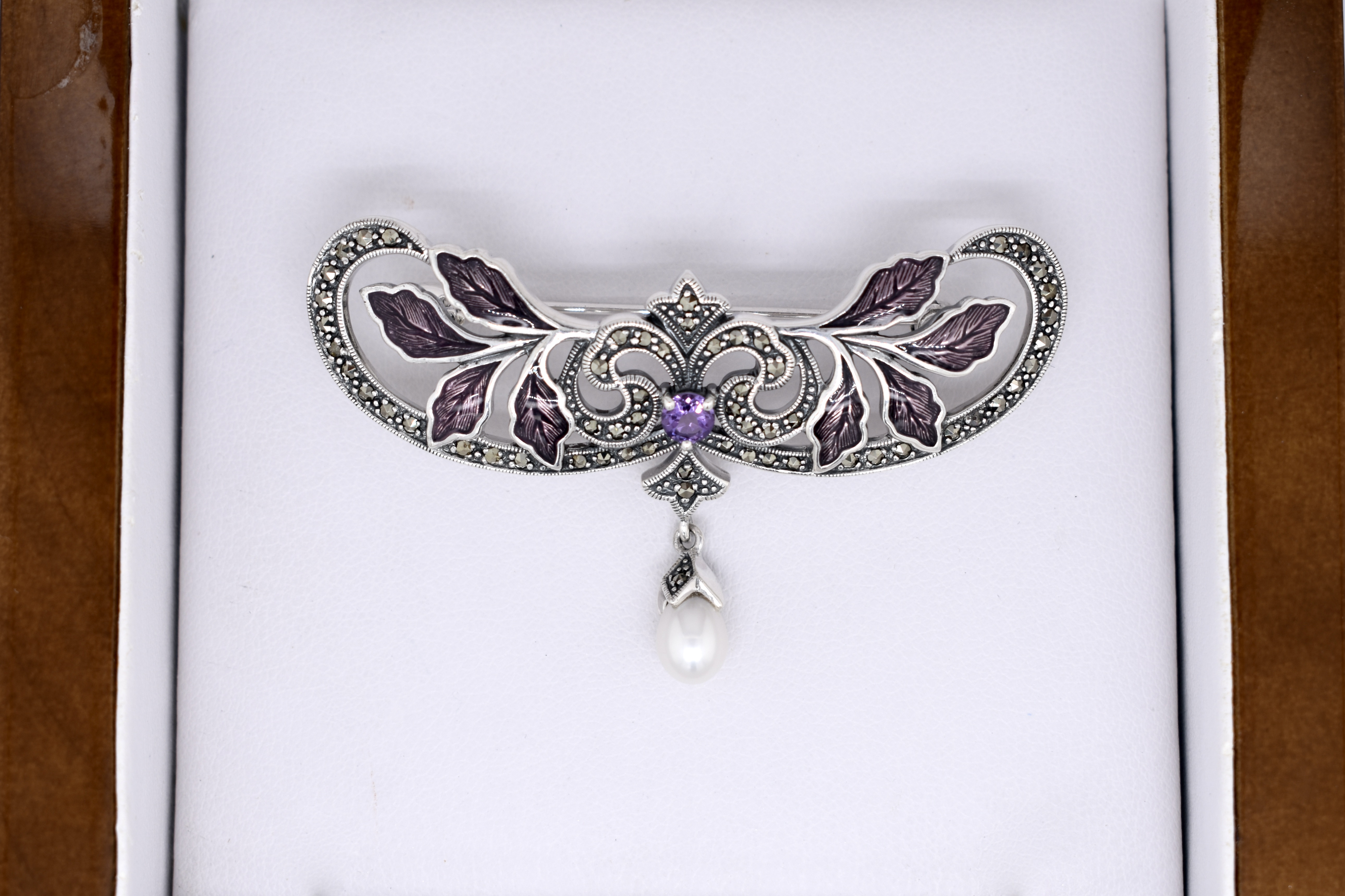 Crafted in sterling silver this stunning art nouveau inspired brooch features a leafy floral design set with marcasites, amethyst and enamel. Complete with a white pearl suspended from the bottom.