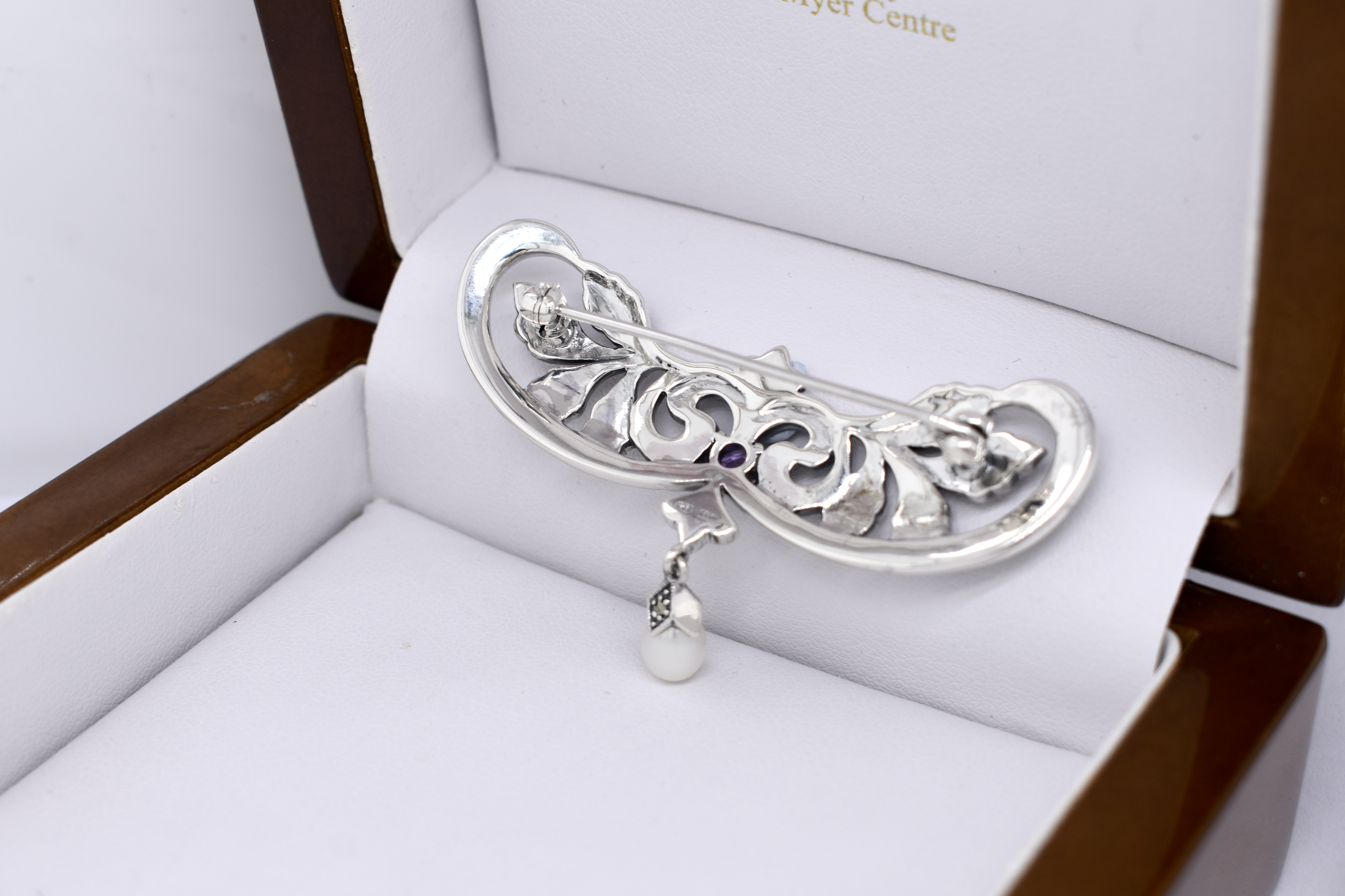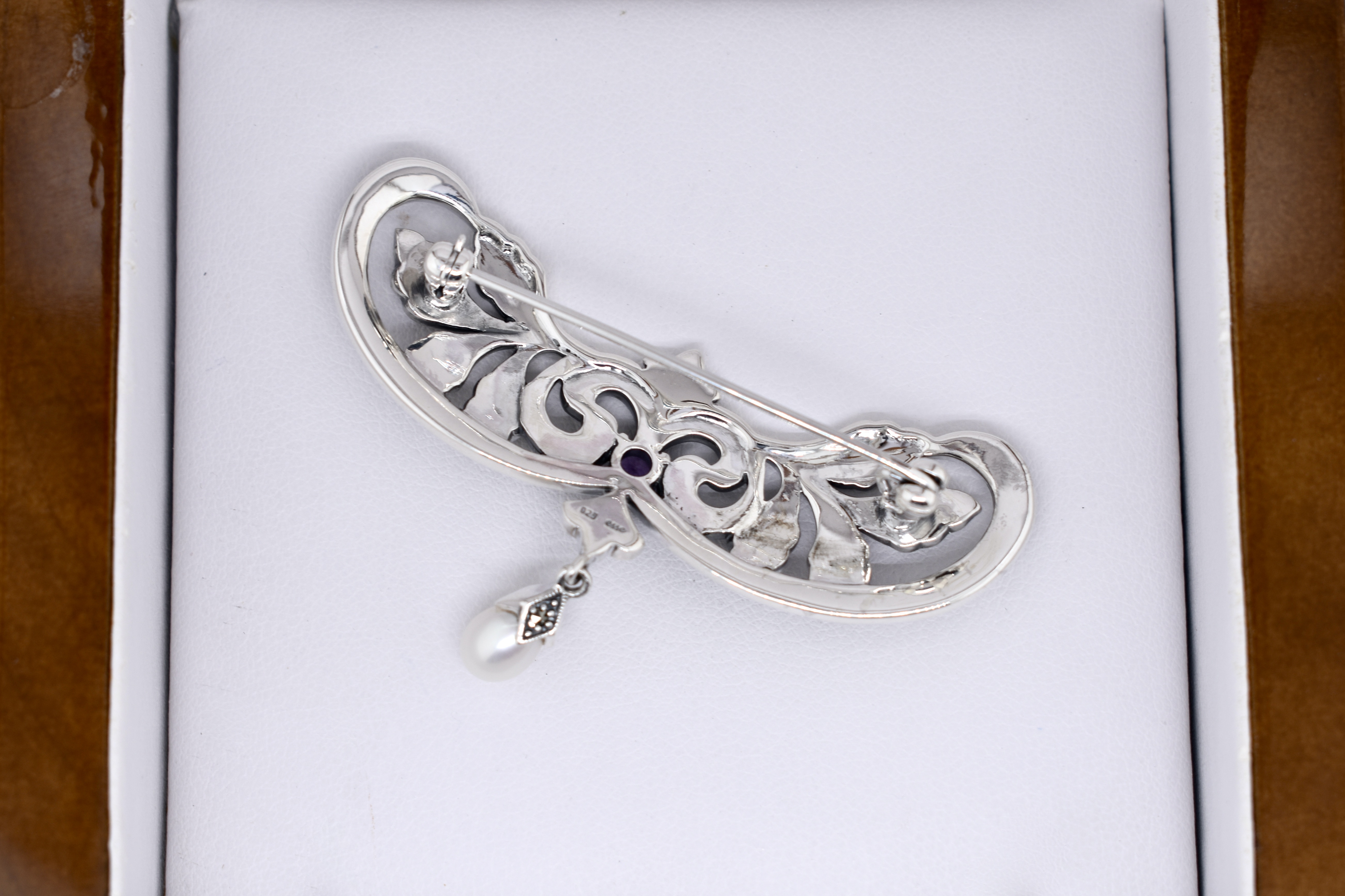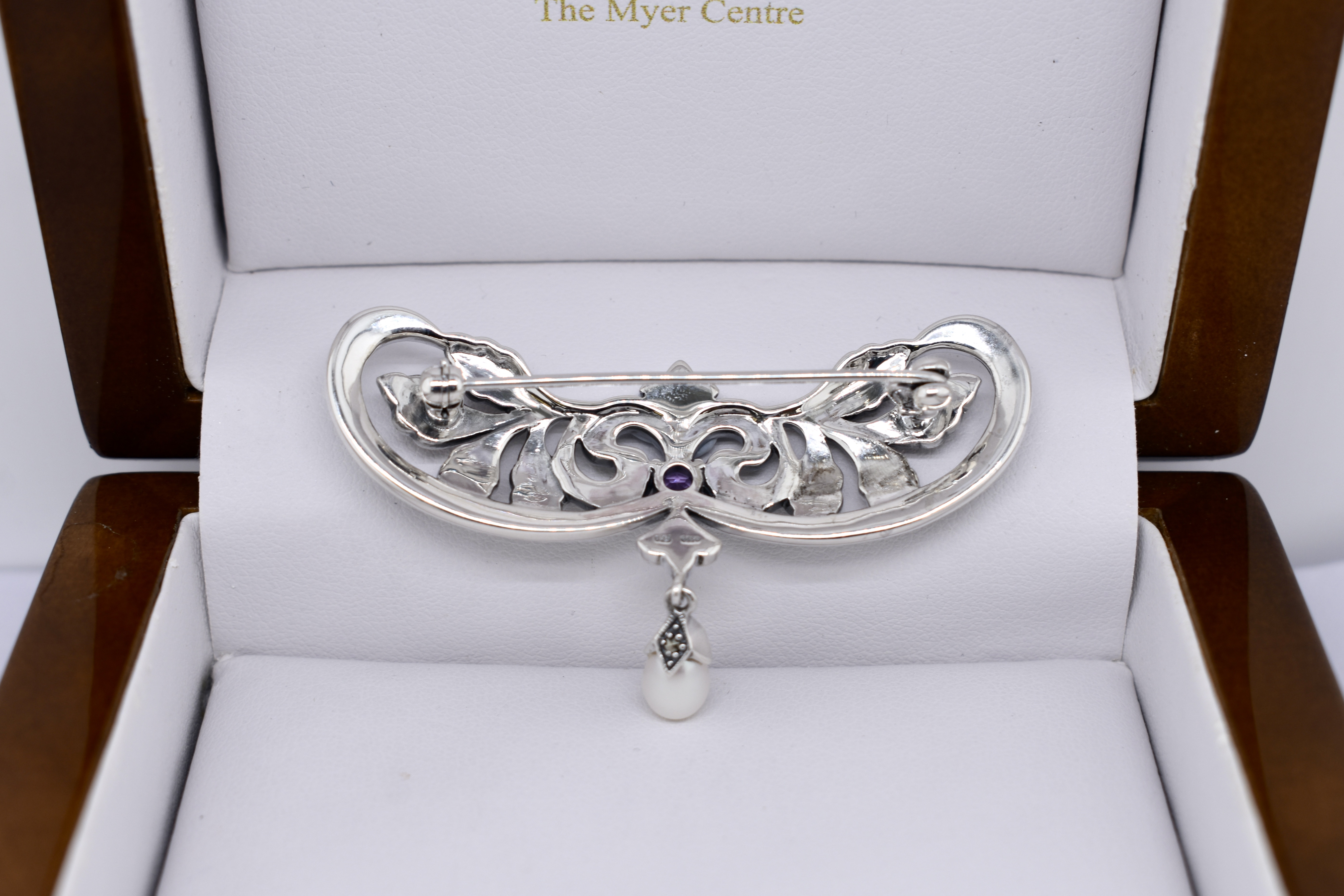 Sterling Silver Marcasite, Amethyst & Pearl Art Nouveau Inspired Brooch