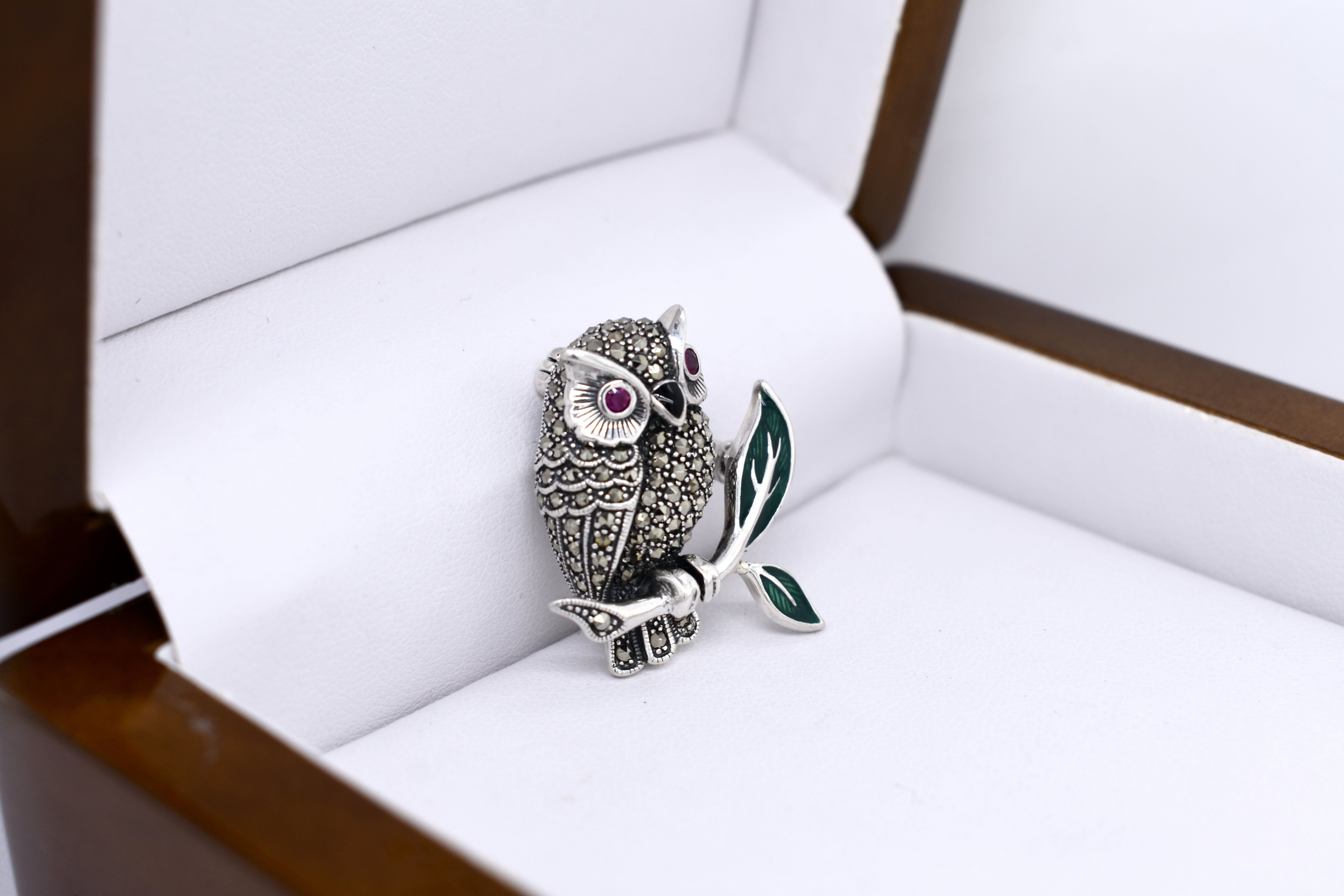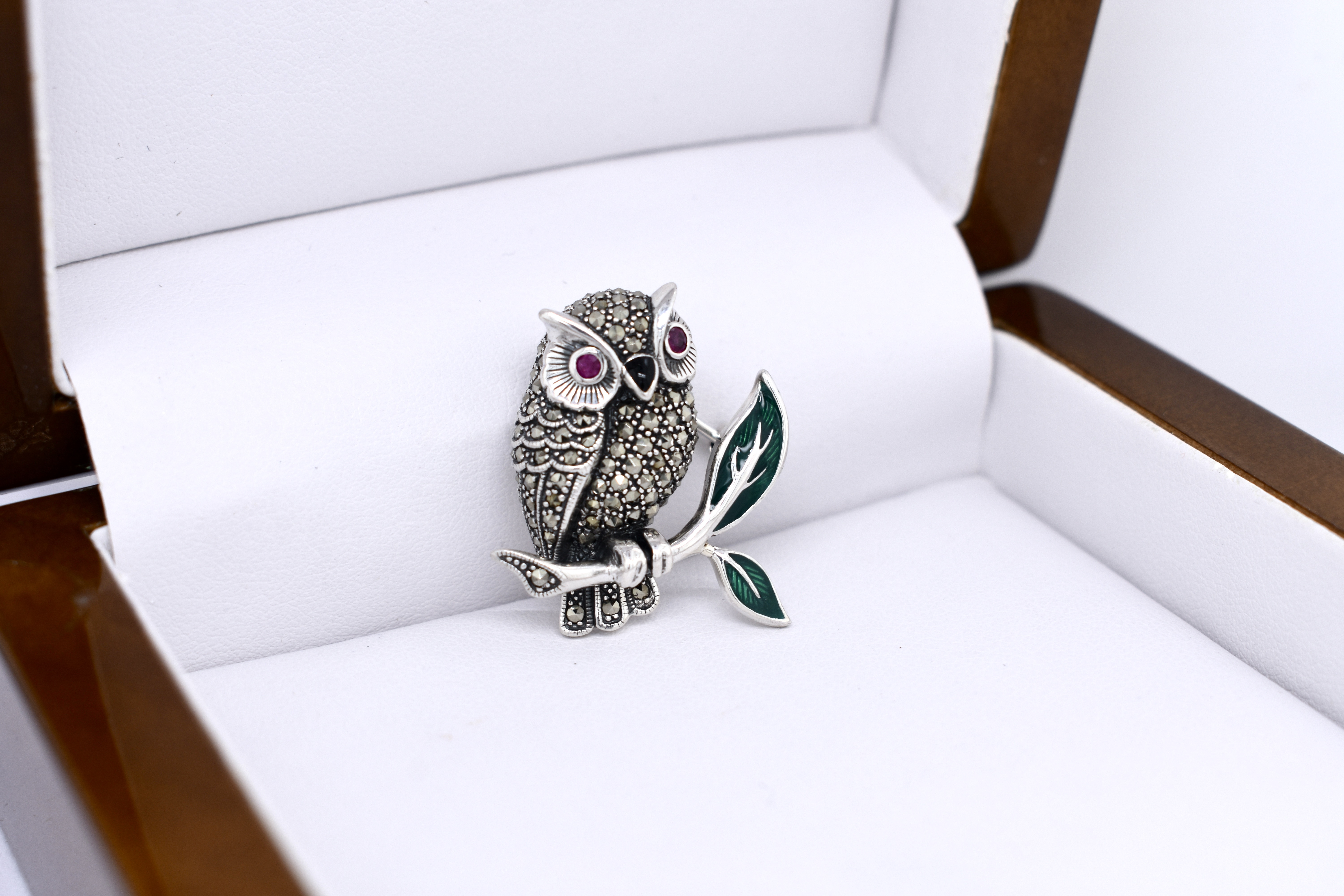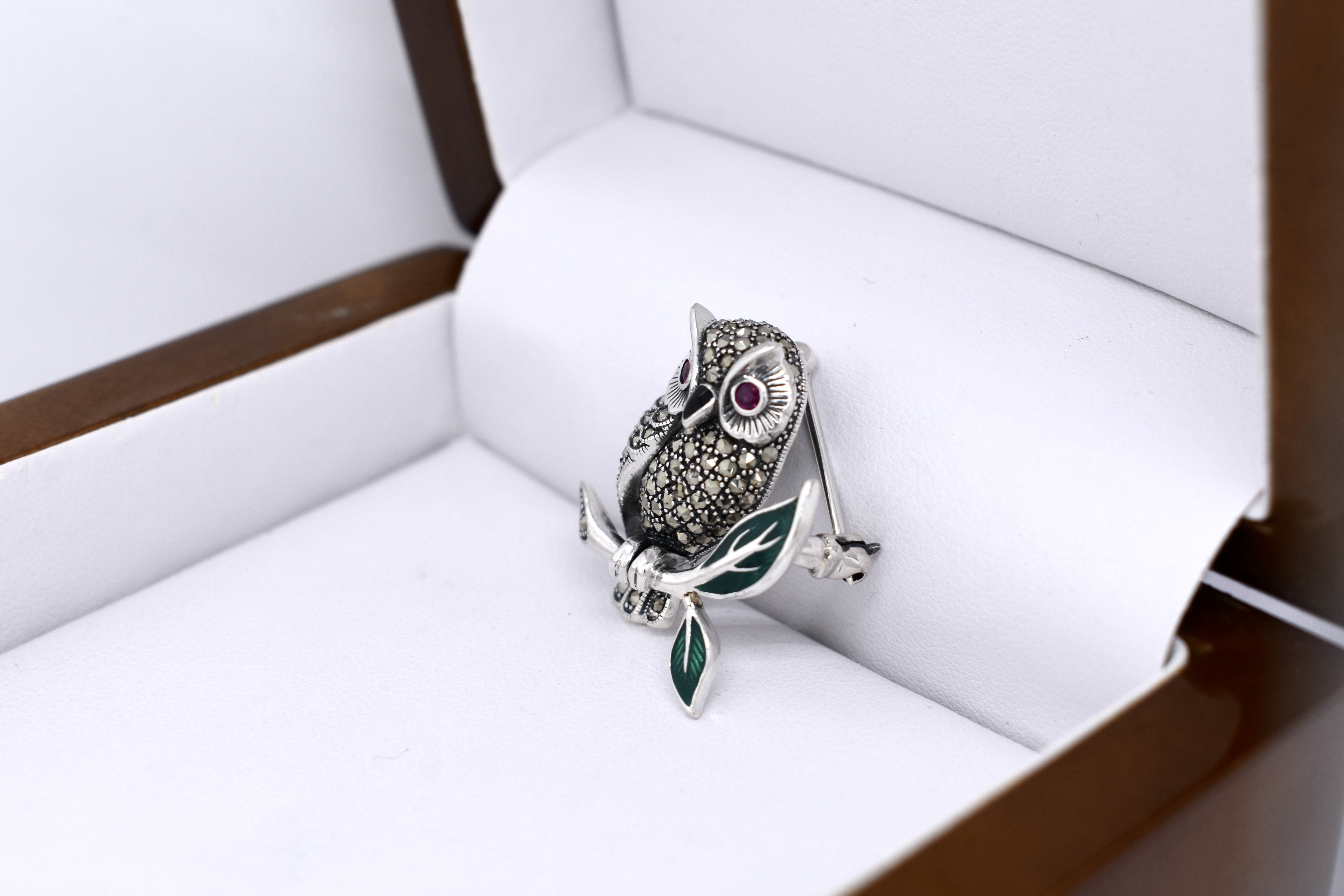 A gorgeous brooch of an owl on a branch, made of marcasites, with green enameling to detail the leaves on the branch and finished with red ruby eyes.