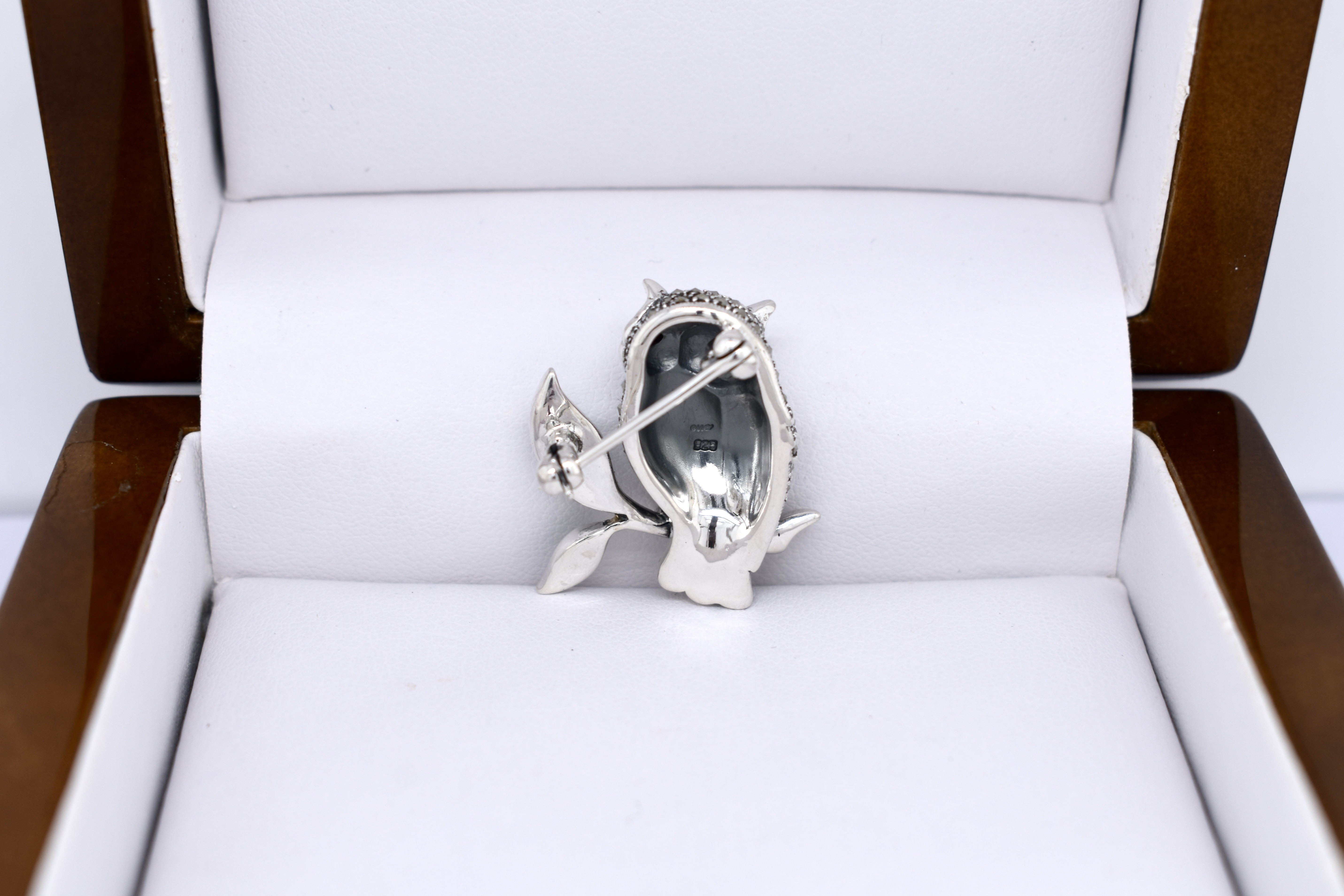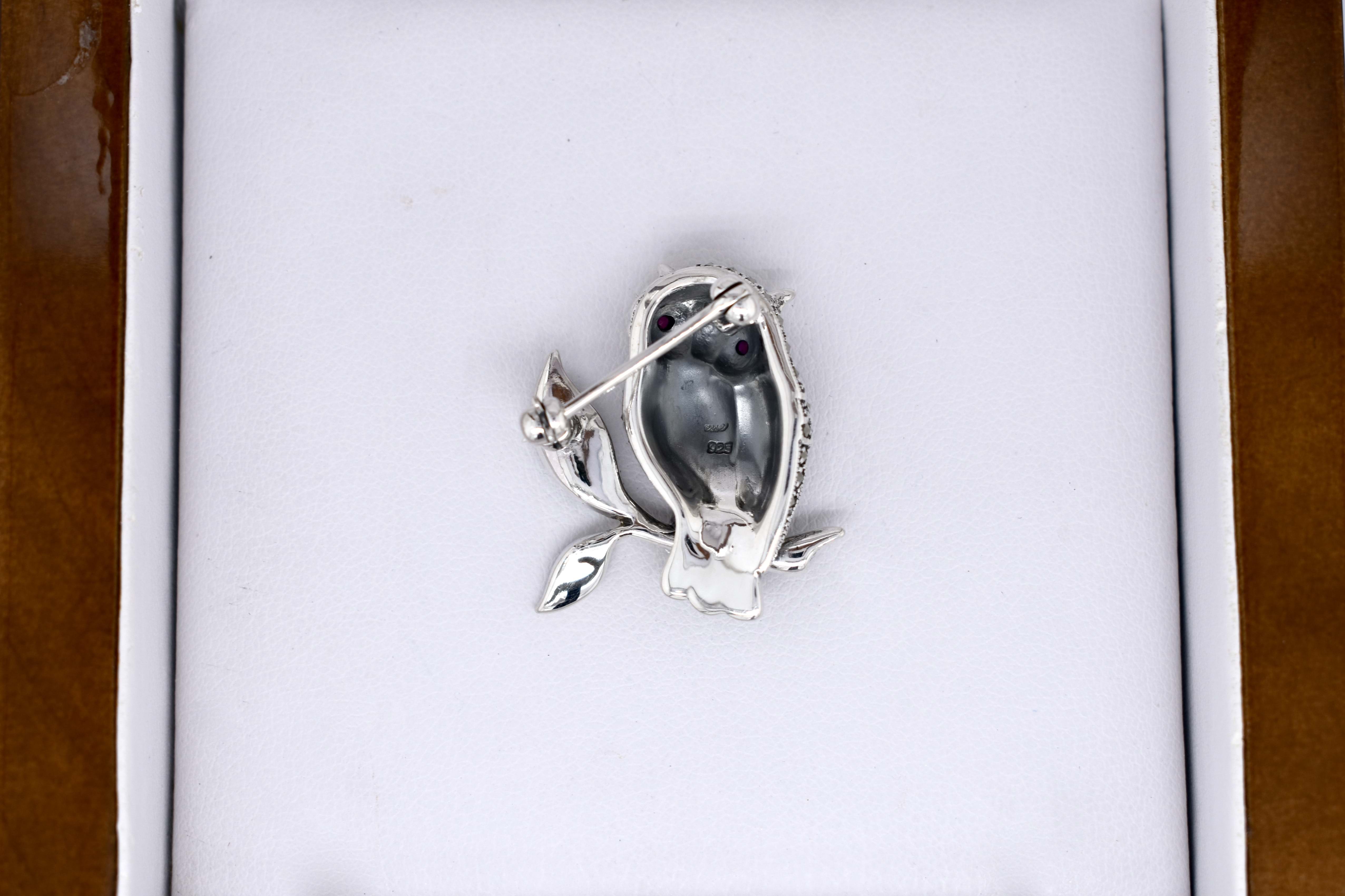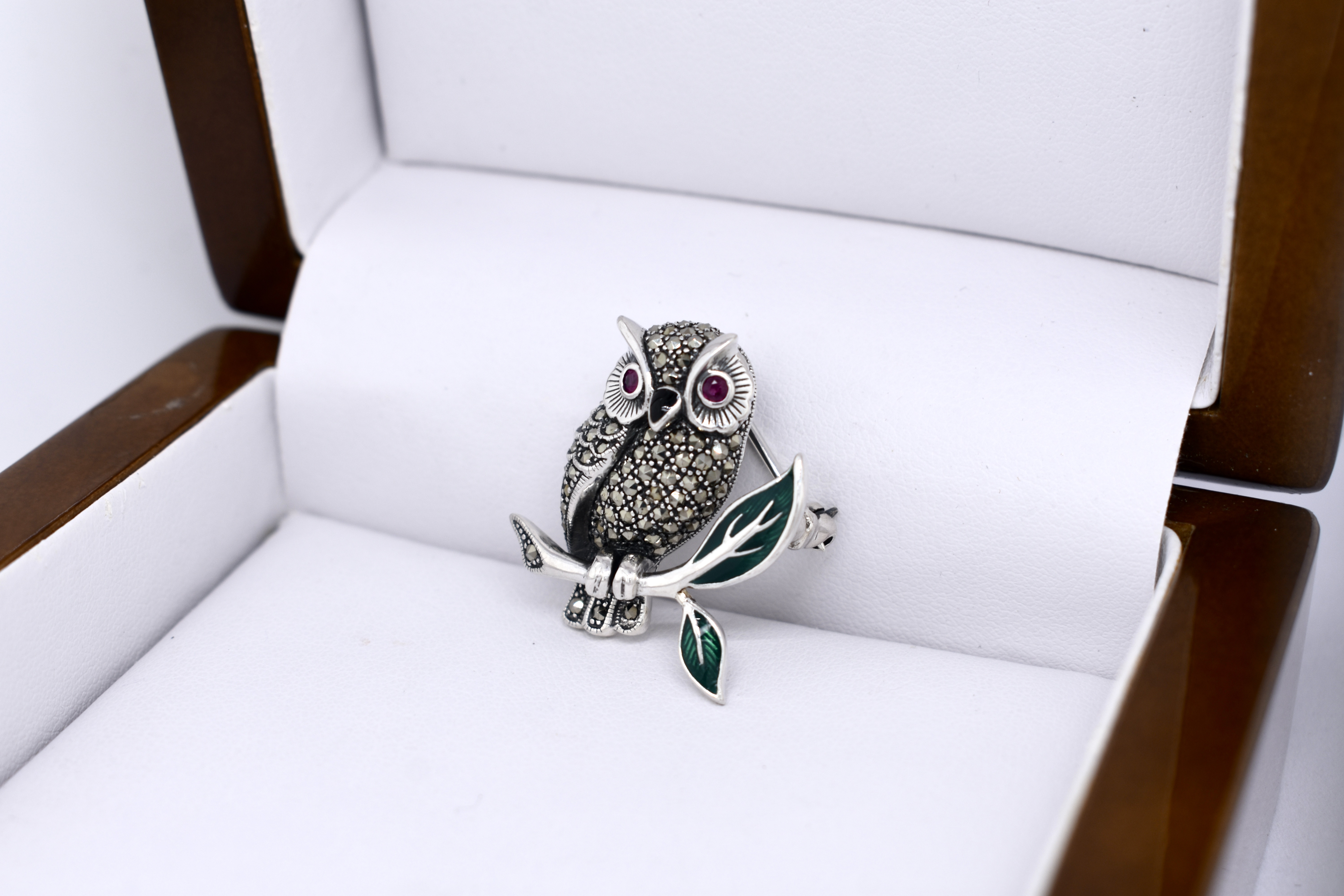 A gorgeous brooch of an owl on a branch, made of marcasites, with green enameling to detail the leaves on the branch and finished with red ruby eyes.