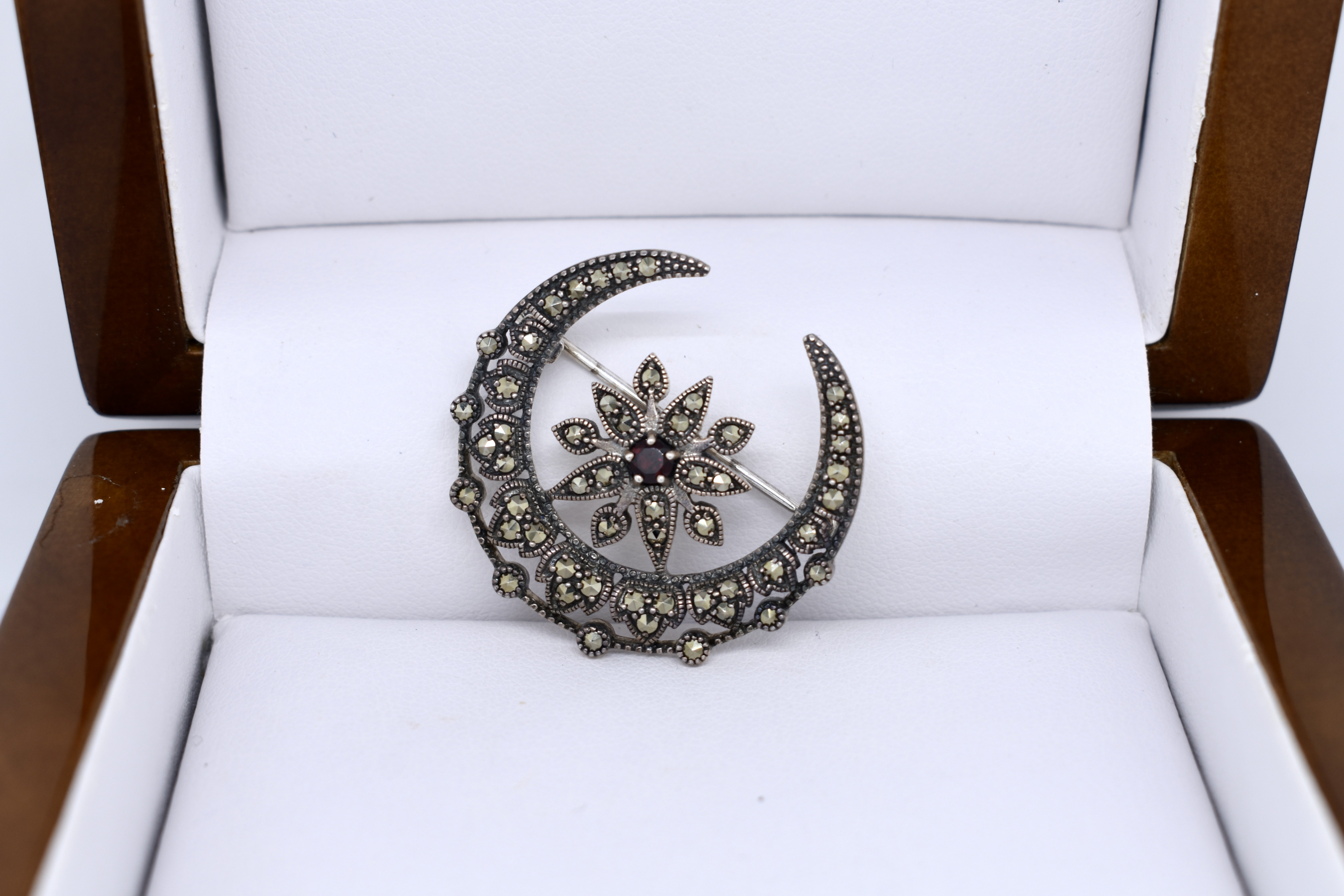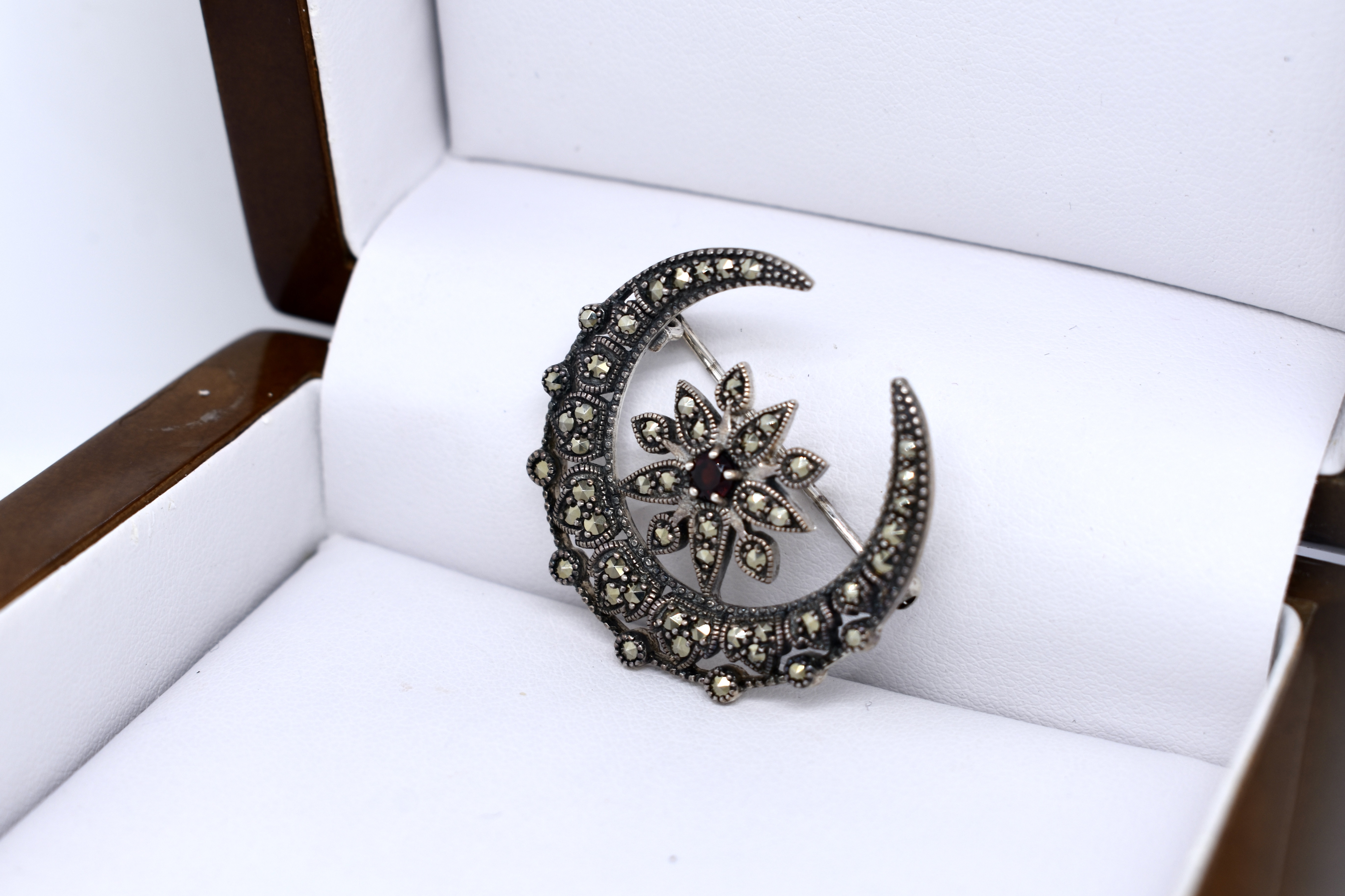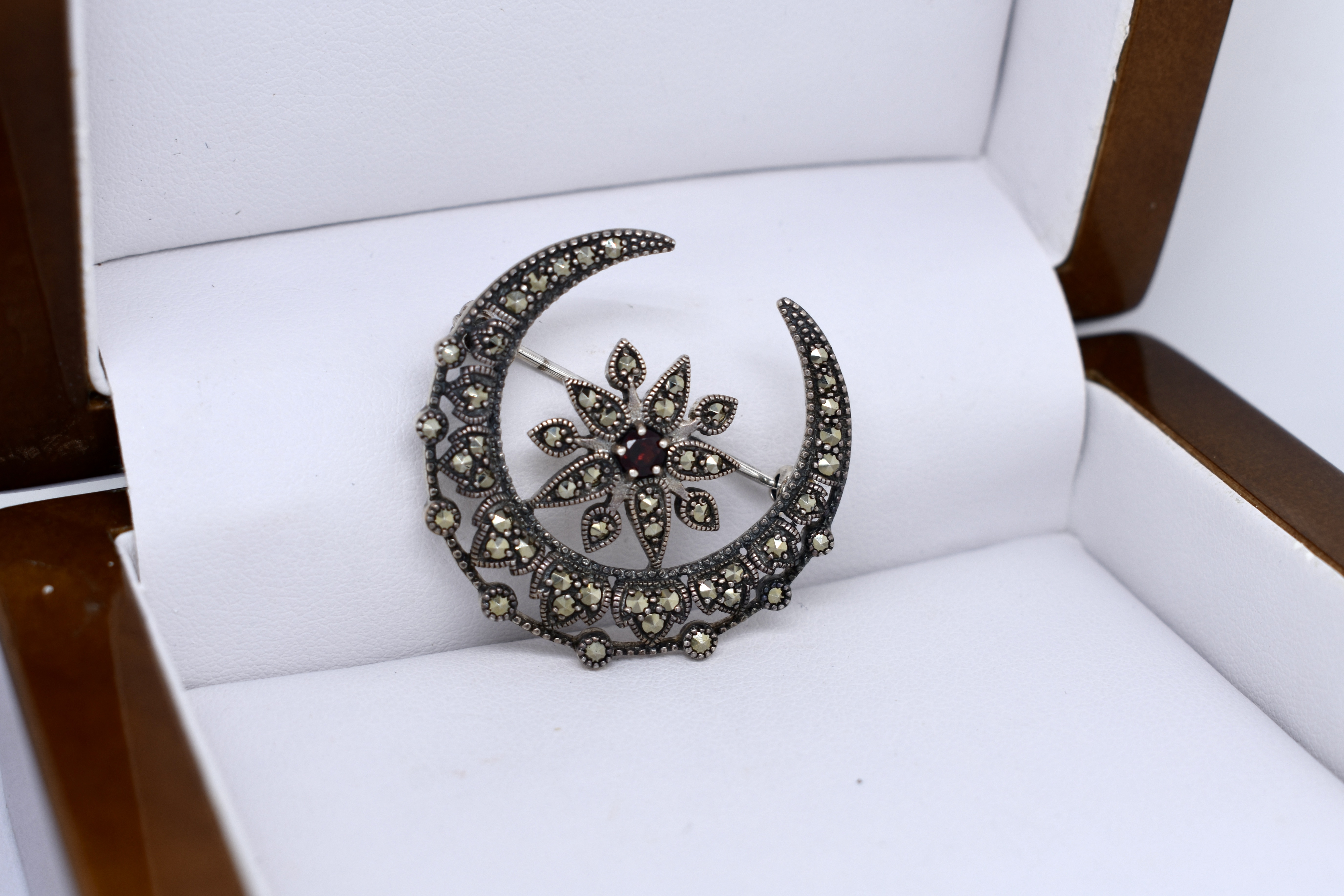 This pretty sterling silver brooch depicts a crescent moon with a flower in the centre. Made with marcasites, the flower features a red garnet claw set in the centre.
